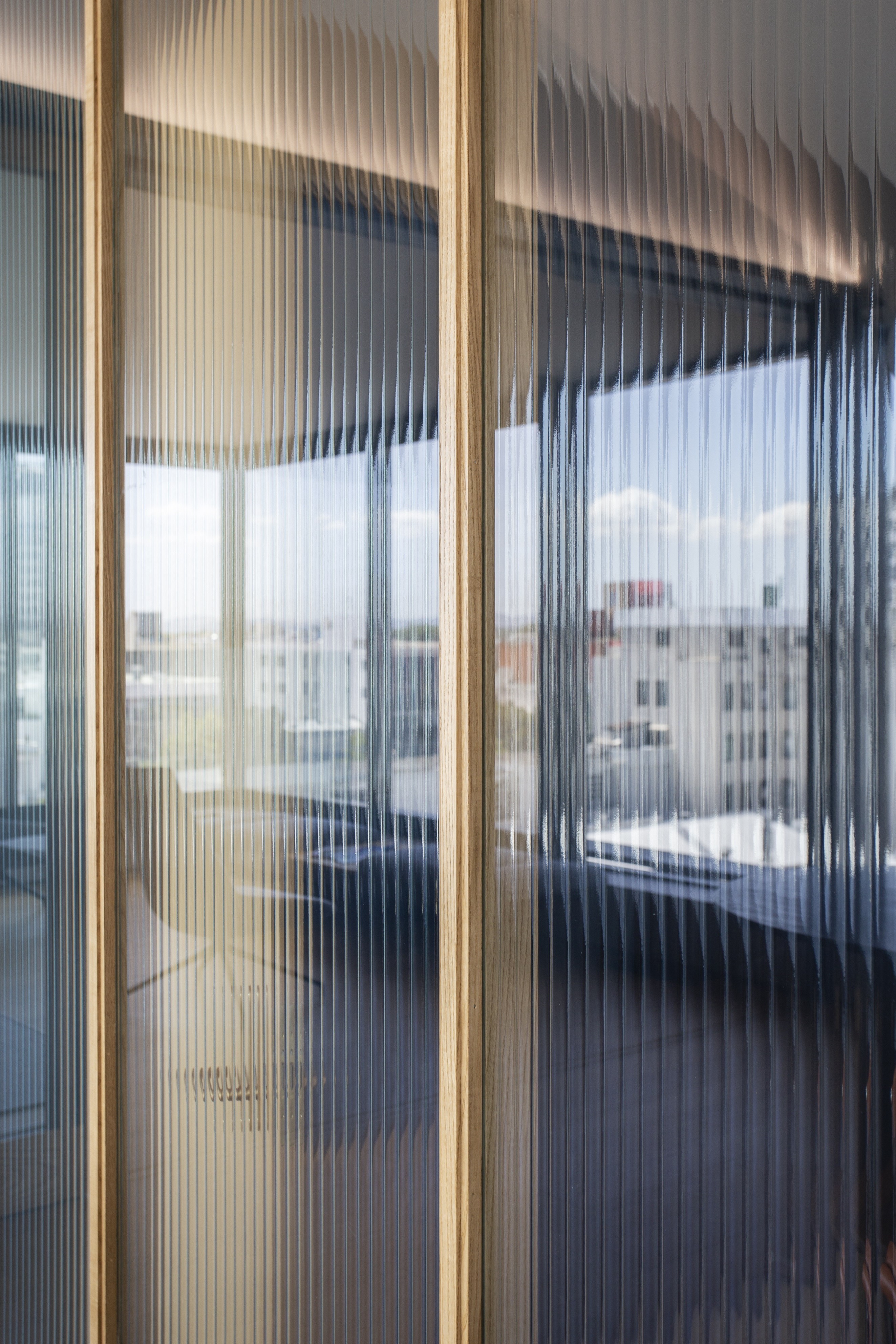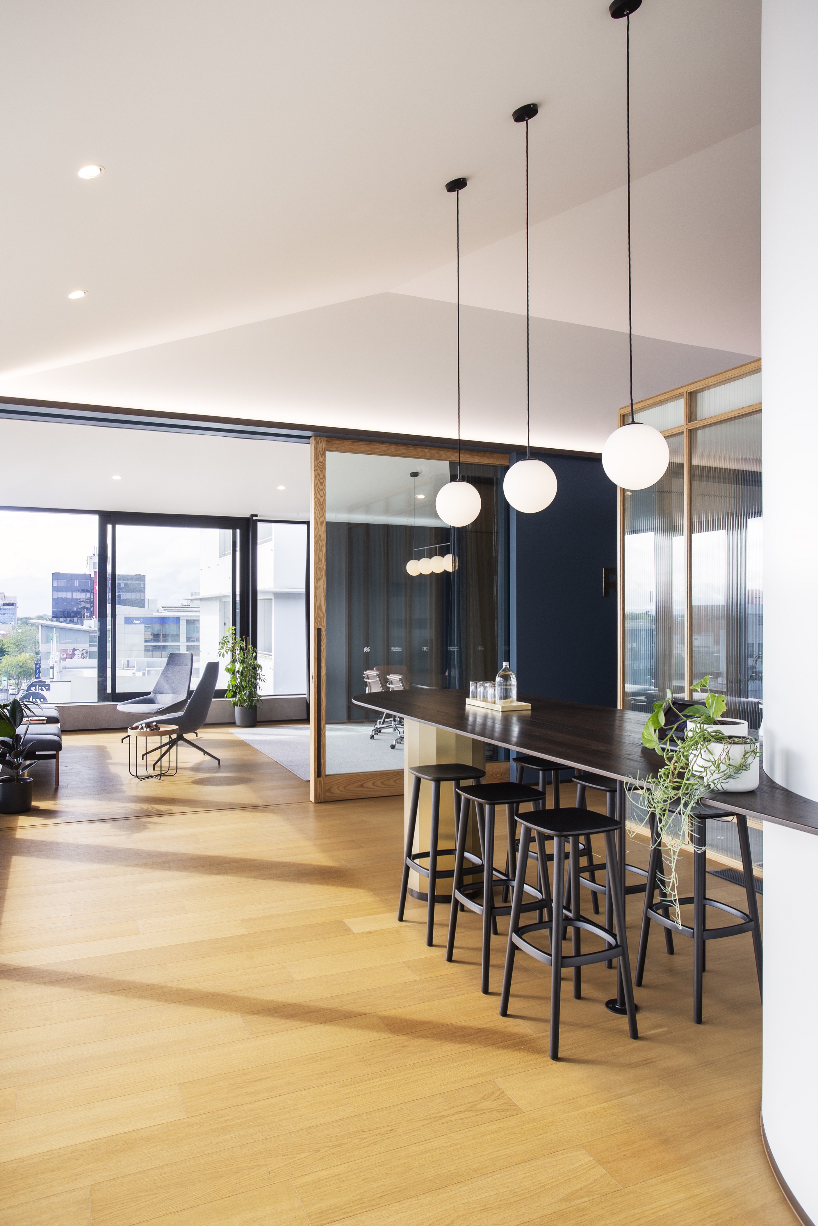 The building has been completely refurbished to link to earlier developments by the same architects. Exterior vertical louvre fins and a glazed roof addition have given the building a clearly legible base, middle and top. A cedar soffit to the new floating roof brings warmth to the whole scheme, which glows softly at night. The elegant top floor fitout provides broad views over the river and city, creating a very desirable workplace.