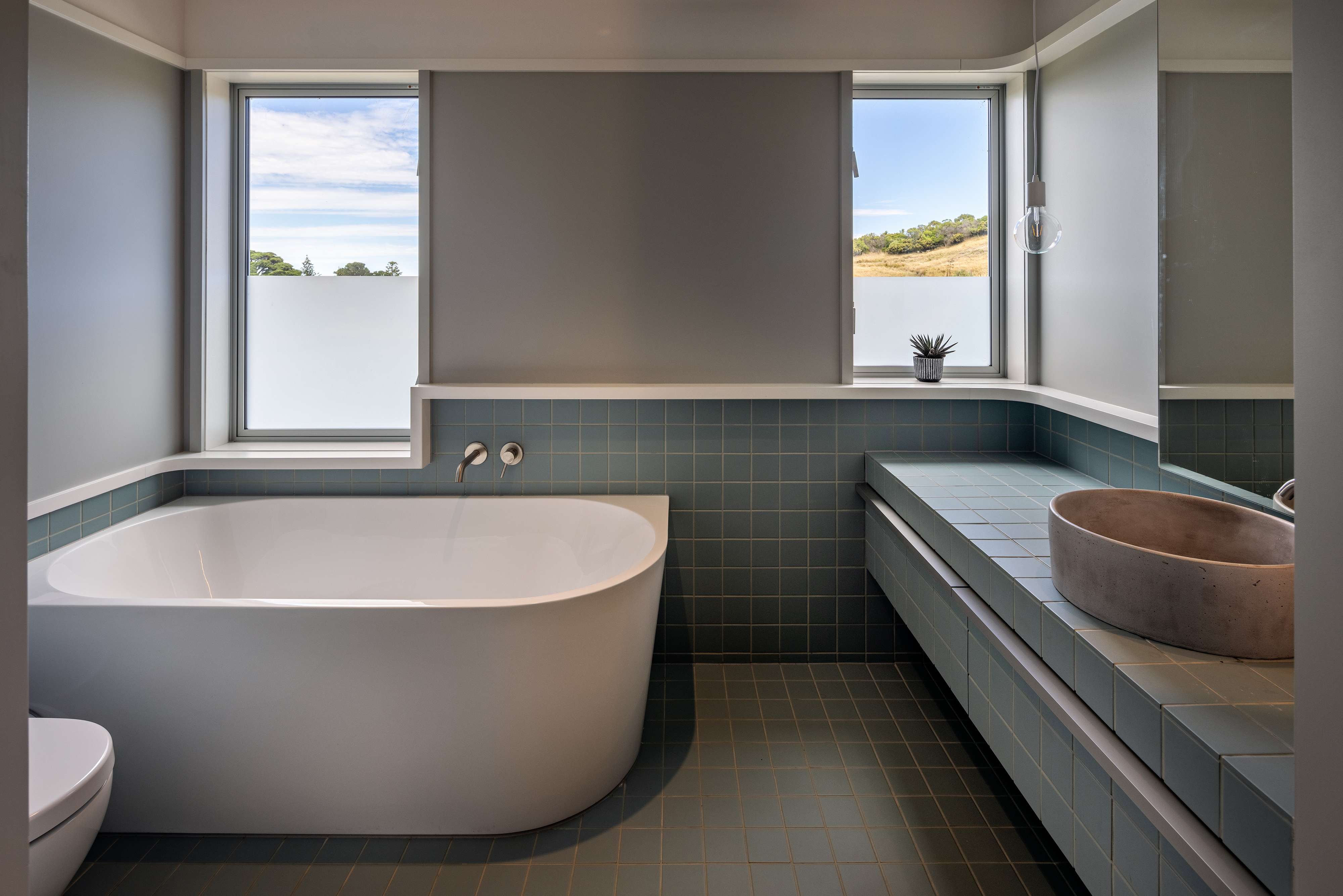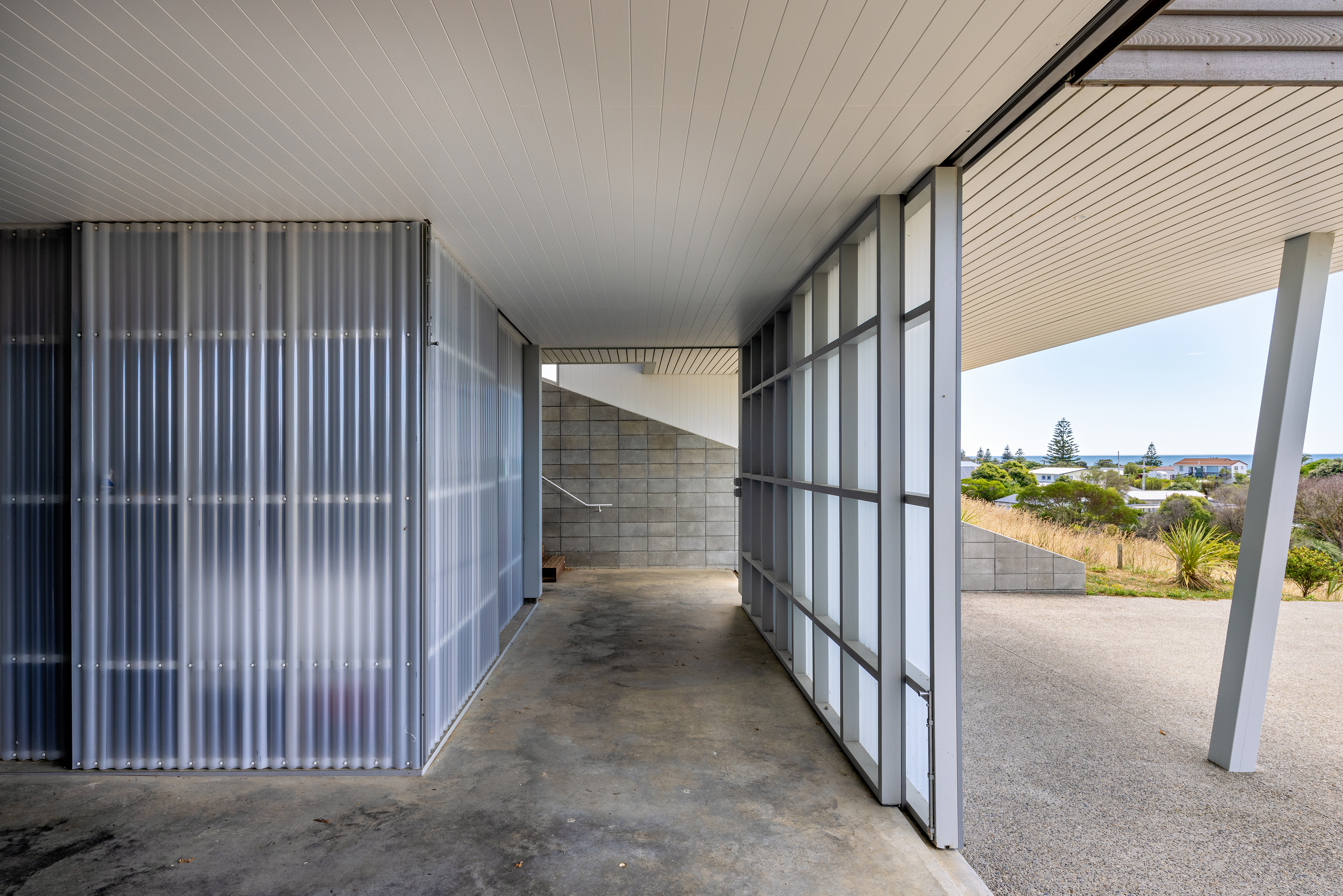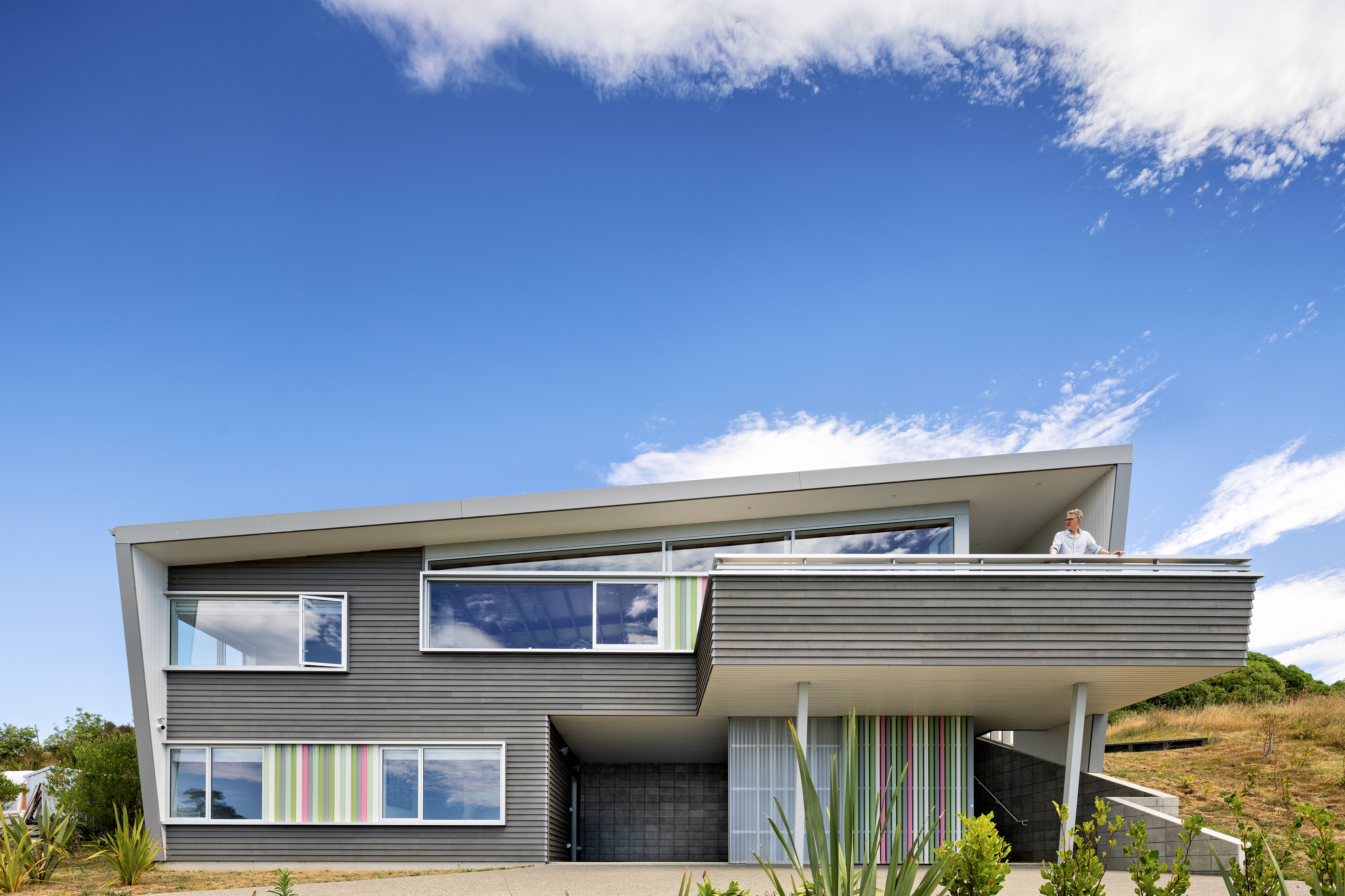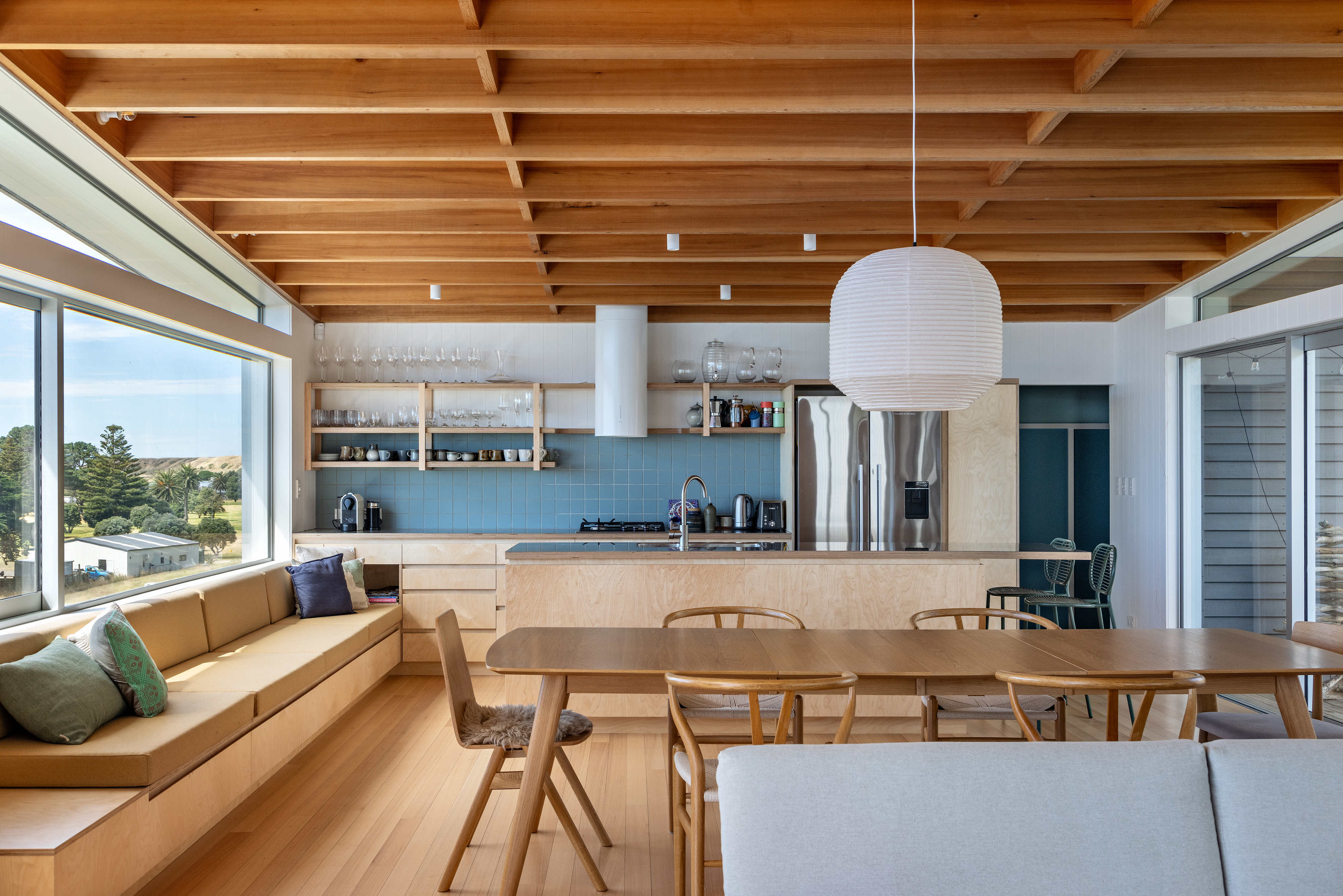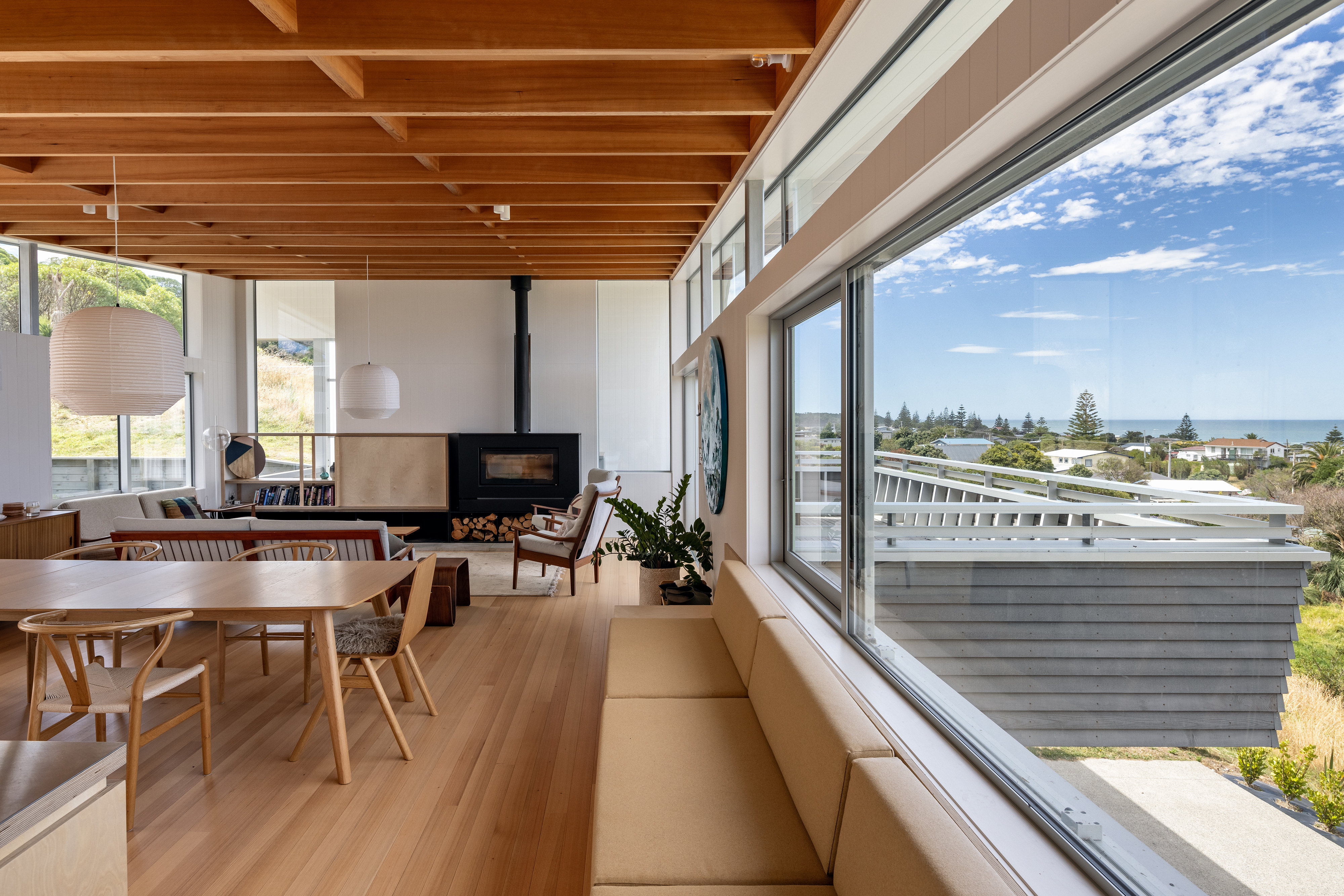 Back in the 50s, Basil Bodle had a vision for the Riversdale Station to become the Côte d’Azur of south Wairarapa. With its distinctive colours and stylish lines, Riversdale Beach House fits Basil’s aspirations. The roof overhang and angled side walls are inspired by Derek Wilson’s 1956 Maunsell beach house – Parsonson’s contemporary take links to those modern times and speaks to the New Zealand vernacular. The multipurpose under-croft form of the ground floor provides spacious storage, a protected entry to guest accommodation and a covered parking. Cheerfully coloured screens provide extra security to close off these spaces when not in use. The sliding screens give an elegant skirt to the L-shaped house above. The upper-level arrival provides carefully framed coastal views and the main living space soaks up all-day sun. The sheltered courtyard is a welcome respite from the wind. Inside, timber-framed panelling provides modulation and a sense of rhythm to the expansive sloping ceiling.