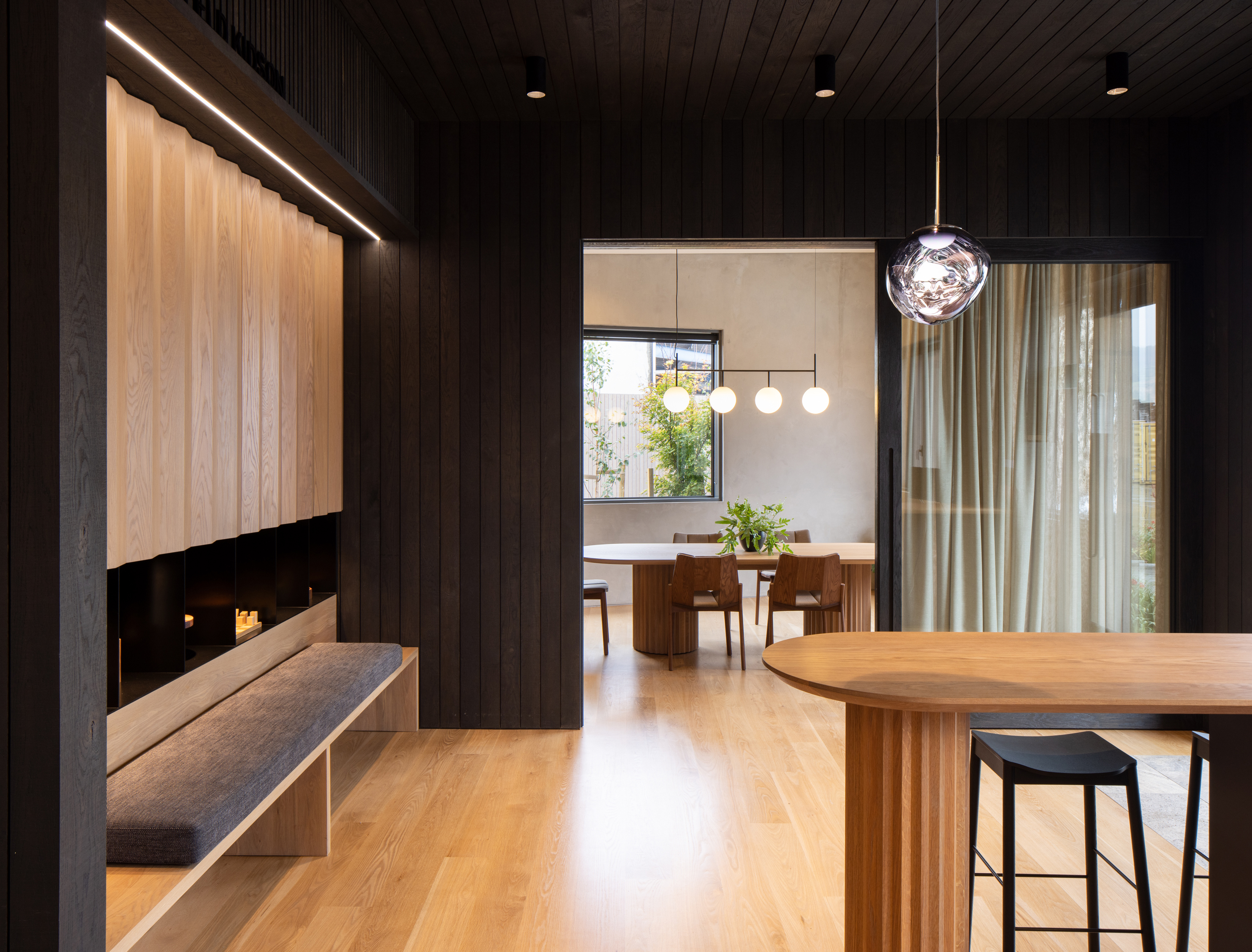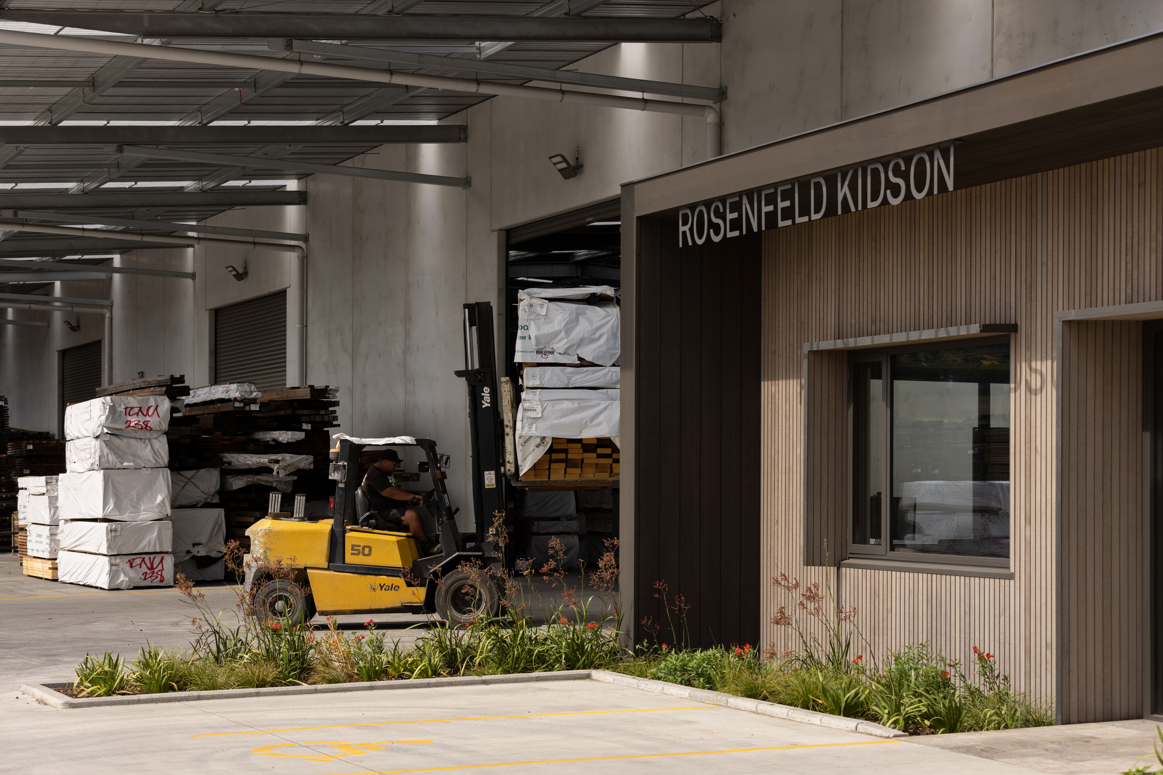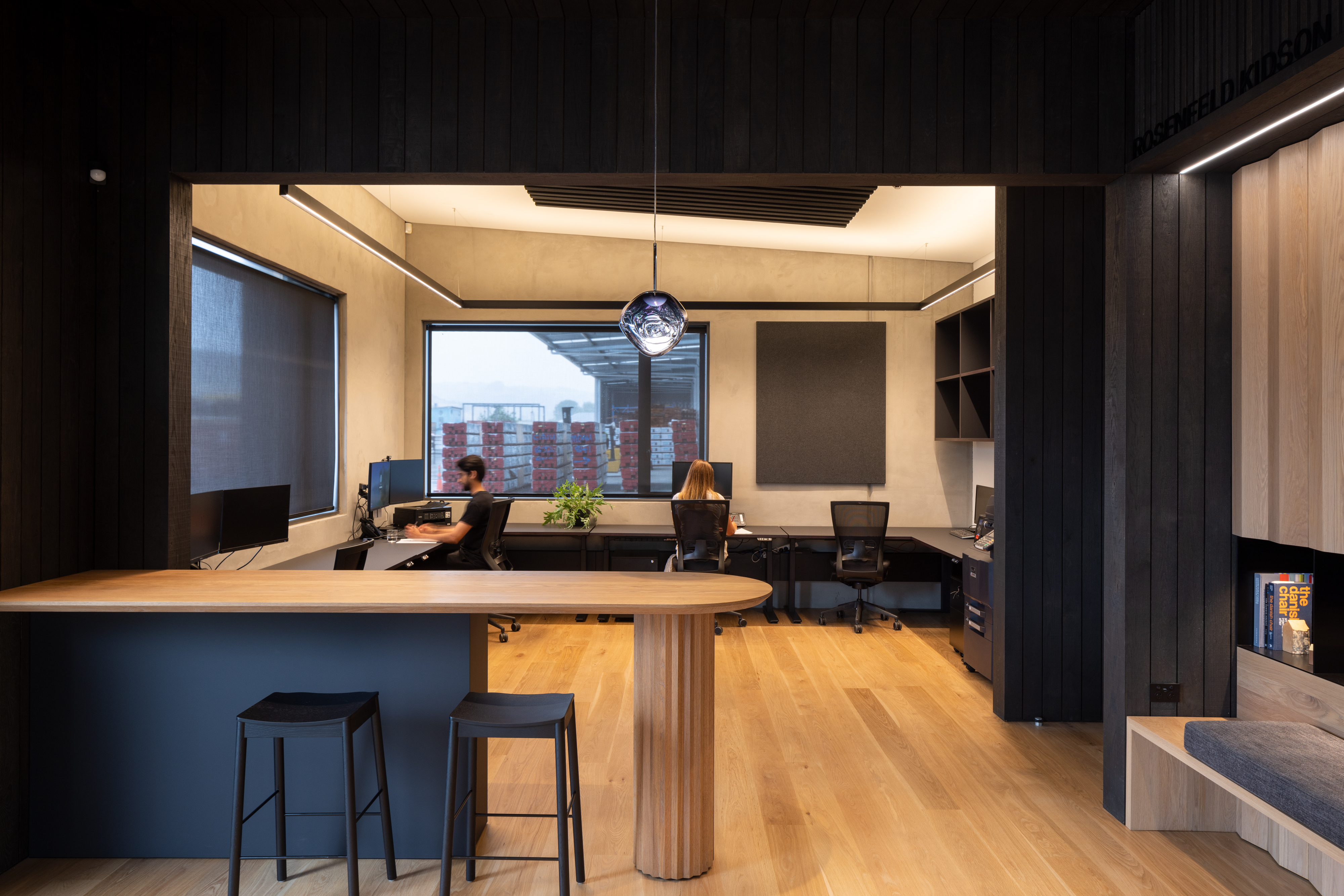 In this small factory-warehouse addition, inclusive of an office, reception, meeting room and staff lunchroom, the potential of timber and its finishing is beautifully showcased. Interior panelling, faceted display cabinets, upholstered benches and fluted reception and table supports exquisitely demonstrate the beauty of crafted timber. More routine interior timber and wall panelling offsets these finer finishes, while decking and a wonderfully considered timber seating alcove outside opens to a more robust setting—a landscaped setting with fruiting trees and ornamental groves. The sequence of spaces and experiences offered here compellingly marry a celebration of timber with broader concerns for staff and visitor comfort and wellbeing.