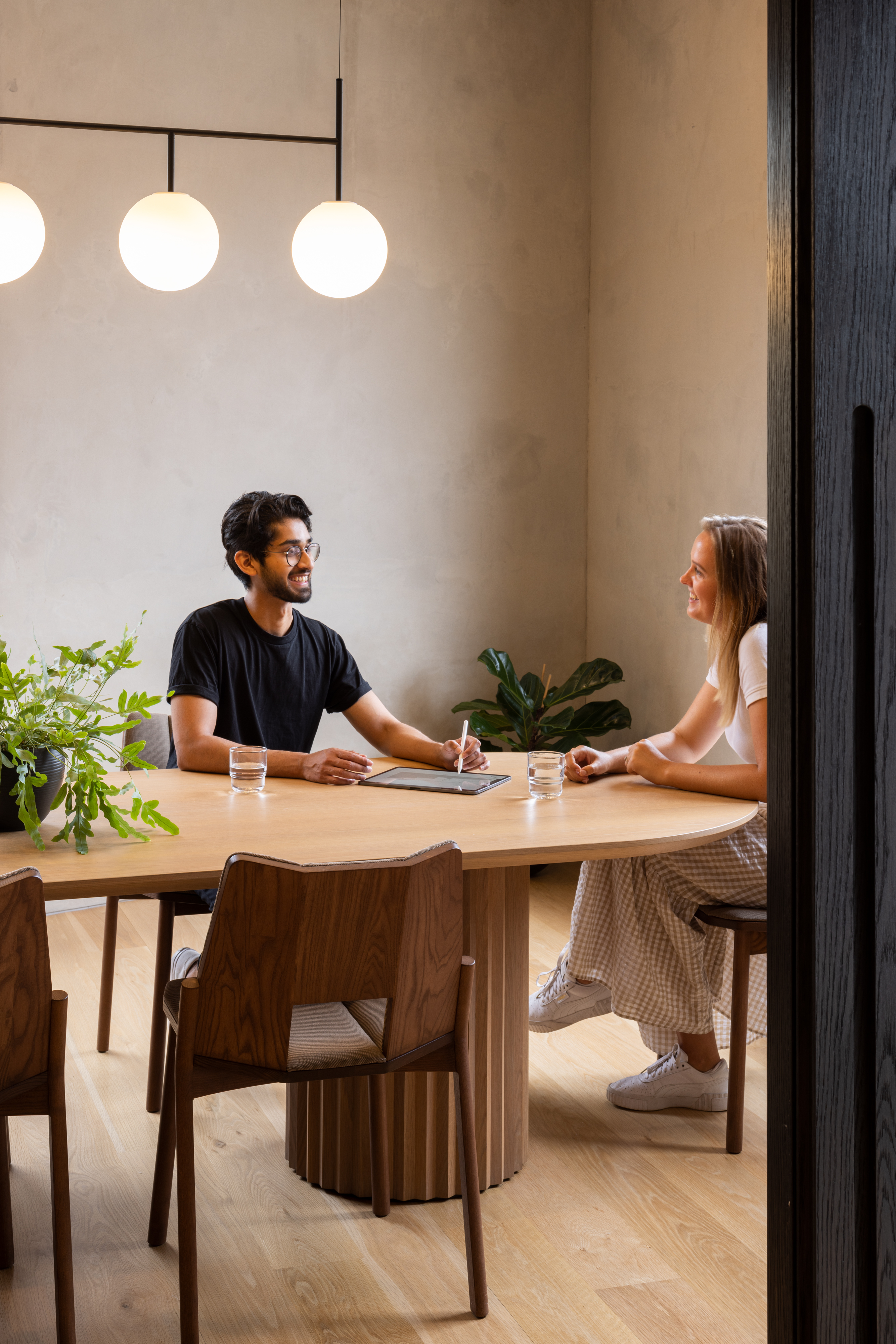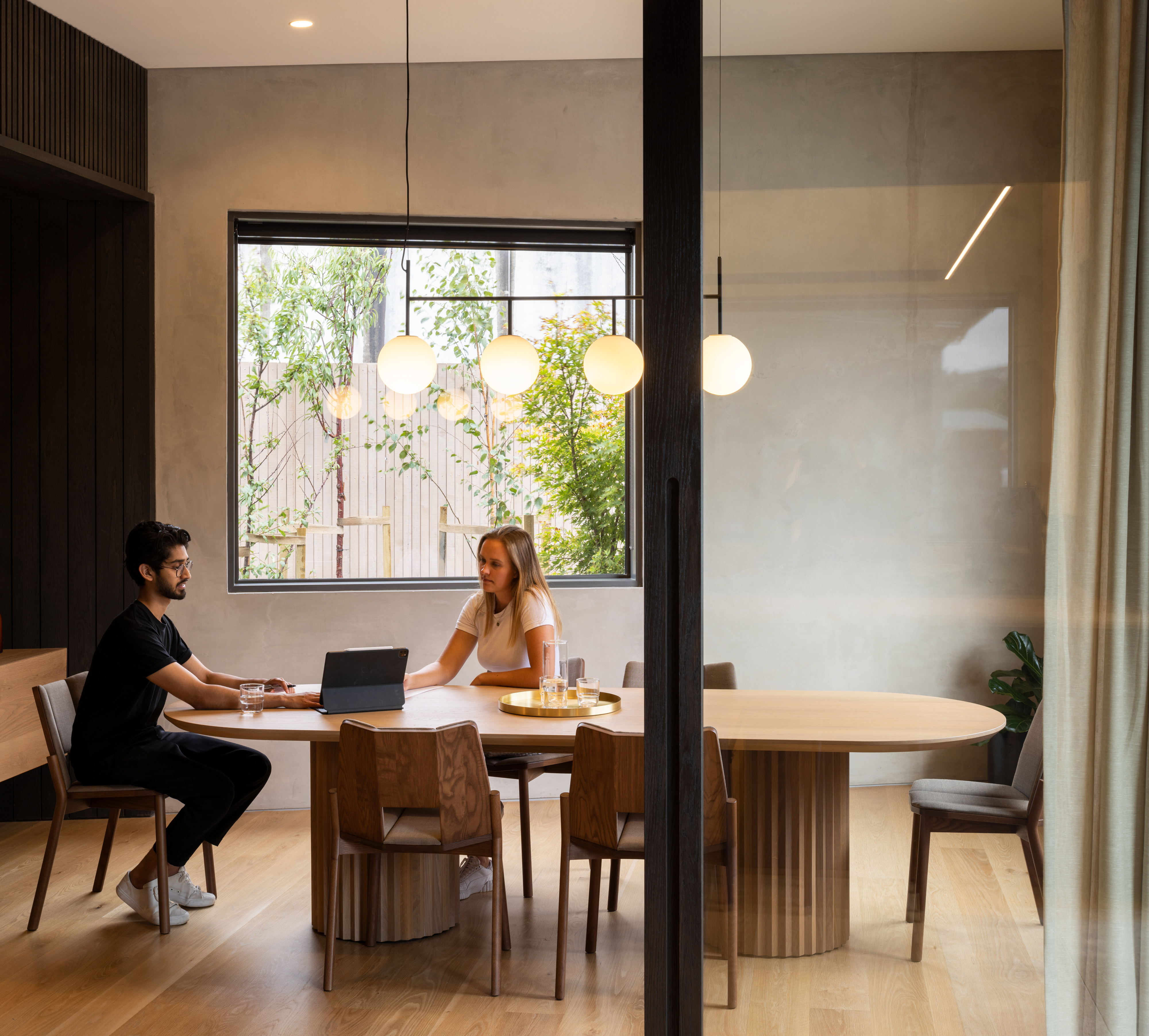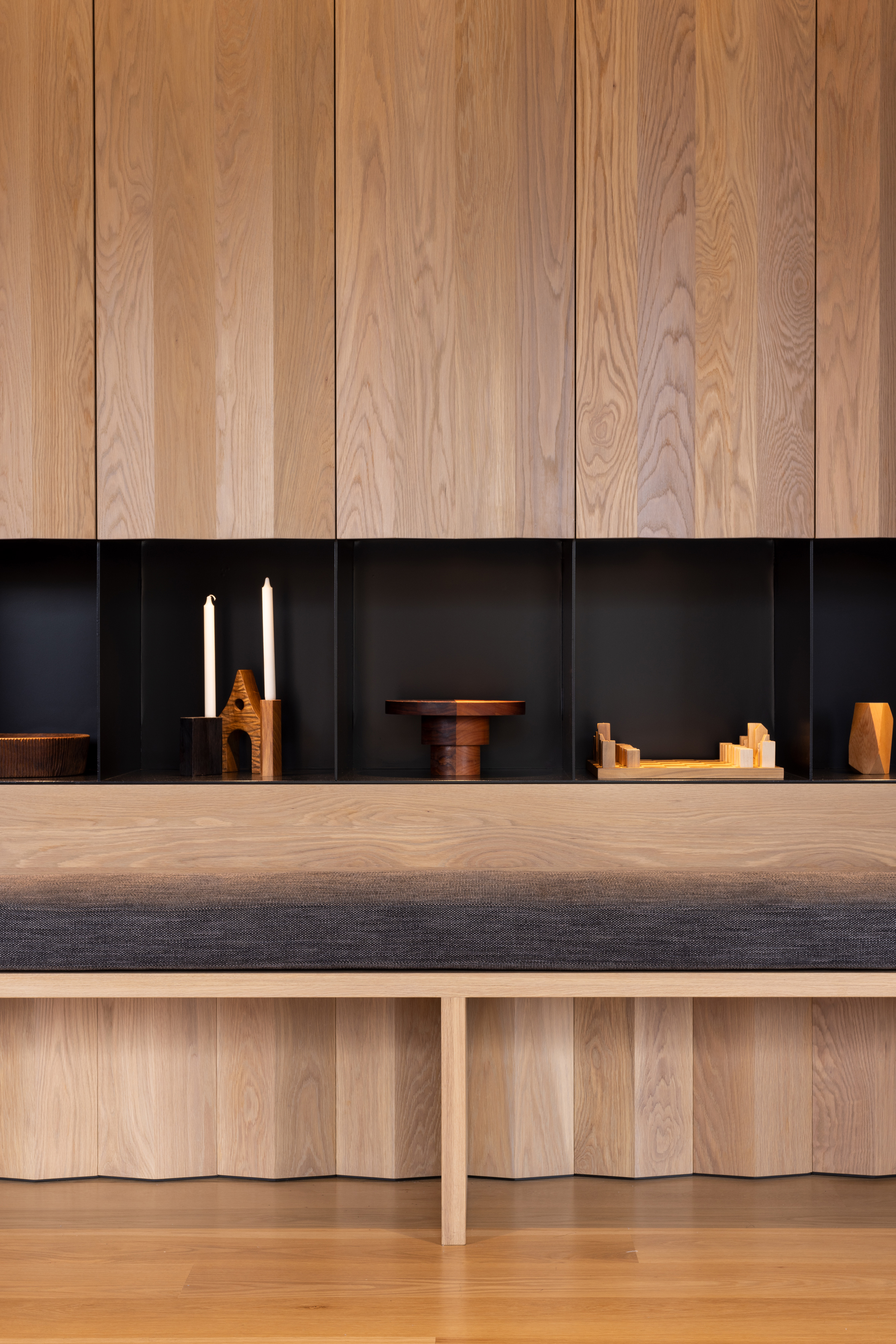 In this small factory-warehouse addition, inclusive of an office, reception, meeting room and staff lunchroom, the potential of timber and its finishing is beautifully showcased. Interior panelling, faceted display cabinets, upholstered benches and fluted reception and table supports exquisitely demonstrate the beauty of crafted timber. More routine interior timber and wall panelling offsets these finer finishes, while decking and a wonderfully considered timber seating alcove outside opens to a more robust setting—a landscaped setting with fruiting trees and ornamental groves. The sequence of spaces and experiences offered here compellingly marry a celebration of timber with broader concerns for staff and visitor comfort and wellbeing.