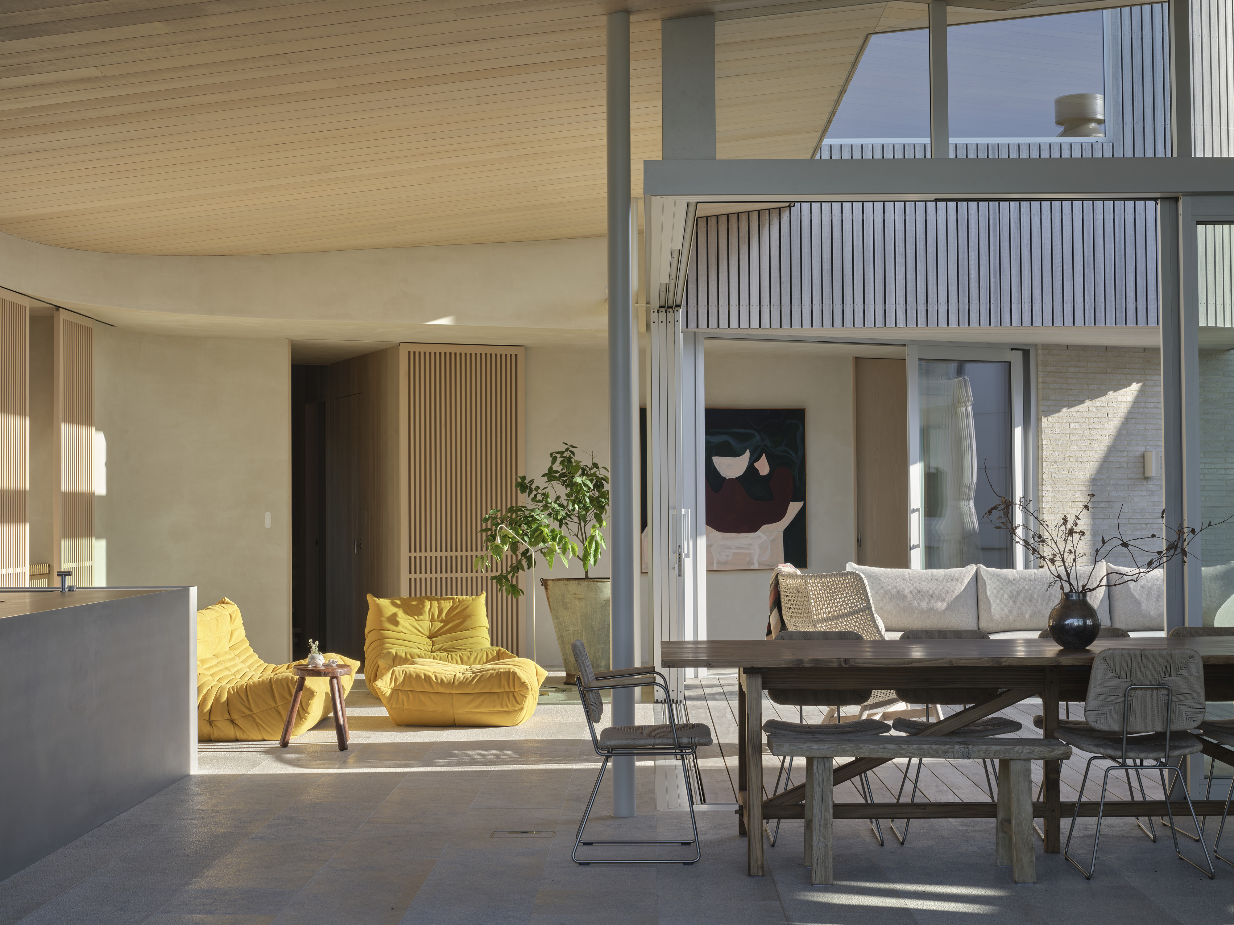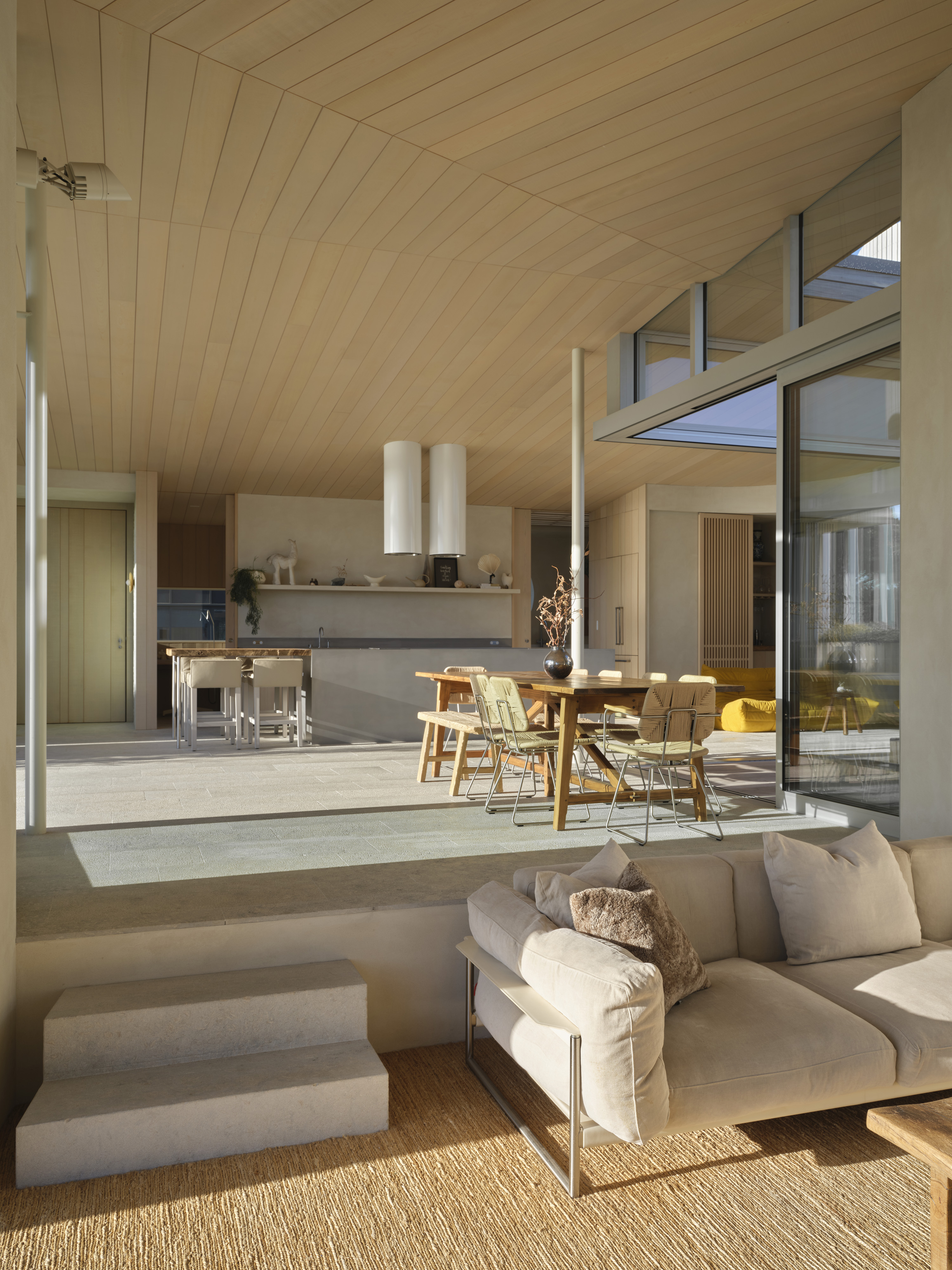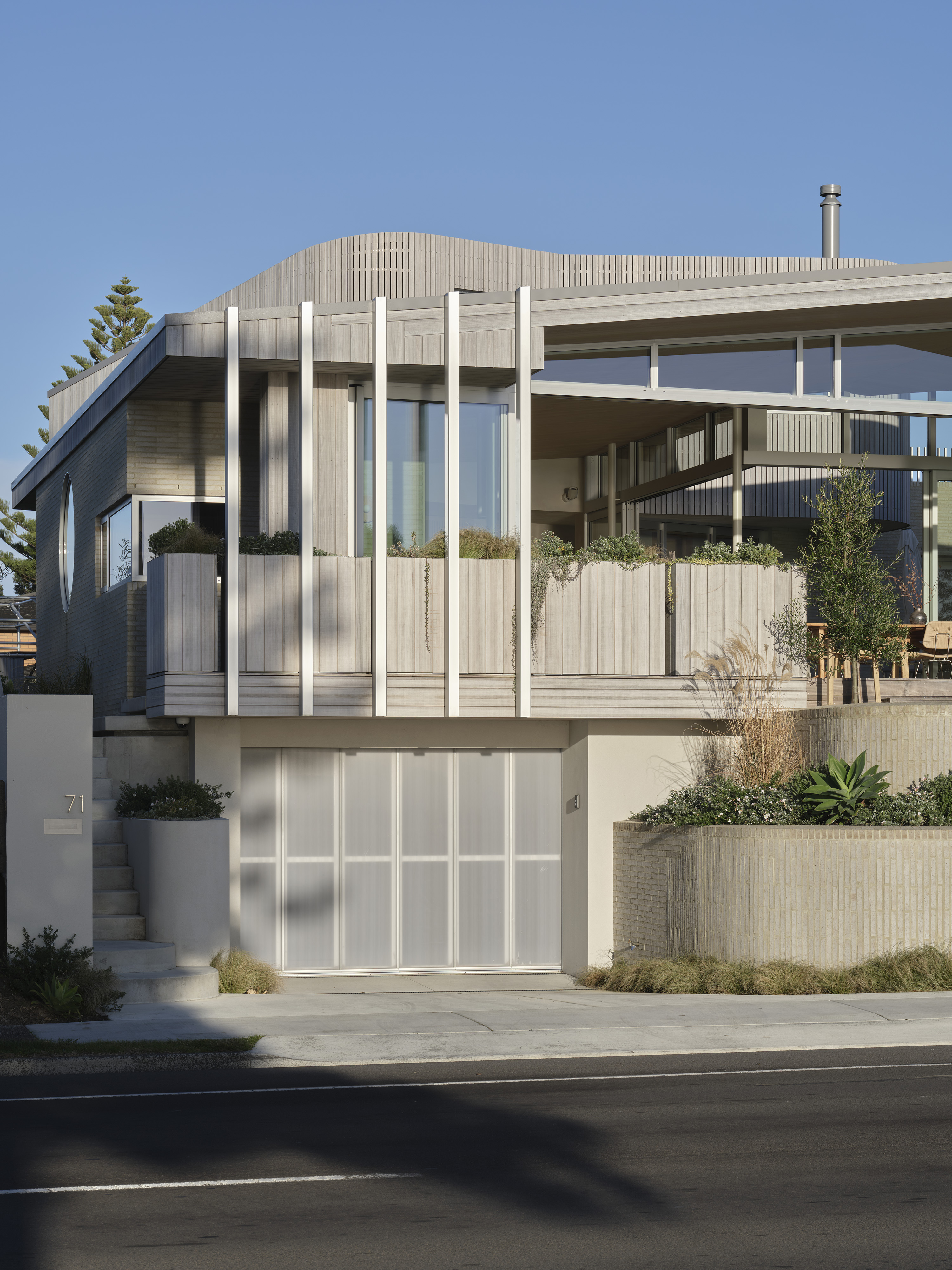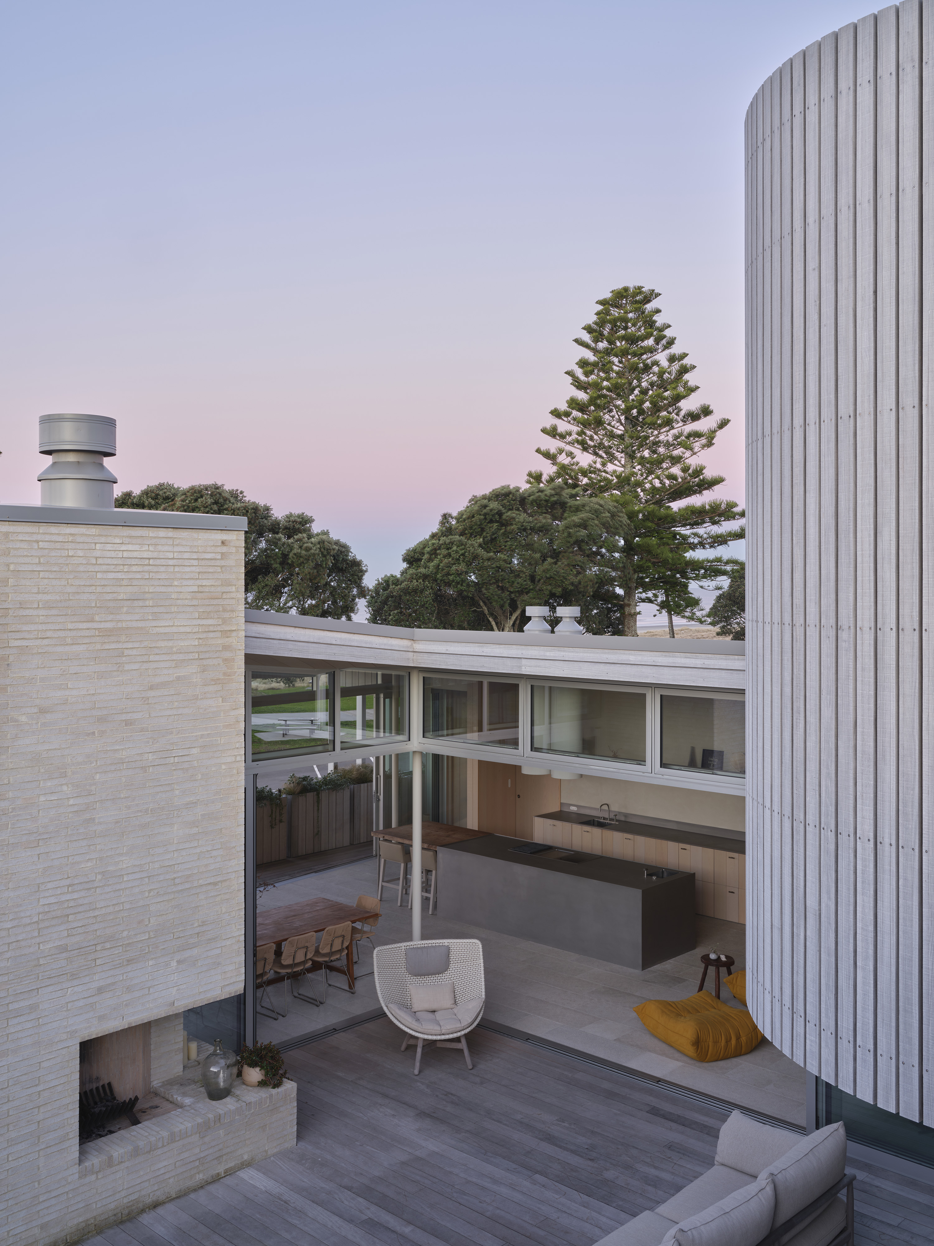 This meticulously designed coastal property is elegantly situated on a beach sand dune. The terraced road frontage and strategic planting help minimise its scale, while a single garage door offers access to utility services. The exterior’s soft, weathered materials of timber and brick seamlessly transition indoors, enhancing the natural coastal ambience. A carefully considered interior layout maximises coastal views while ensuring privacy. The clever design of the road-facing façade adds a degree of obscurity. A central, sheltered courtyard integrates smoothly with the living spaces. An additional upper floor accommodation wing and lift access ensure this residence will be cherished for many years to come.