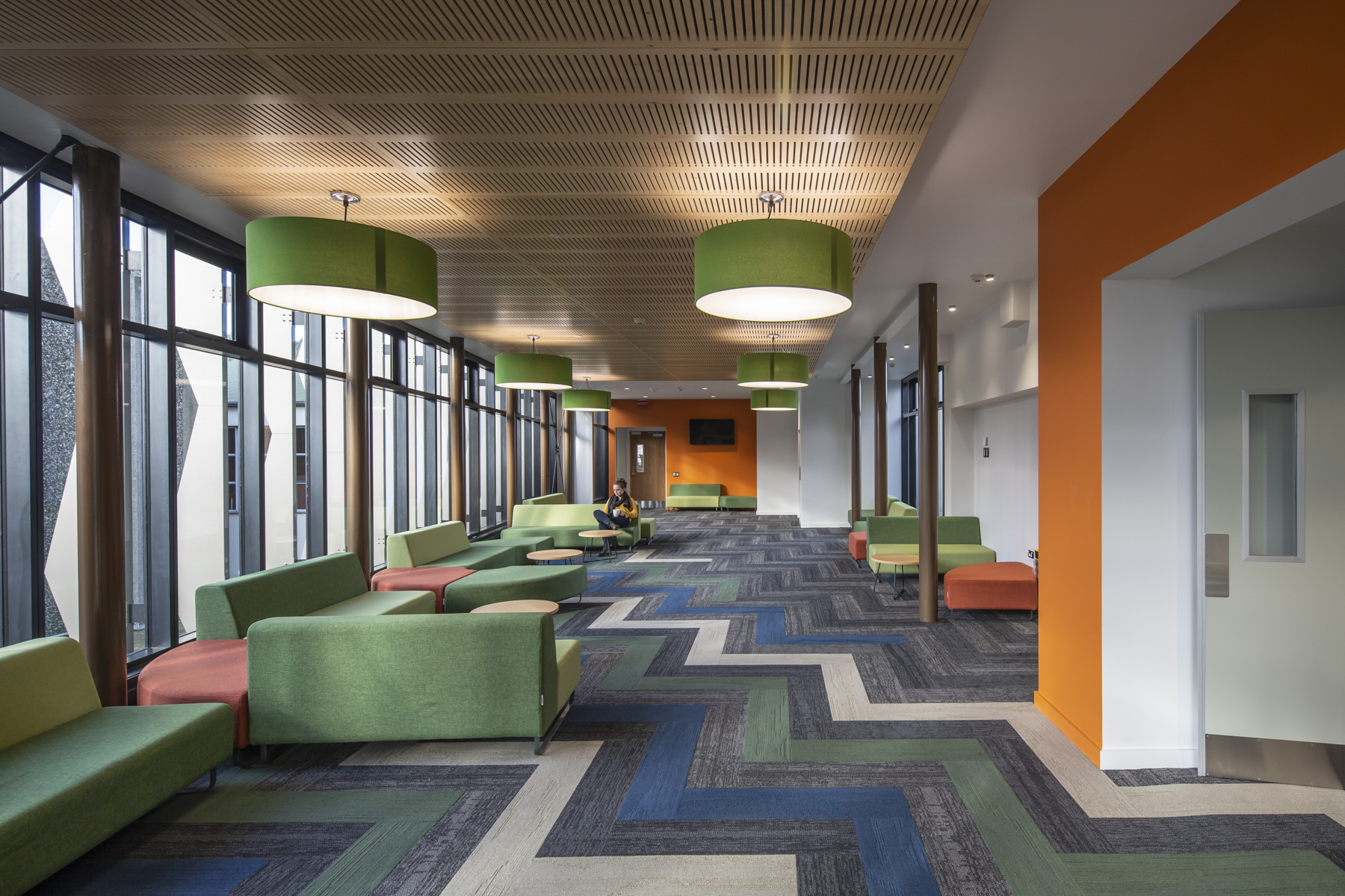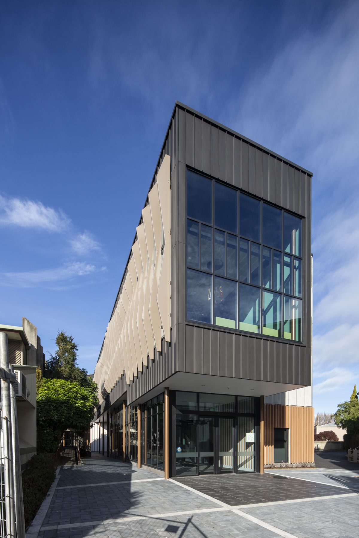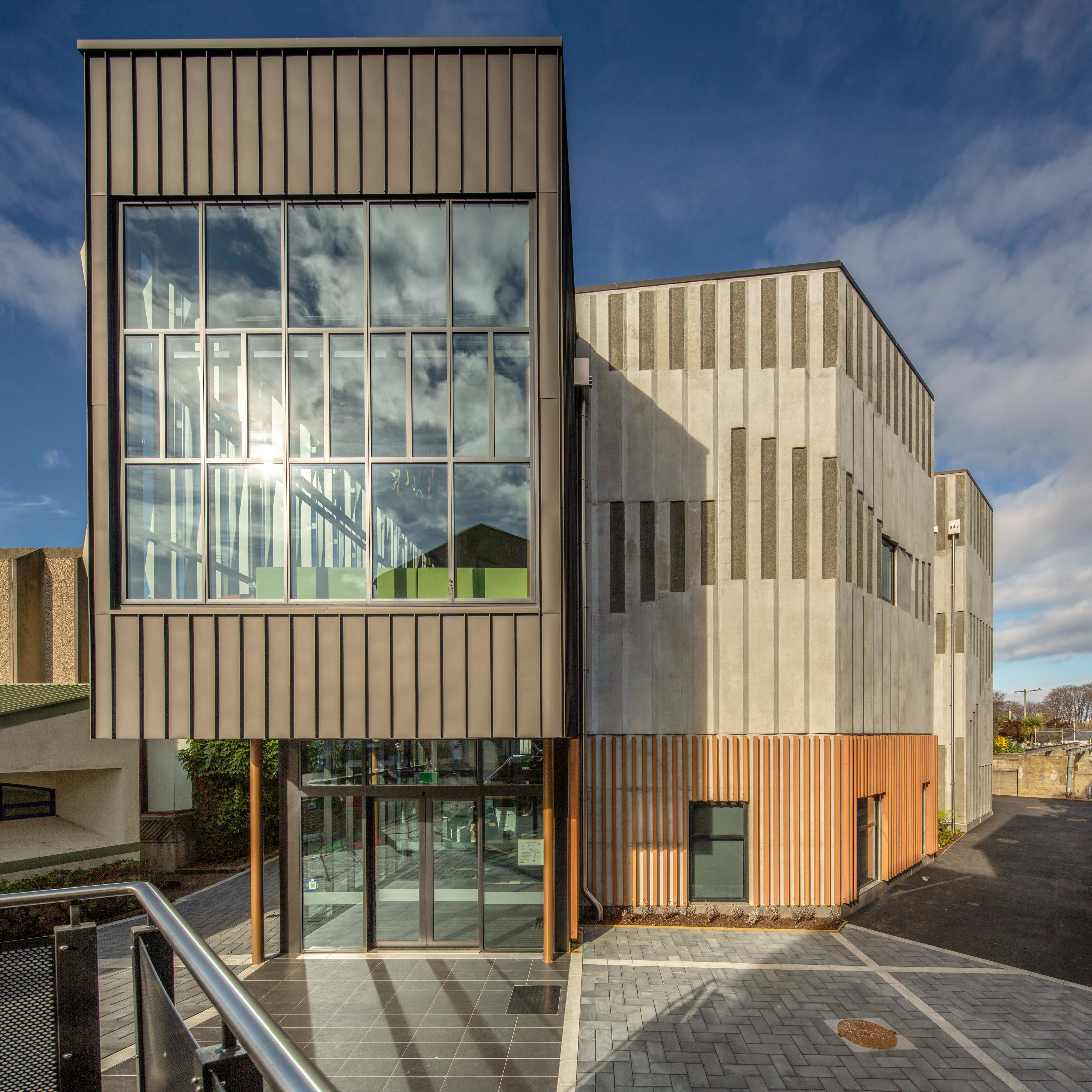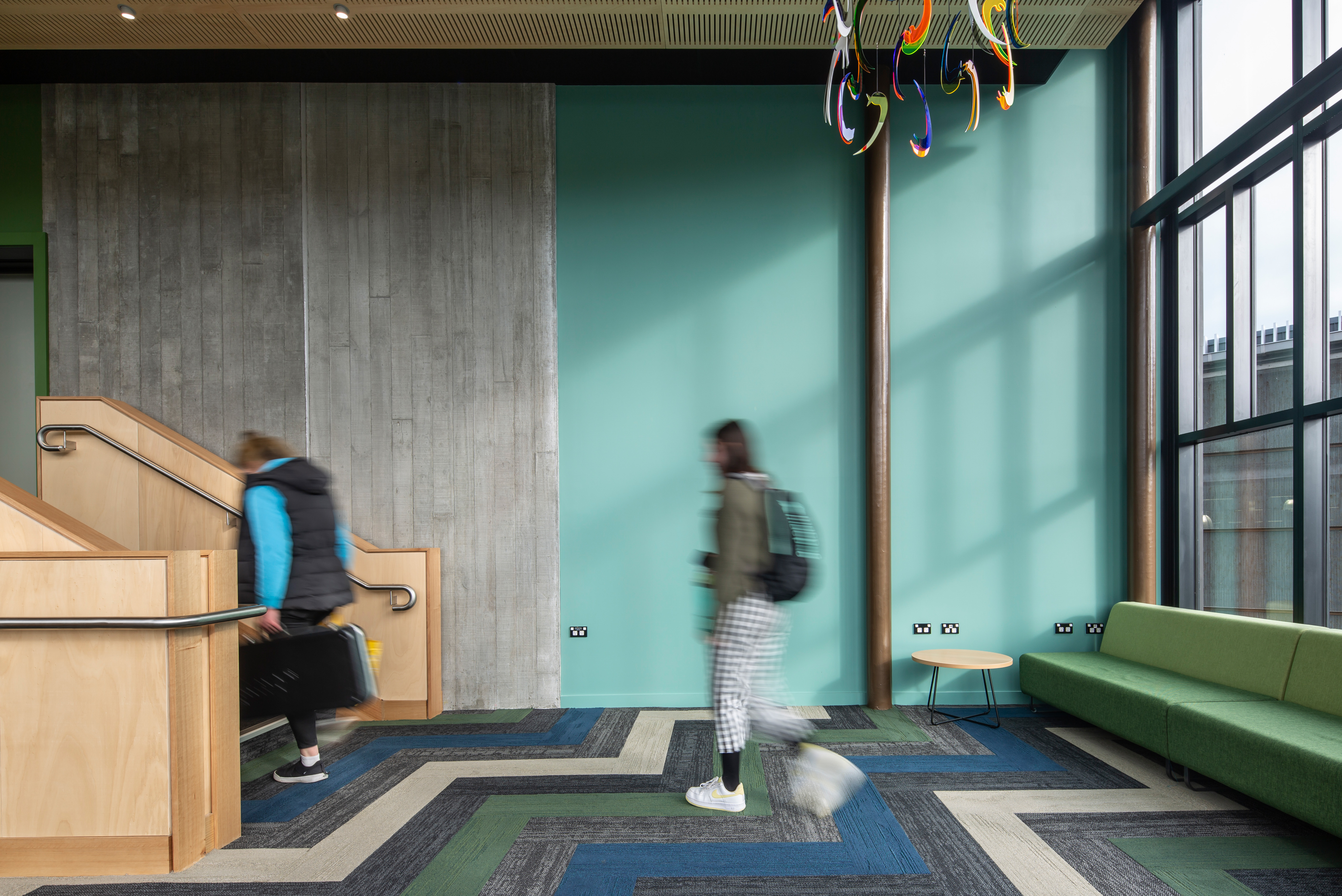 Attempting to capture the integration of music and performing arts teaching has been the inspiration for this project. Its essence has come alive in the recording studios, where vibrant colour and acoustic panels in a pixelated arrangement express the technical sonic atmosphere within. Locating the studios along the river to the south has enabled the student commons to open out to the north, allowing the energy and music of this new learning space to spill outdoors and enliven the campus.