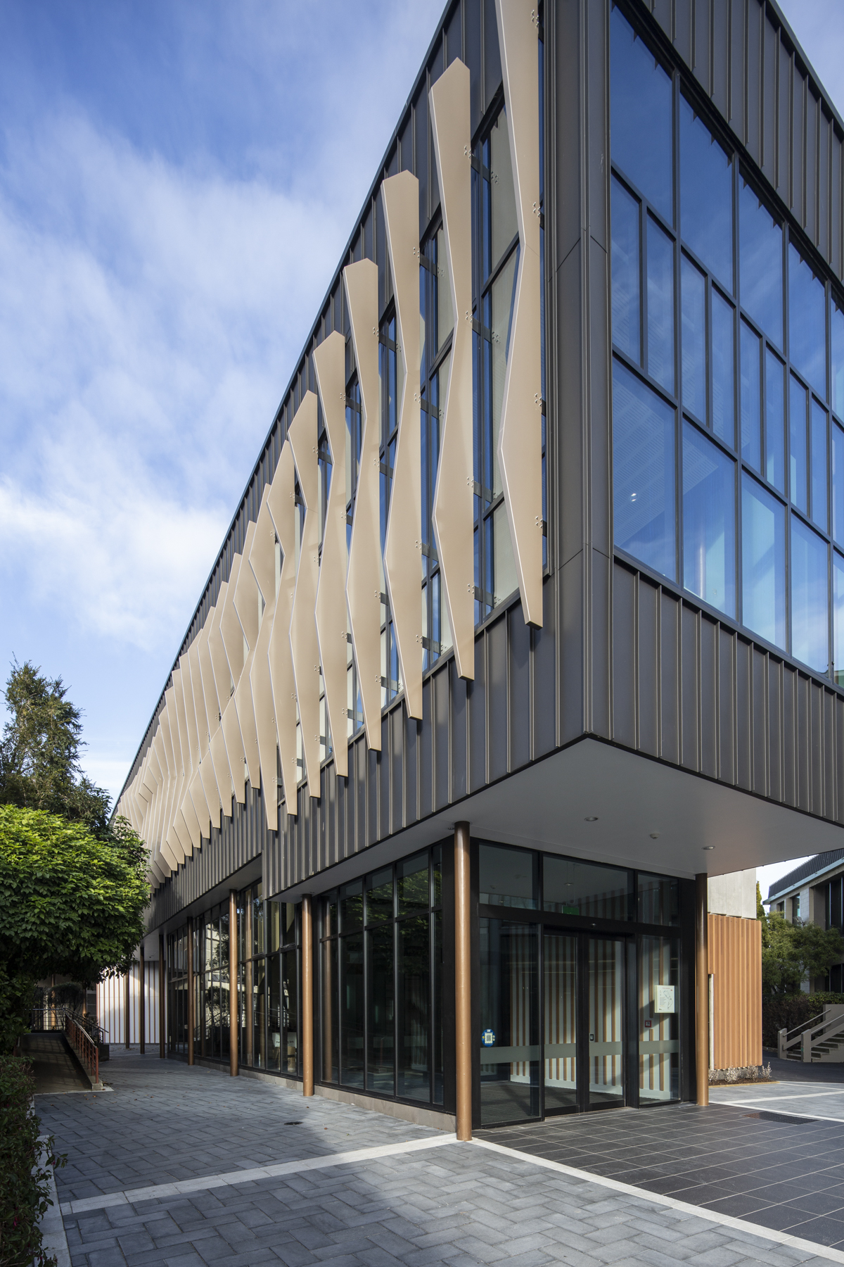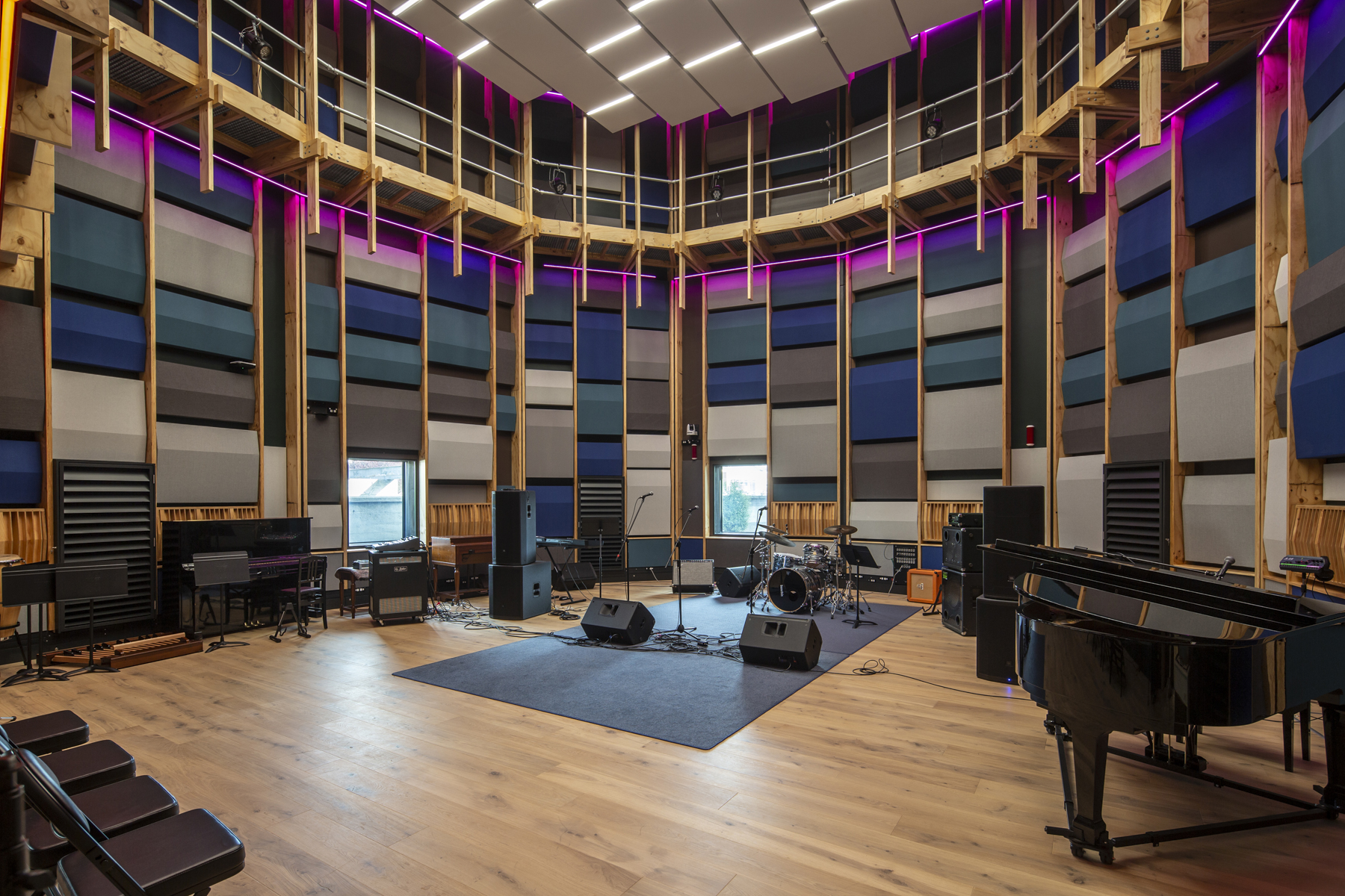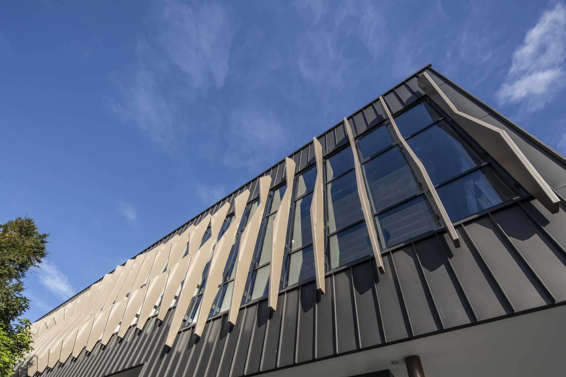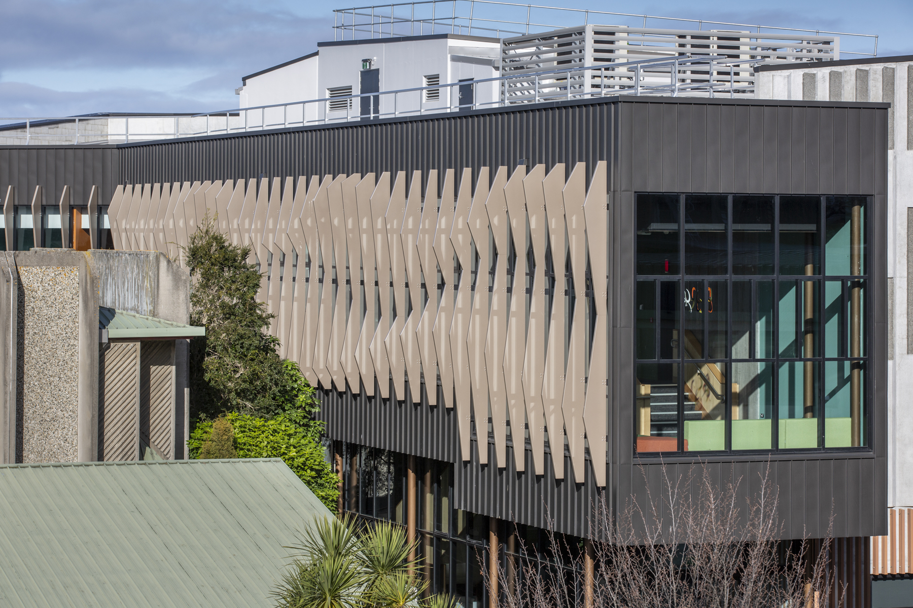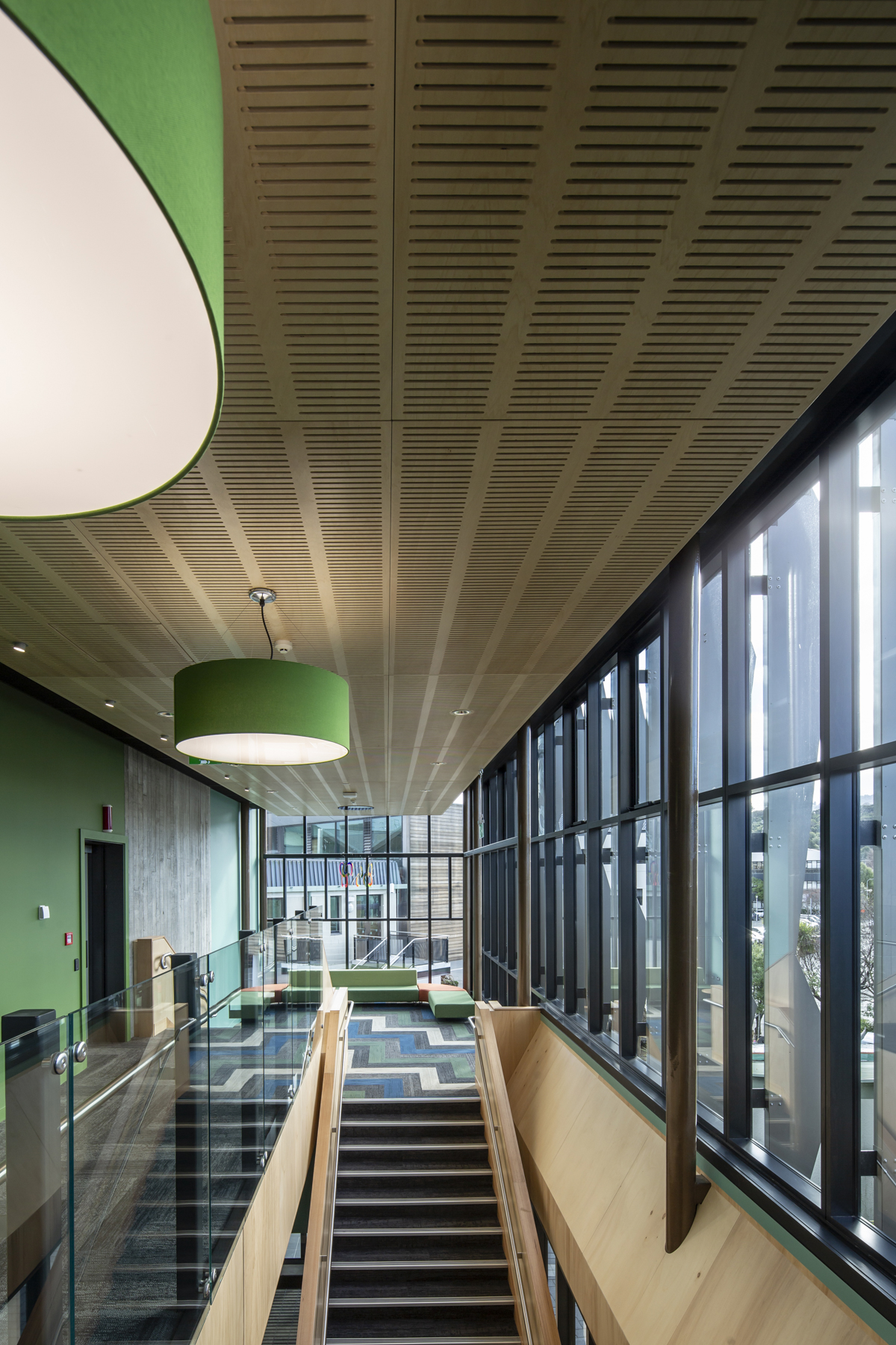 Attempting to capture the integration of music and performing arts teaching has been the inspiration for this project. Its essence has come alive in the recording studios, where vibrant colour and acoustic panels in a pixelated arrangement express the technical sonic atmosphere within. Locating the studios along the river to the south has enabled the student commons to open out to the north, allowing the energy and music of this new learning space to spill outdoors and enliven the campus.