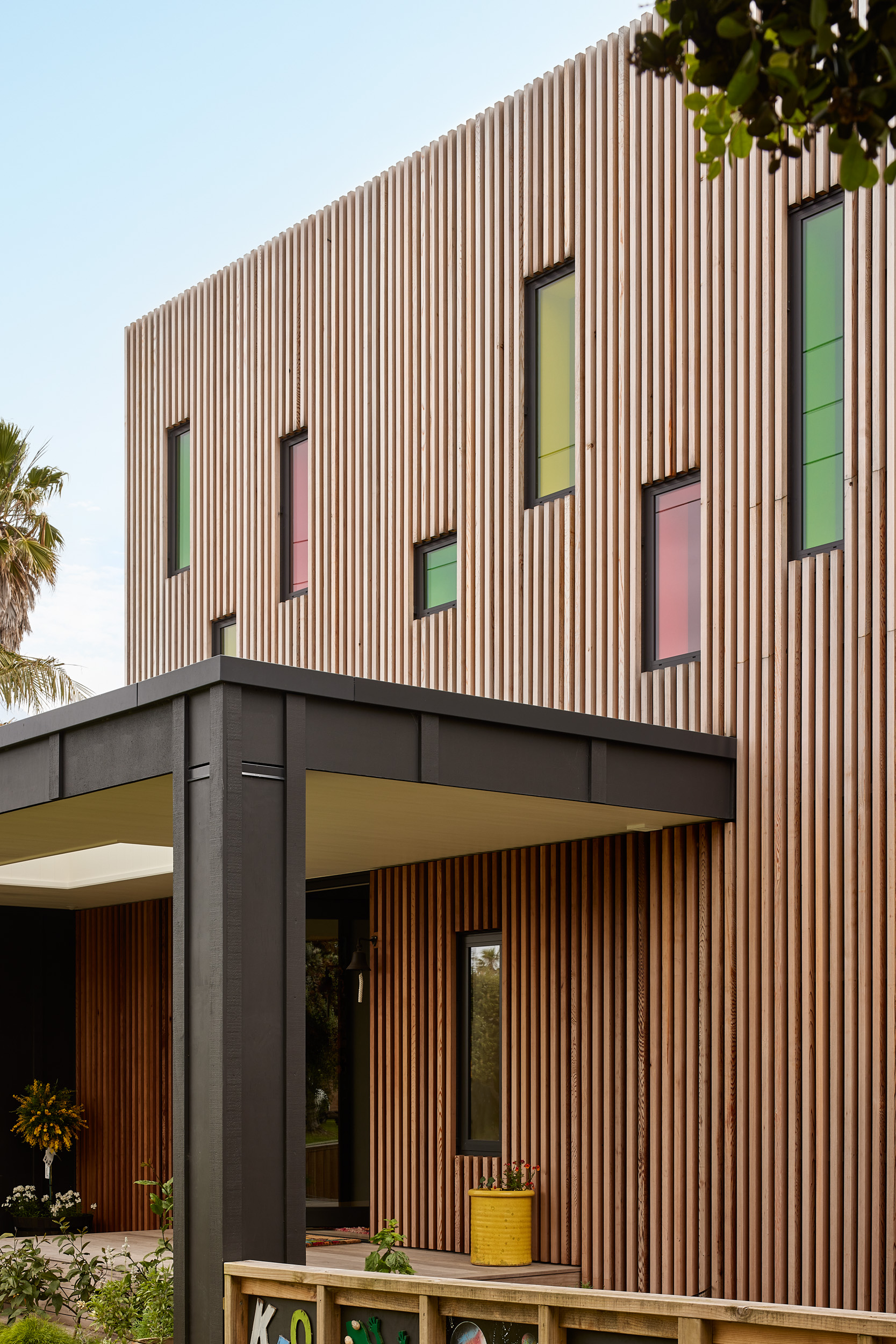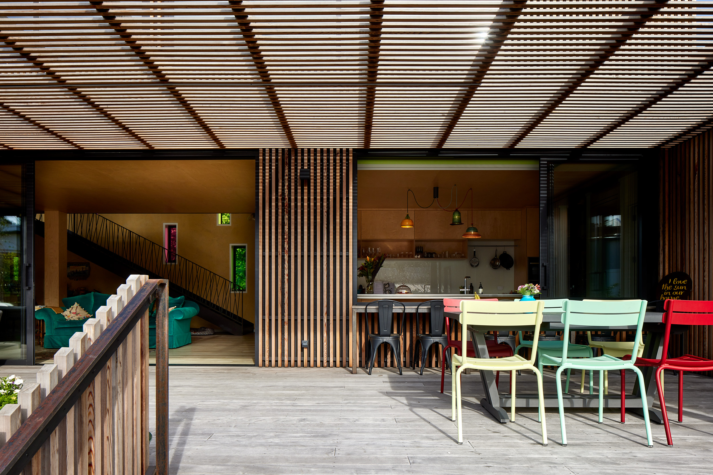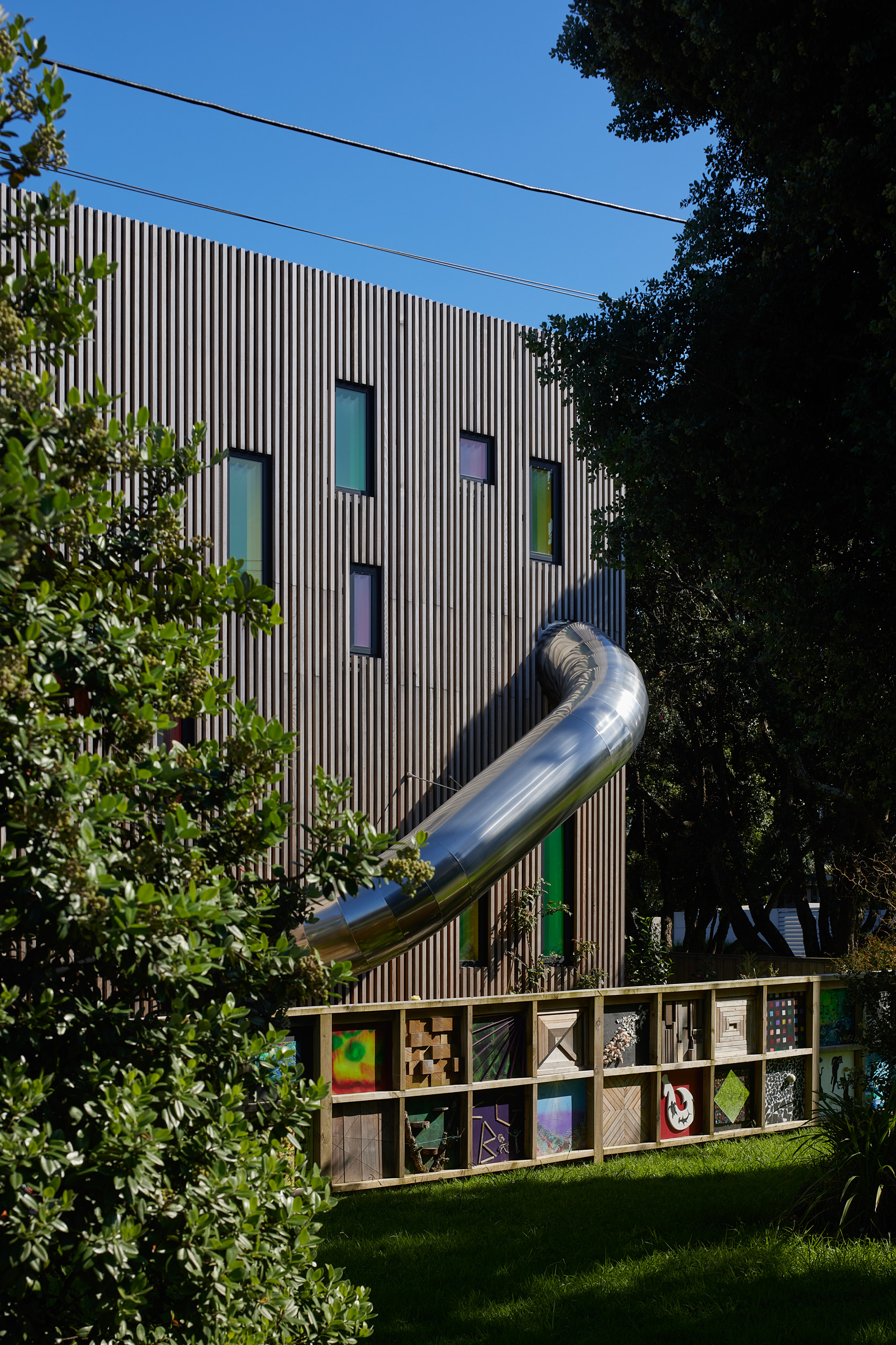Pip had a vision for a home with a sense of humour and a slide for her children and grandchildren to enjoy, Adam Mercer made it happen with a quirky house that reflects her personality. Elevated above the flood plain, the two-storey home sits tightly along the street front separating the public realm from the private internal spaces and sheltered northern courtyard beyond. The cedar batten rainscreen façade is punctuated with windows of varying size and colour, and a large-scale mural by a local artist features at the building’s street edge. By day pōhutukawa cast ever-changing shadows on the façade, while ethereal dappled light through coloured windows adds to the theatrical experience of the entry, stair and living spaces. By night the home becomes a whimsical colourful lantern. This delightful architectural response encourages curiosity, intrigue and playfulness, exudes positivity and promotes community and conversation.