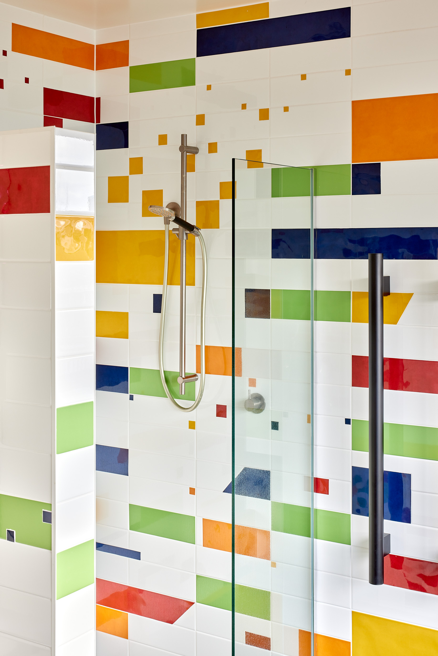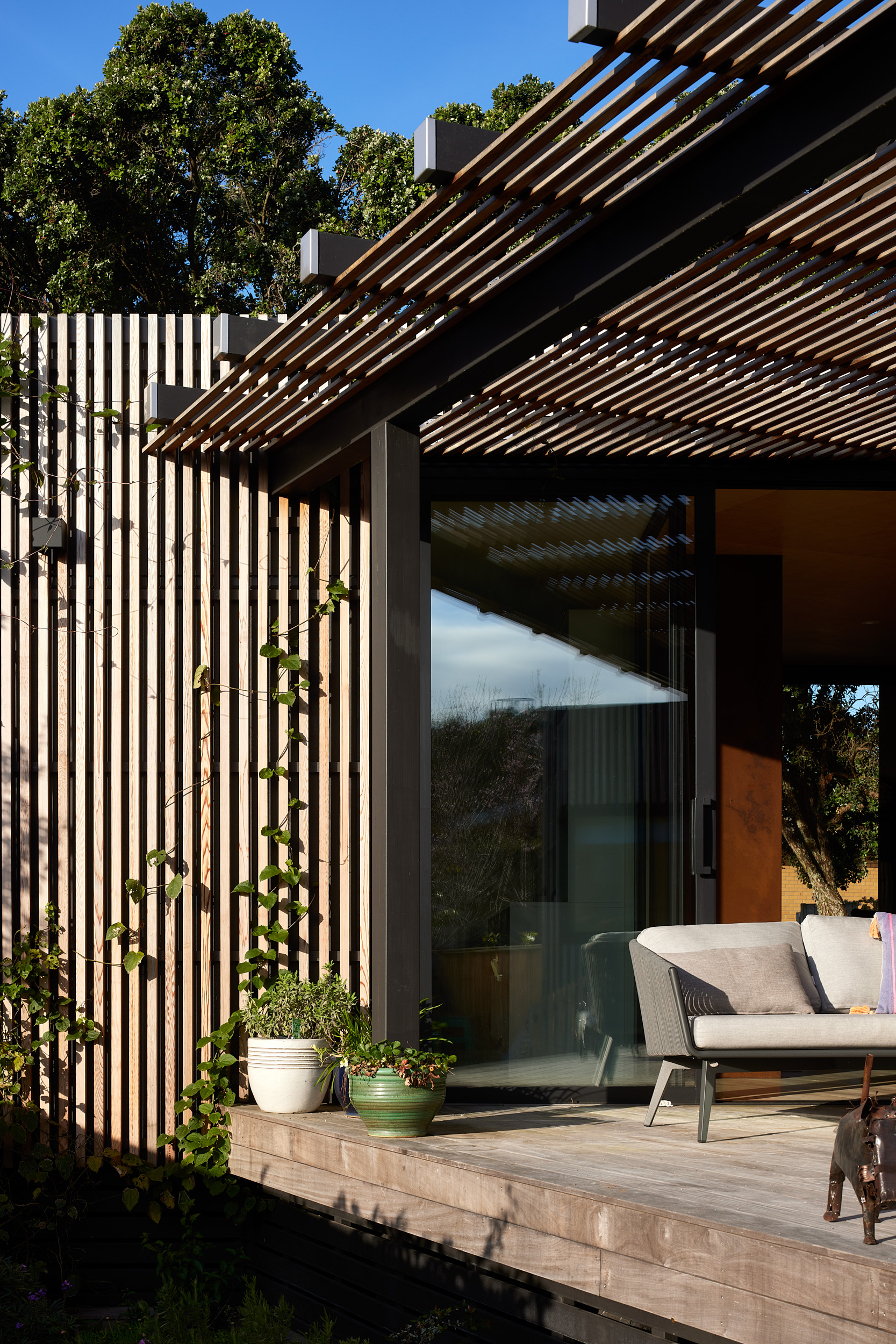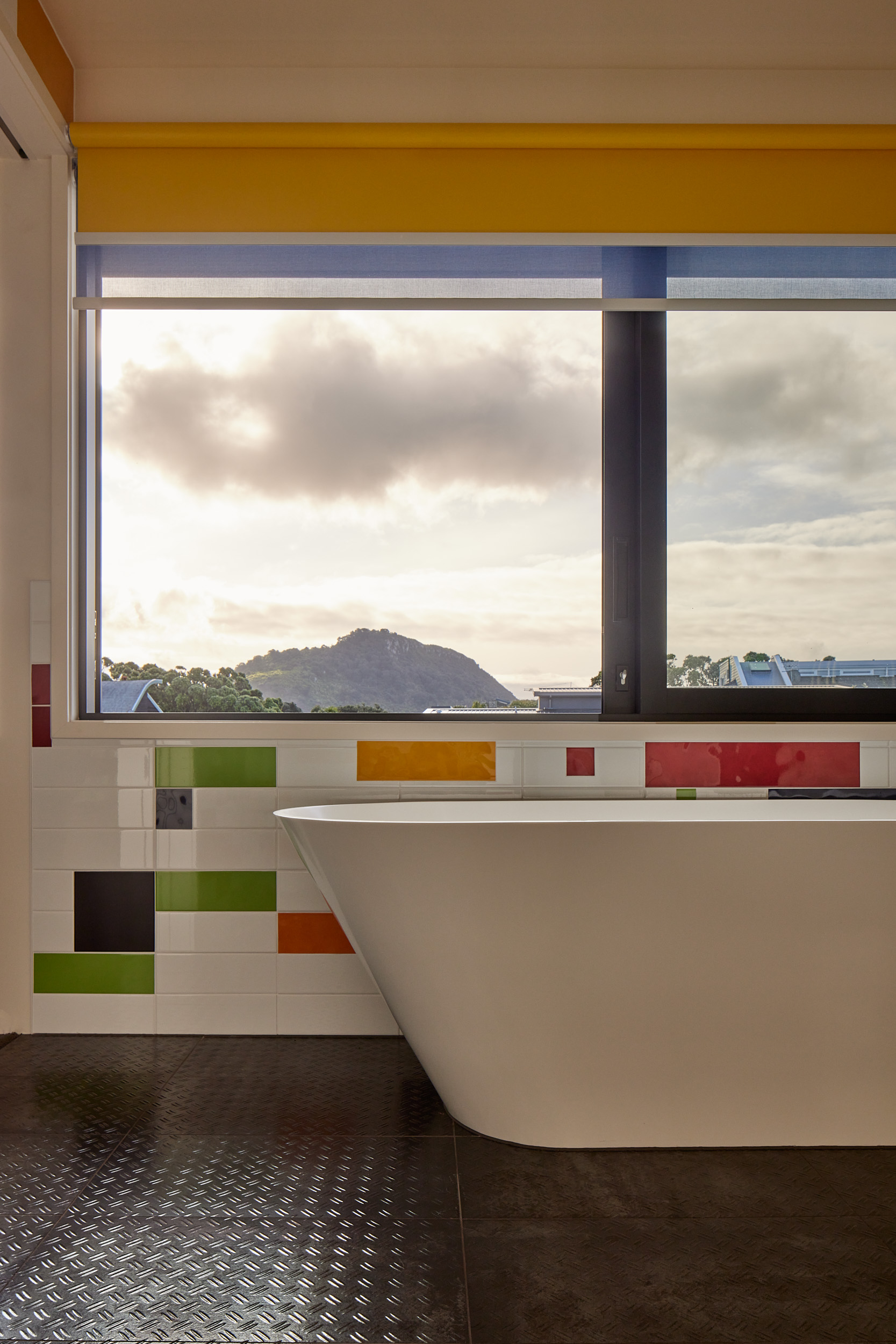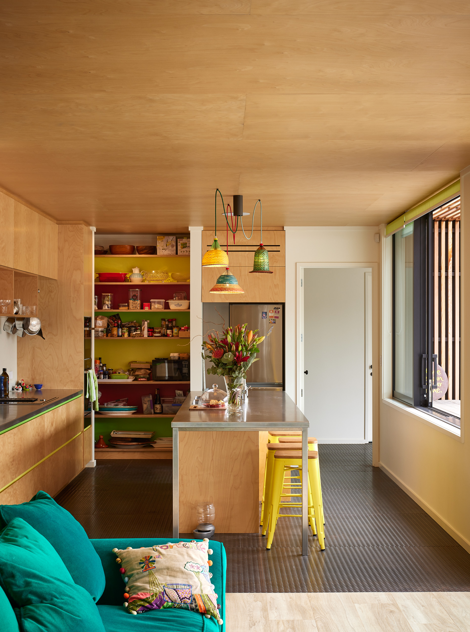 Pip had a vision for a home with a sense of humour and a slide for her children and grandchildren to enjoy, Adam Mercer made it happen with a quirky house that reflects her personality. Elevated above the flood plain, the two-storey home sits tightly along the street front separating the public realm from the private internal spaces and sheltered northern courtyard beyond. The cedar batten rainscreen façade is punctuated with windows of varying size and colour, and a large-scale mural by a local artist features at the building’s street edge. By day pōhutukawa cast ever-changing shadows on the façade, while ethereal dappled light through coloured windows adds to the theatrical experience of the entry, stair and living spaces. By night the home becomes a whimsical colourful lantern. This delightful architectural response encourages curiosity, intrigue and playfulness, exudes positivity and promotes community and conversation.