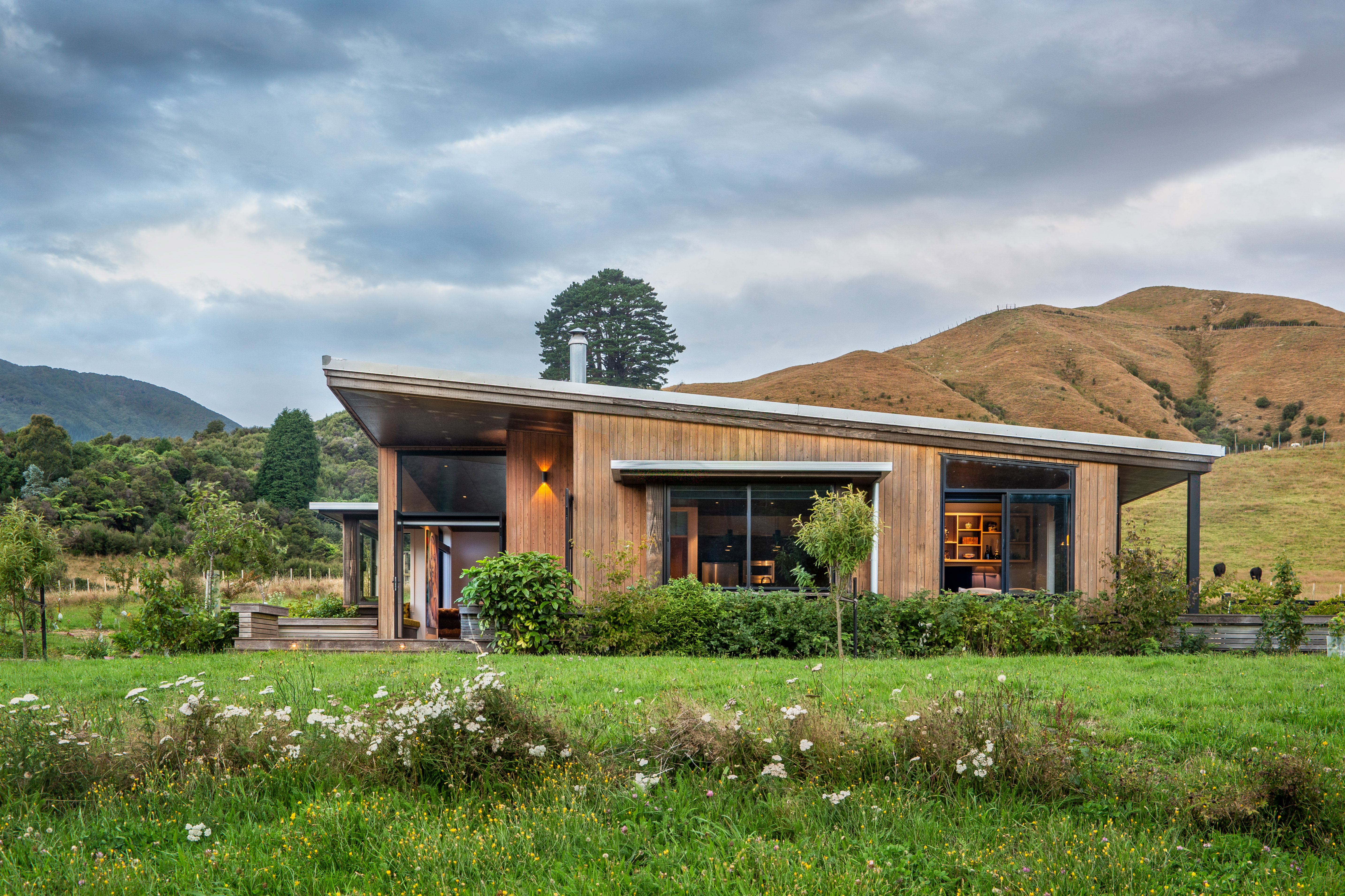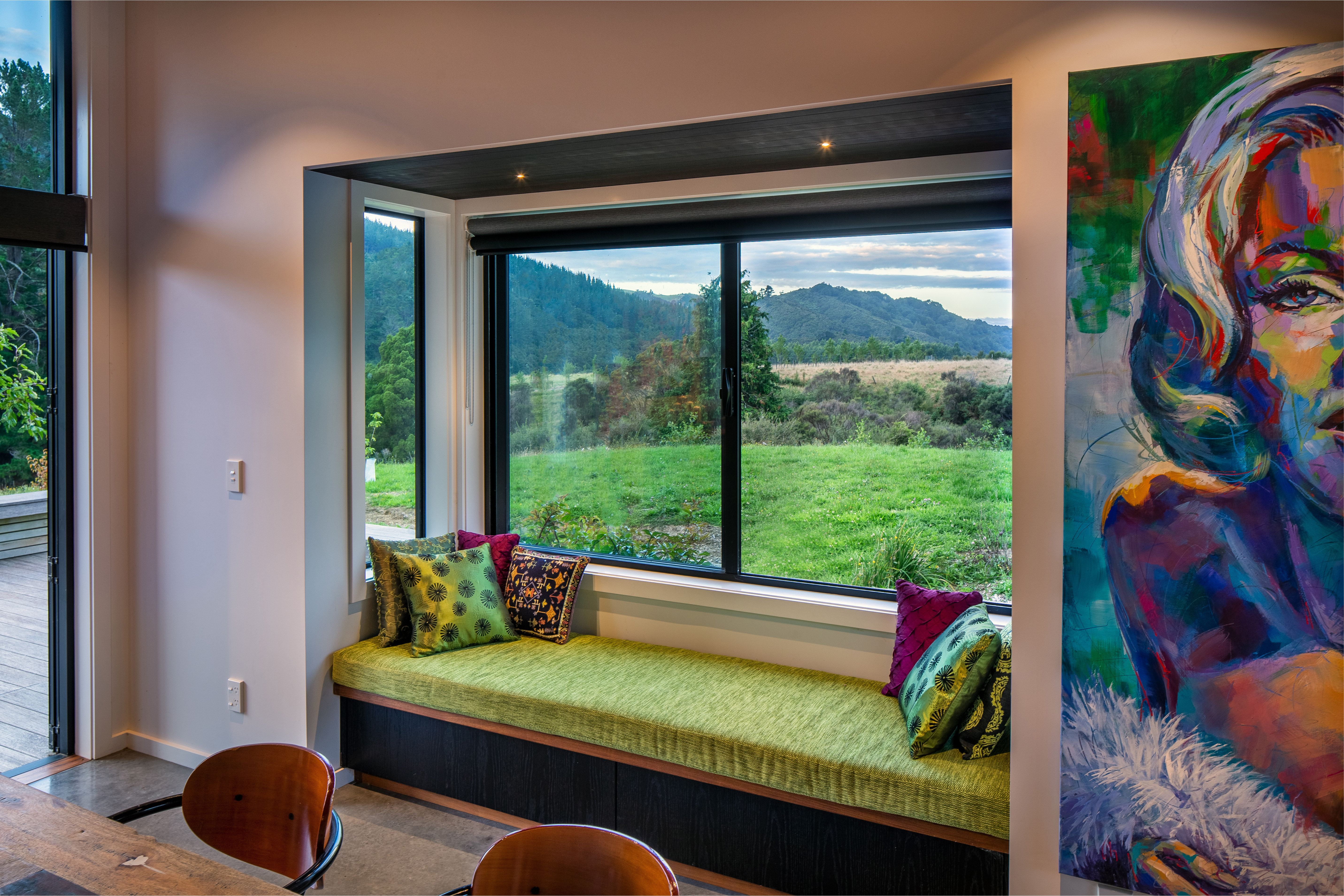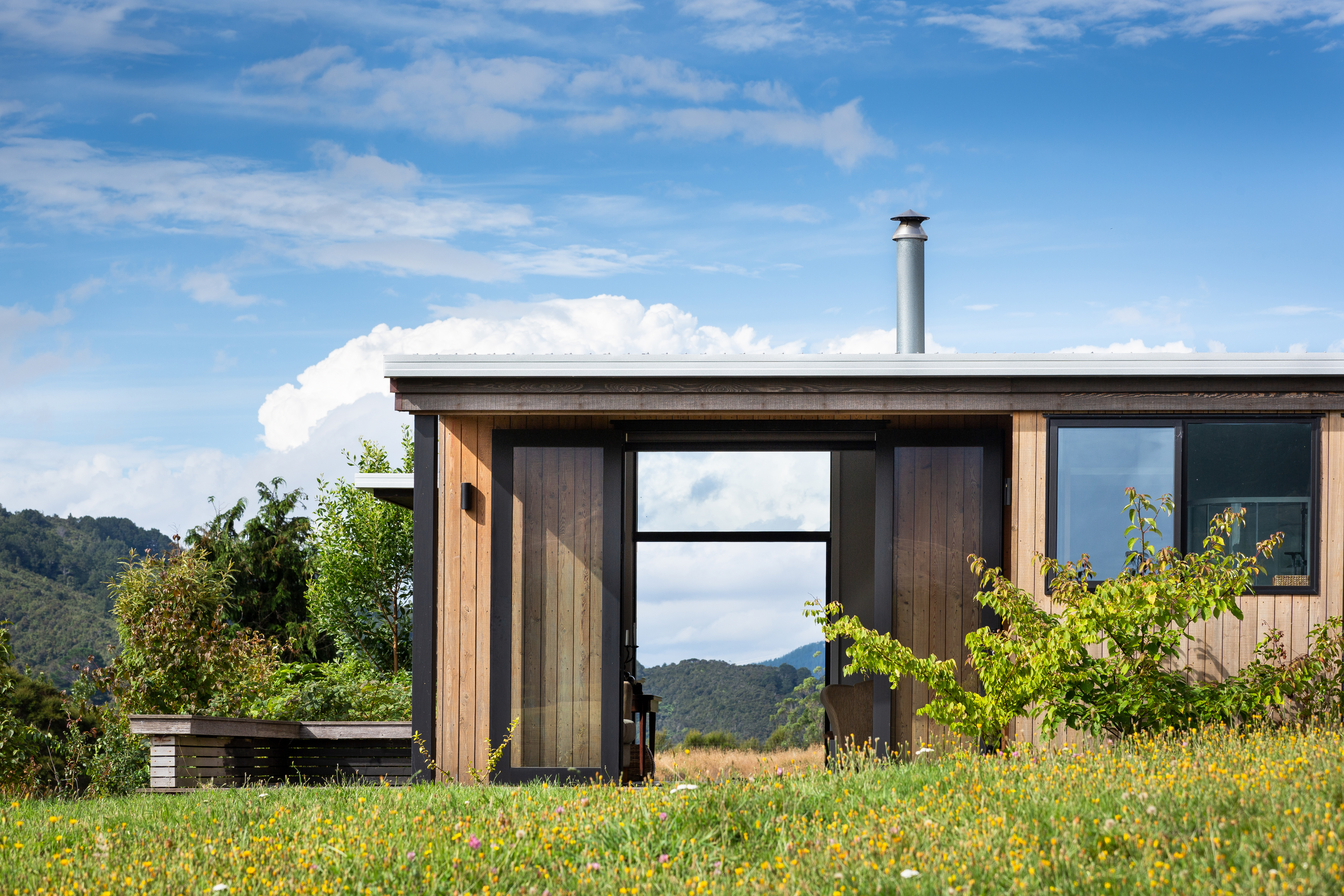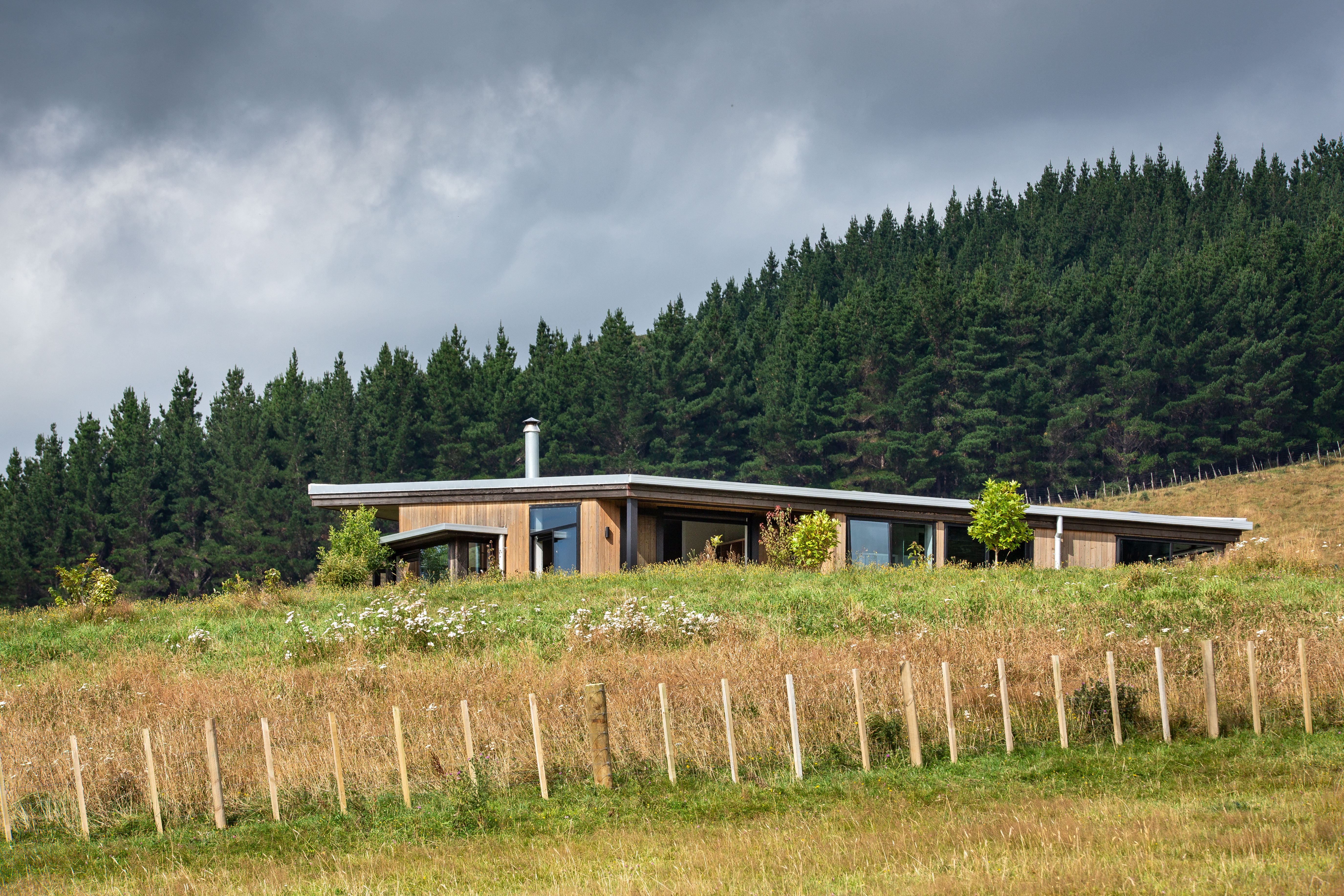 The Sparrow House has been thoughtfully positioned in a field behind a small rise in the land. A modest square floor plan has been mirrored around a centrally located kitchen in true Palladian style to create a full kaleidoscope of bay windows. Built-in seating and covered decks span outward from the centre to extend the full perimeter of the building. This creates panoramic views while providing many sunny spots to shelter from the prevailing winds. This is a deceptively simple house which responds superbly to its environment. It is constructed of materials appropriate to a rural home with workmanship to match.