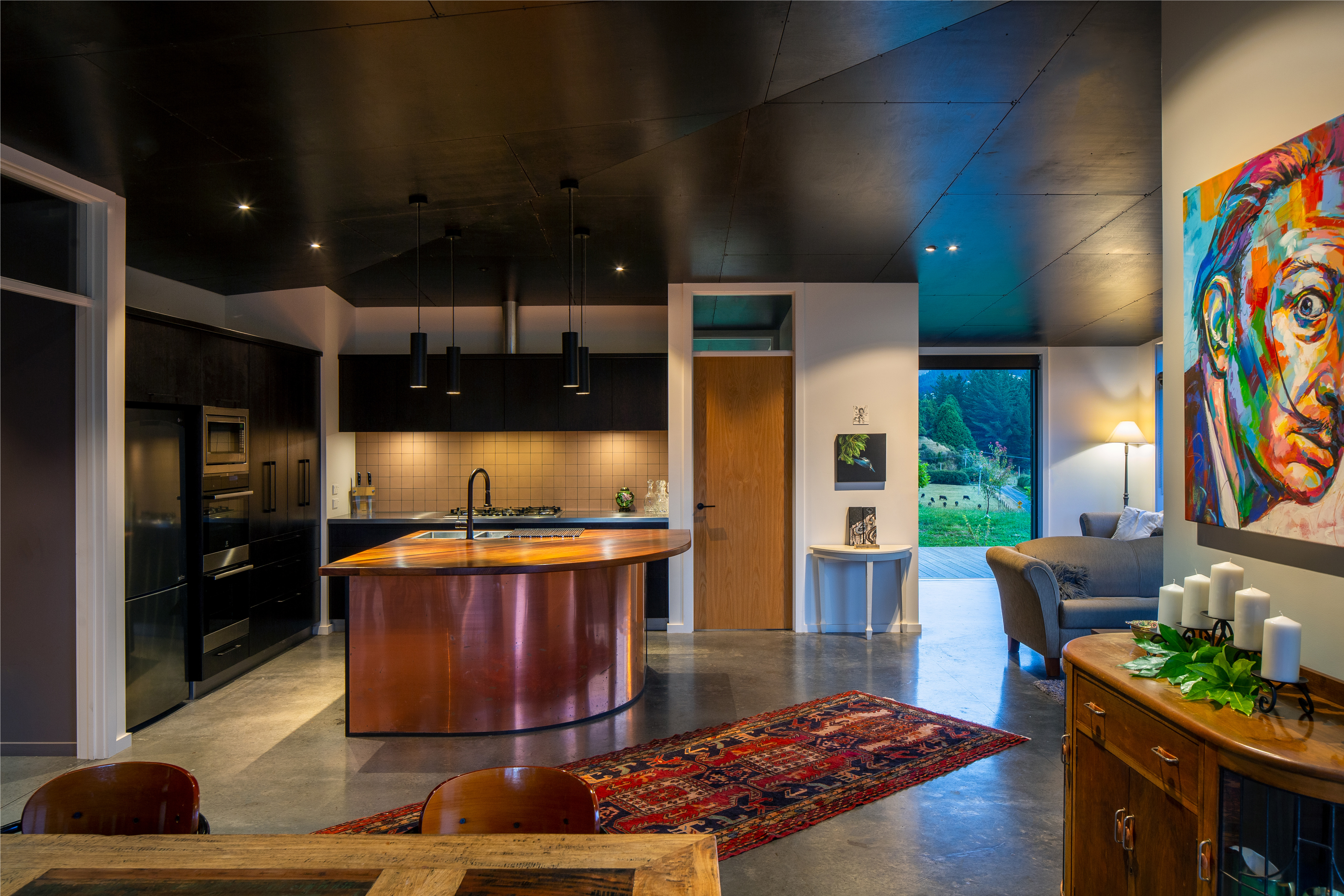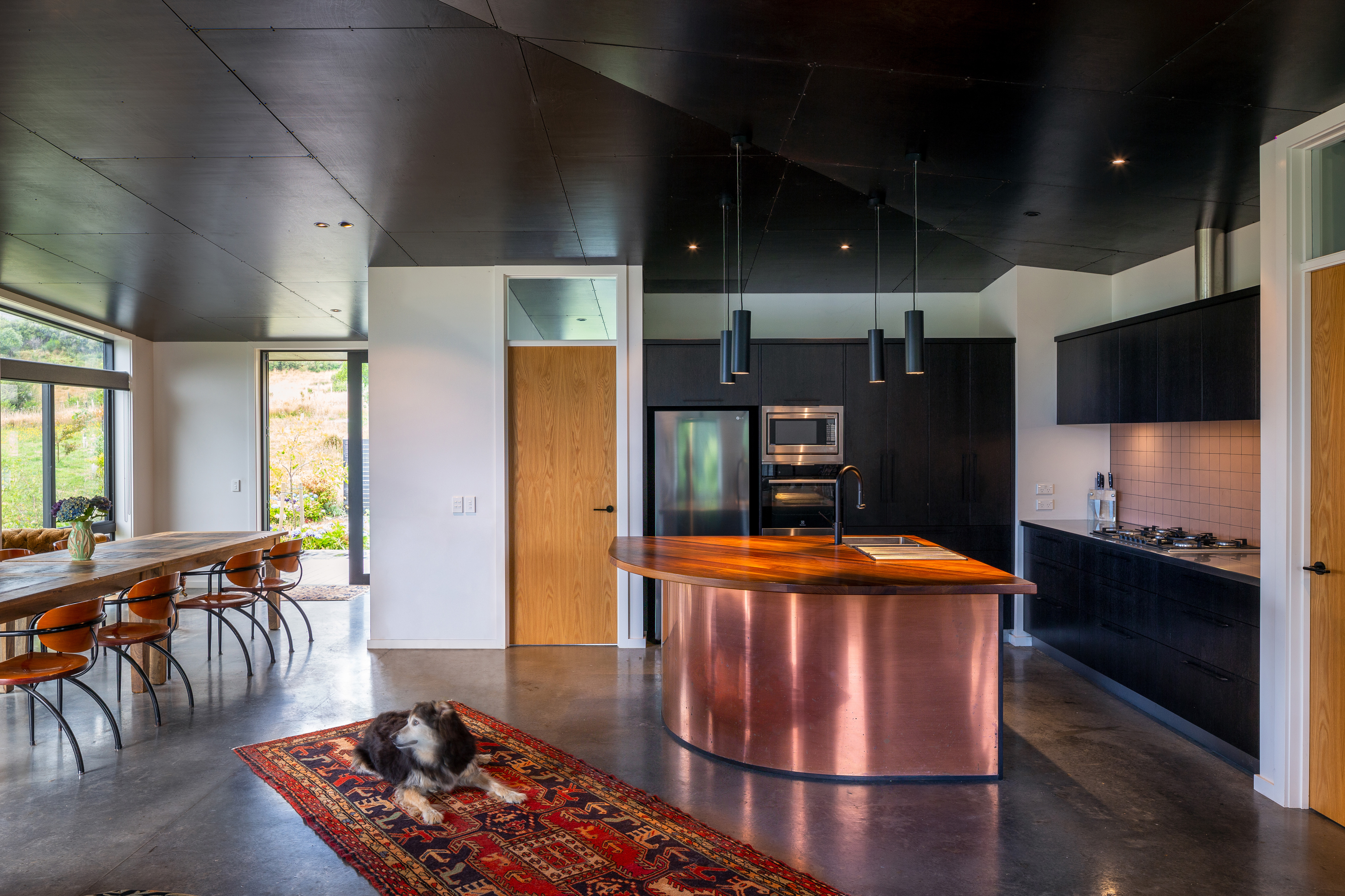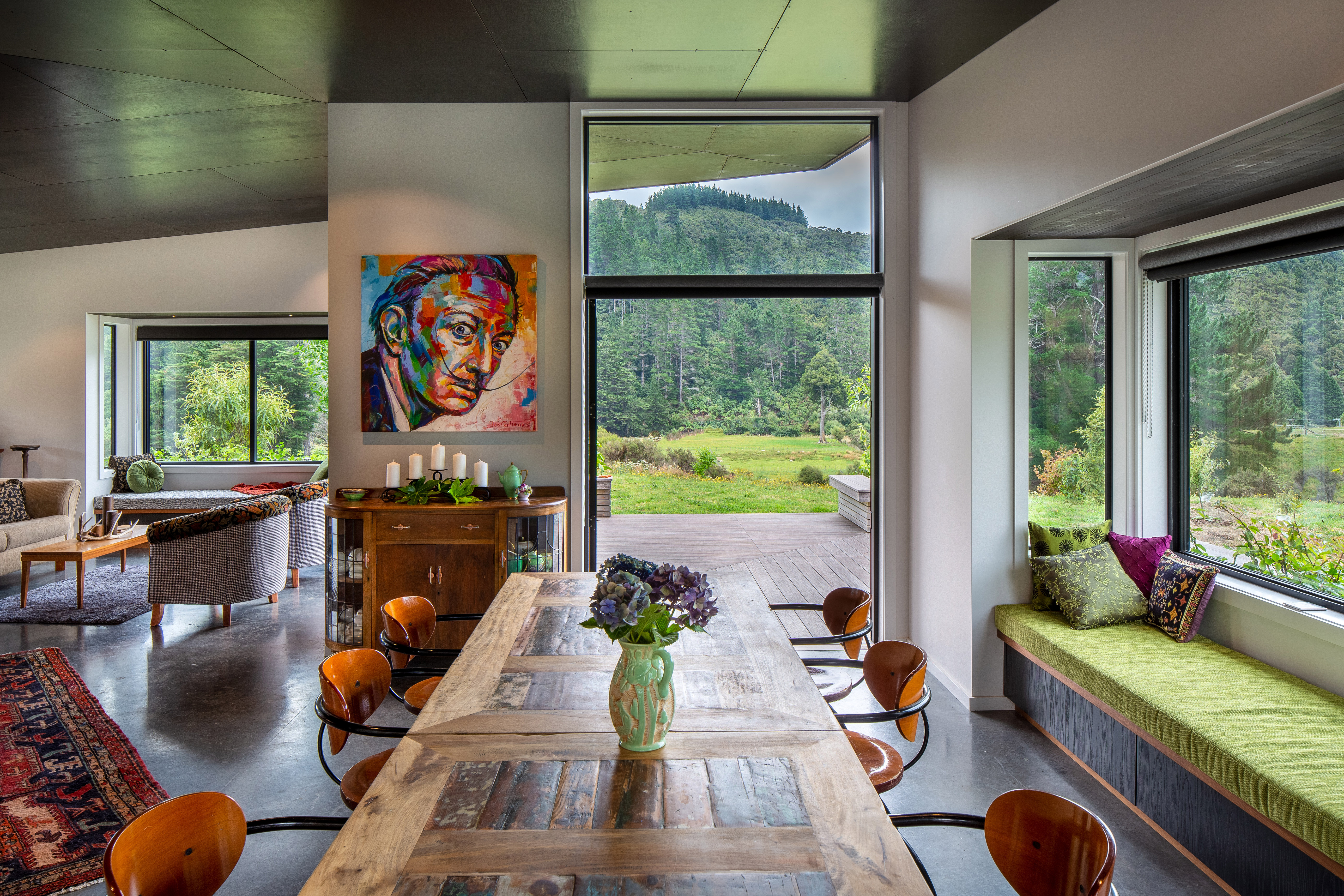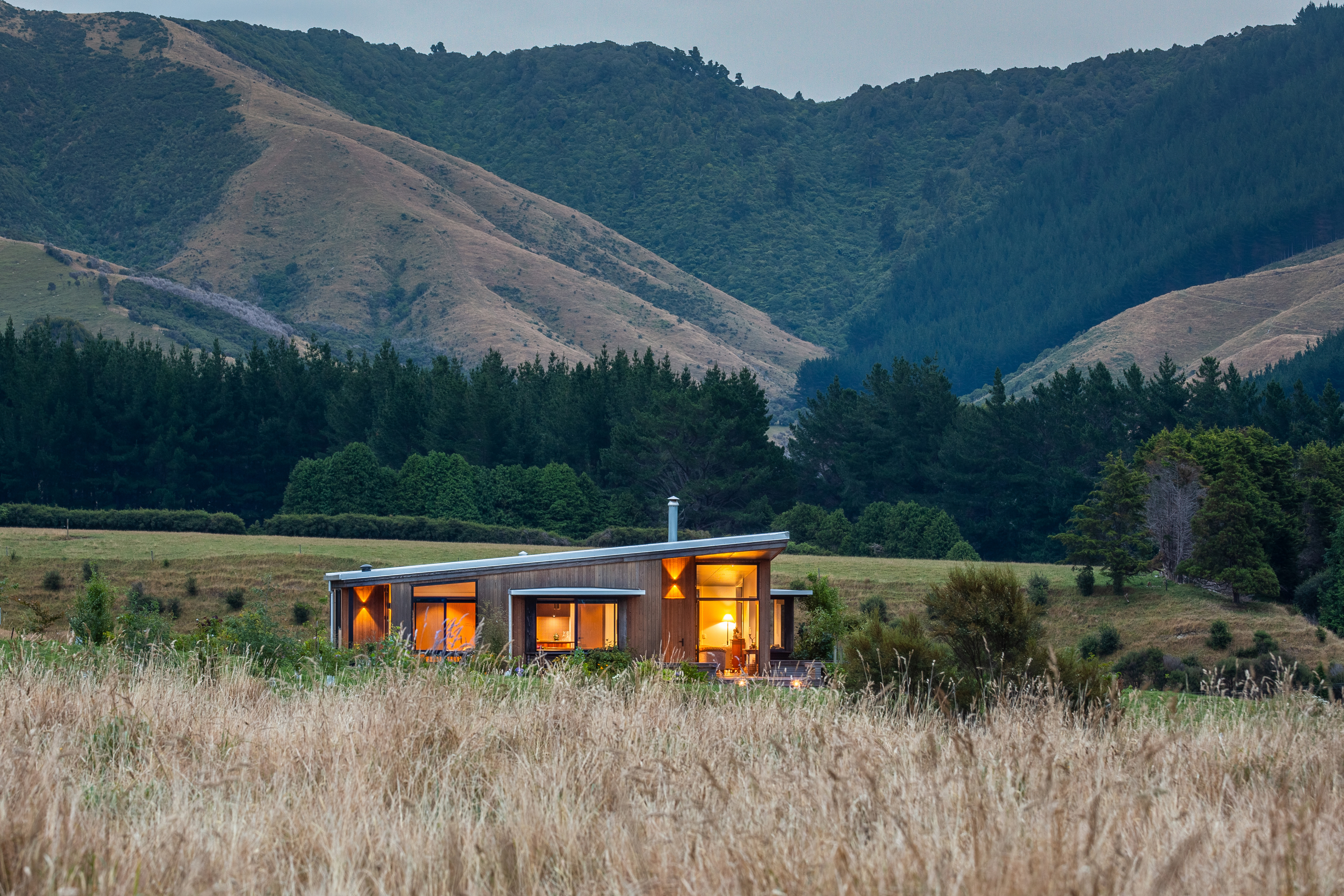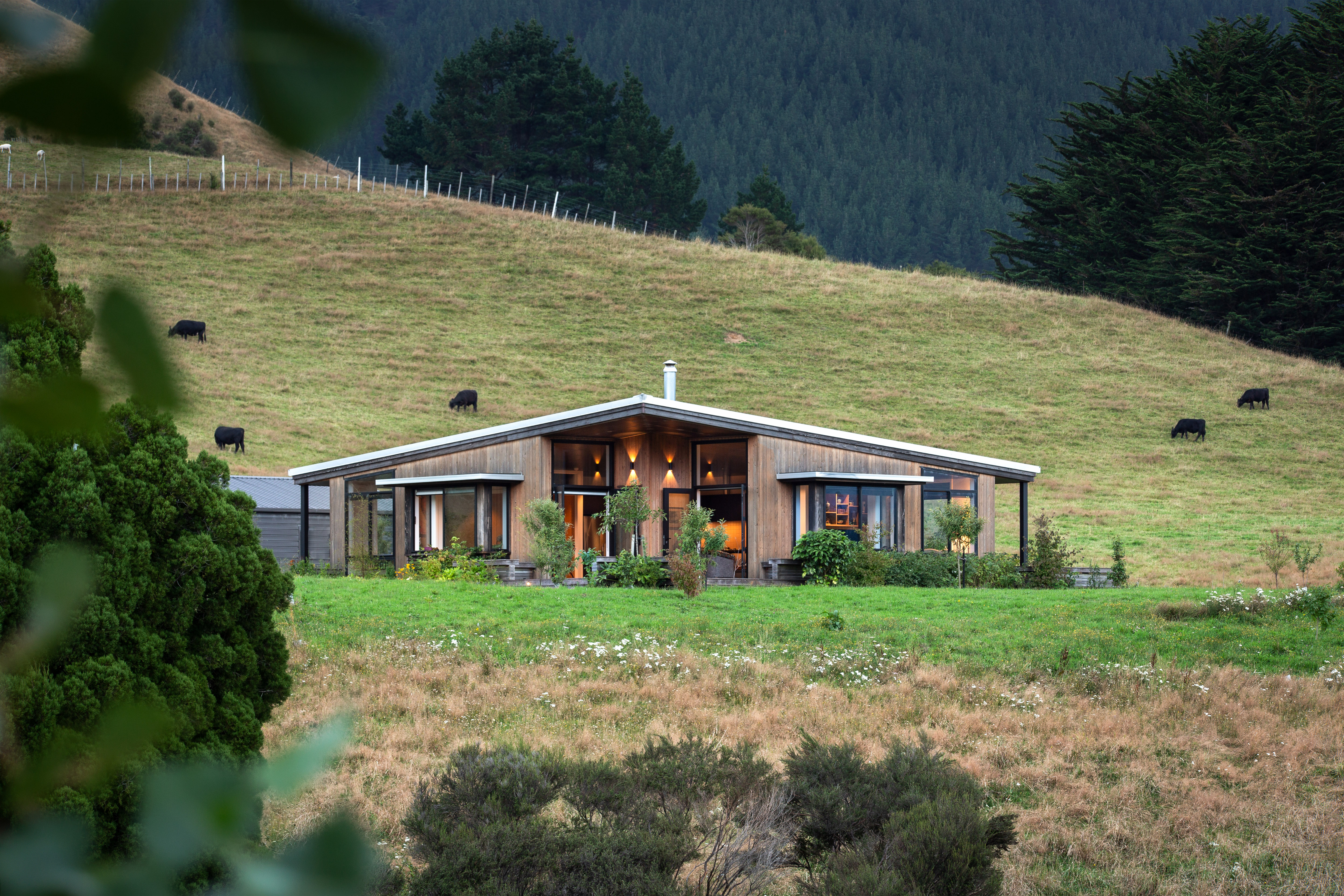 The Sparrow House has been thoughtfully positioned in a field behind a small rise in the land. A modest square floor plan has been mirrored around a centrally located kitchen in true Palladian style to create a full kaleidoscope of bay windows. Built-in seating and covered decks span outward from the centre to extend the full perimeter of the building. This creates panoramic views while providing many sunny spots to shelter from the prevailing winds. This is a deceptively simple house which responds superbly to its environment. It is constructed of materials appropriate to a rural home with workmanship to match.