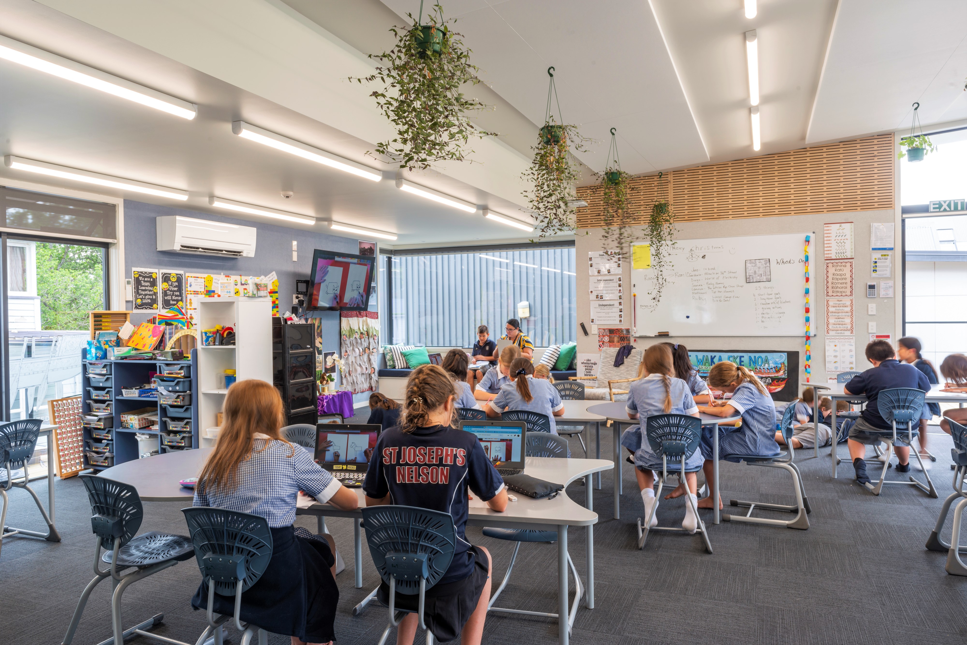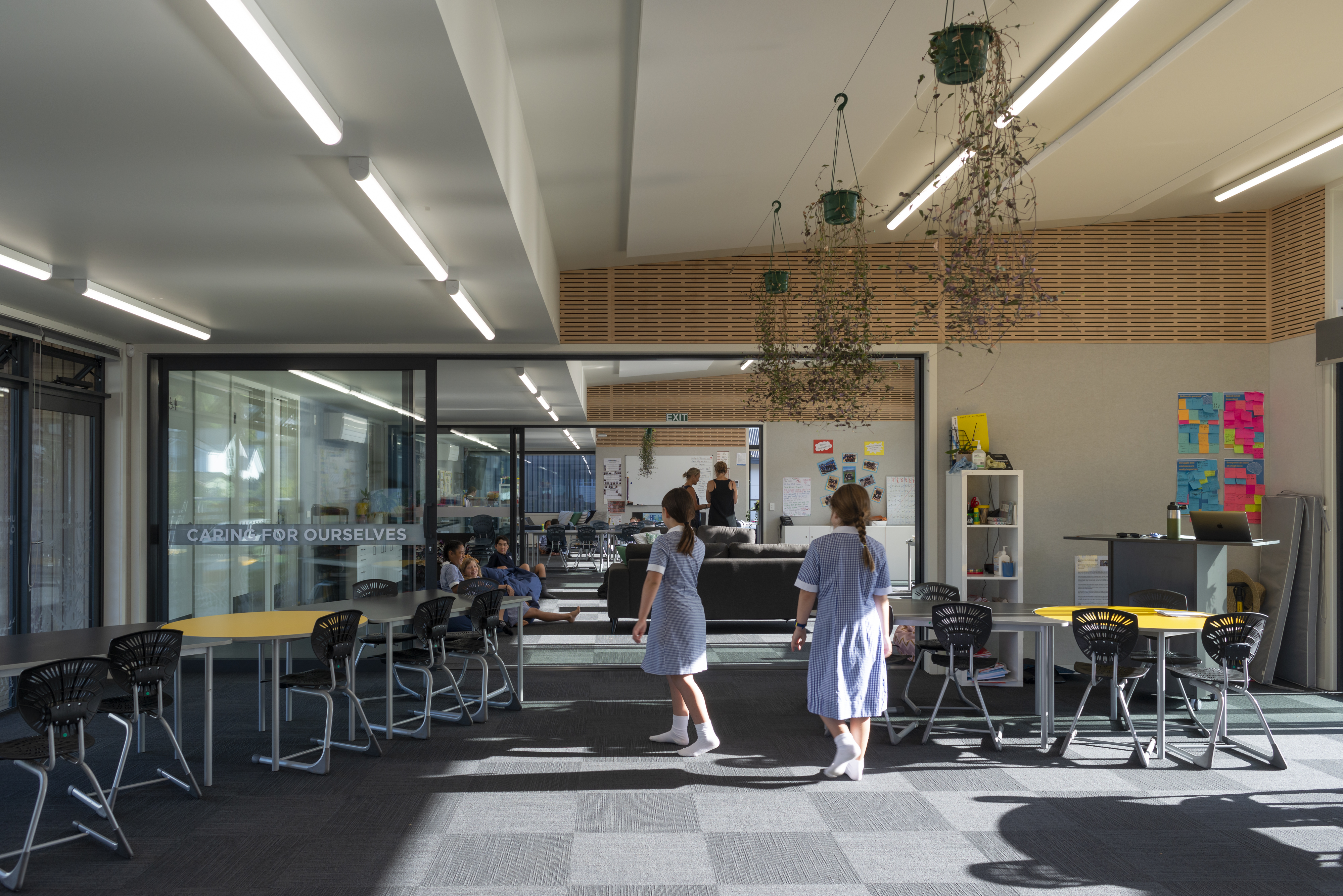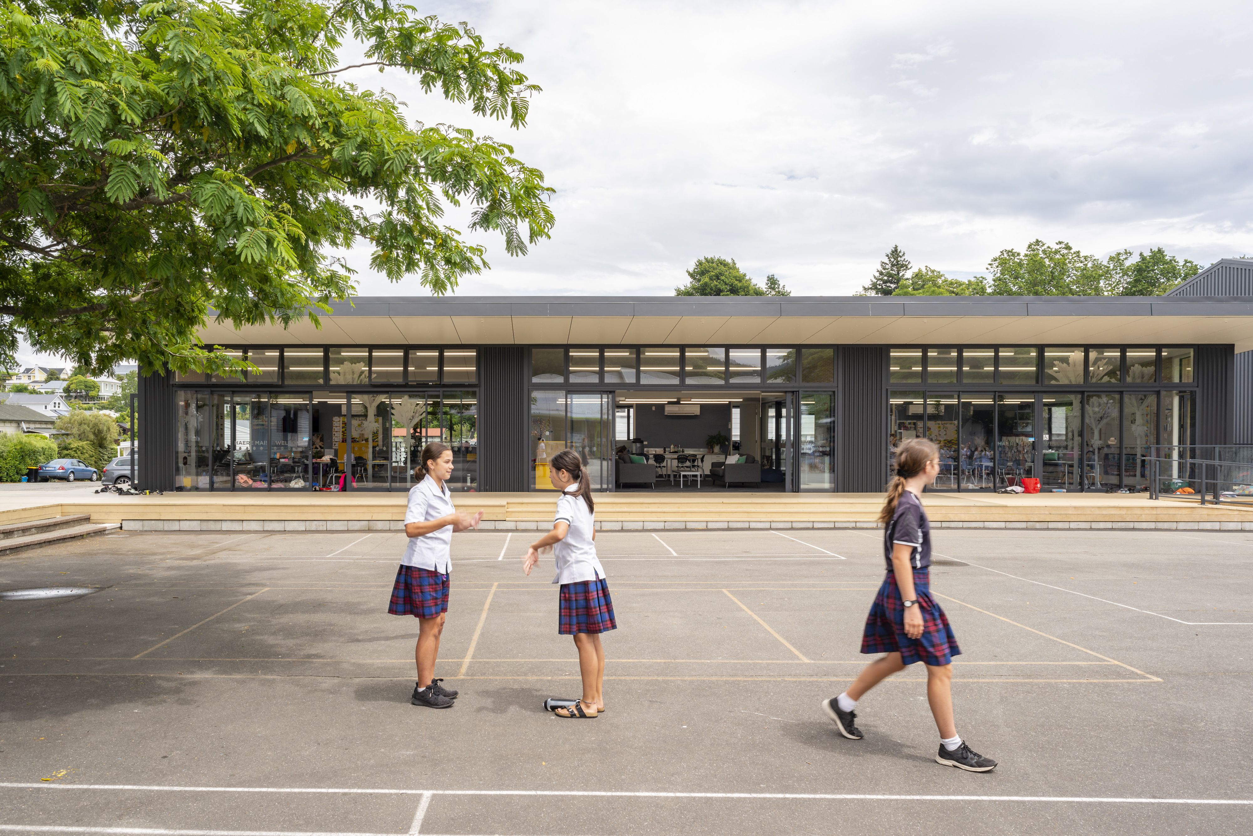 Carefully sited to complete the western side of a central quadrangle, this building gives a contemporary edge to the pivotal open space at the heart of the campus of St Joseph’s School. Broad overhangs shield extensive glazing and provide sheltered outdoor space for learning and play. In a light and open counterpoint to the adjacent more traditional school buildings, operable doors allow free movement from within to without. Well-detailed internal spaces, with beneficial natural lighting and acoustics, provide flexible and highly appropriate learning environments.