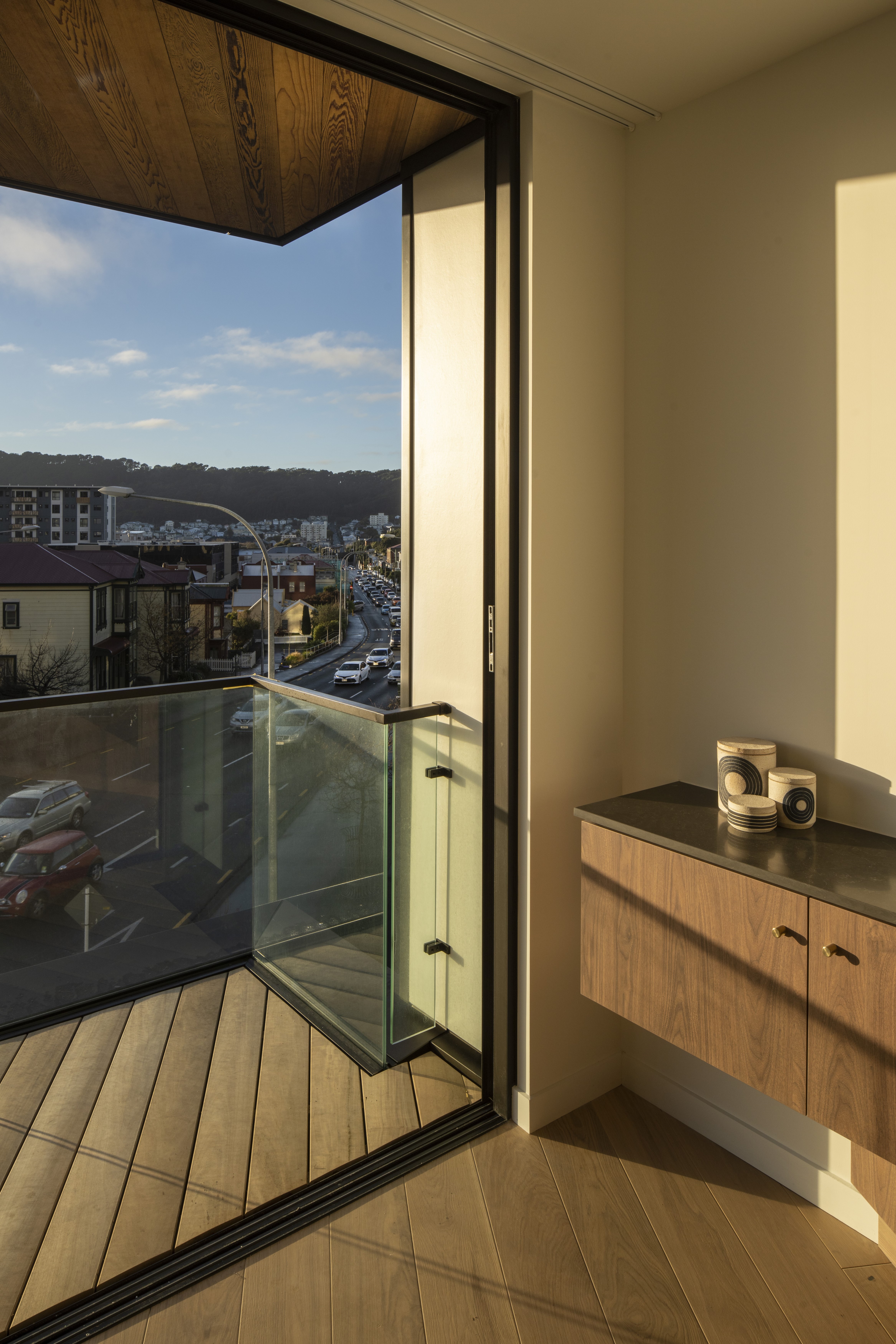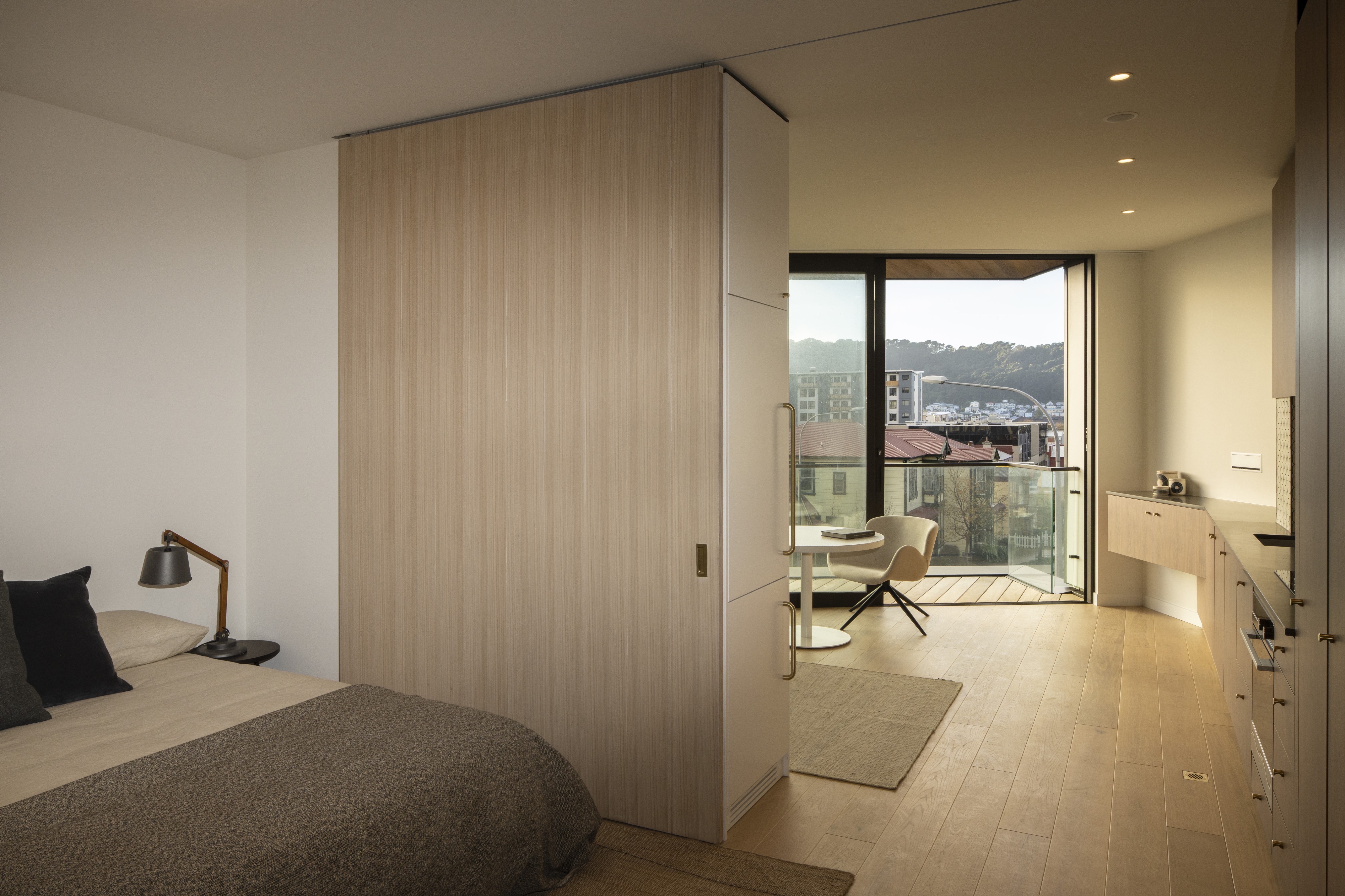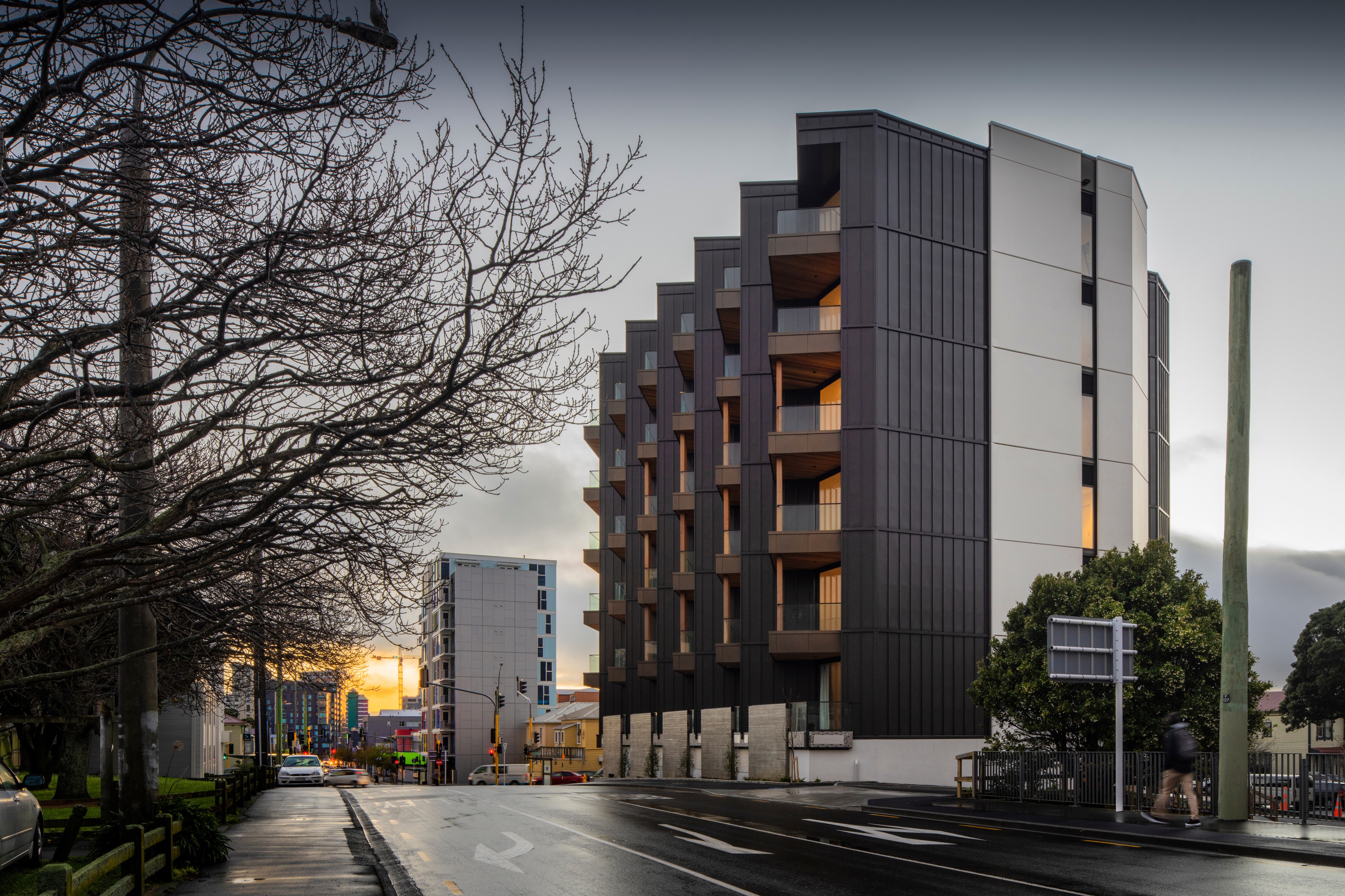 Sunset West provides boutique apartment accommodation through a focus on small, efficiently planned units with generous amenity. Attention to affordability enabled half of the development to be sold through the Kiwibuild scheme. The interior of each unit is furnished with plentiful storage, lining the whole length of the inter-tenancy wall. Additional joinery is used to separate the bedroom from the living room, with a simple sliding screen that allows the spaces to be either integrated or separated. The faceted façade angles windows and balconies towards the north, providing privacy from adjacent units and directing views across the city. From the street, the combination of the angled balconies with the vertical slatted screens gives the effect of tukutuku panel weaving.