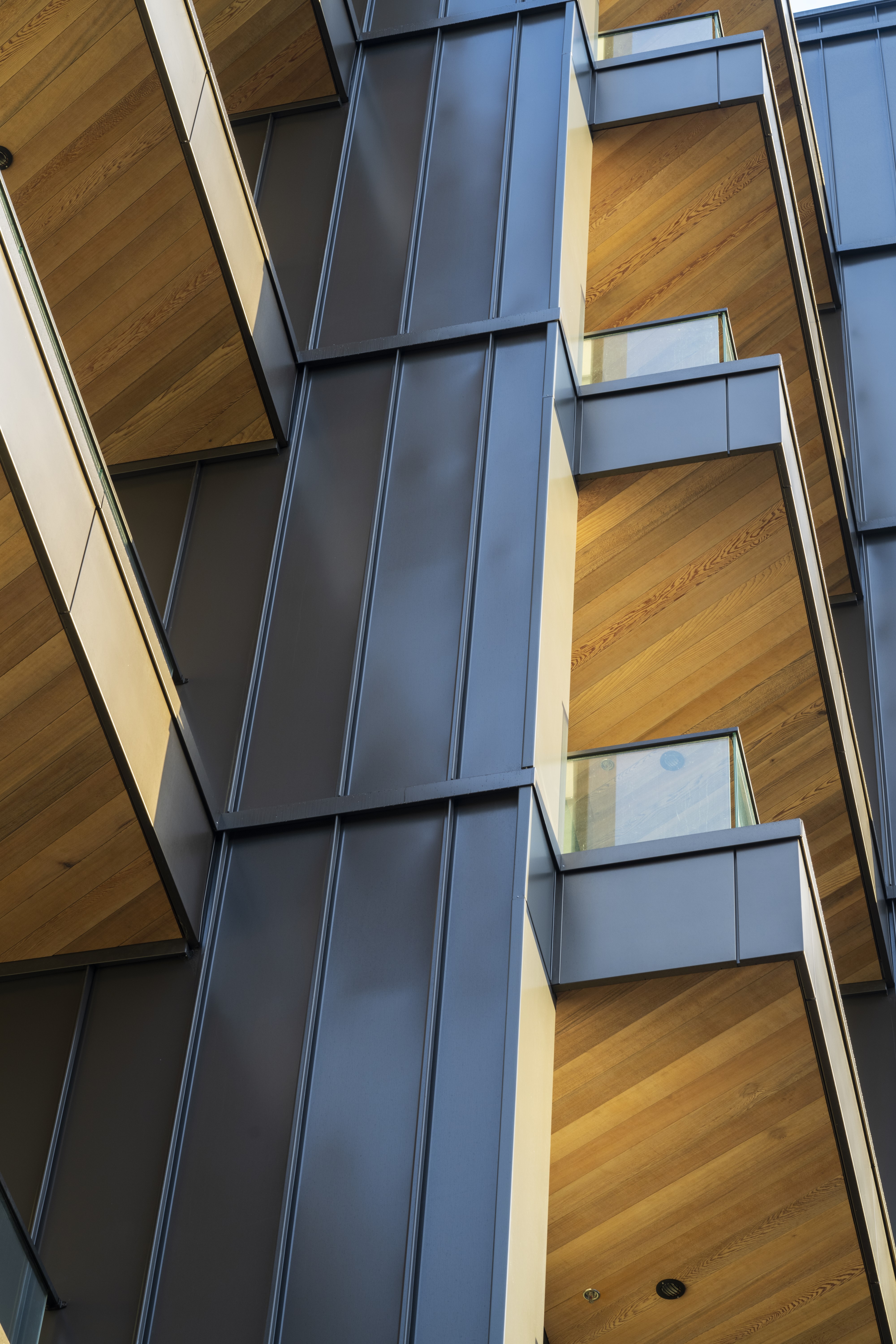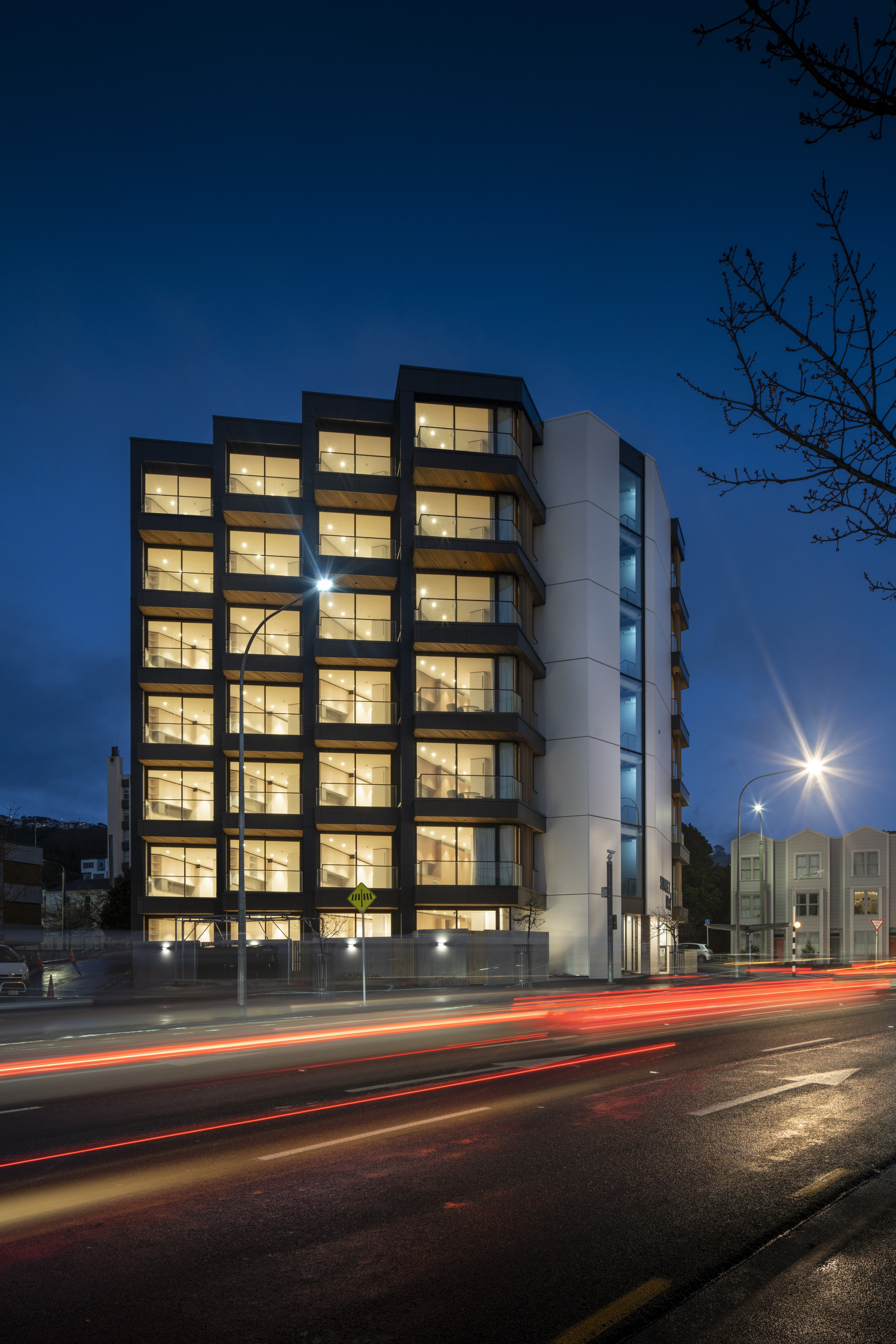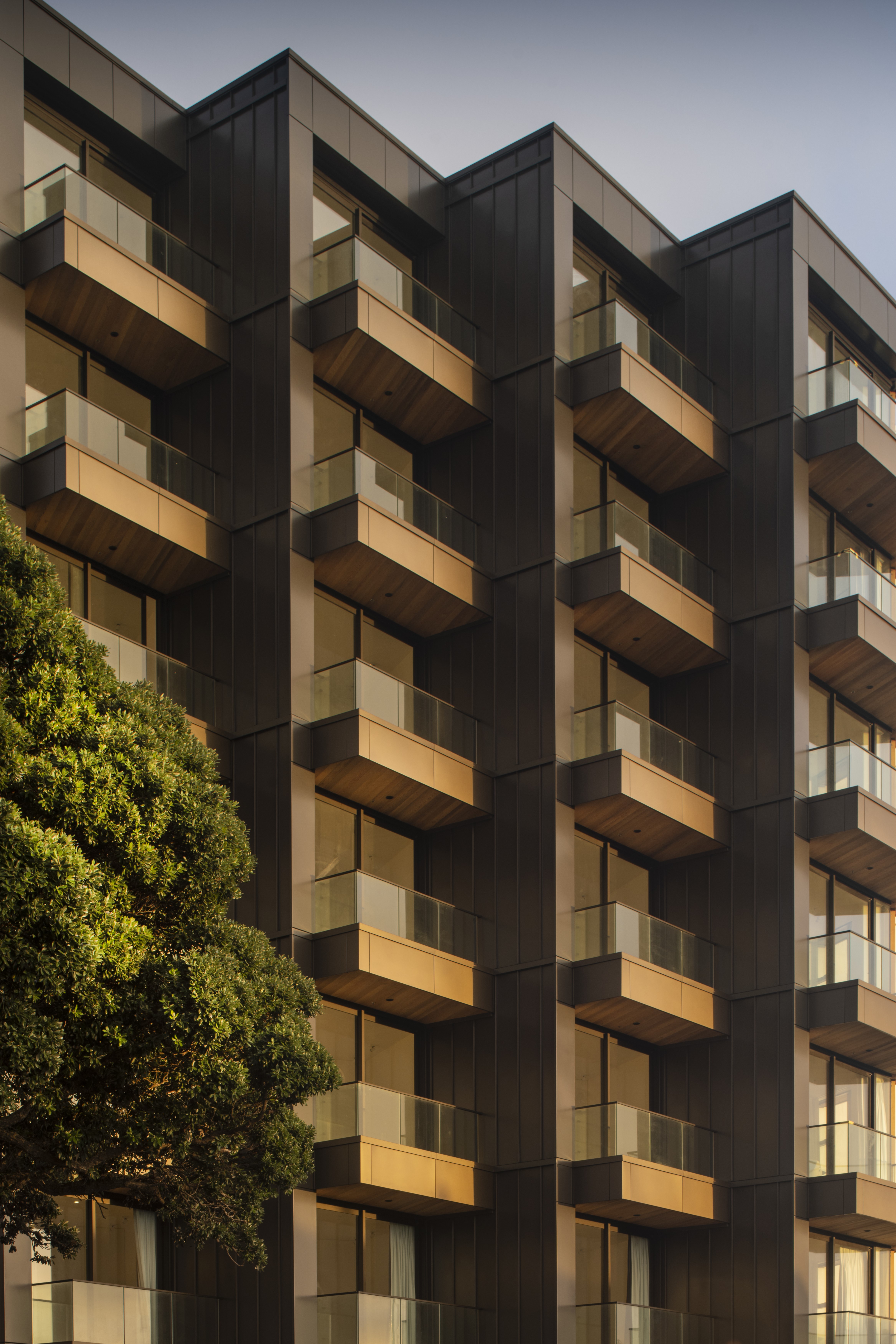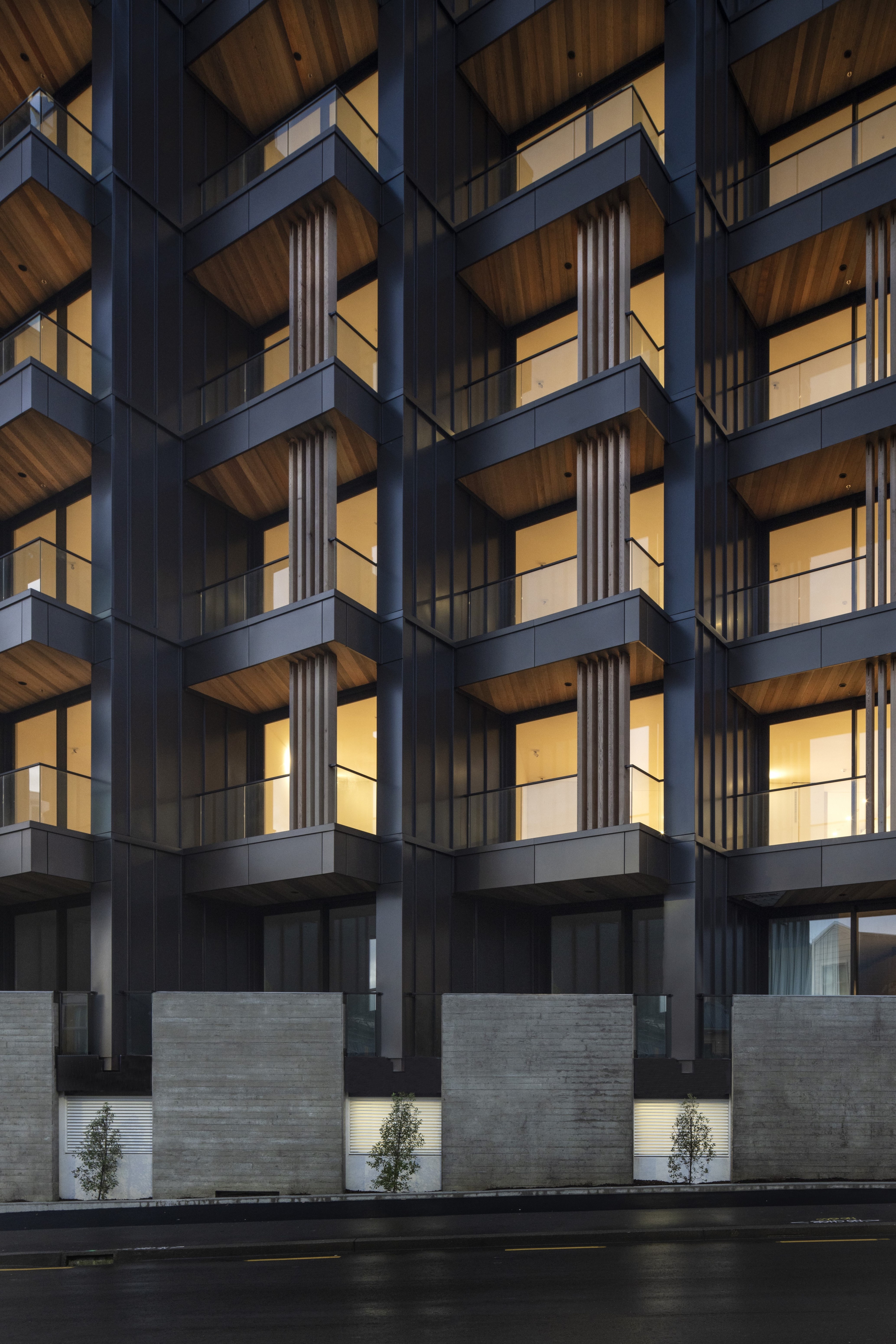 Sunset West provides boutique apartment accommodation through a focus on small, efficiently planned units with generous amenity. Attention to affordability enabled half of the development to be sold through the Kiwibuild scheme. The interior of each unit is furnished with plentiful storage, lining the whole length of the inter-tenancy wall. Additional joinery is used to separate the bedroom from the living room, with a simple sliding screen that allows the spaces to be either integrated or separated. The faceted façade angles windows and balconies towards the north, providing privacy from adjacent units and directing views across the city. From the street, the combination of the angled balconies with the vertical slatted screens gives the effect of tukutuku panel weaving.