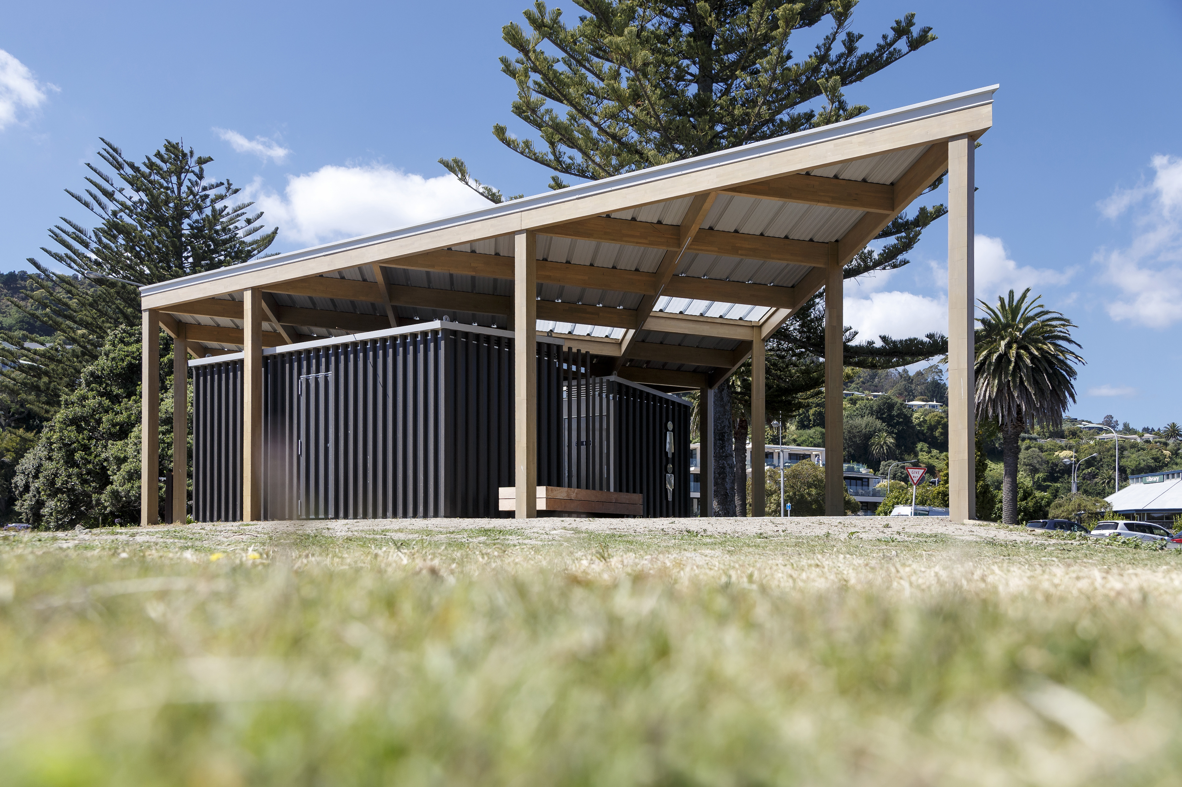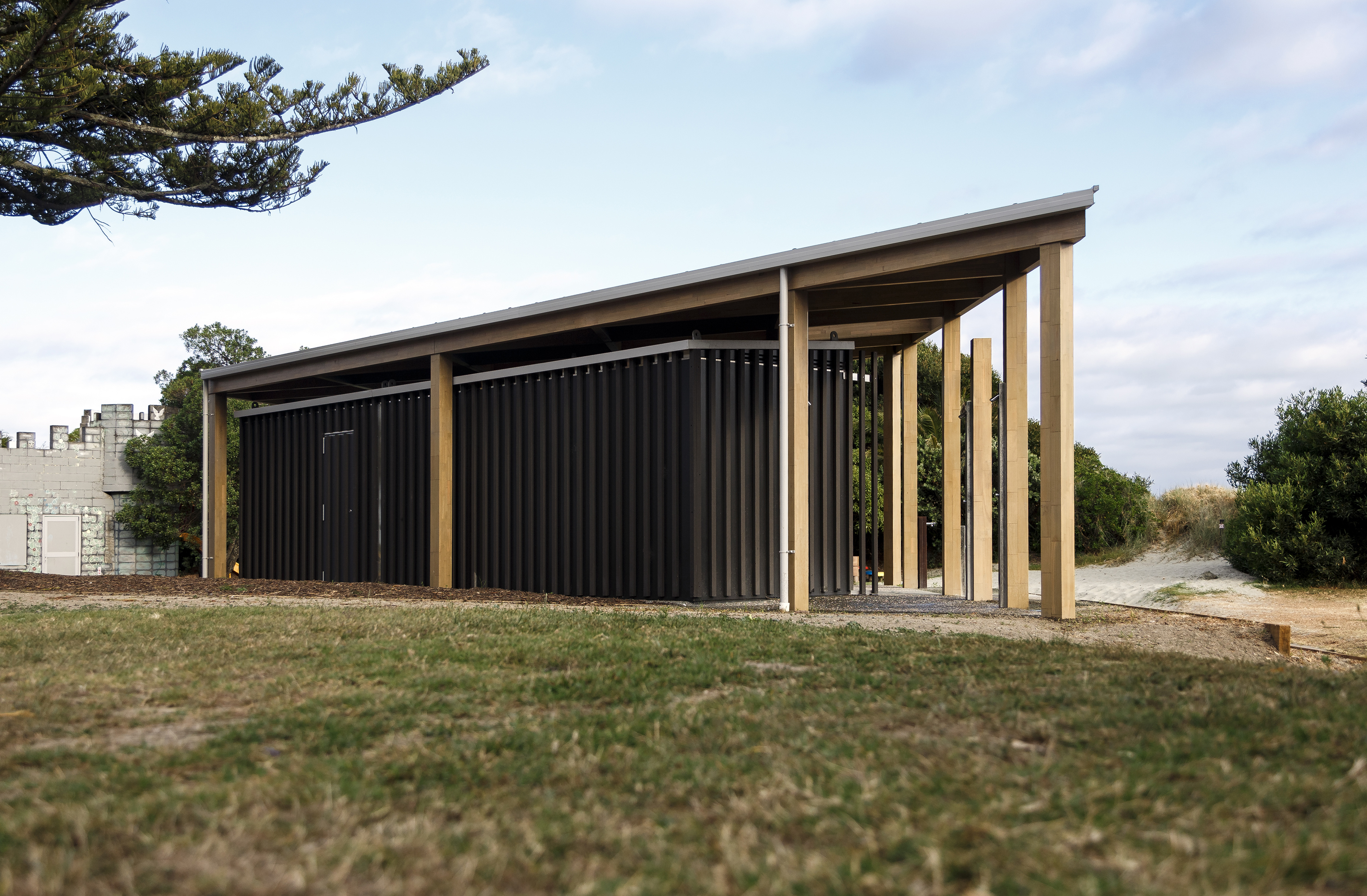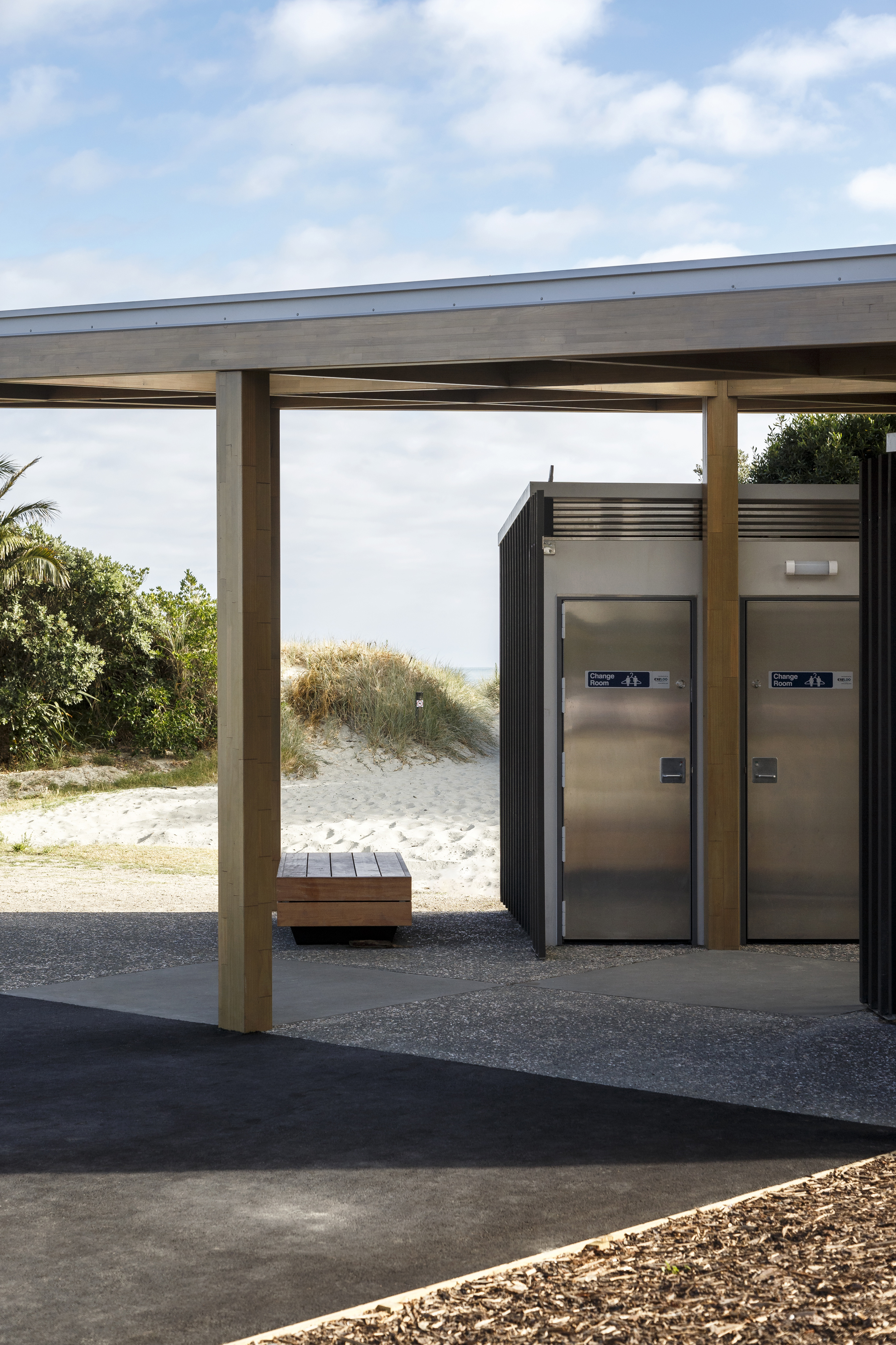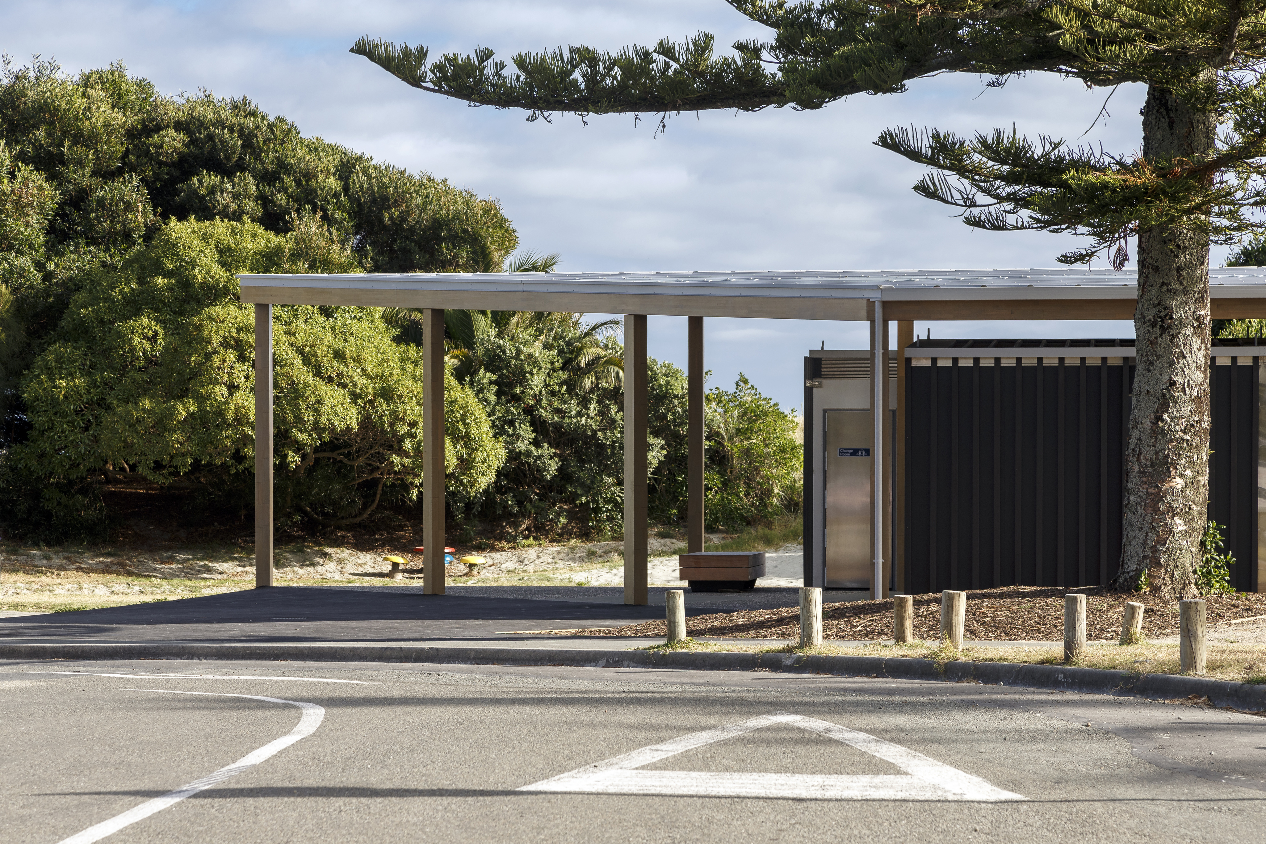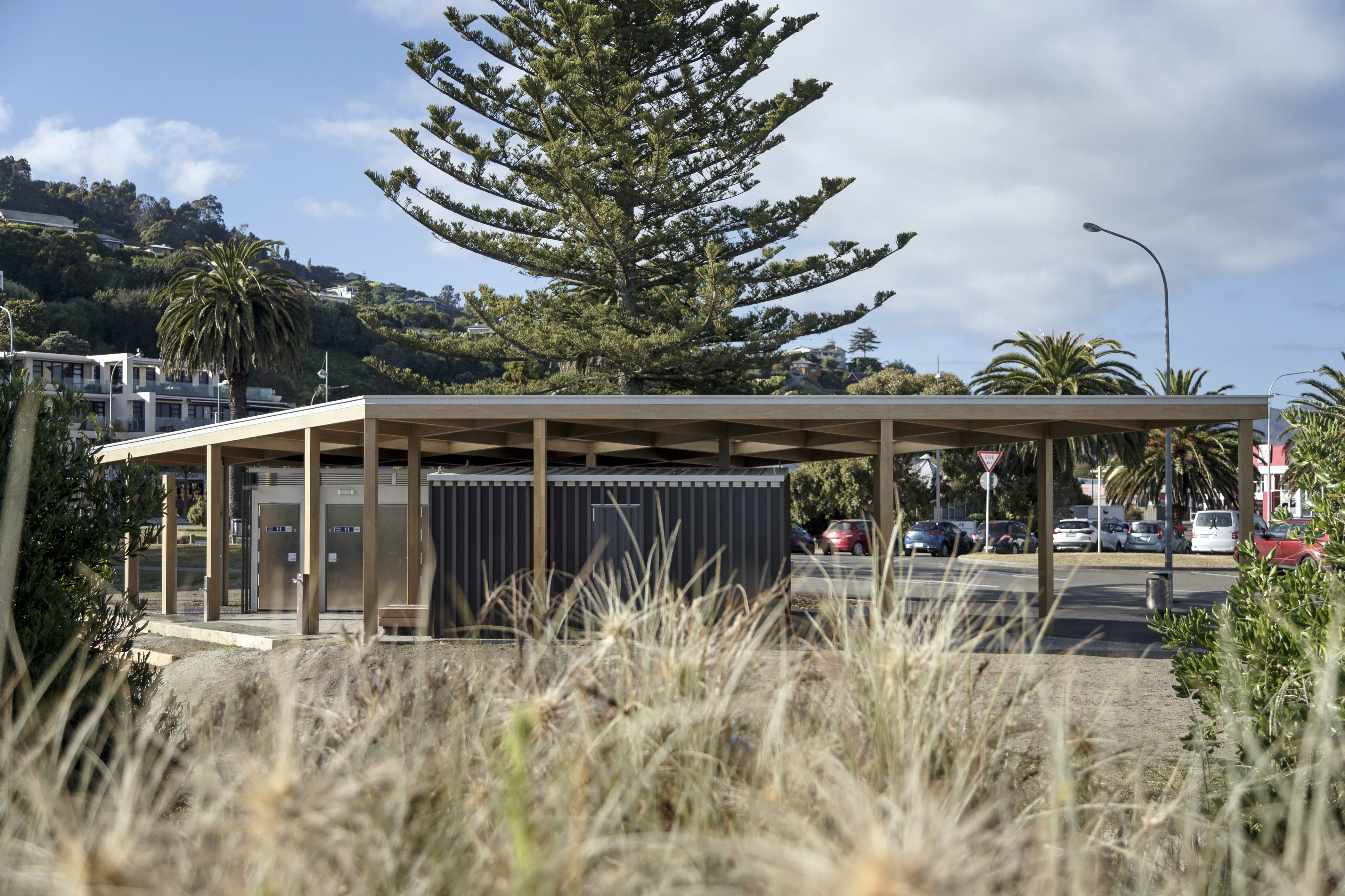 The Tahunanui Lions toilet block strikes a perfect balance between function, shelter, amenity and accessibility. The project is grounded by the functional aspect of the two banks of toilet blocks, which provide shelter for those escaping the prevailing breeze. Above sits a light timber diagrid canopy structure, which echoes the paving array to great effect. Considered detailing and materials elevate the canopy beyond a purely utilitarian structure and towards something more expressive.