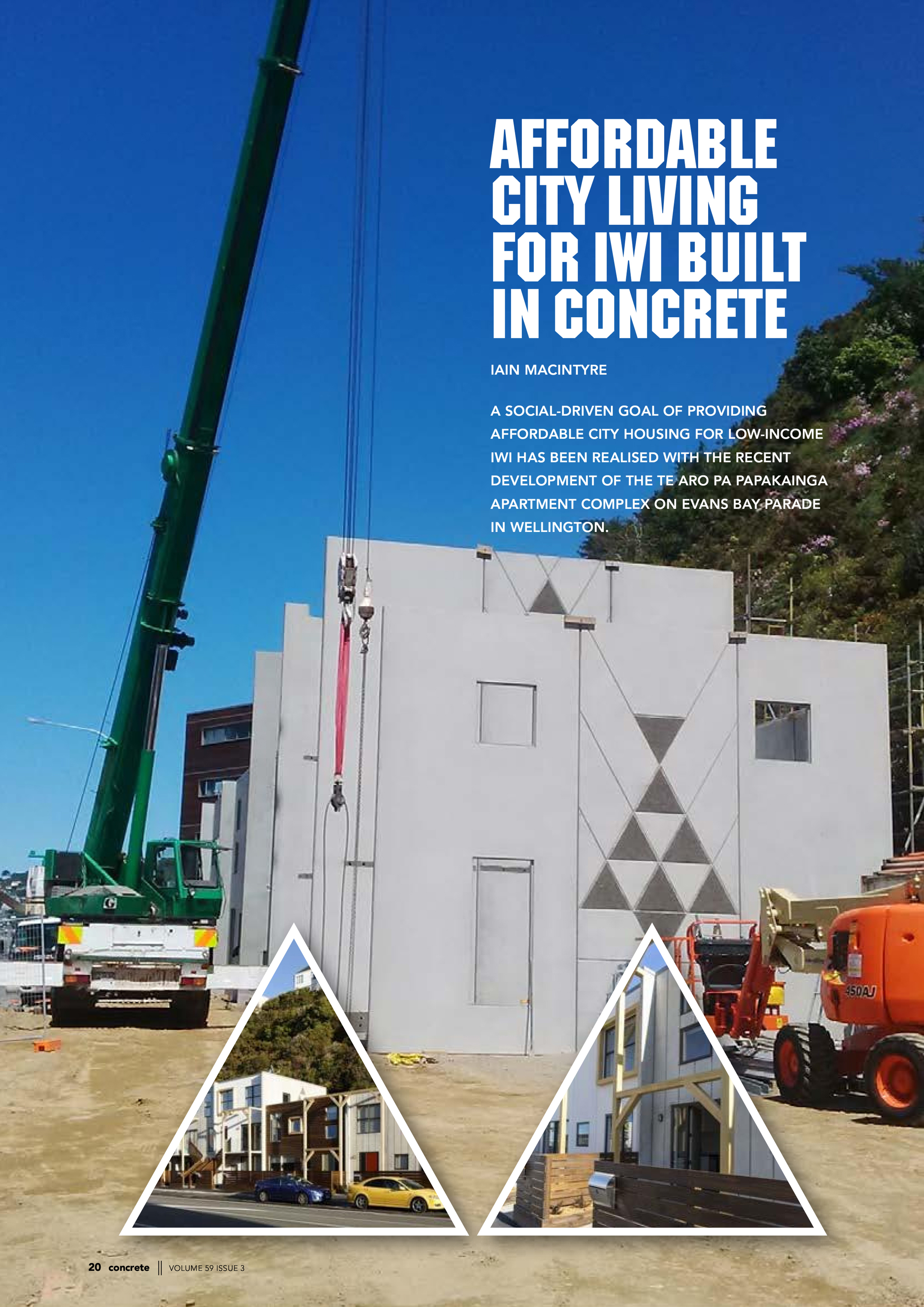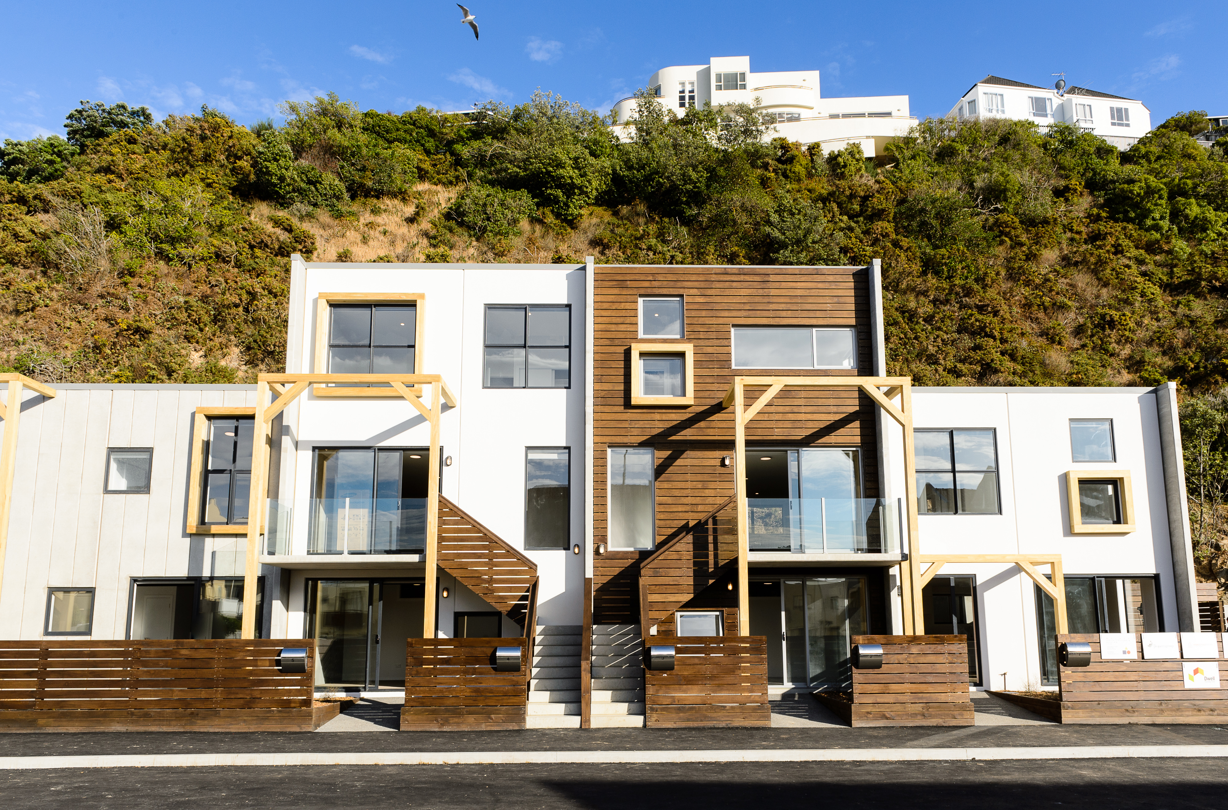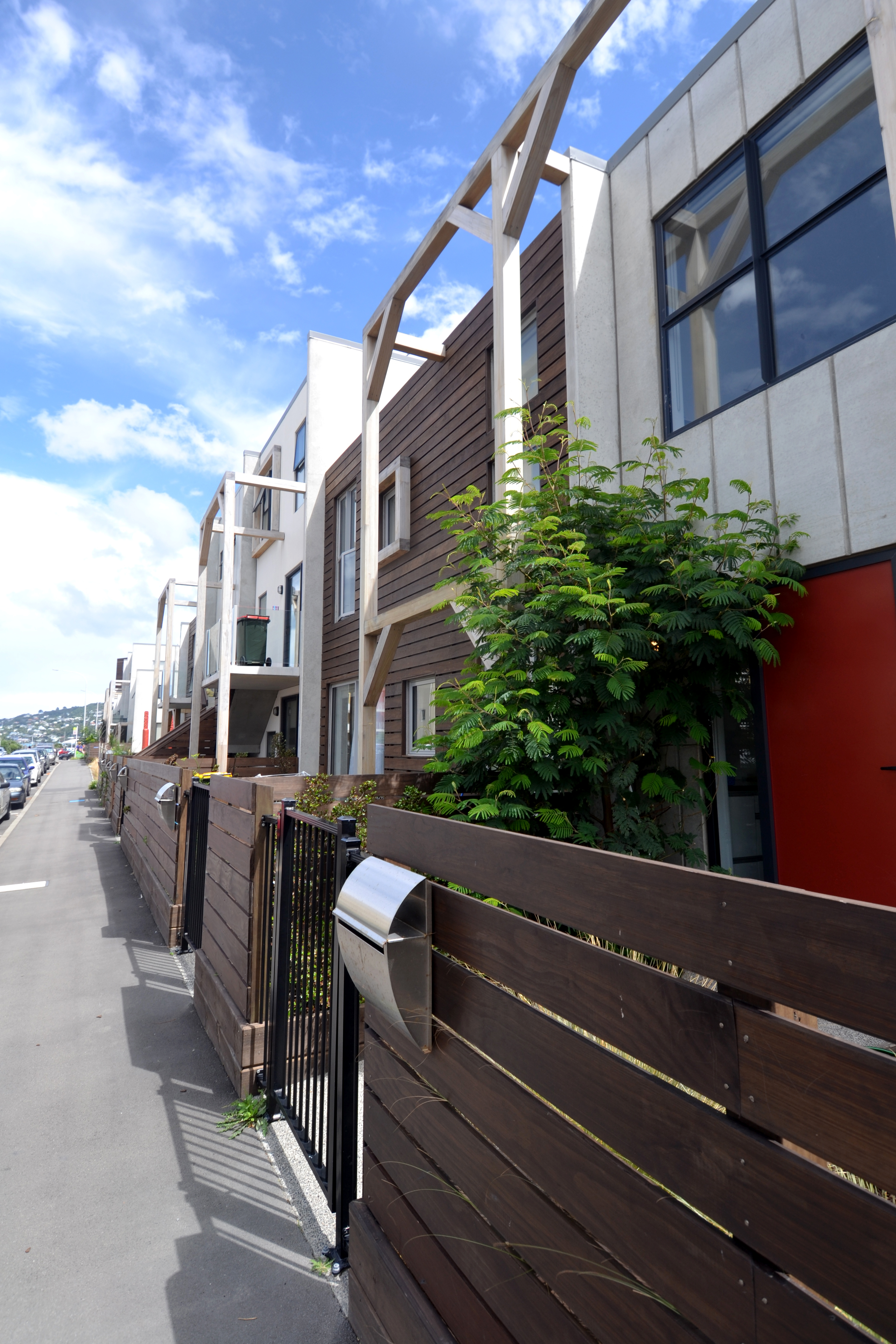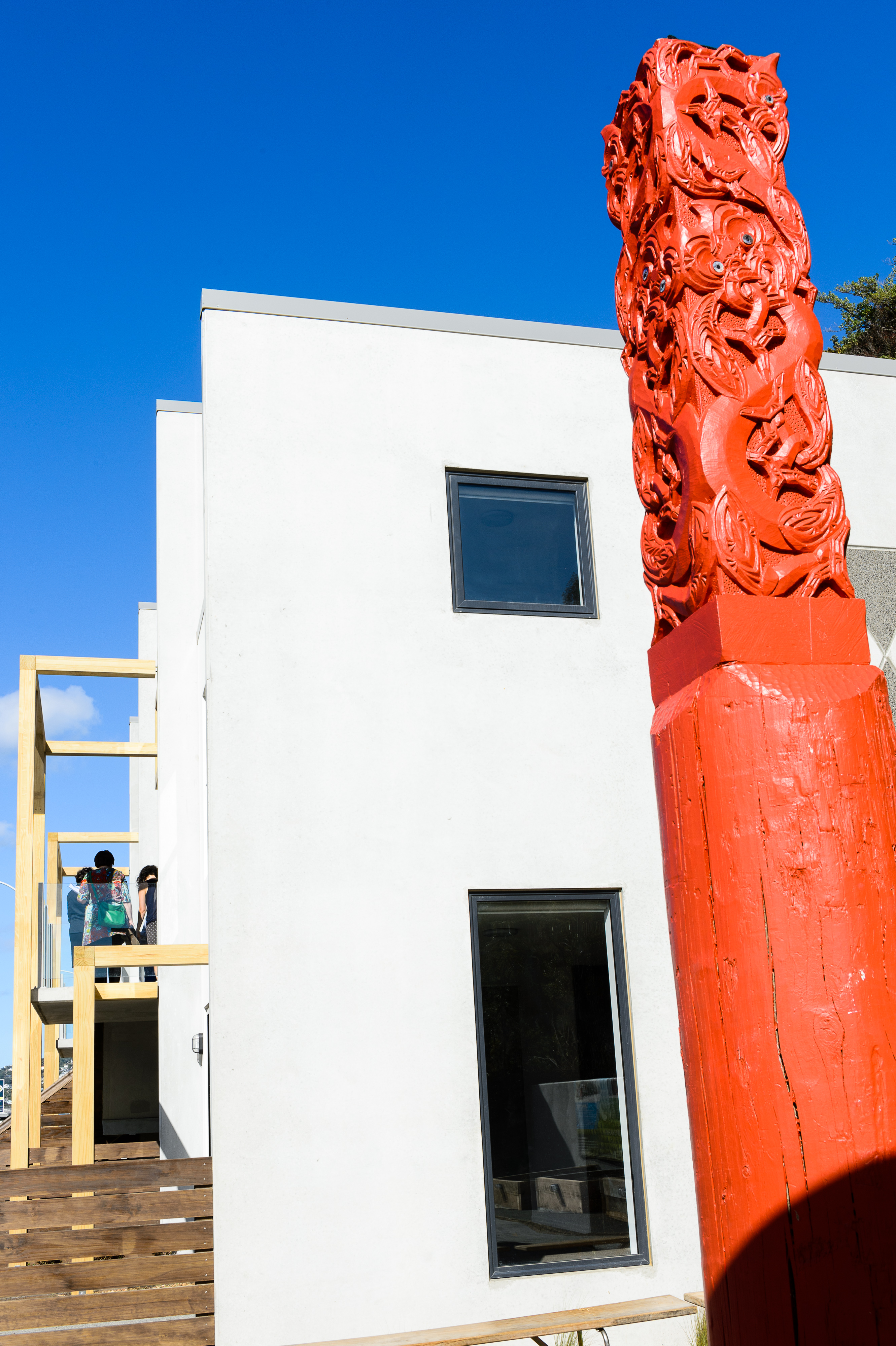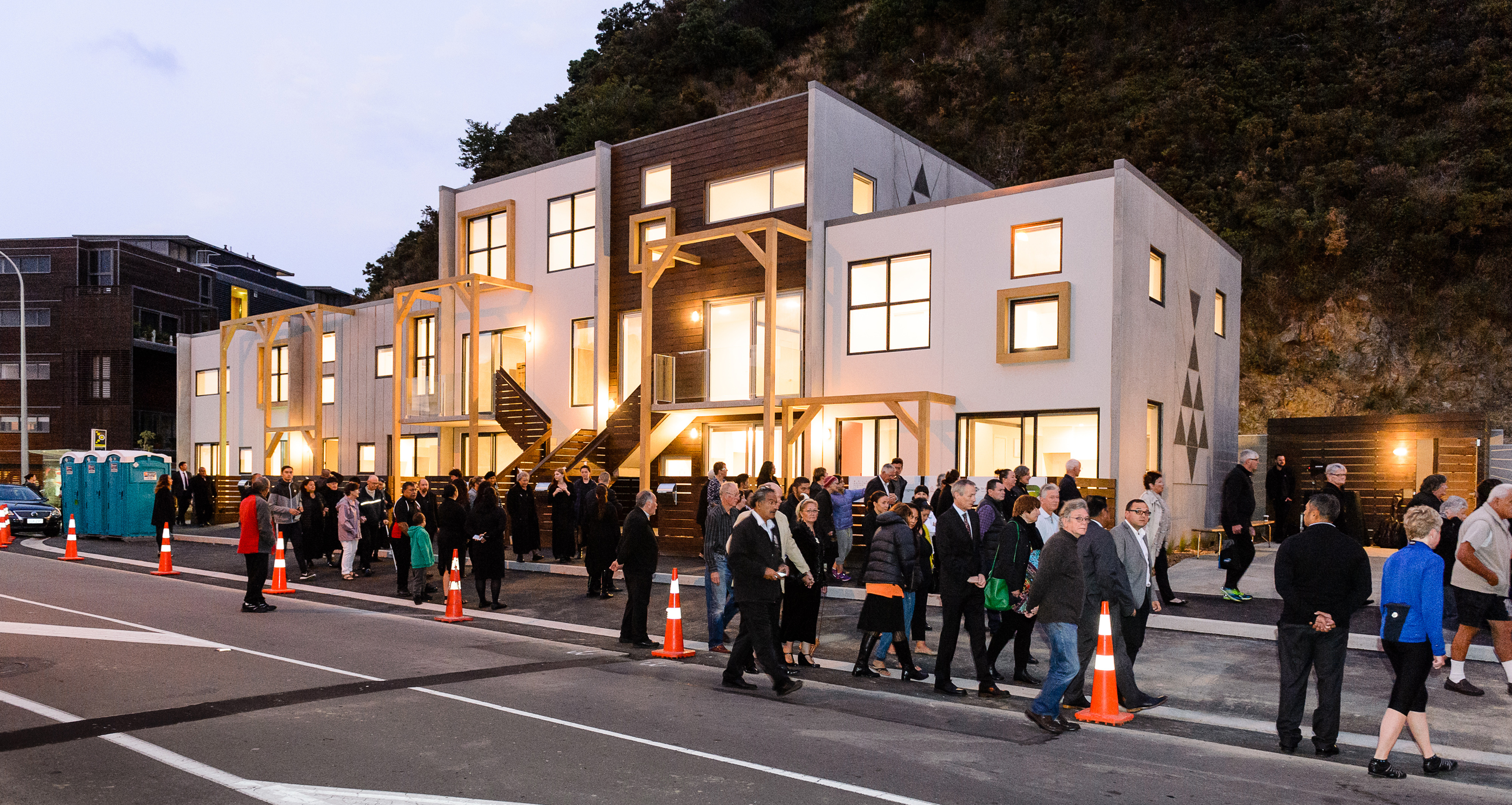 An interesting example of how affordable homes can be delivered for a small community. The papakāinga housing project employed precast concrete panels, precisely configured in a Levin factory before being trucked in, for robustness and simple planning permutations to give the vertical forms energy. Variations in façade treatment, pergolas, timber window boxing and open space integration cleverly mitigate the bulk of the buildings.