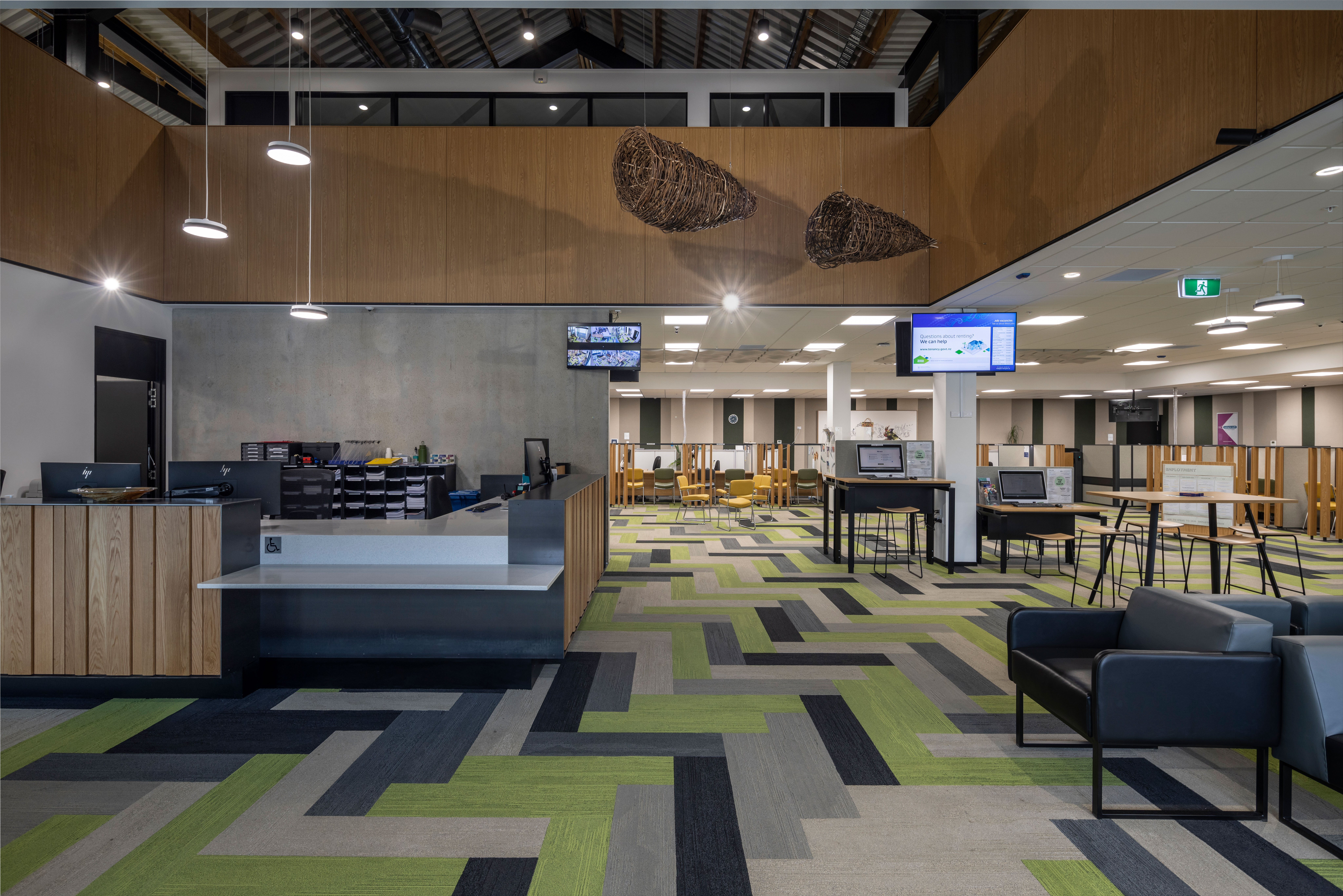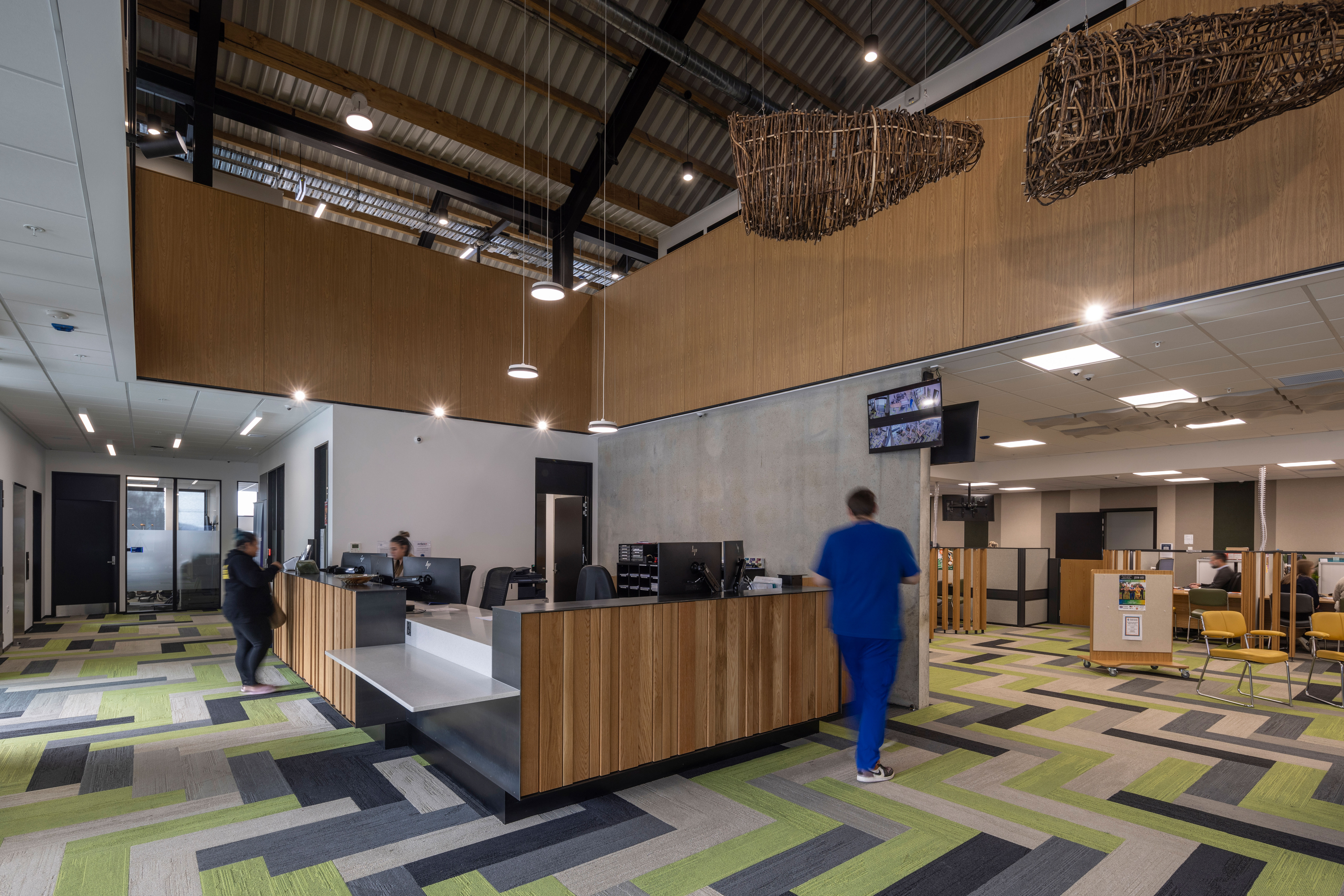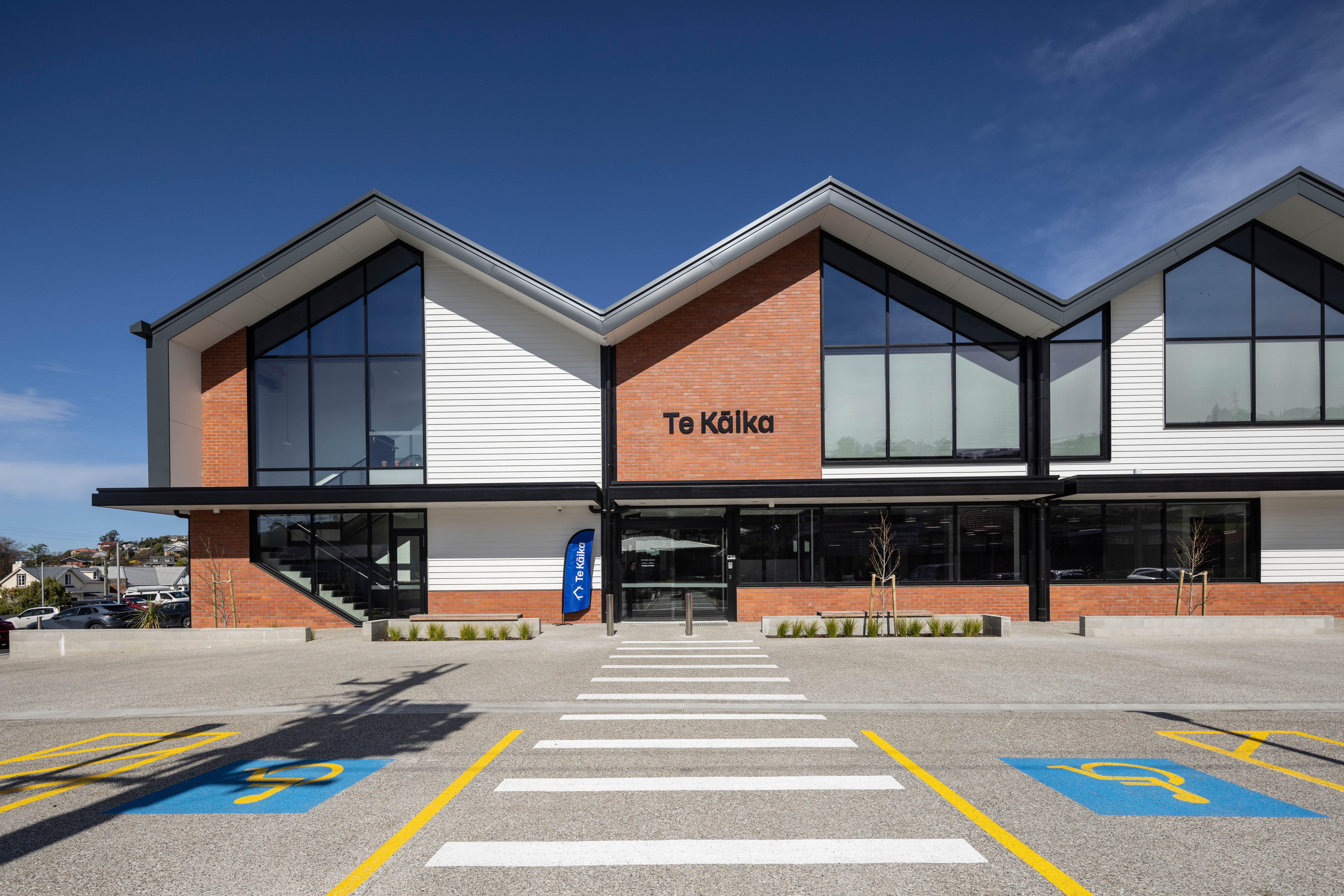 The result of a visionary brief, Te Kāika Wellbeing Hub provides a place for multiple agencies to demonstrate an innovative collaborative approach to caring for their community. The design combines the traditional gable form of a wharenui with materials typical of the surrounding residential context to provide a sense of comfort and familiarity. Spatial planning and use of robust materials successfully balance the aspiration for engagement and connection with the requirement to provide retreat space. A welcoming interior environment has been created by a combination of warm interior finishes, expressed structure that highlights the gabled roof form, and an openness between work and communal zones.