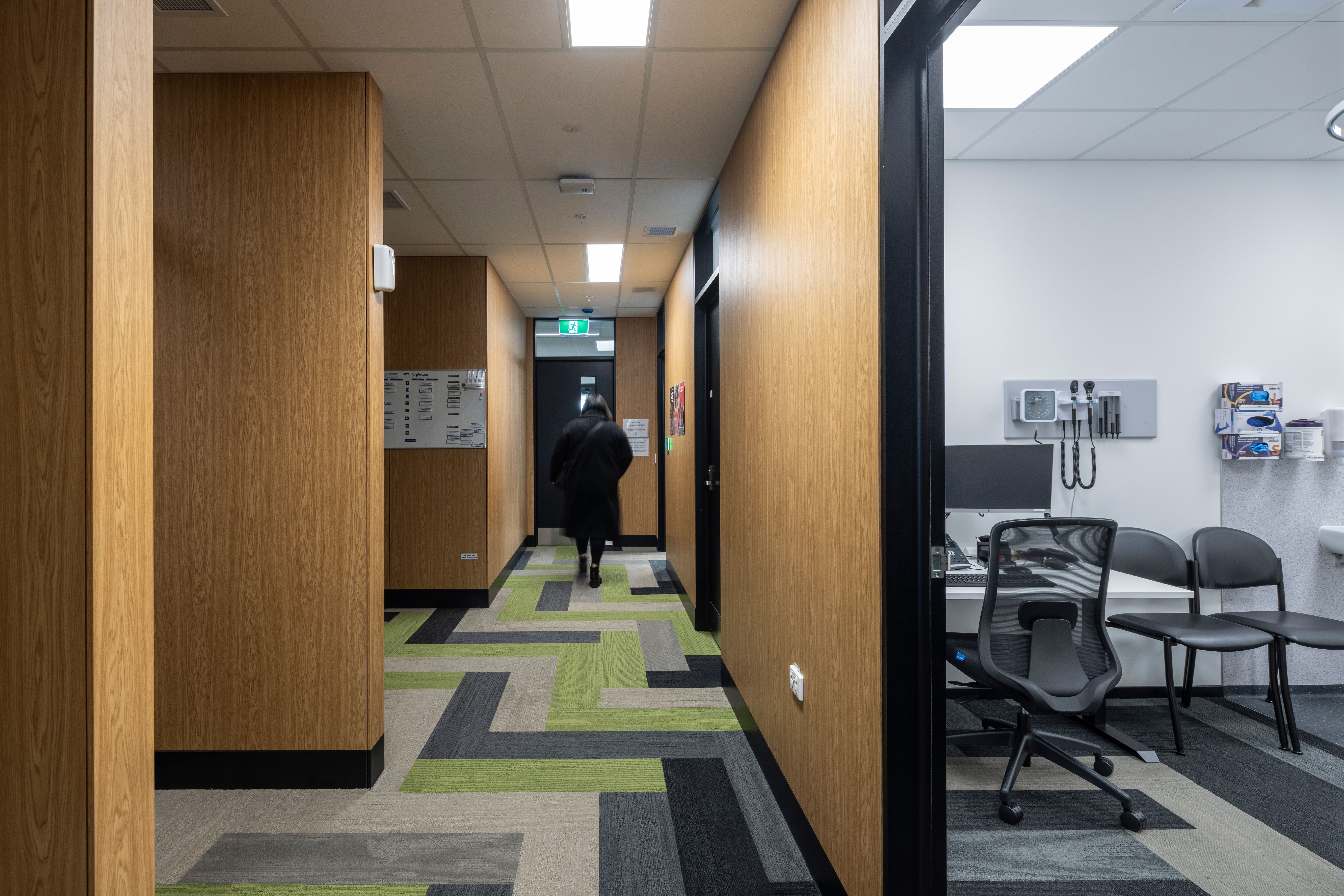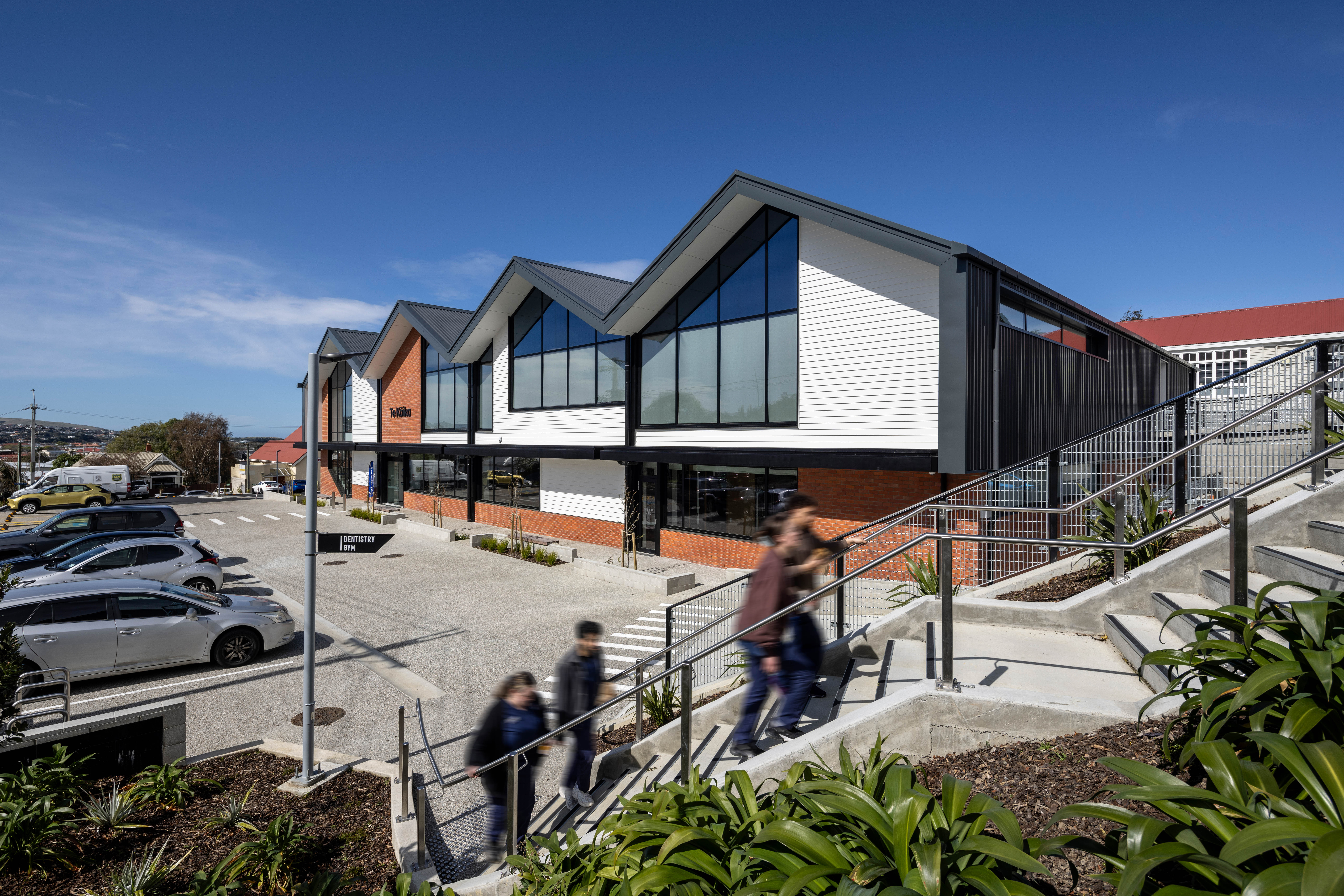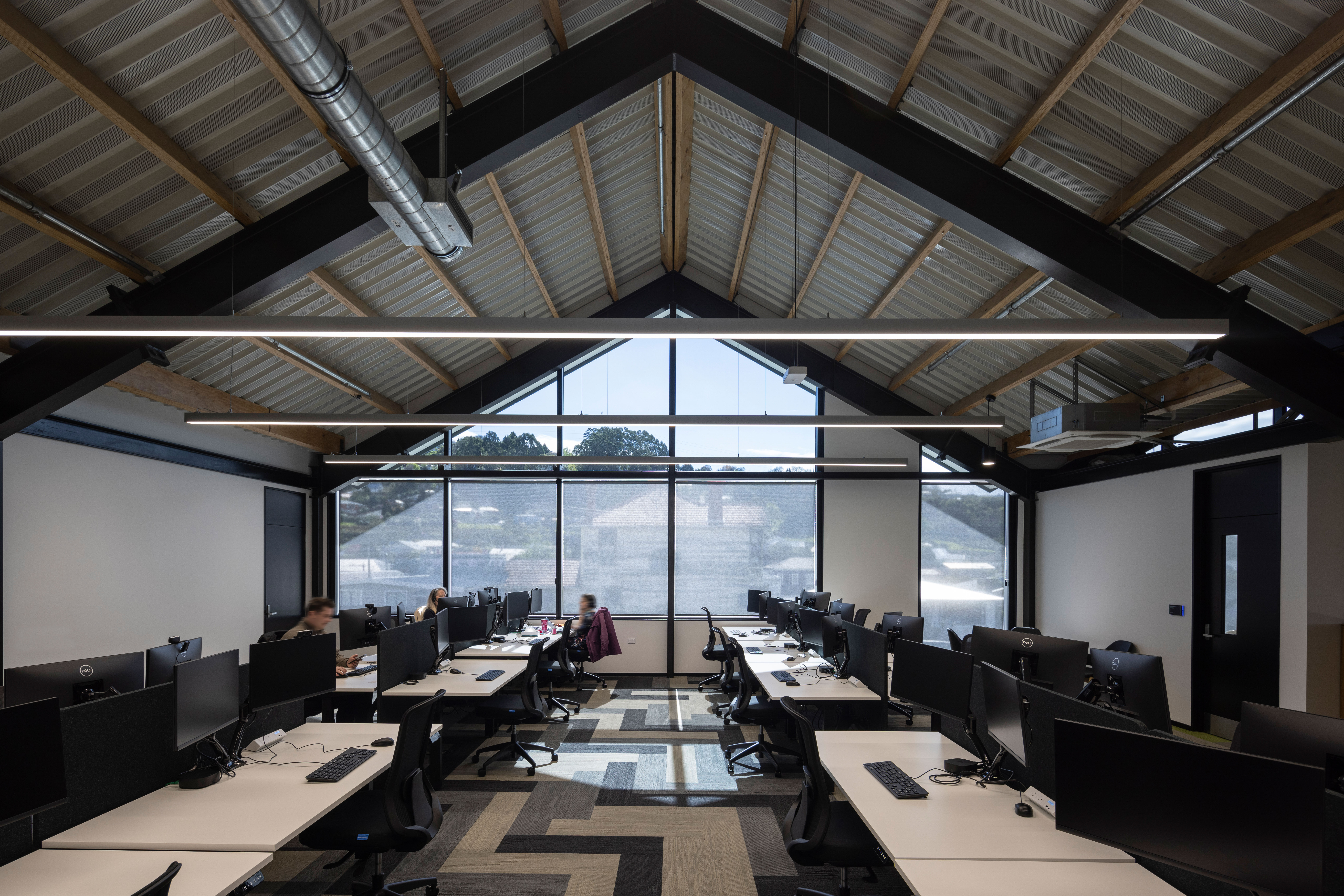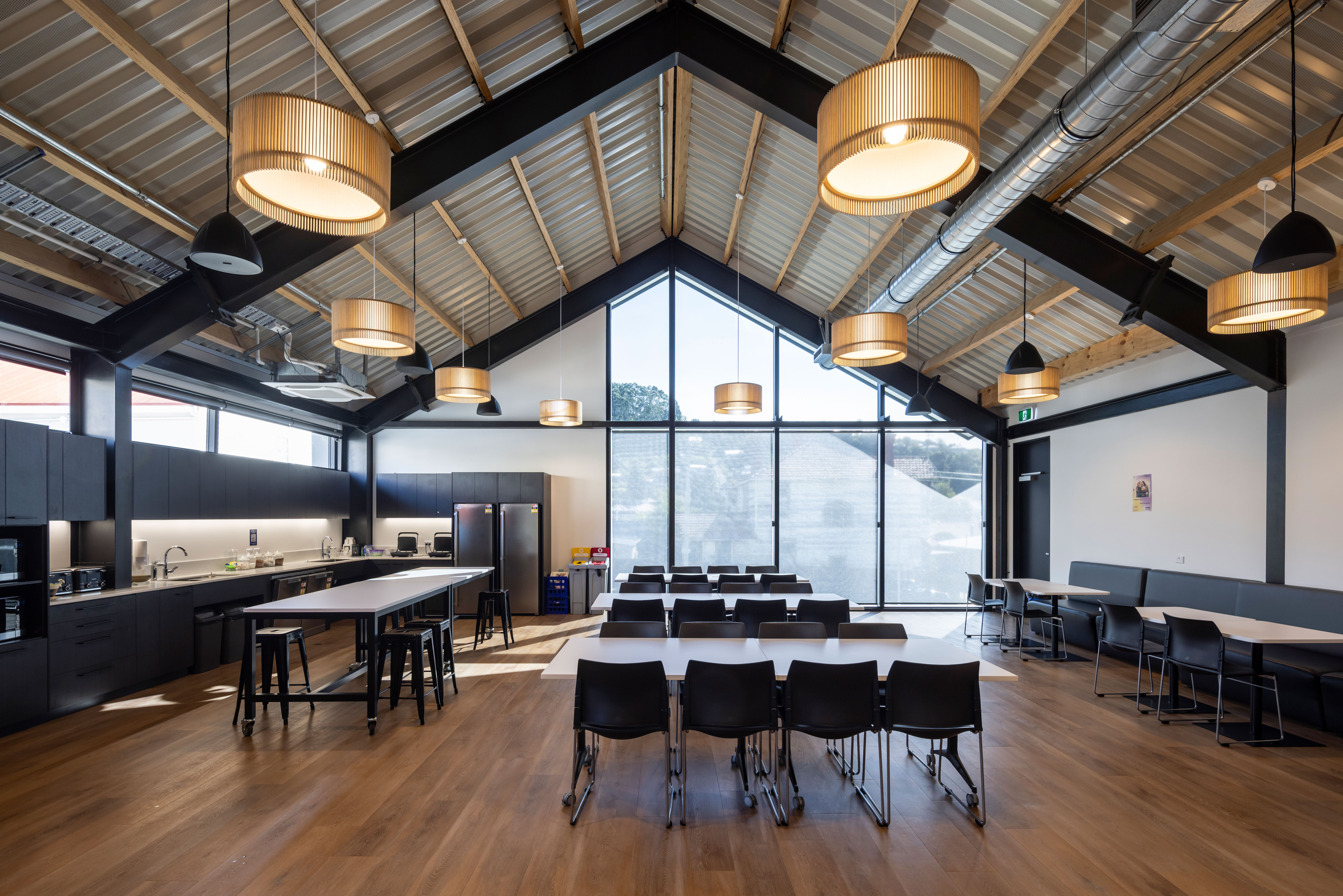 The result of a visionary brief, Te Kāika Wellbeing Hub provides a place for multiple agencies to demonstrate an innovative collaborative approach to caring for their community. The design combines the traditional gable form of a wharenui with materials typical of the surrounding residential context to provide a sense of comfort and familiarity. Spatial planning and use of robust materials successfully balance the aspiration for engagement and connection with the requirement to provide retreat space. A welcoming interior environment has been created by a combination of warm interior finishes, expressed structure that highlights the gabled roof form, and an openness between work and communal zones.