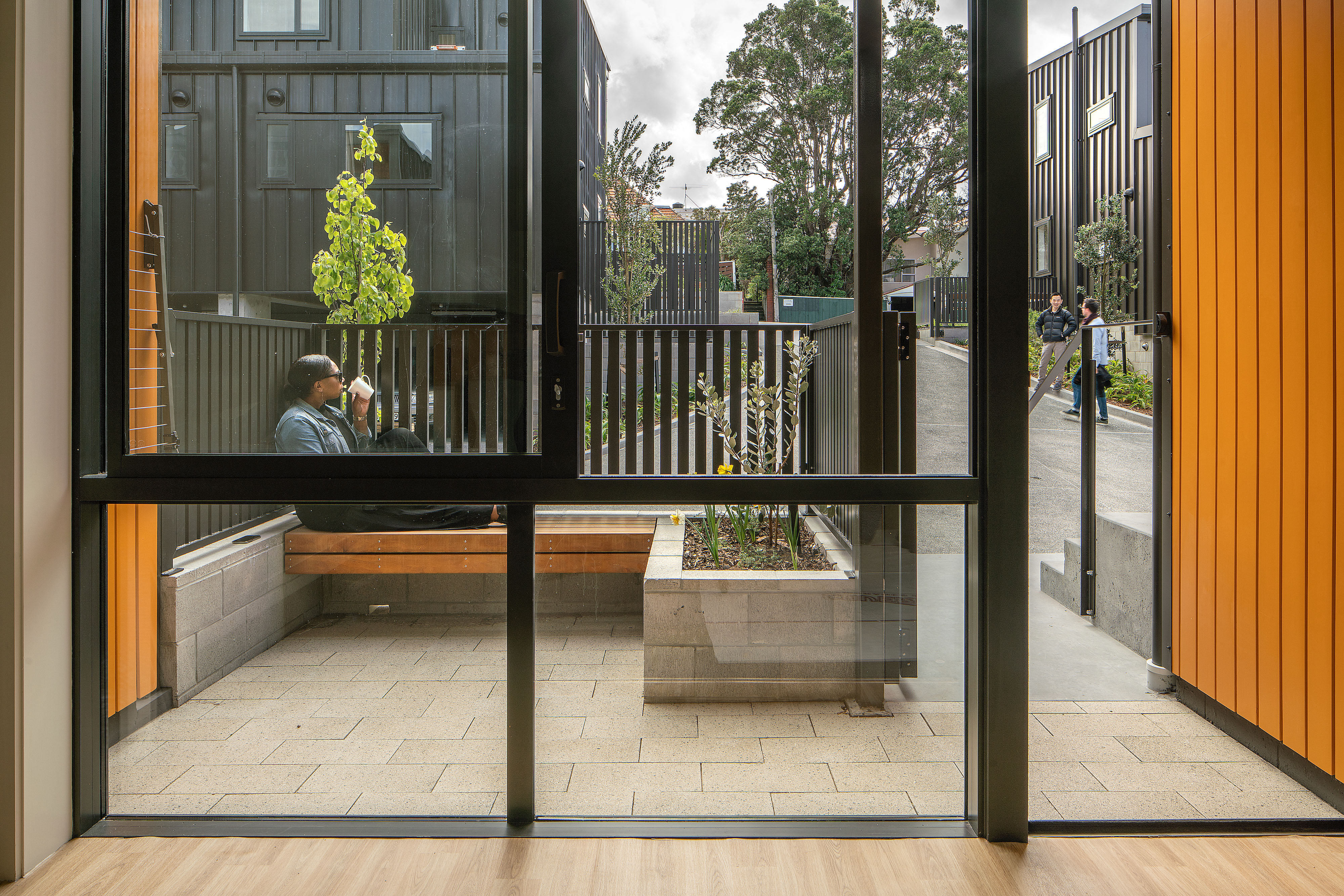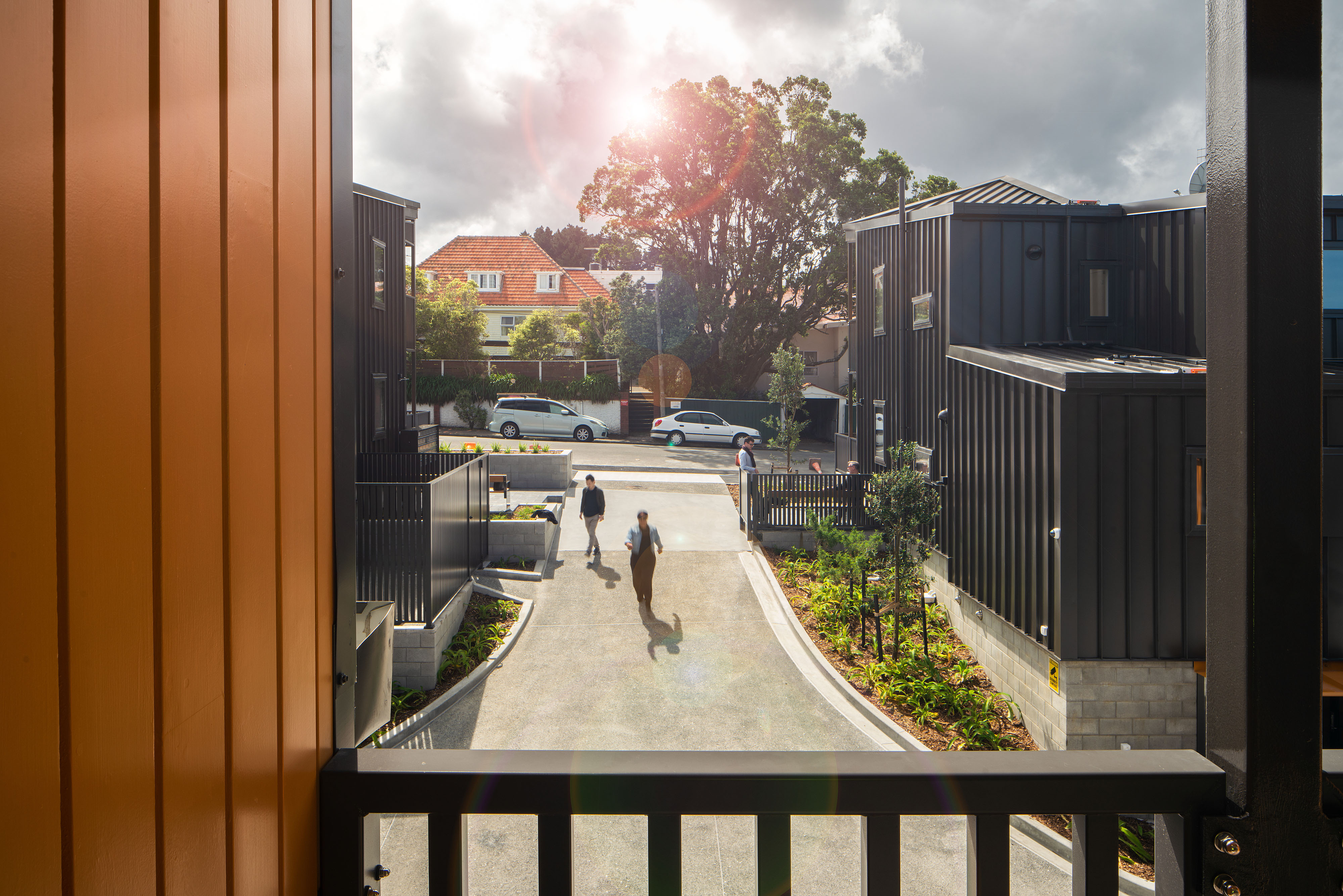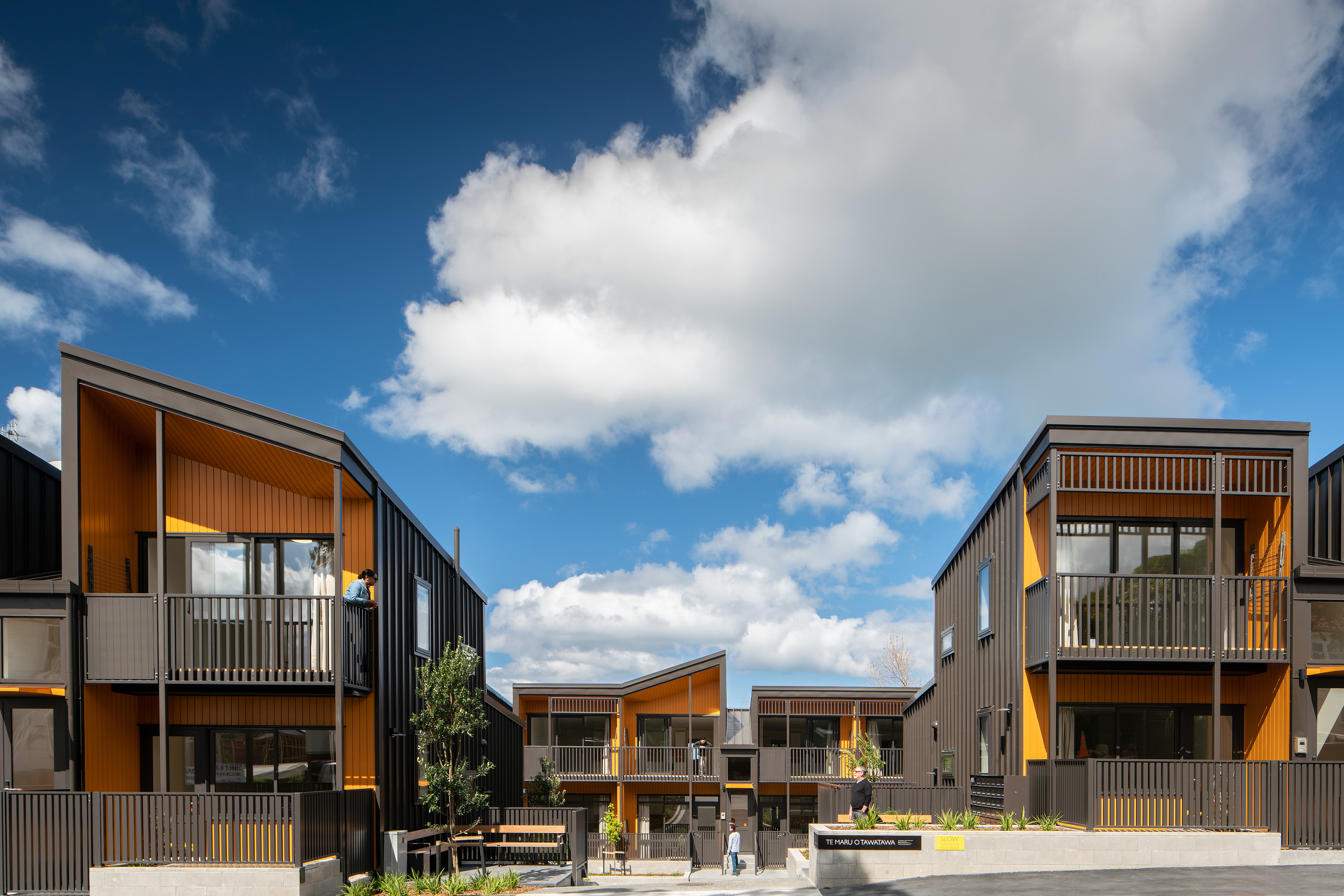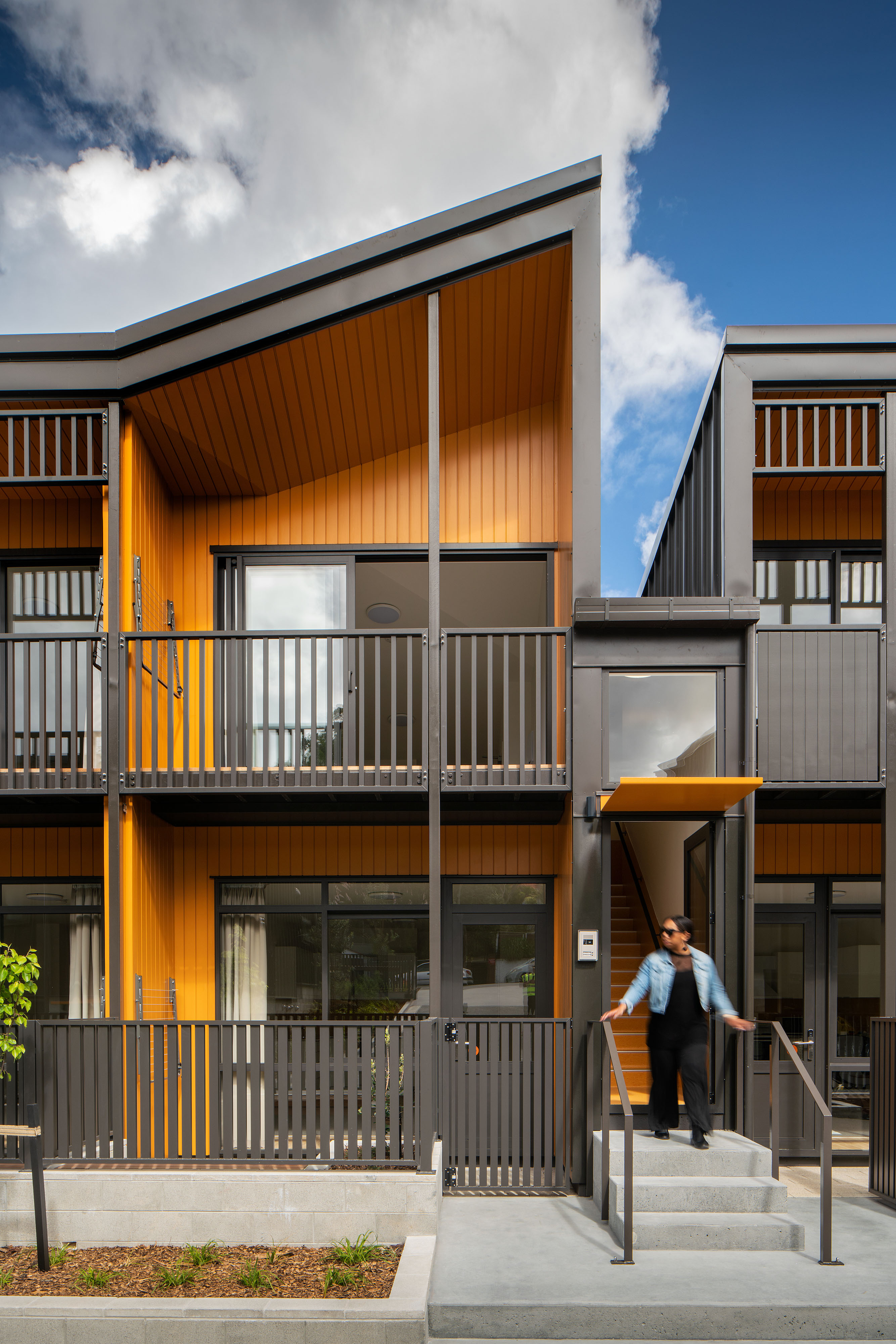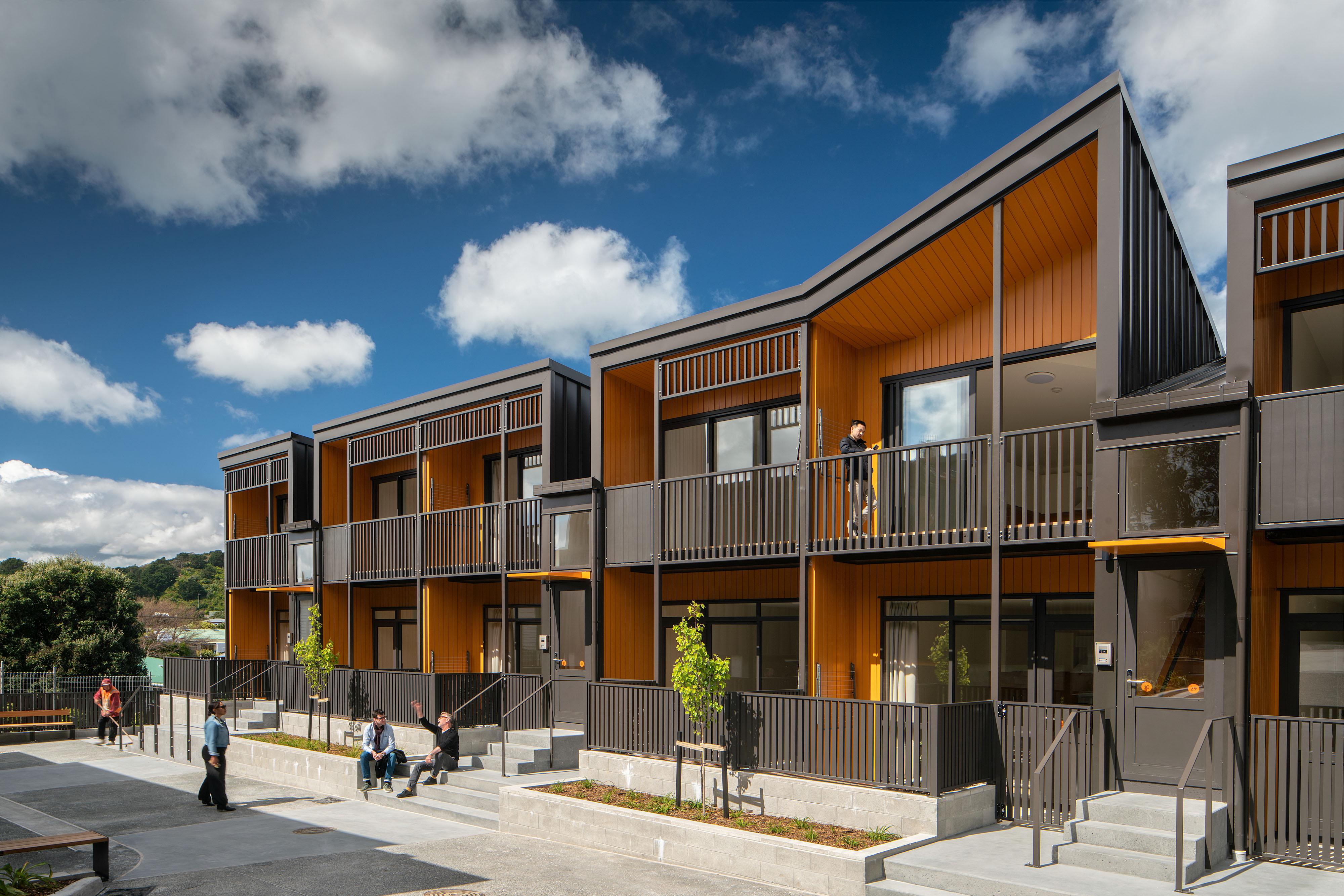 A welcome and colourful replacement for a previous worn-out public housing scheme, Te Maru o Tawatawa provides bright and cheerful housing solutions that feature crisp design detailing and provide a positive street-front solution to Berhampore’s housing needs.