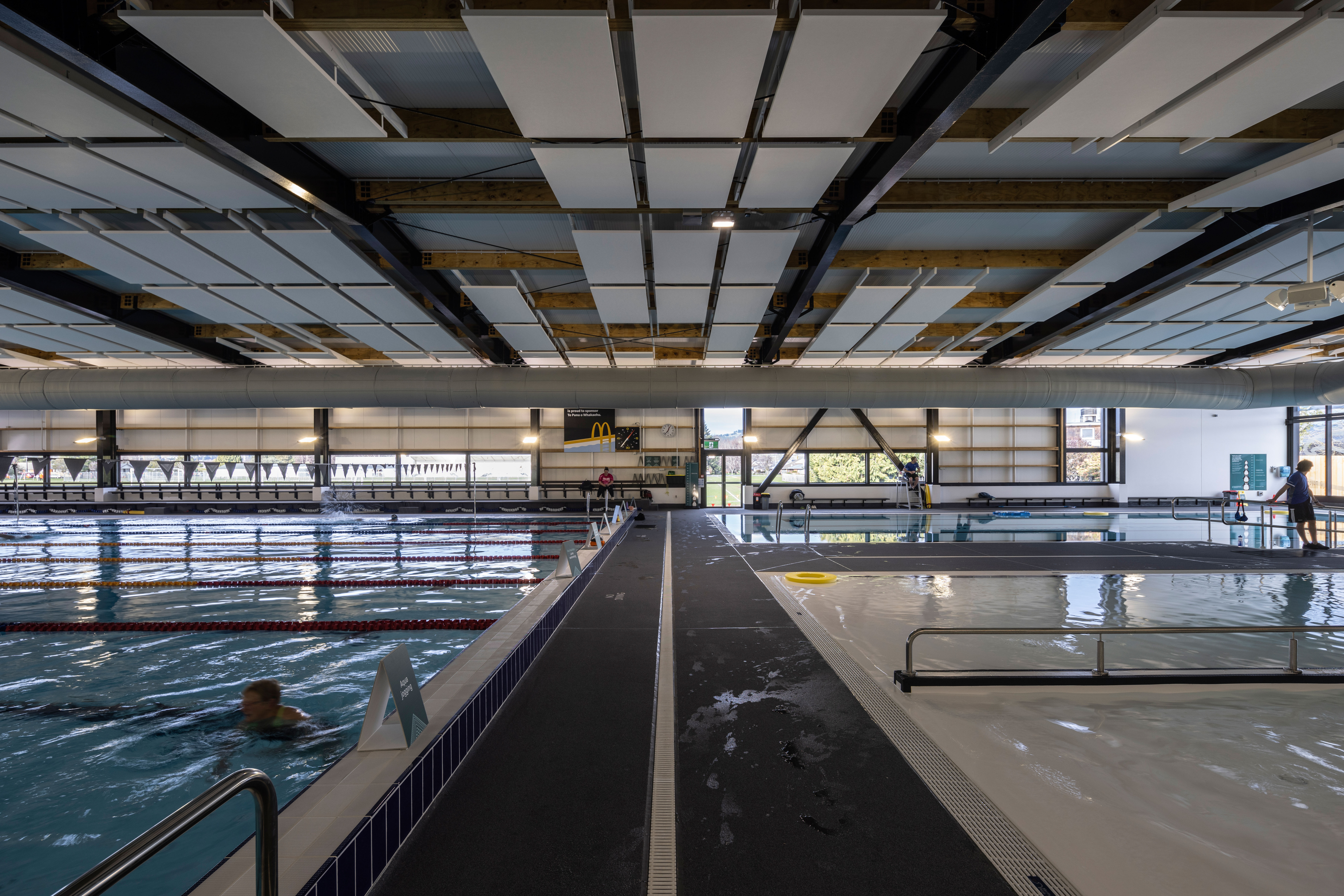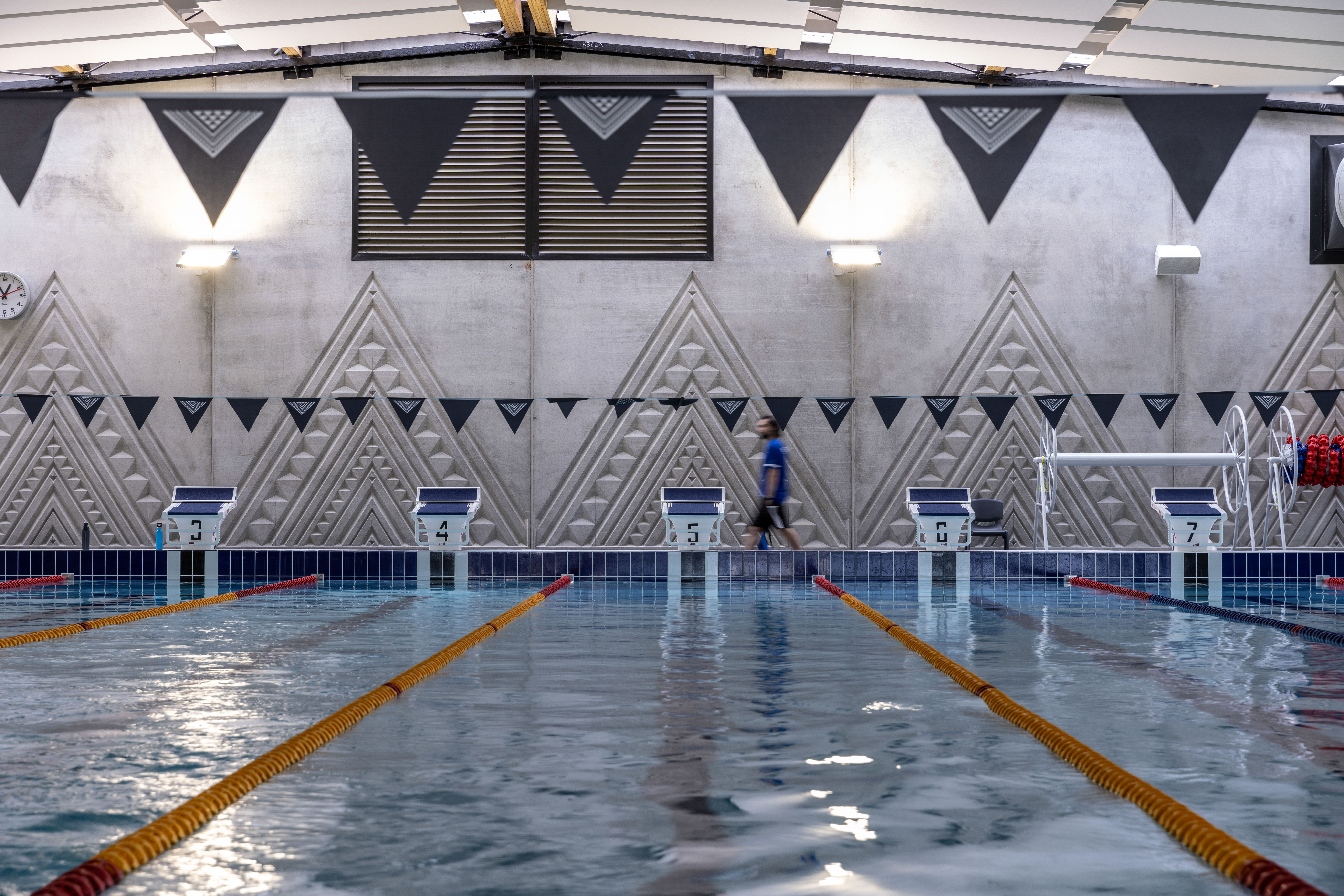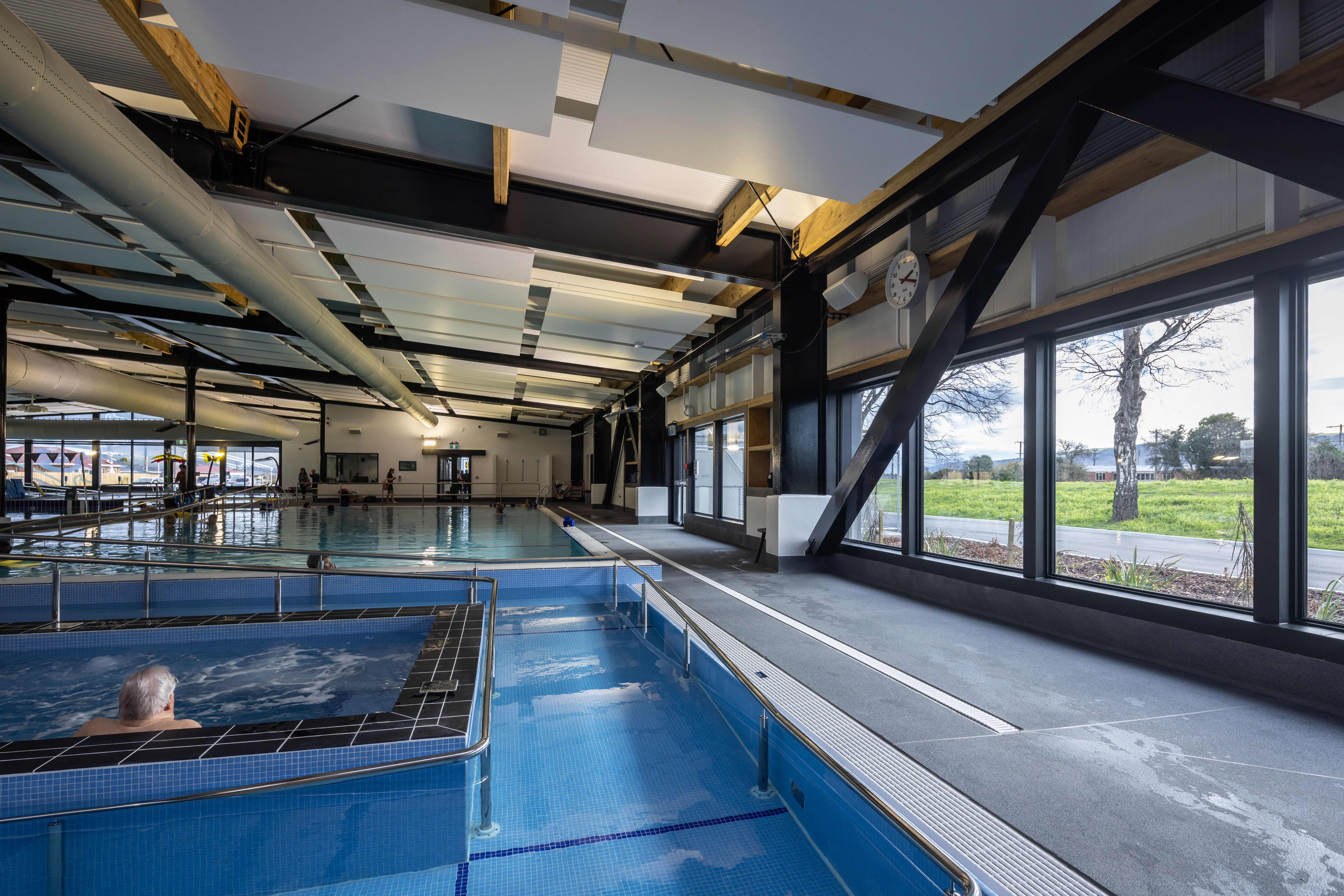 Mosgiel has been blessed by the offspring of an ancient taniwha, with six new swimming pools clustered under a low-slung roof. Set within a silver box spilling into a larger black box, all the details here are just right for a community pool. There is clear interaction with the street, great slot views to the surrounding countryside while swimming, and a masterful series of chunky taniwha teeth cast across the rear wall. This development is a hit – and makes a big splash – with the local community.