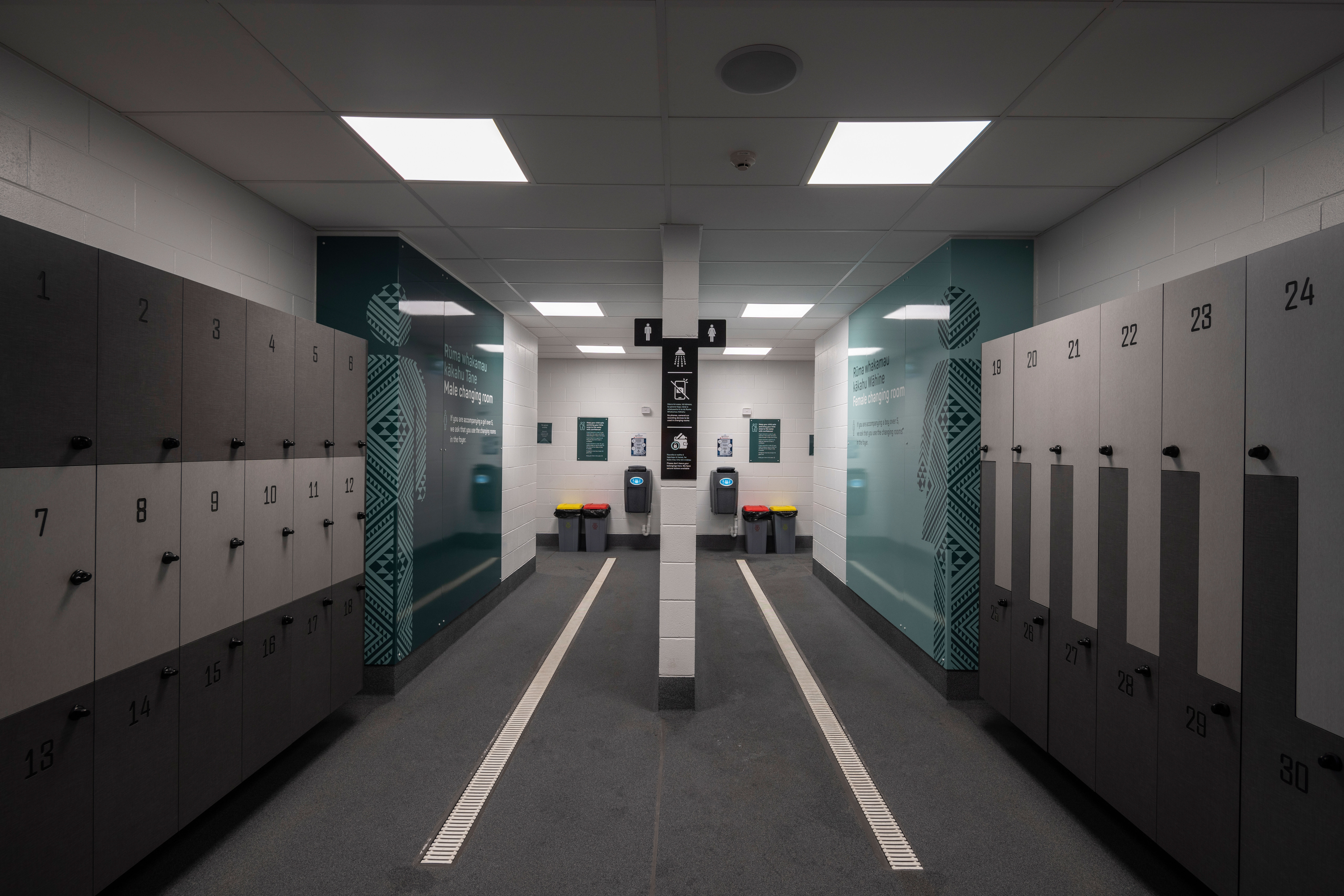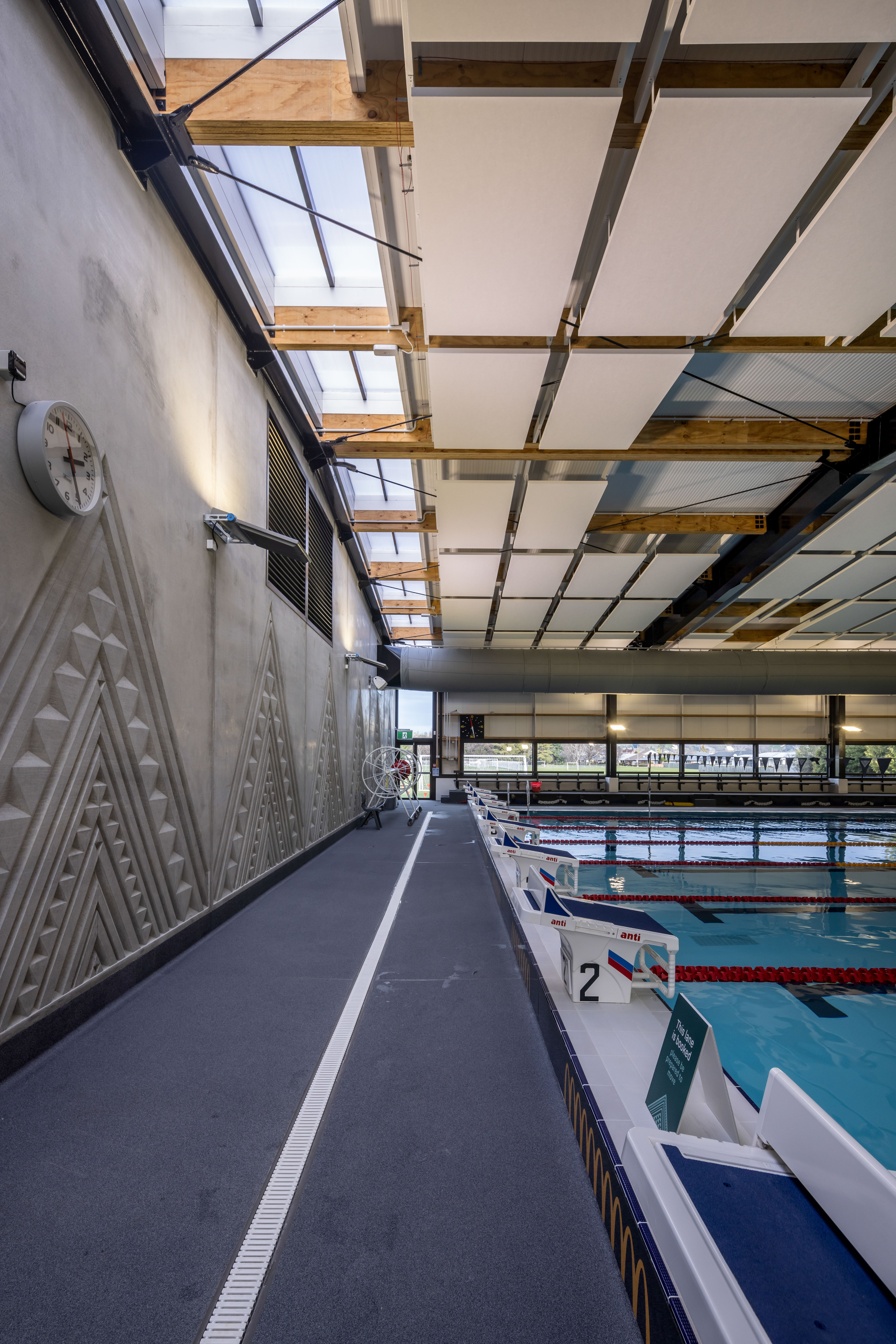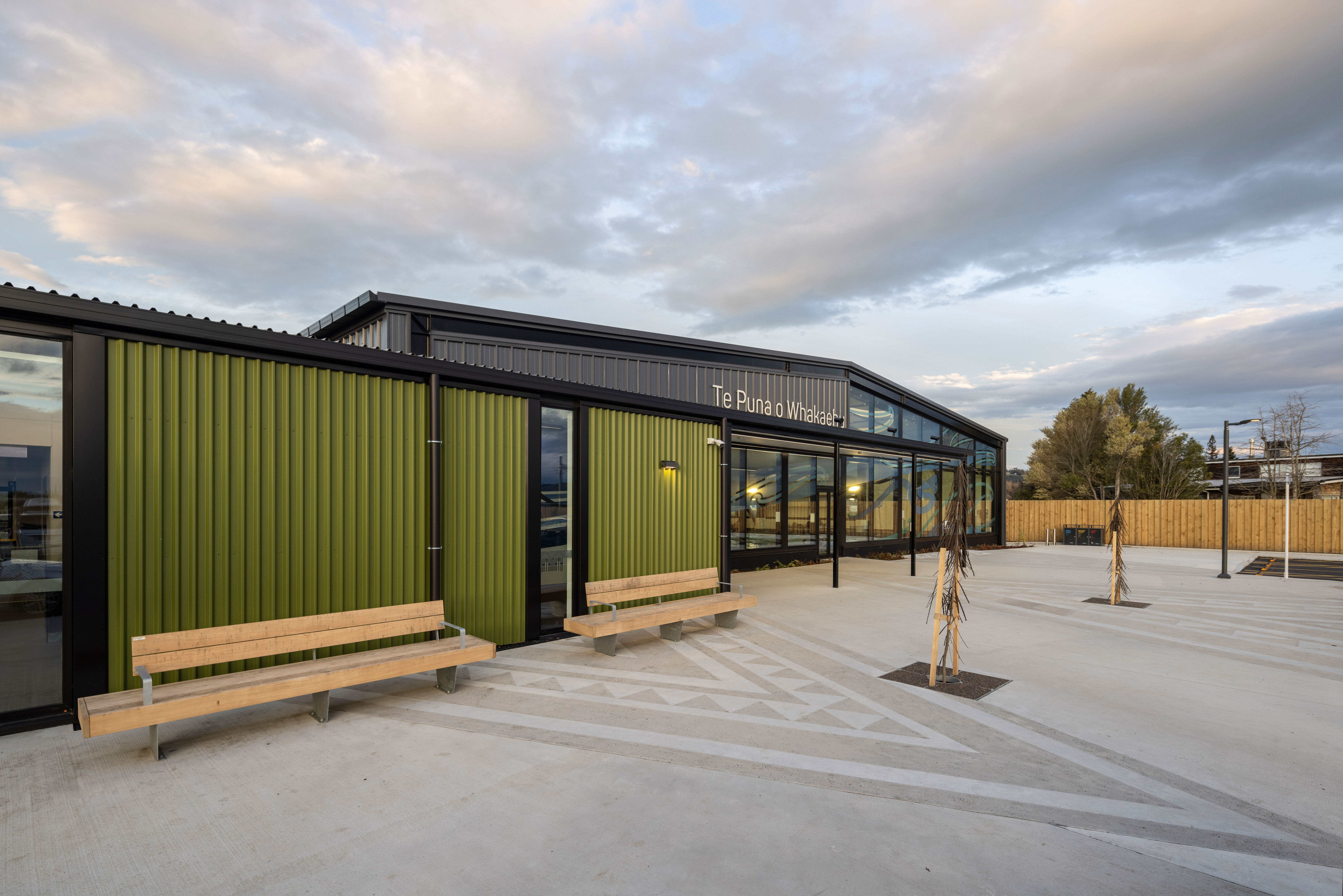 Mosgiel has been blessed by the offspring of an ancient taniwha, with six new swimming pools clustered under a low-slung roof. Set within a silver box spilling into a larger black box, all the details here are just right for a community pool. There is clear interaction with the street, great slot views to the surrounding countryside while swimming, and a masterful series of chunky taniwha teeth cast across the rear wall. This development is a hit – and makes a big splash – with the local community.