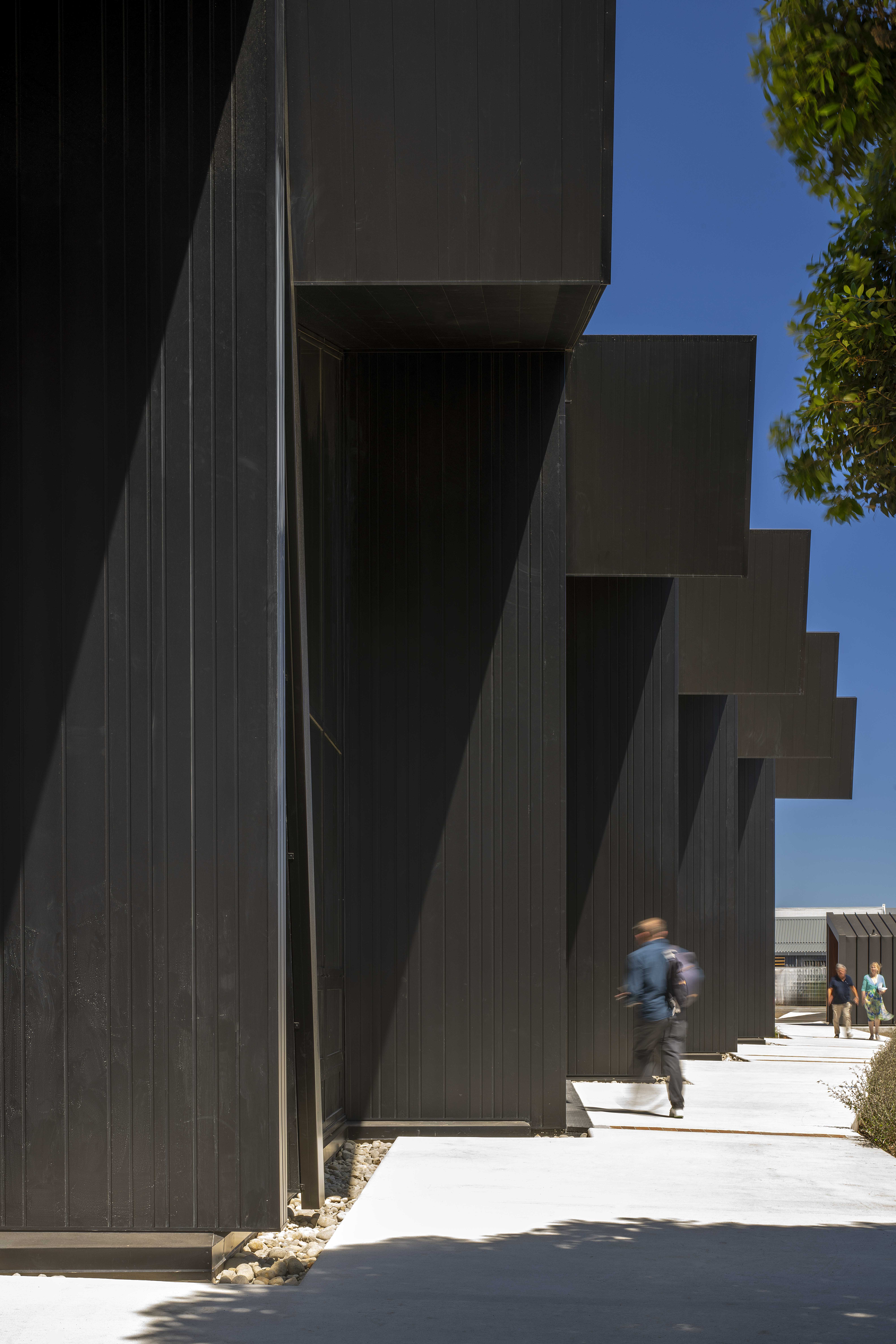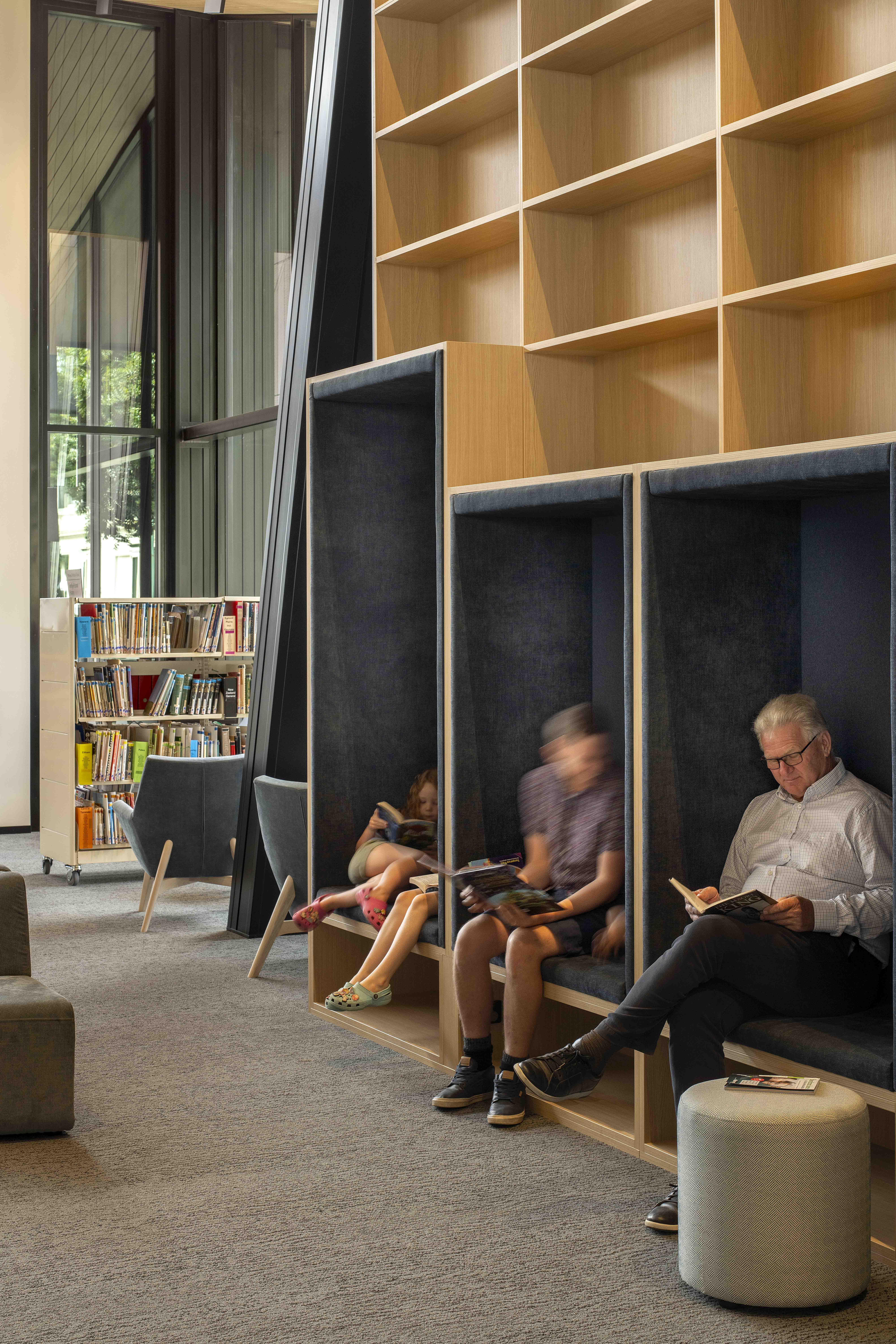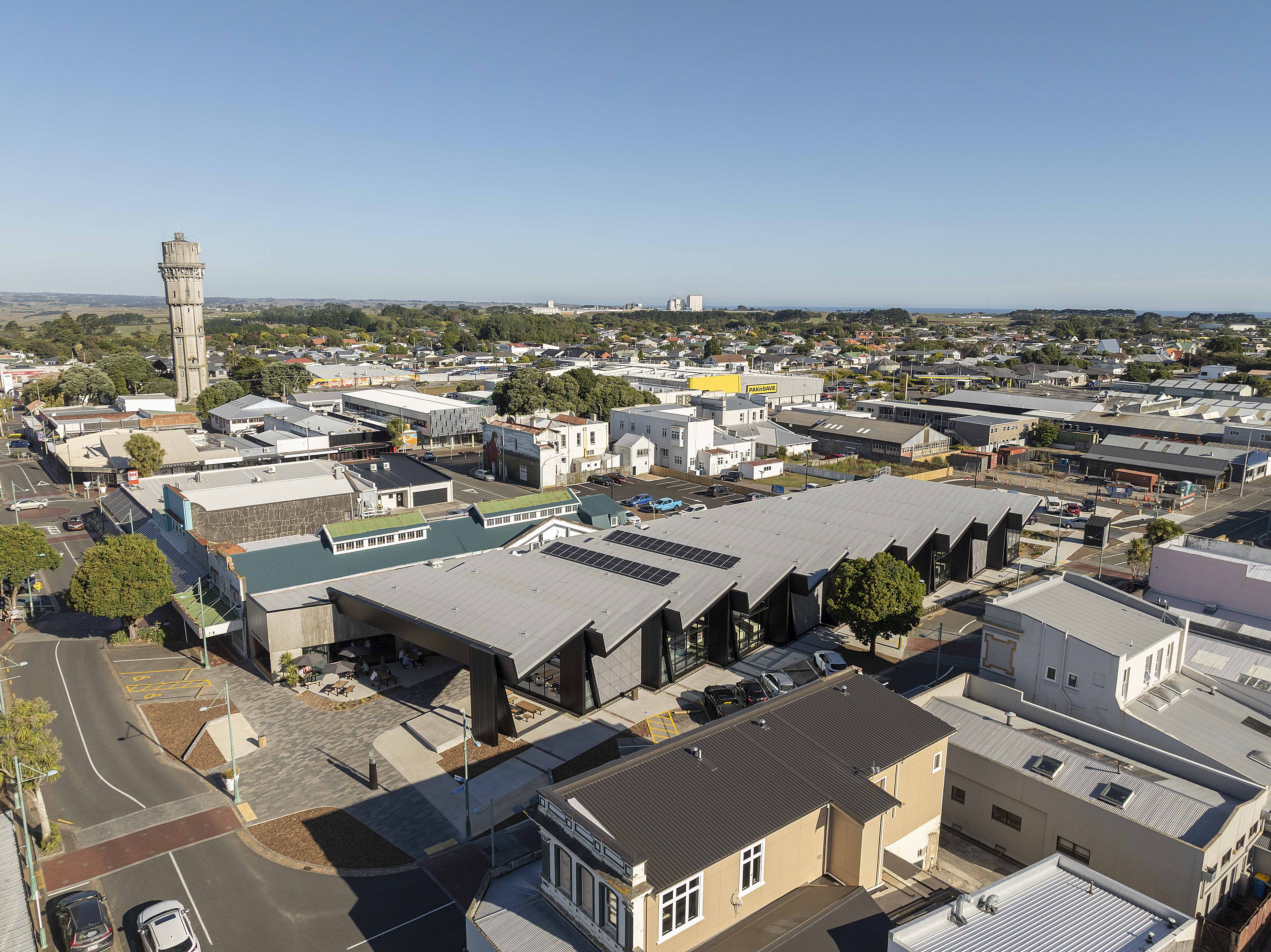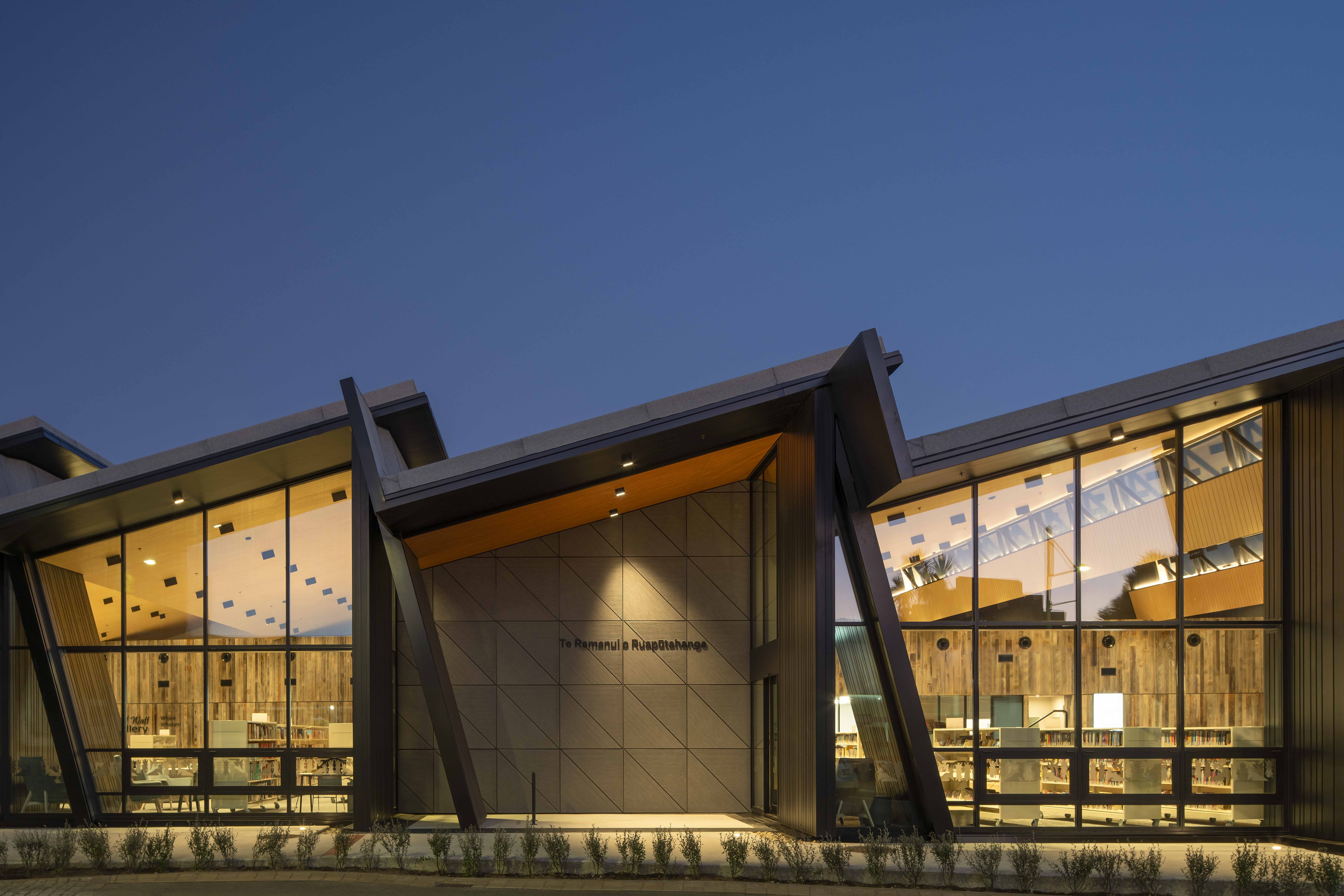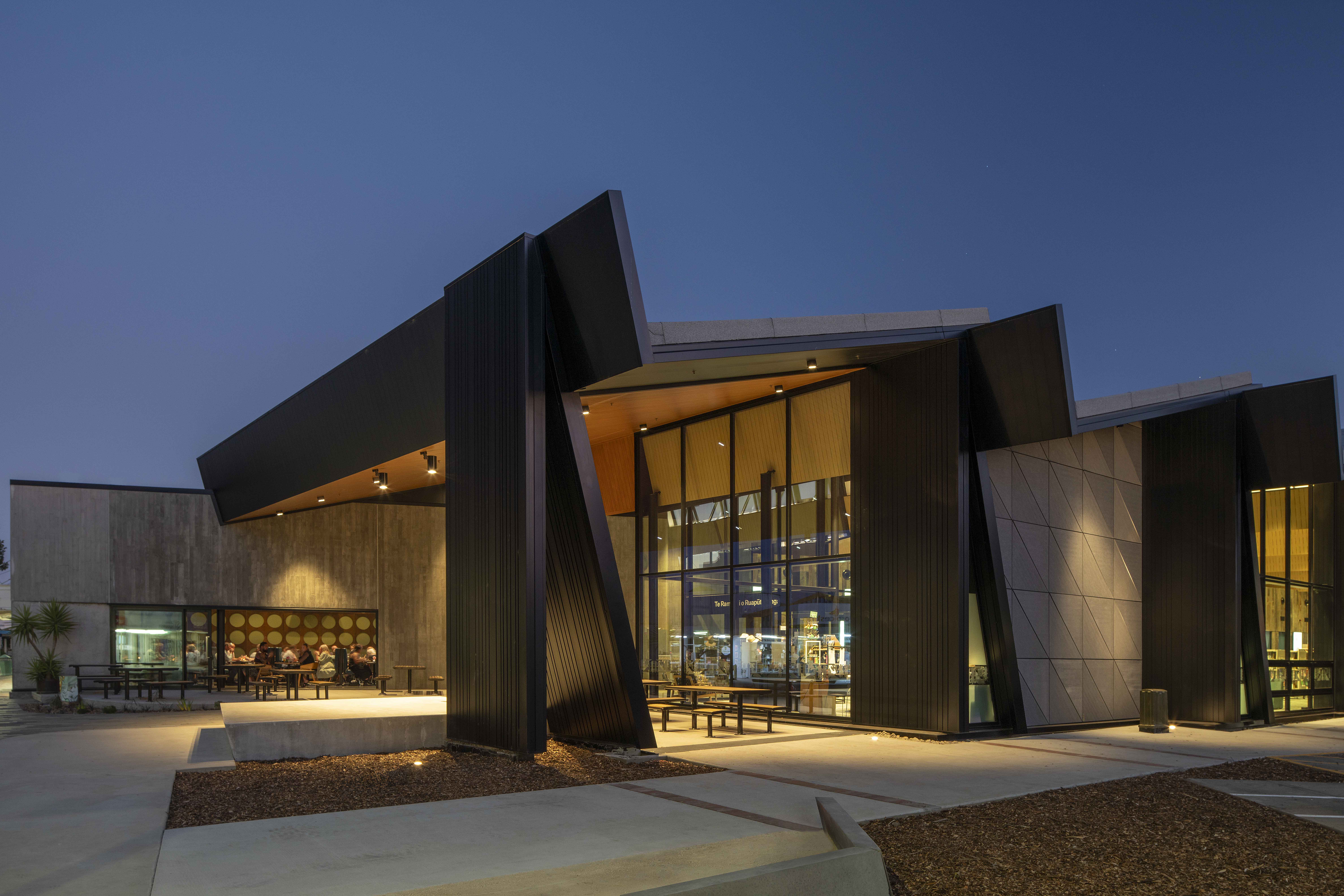 Te Ramanui o Ruapūtahanga is a striking addition to the Hāwera civic landscape, embodying the spirit of South Taranaki’s black sand beaches and industrial heritage through bold, expressive architectural forms. Prominently positioned on a corner site, the building stands as a beacon for the community. It thoughtfully brings together a library, café, and visitor centre, unified by an interior anchored by a powerful manawa strip that symbolically honours the local iwi. A strong architectural spine supports clear functional planning and spatial distinction. With its integrated sustainability features, Te Ramanui o Ruapūtahanga sets a new benchmark for future regional developments—demonstrating how architecture can meaningfully honour cultural heritage while championing environmental responsibility.