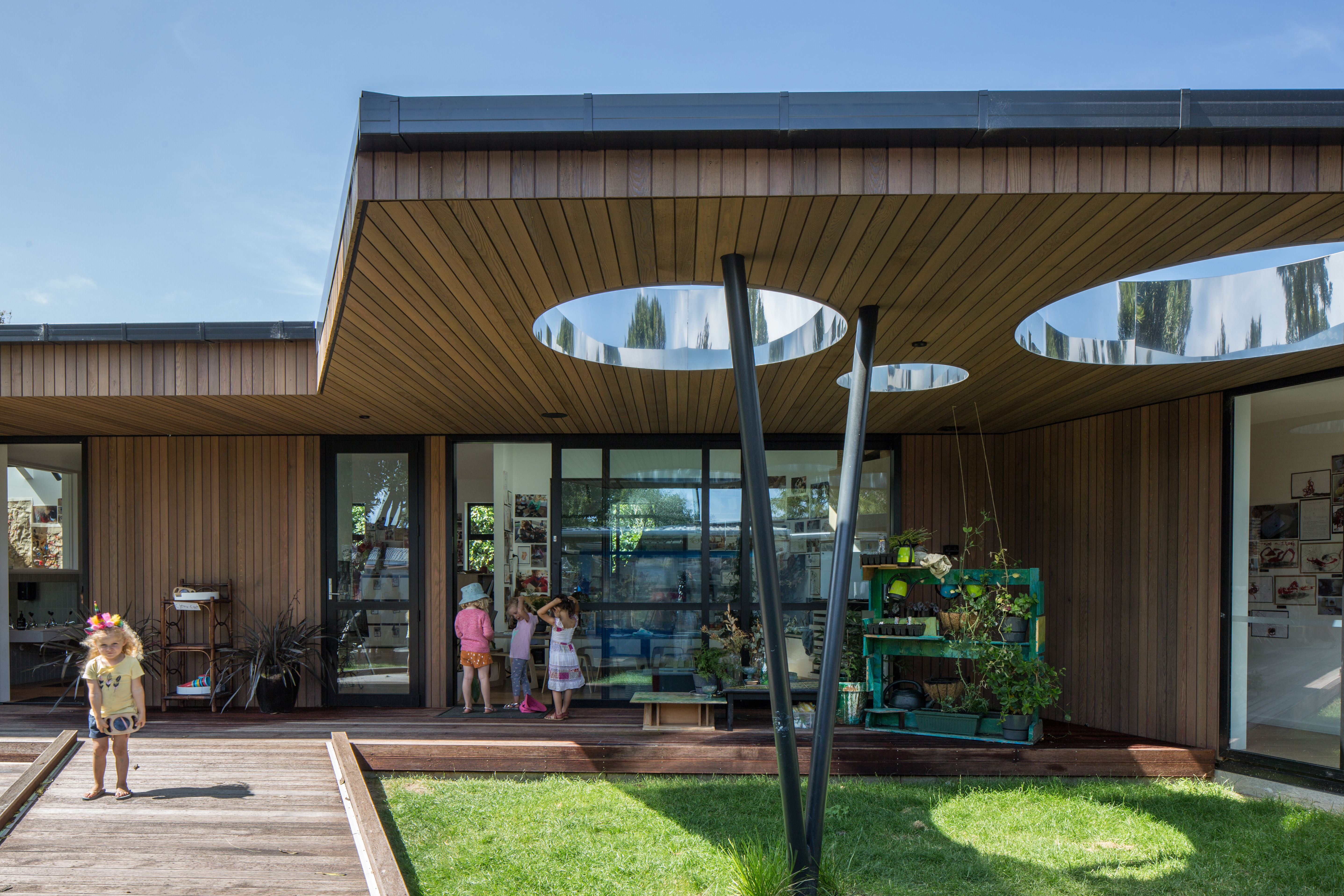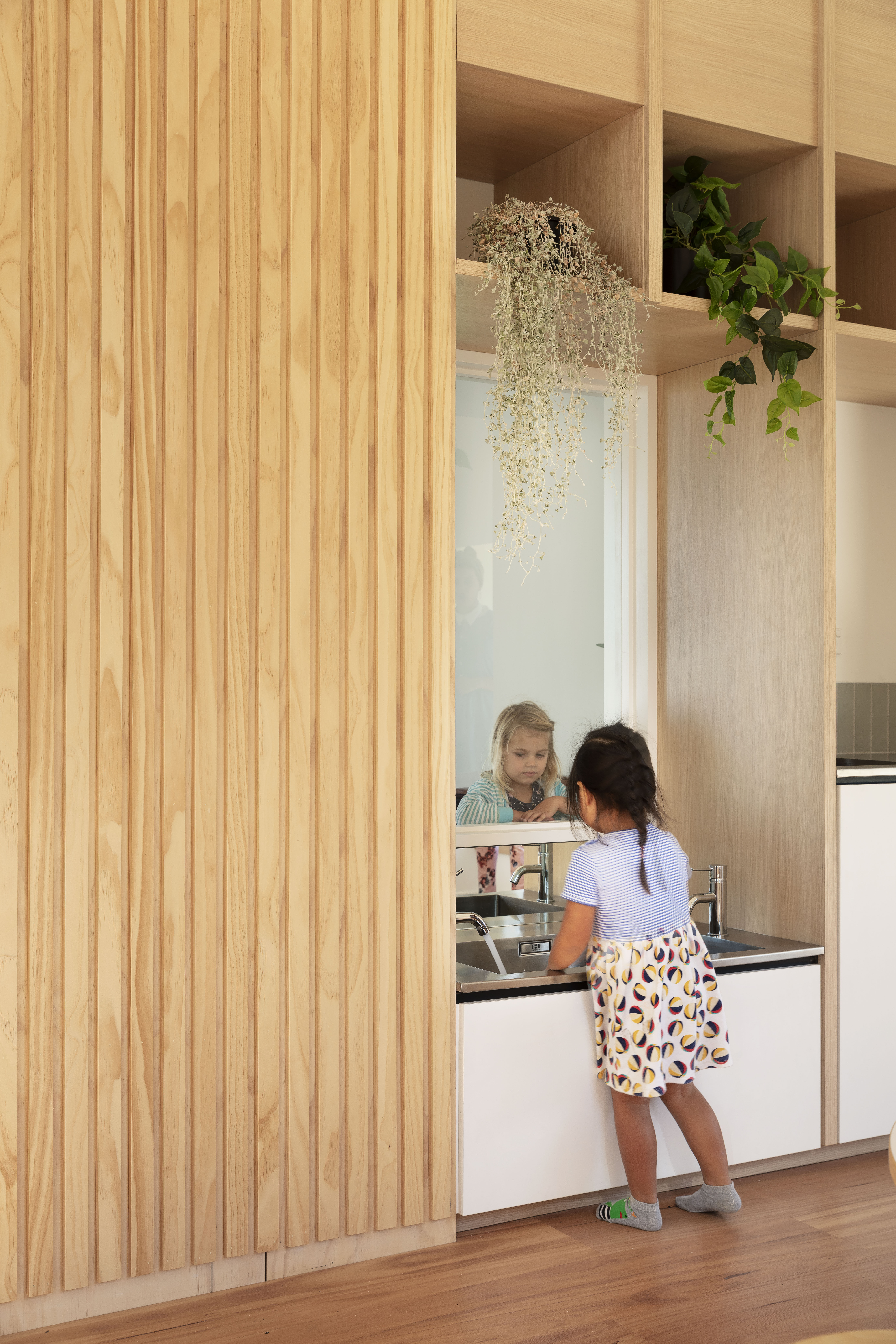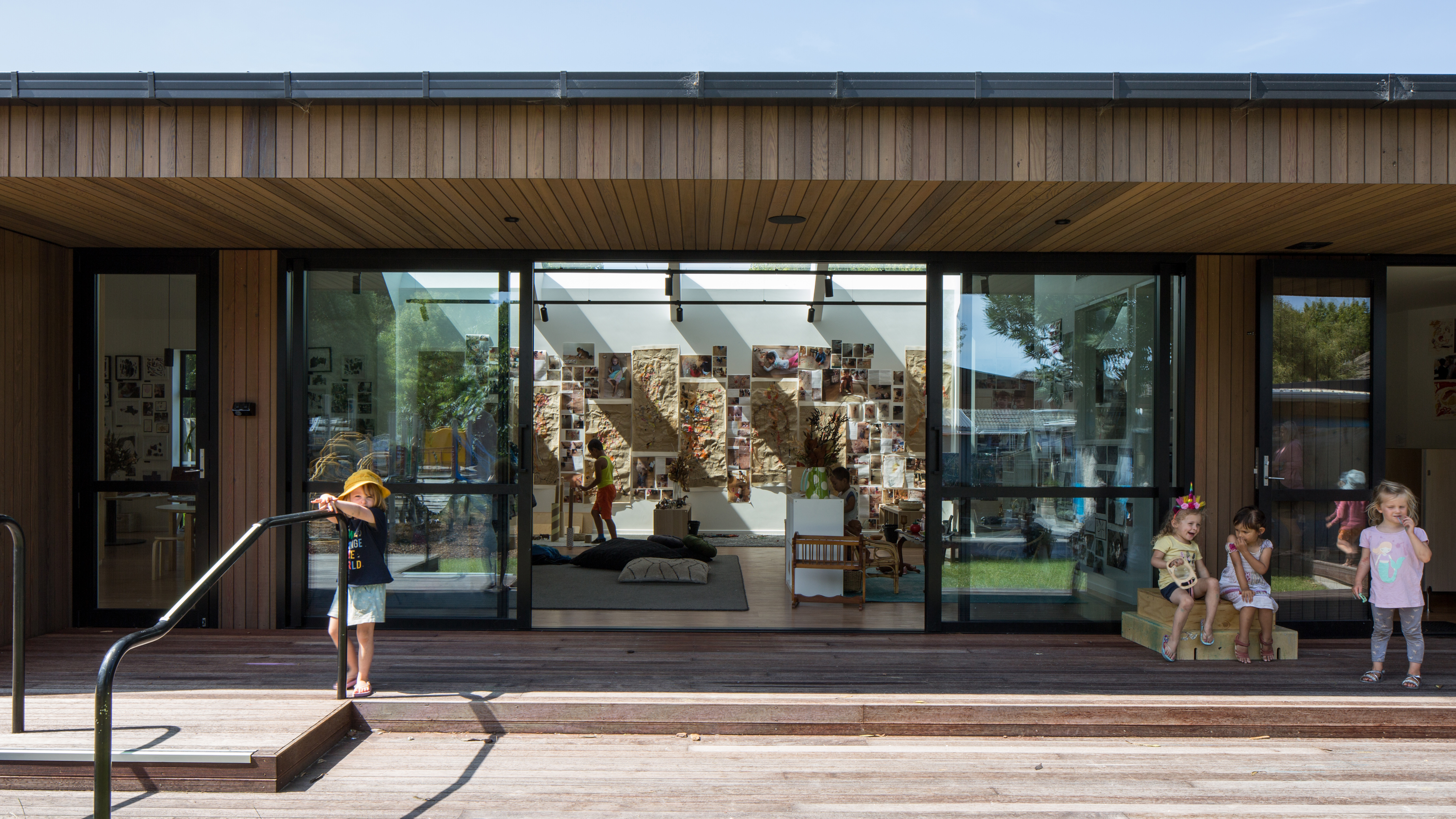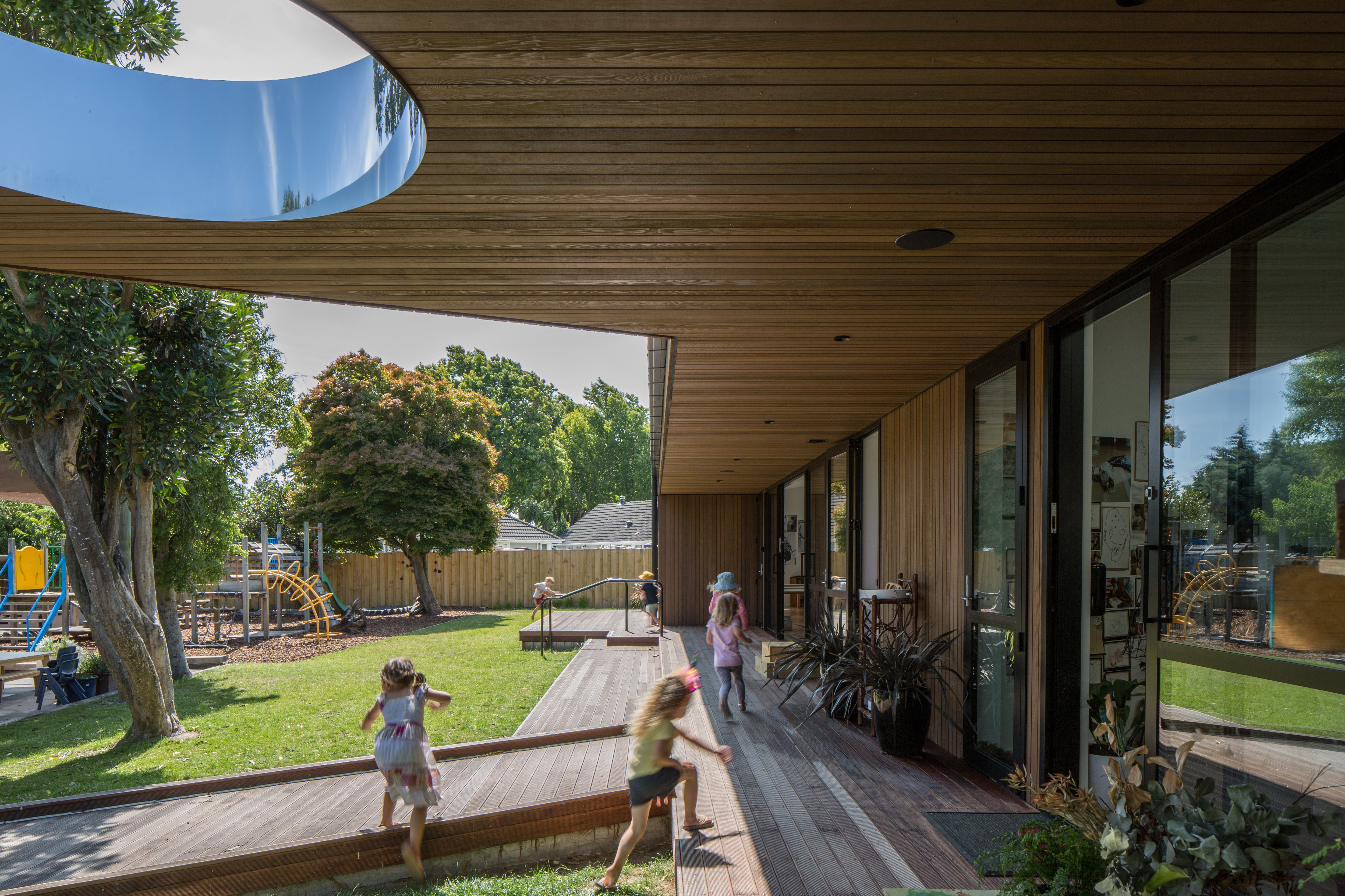 This preschool building turns its back to the street to create an enclosed space where children can interact and respond to the play of light, shadow, texture and reflection created by its architecture. Deliberately residential in scale and material, Te Tipu feels familiar and intimate, with a calm and neutral interior and a flexible framework that facilitates creativity, investigation and reflection. A playful sequence of associated spaces, divided and connected by a central battened timber wall, allows visual connection and separation between a pair of opposing ateliers. Exceeding its role on an established preschool site, this building has become a teaching tool that celebrates the sensory experiences of architecture.