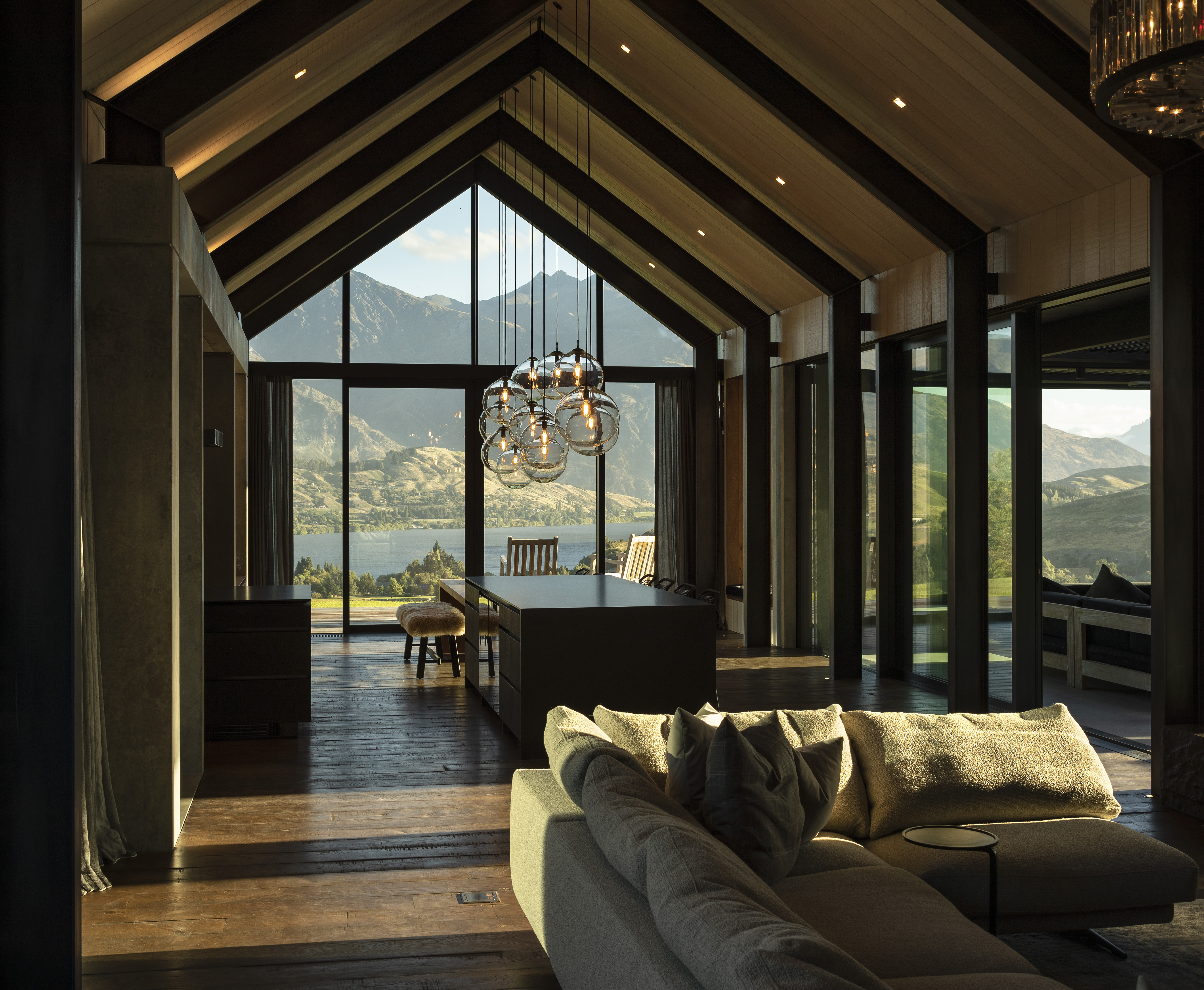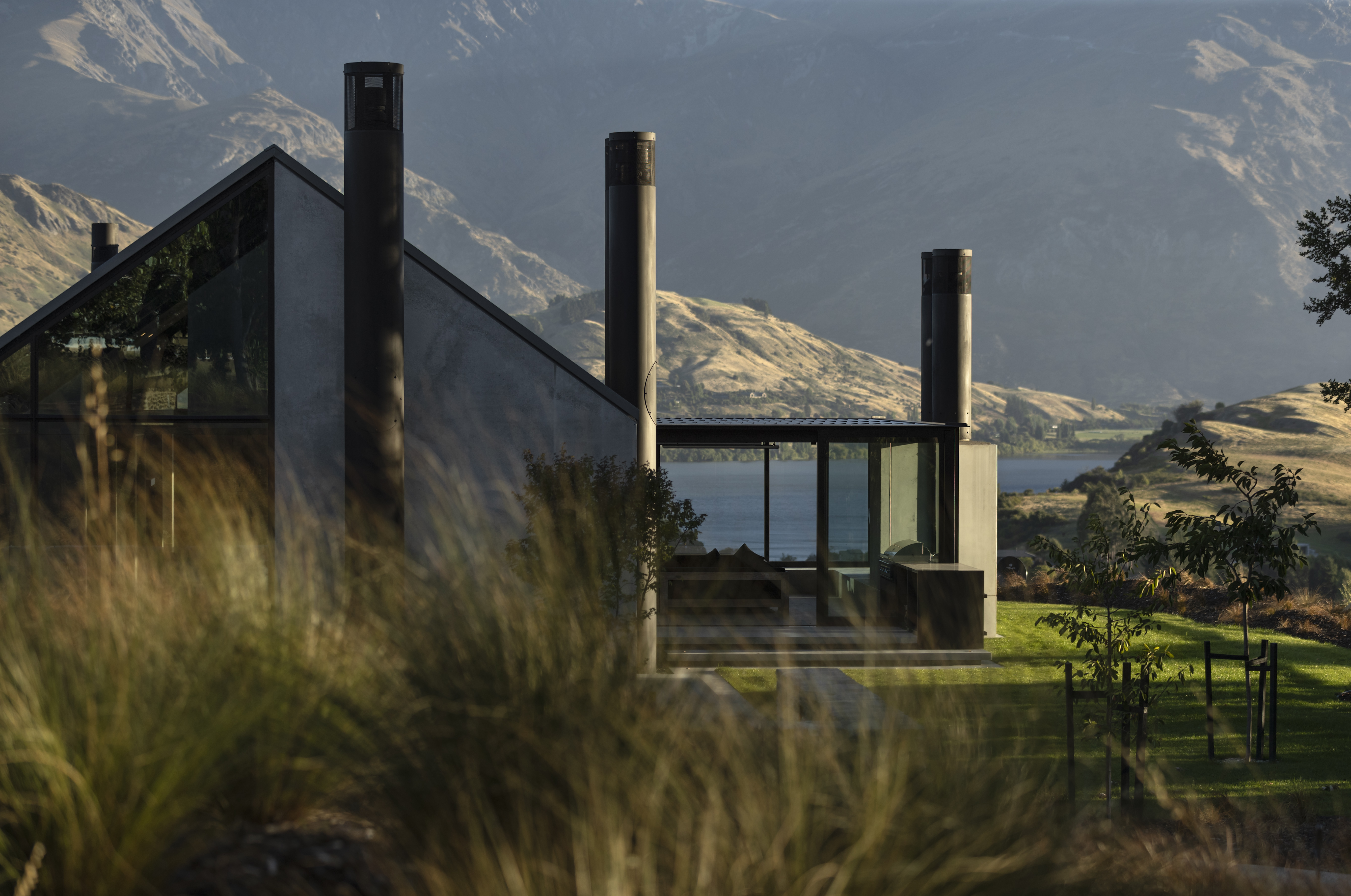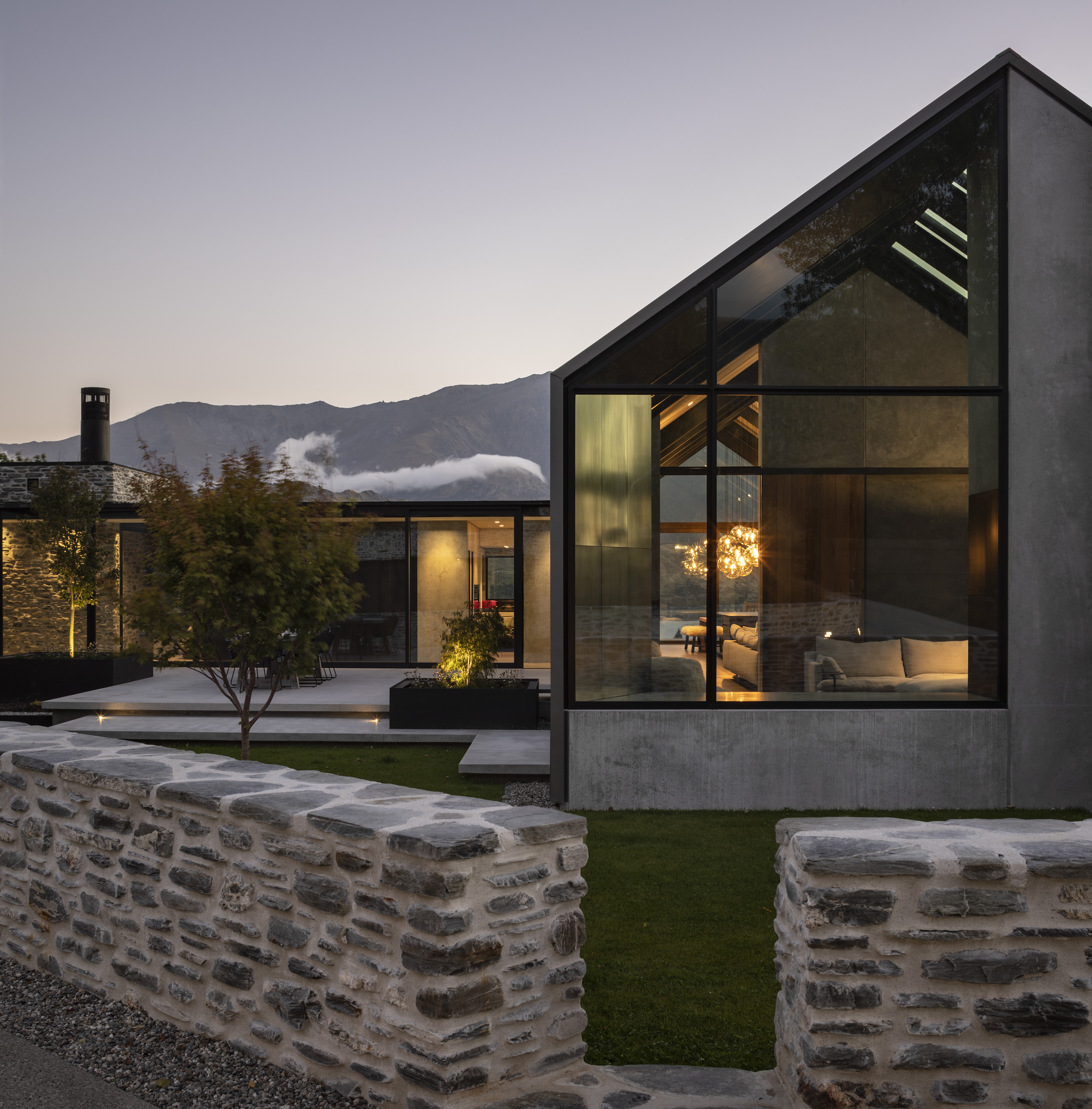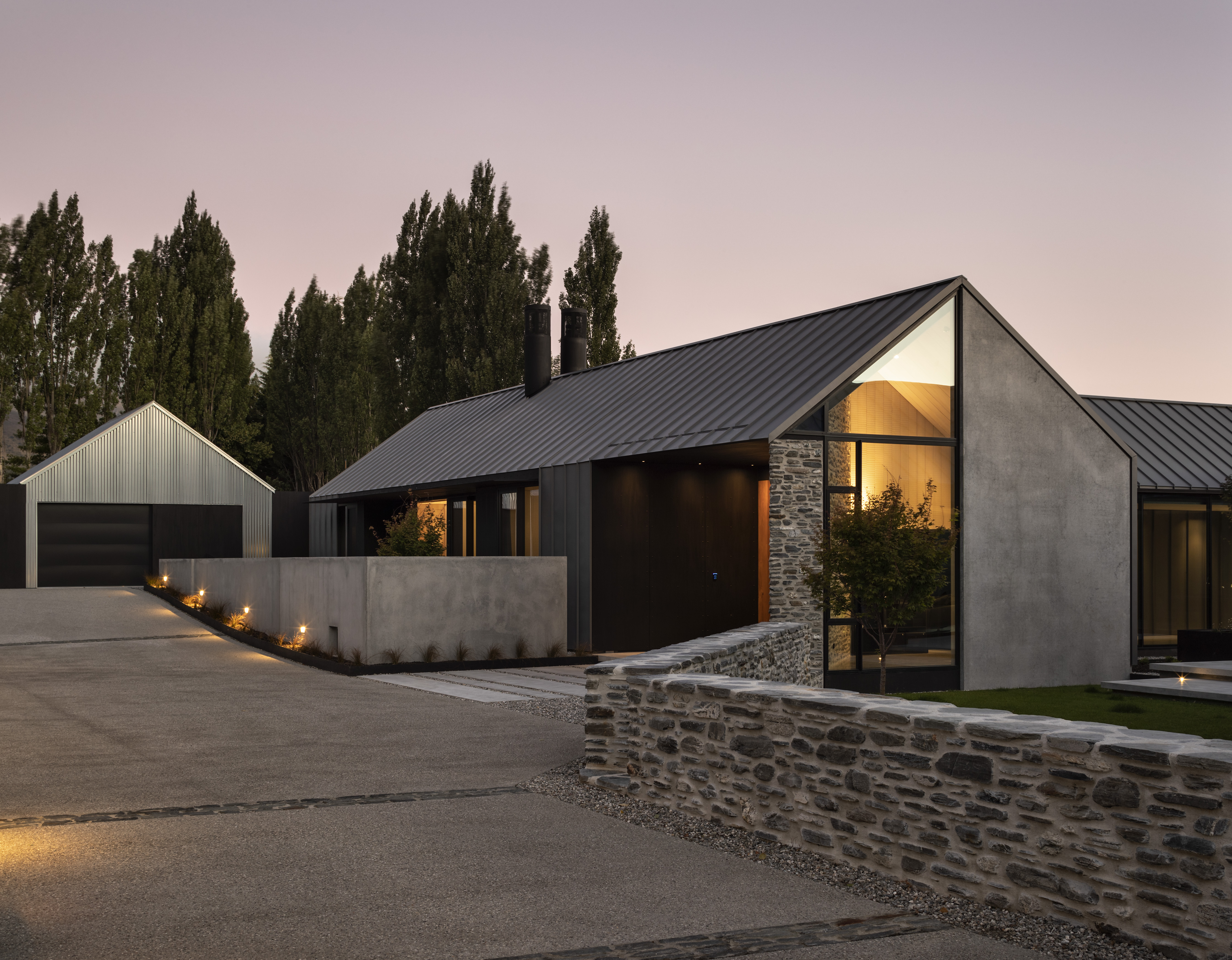 The architect has taken the alpine vernacular of the gable form and given it a contemporary twist in this spacious home overlooking Lake Hayes. The plan creates separate spaces for a family of three adults, connected by corridors that display a creative appreciation for materiality and design. While the alpine landscape plays a clear role in the material selections, the delivery is pleasantly unexpected, with a mix of schist, metal, glazing, and timber creating a refined textural experience inside and out.