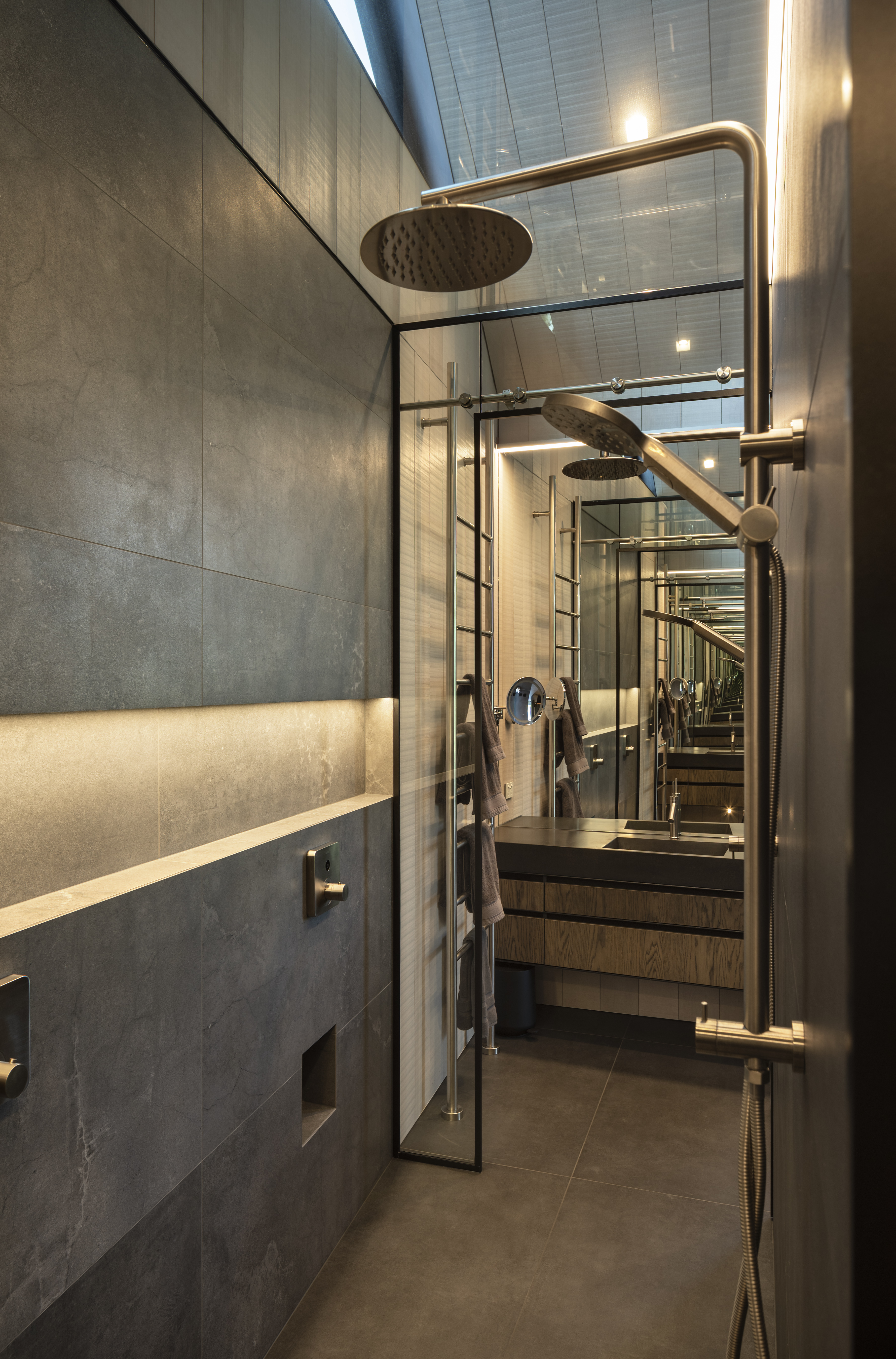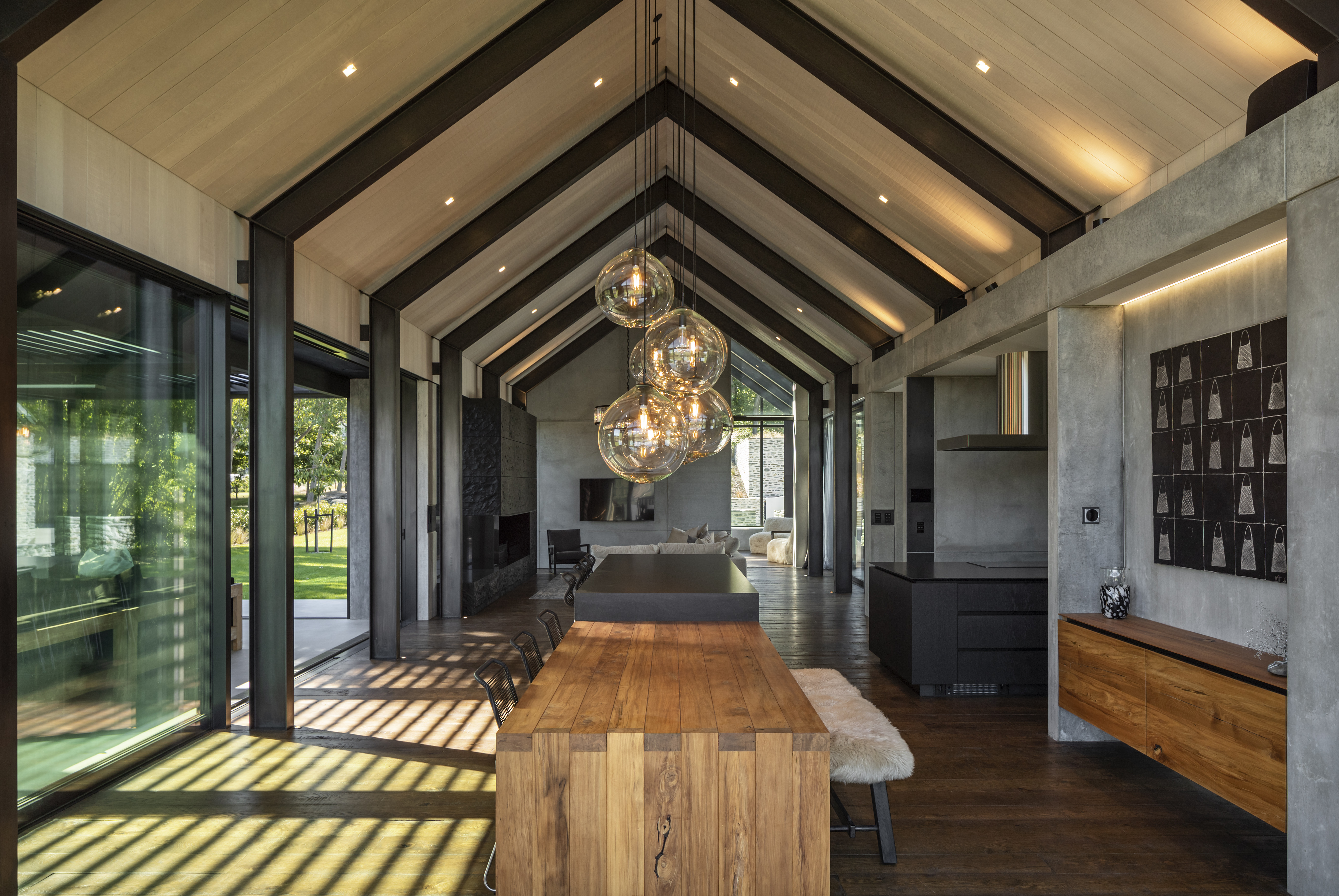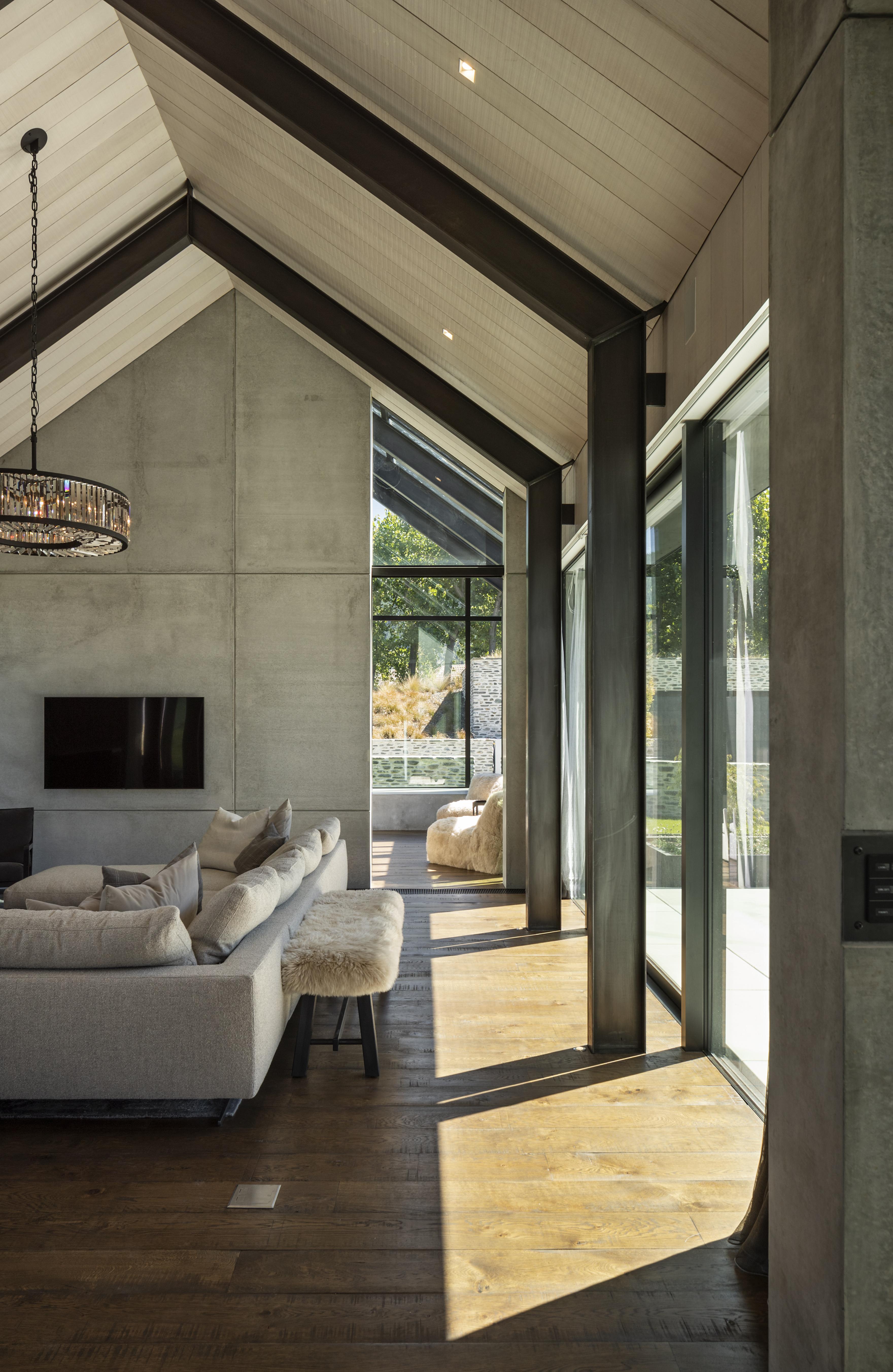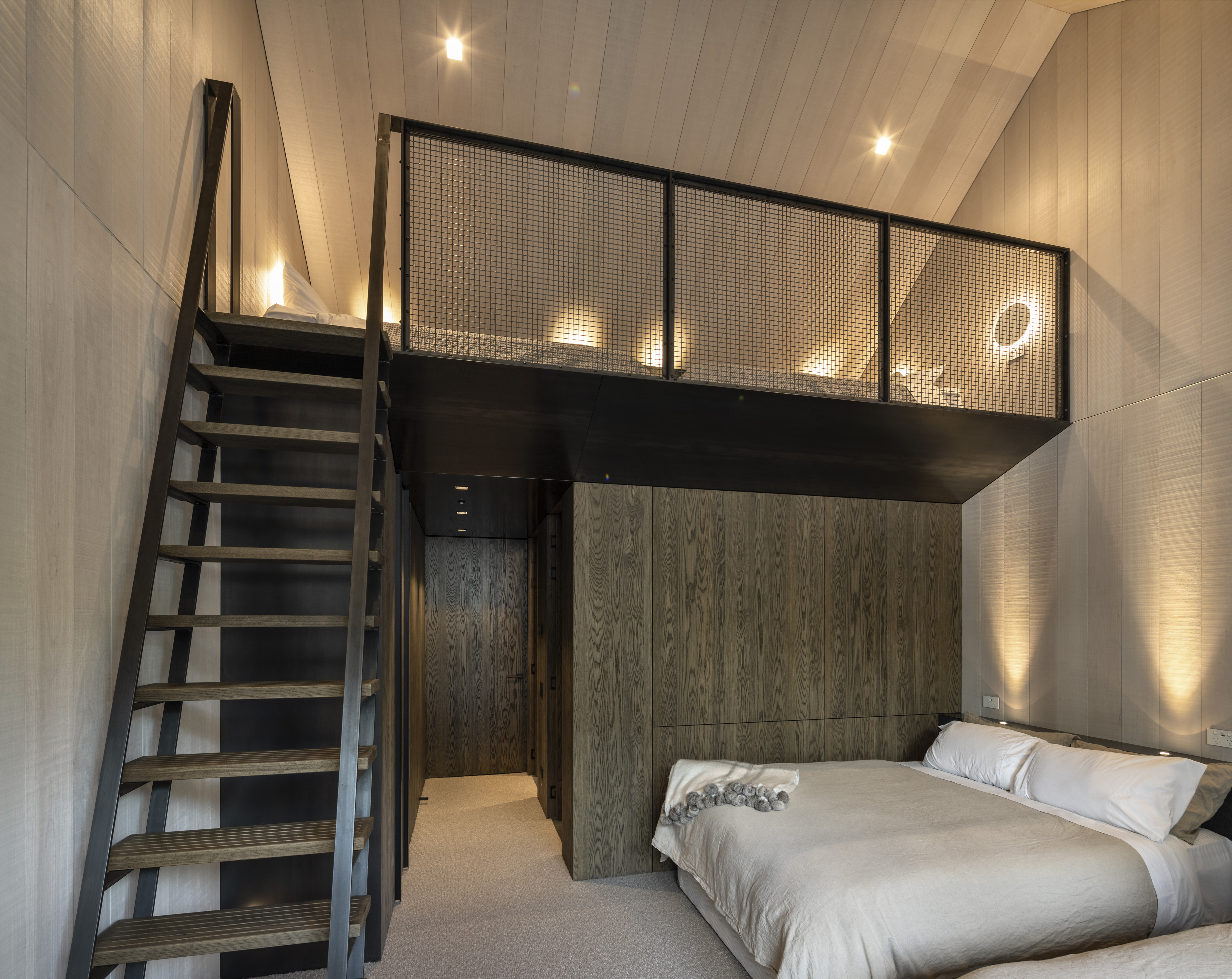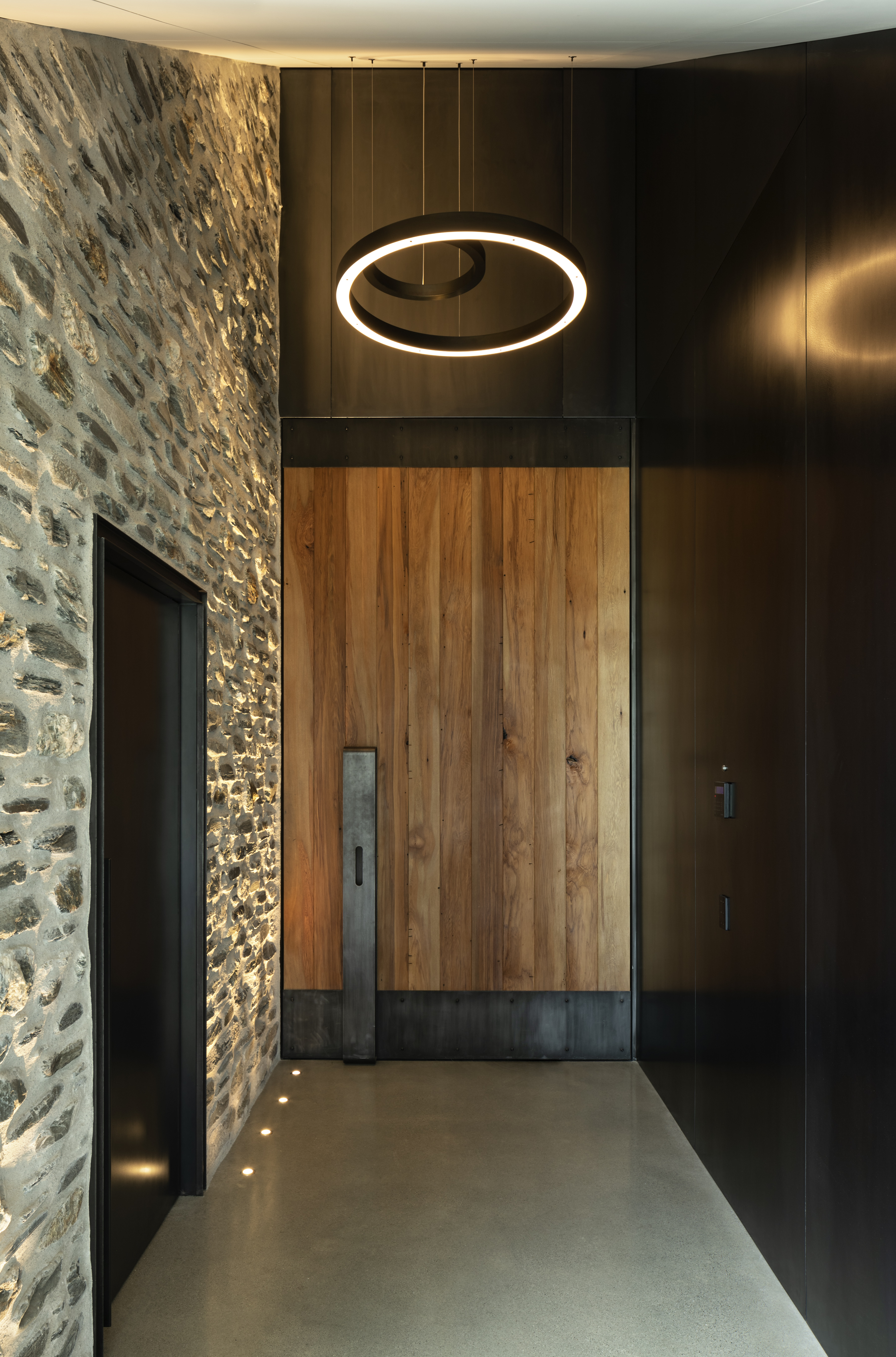 The architect has taken the alpine vernacular of the gable form and given it a contemporary twist in this spacious home overlooking Lake Hayes. The plan creates separate spaces for a family of three adults, connected by corridors that display a creative appreciation for materiality and design. While the alpine landscape plays a clear role in the material selections, the delivery is pleasantly unexpected, with a mix of schist, metal, glazing, and timber creating a refined textural experience inside and out.