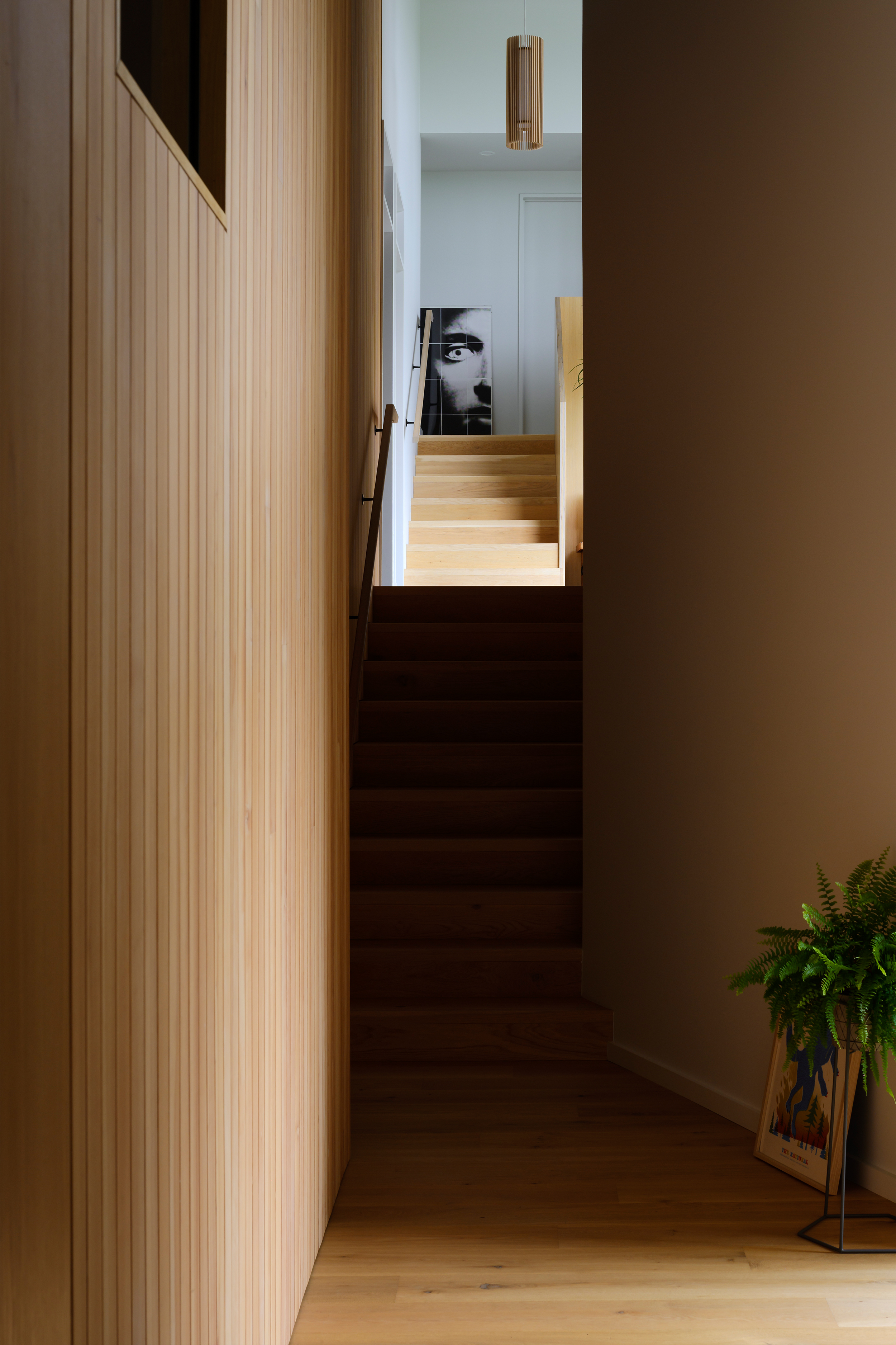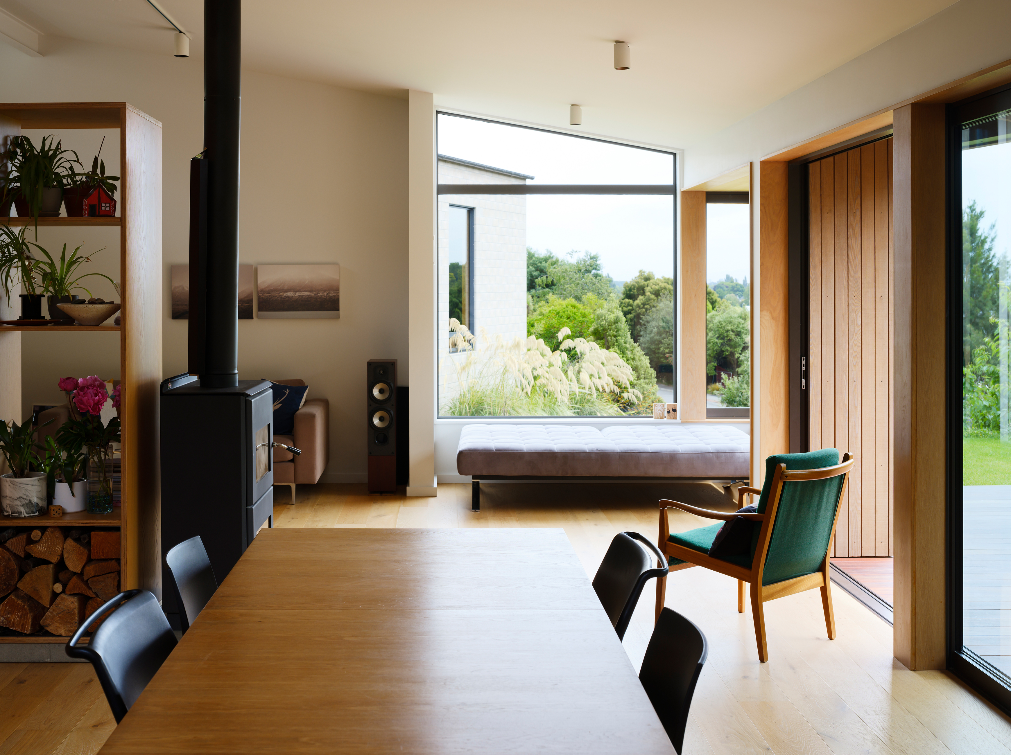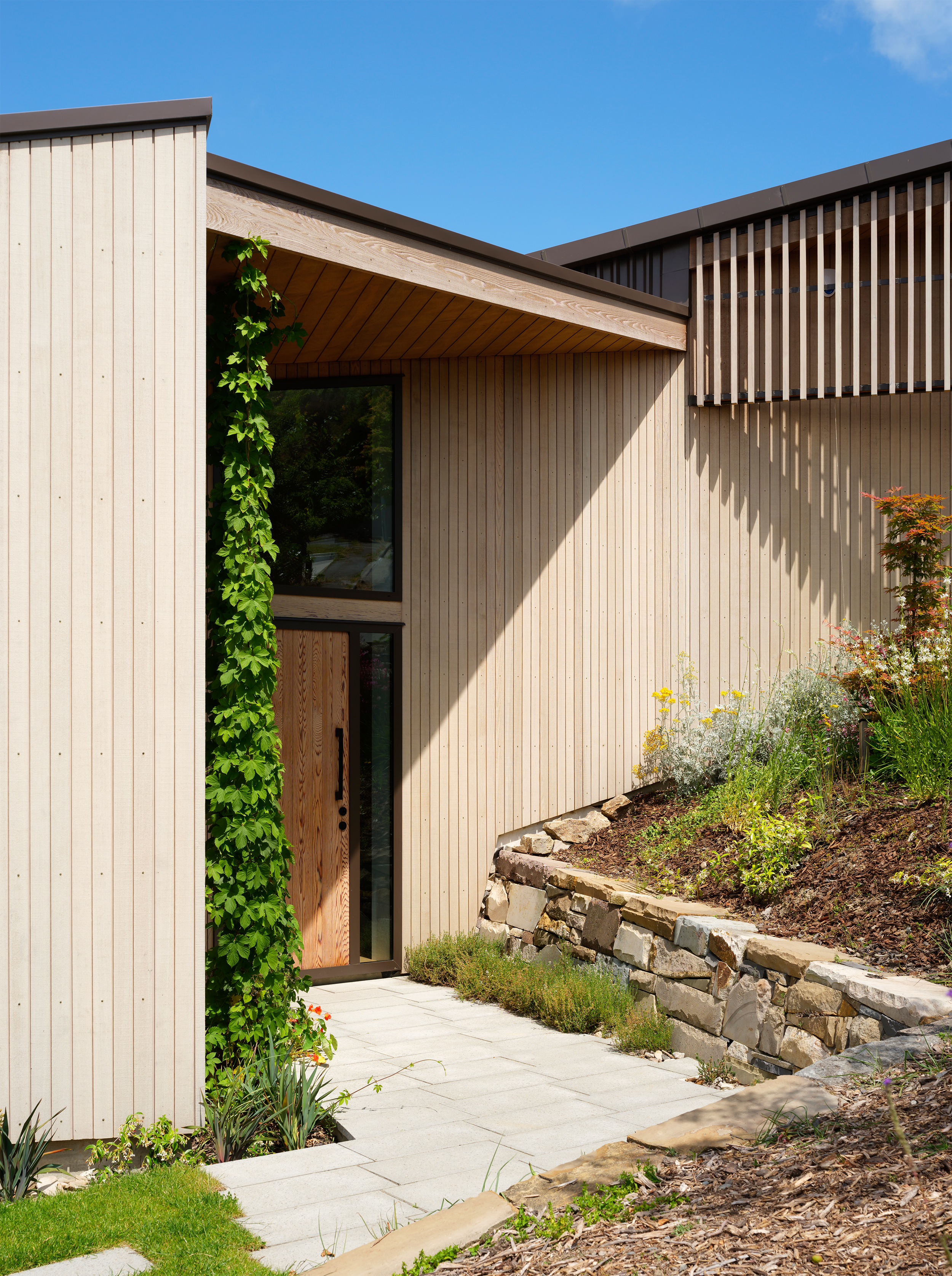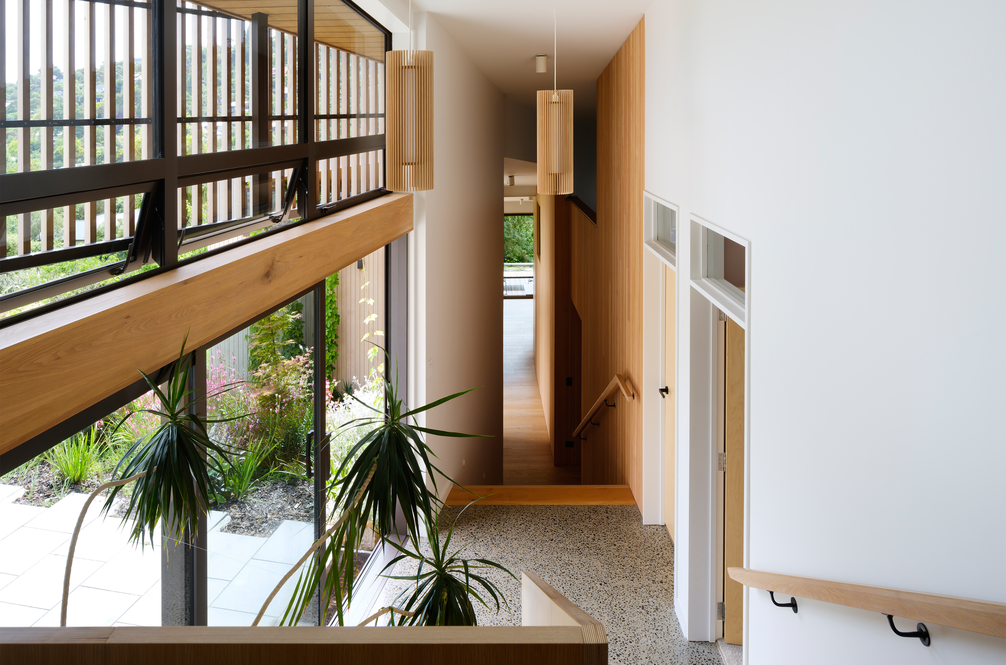 A clear and considered response to this hill-side site flowed from the architects’ initial concept model. The house rises from the land as an extruded form, with the overlapping roofs serving as the fifth, and most-telling, façade. Viewed from the winding pedestrian approach, the house evokes a sense of familiarity and warmth. Across the threshold, relaxed living spaces lead into a towering spine wall that appears to have grown out of the site. Openings to the courtyard allow a transitional softening into the landscape, and planting has already blurred the line between what has been built and what has been grown.