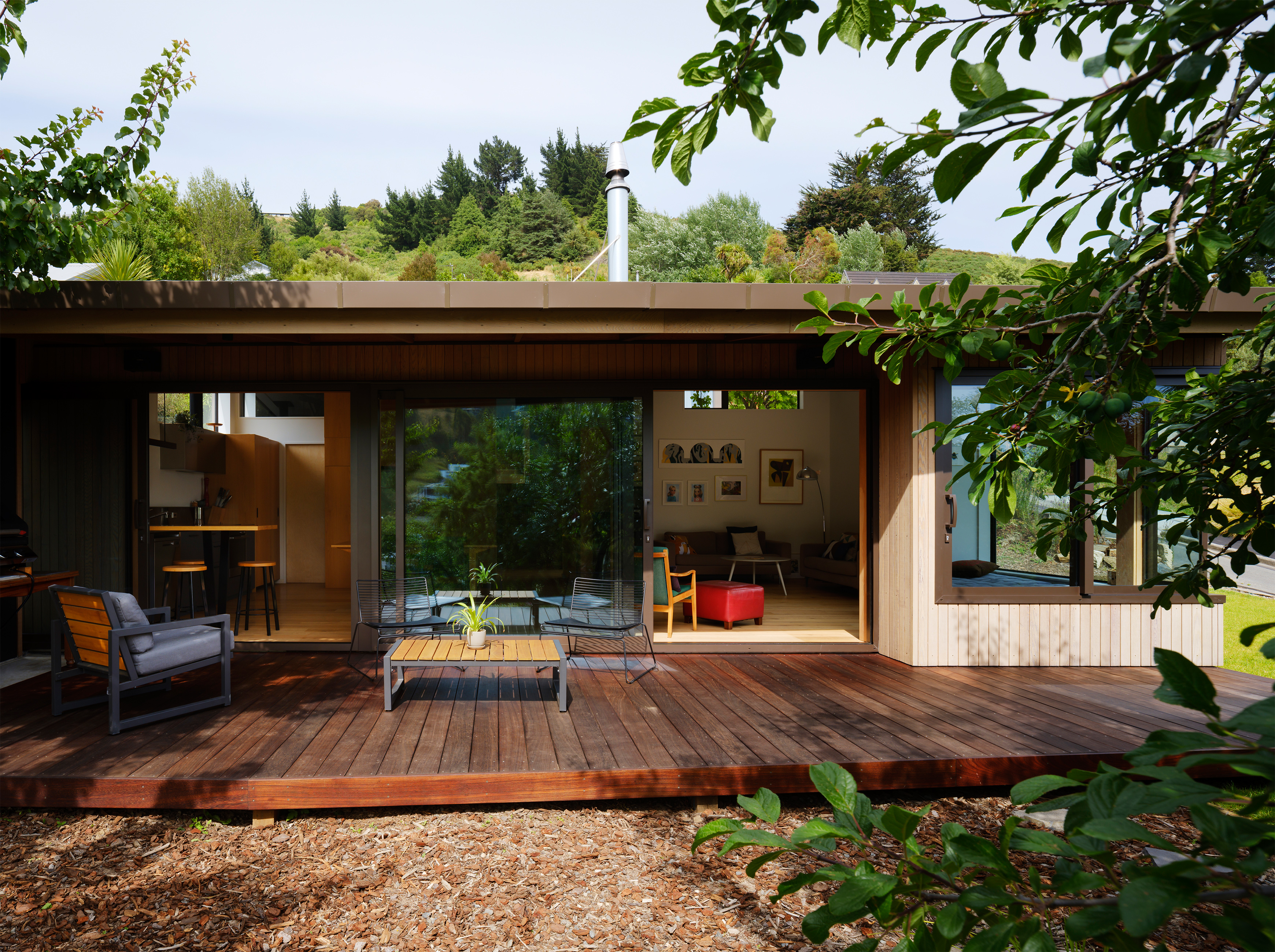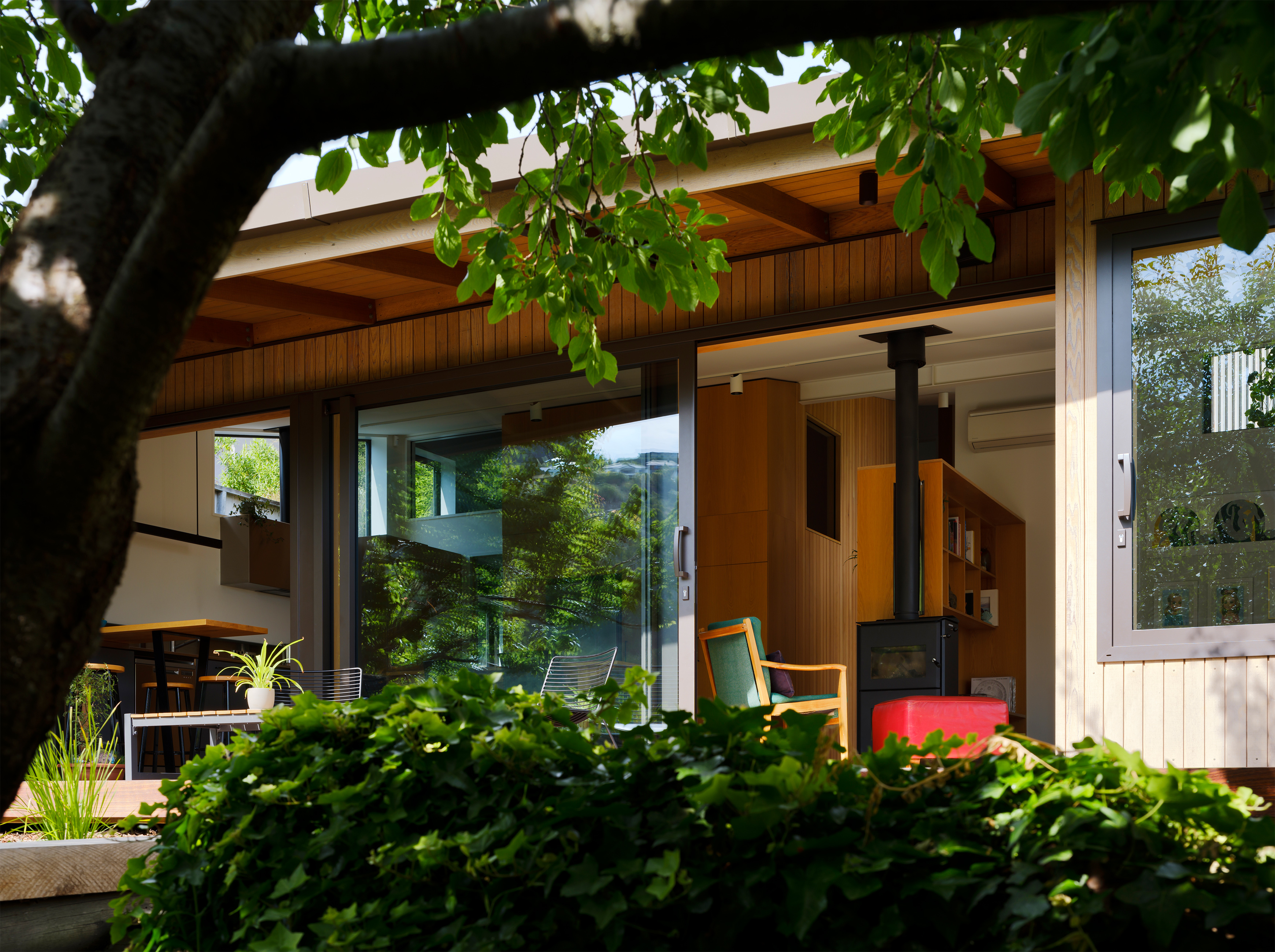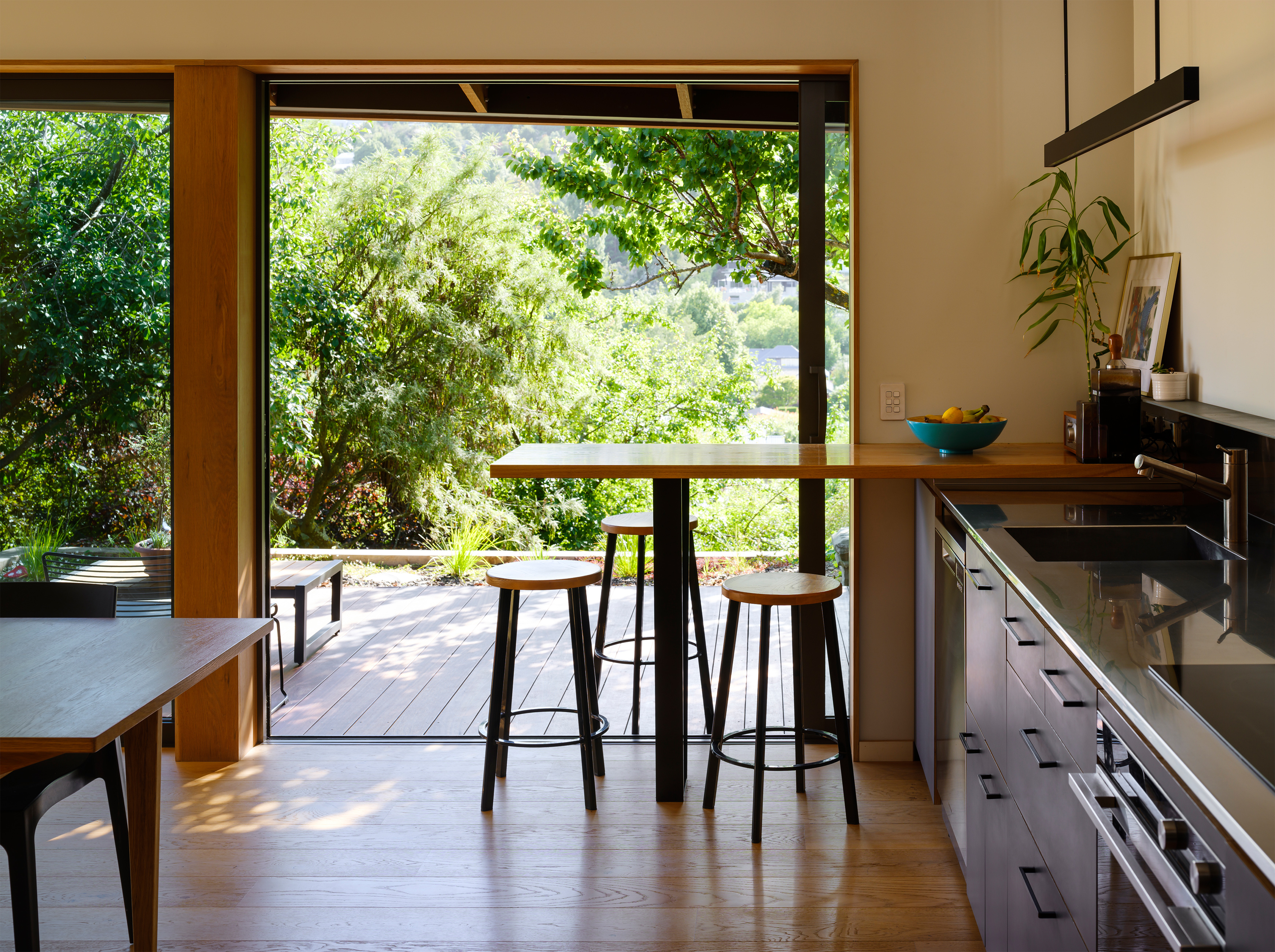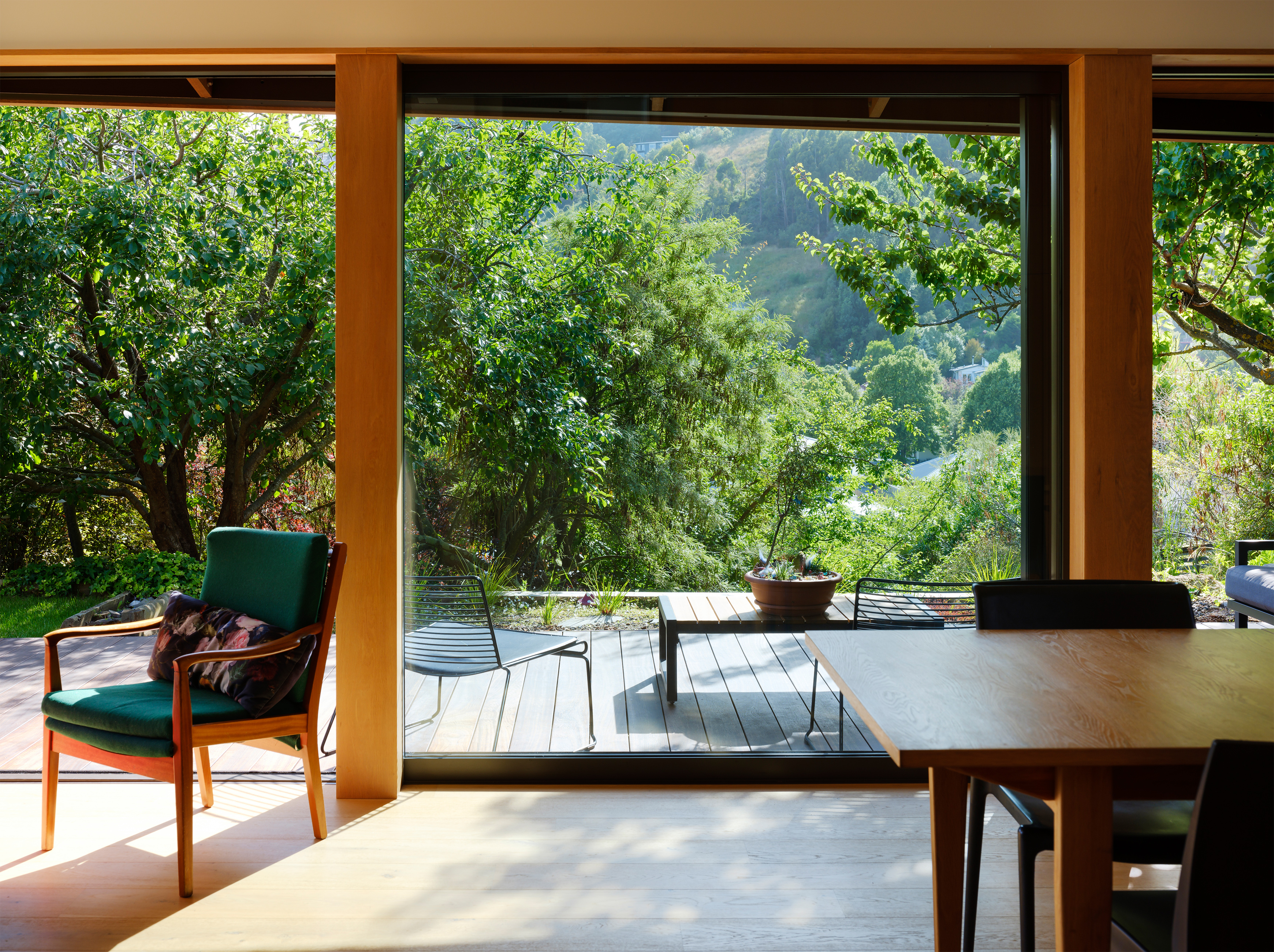 A clear and considered response to this hill-side site flowed from the architects’ initial concept model. The house rises from the land as an extruded form, with the overlapping roofs serving as the fifth, and most-telling, façade. Viewed from the winding pedestrian approach, the house evokes a sense of familiarity and warmth. Across the threshold, relaxed living spaces lead into a towering spine wall that appears to have grown out of the site. Openings to the courtyard allow a transitional softening into the landscape, and planting has already blurred the line between what has been built and what has been grown.