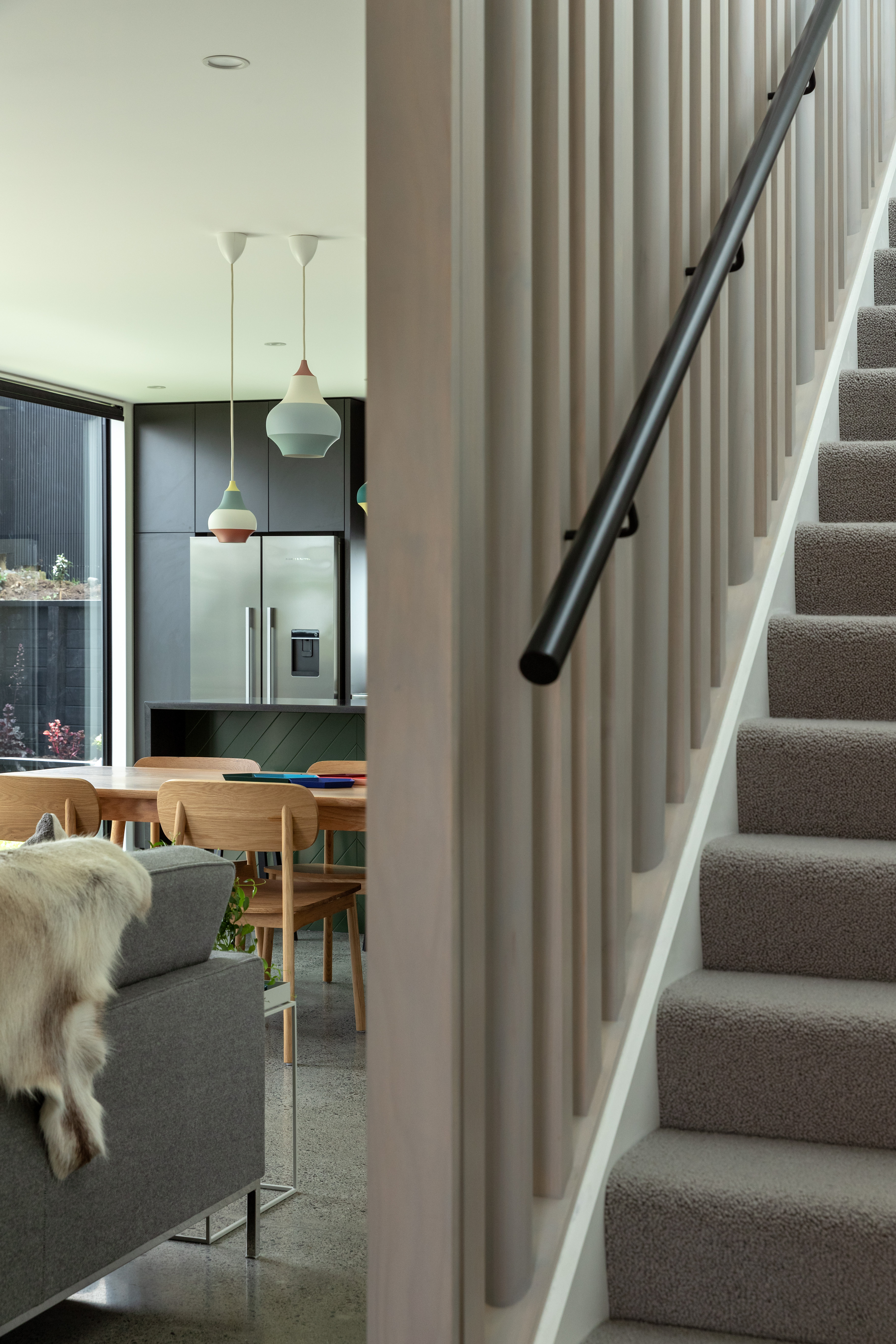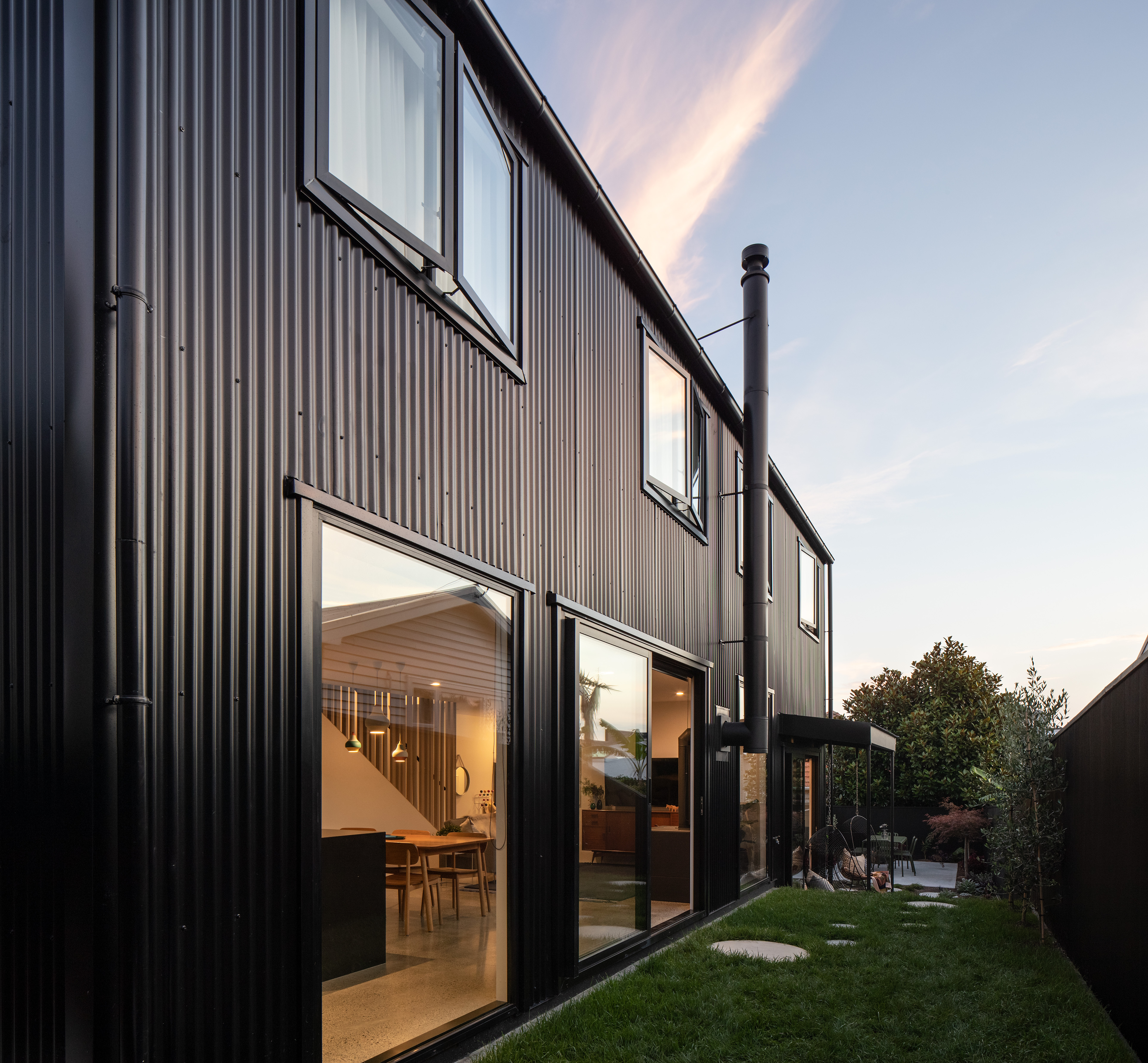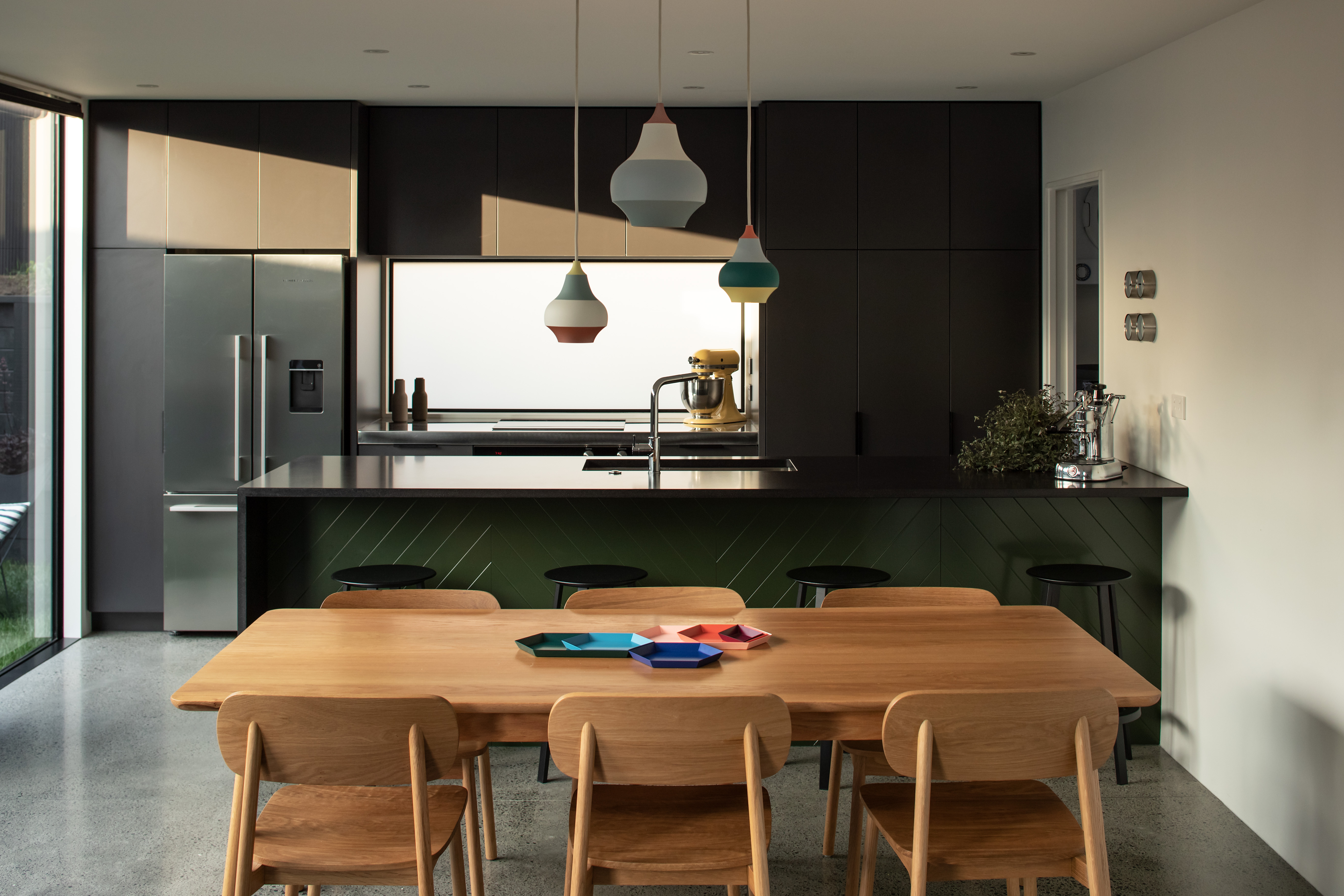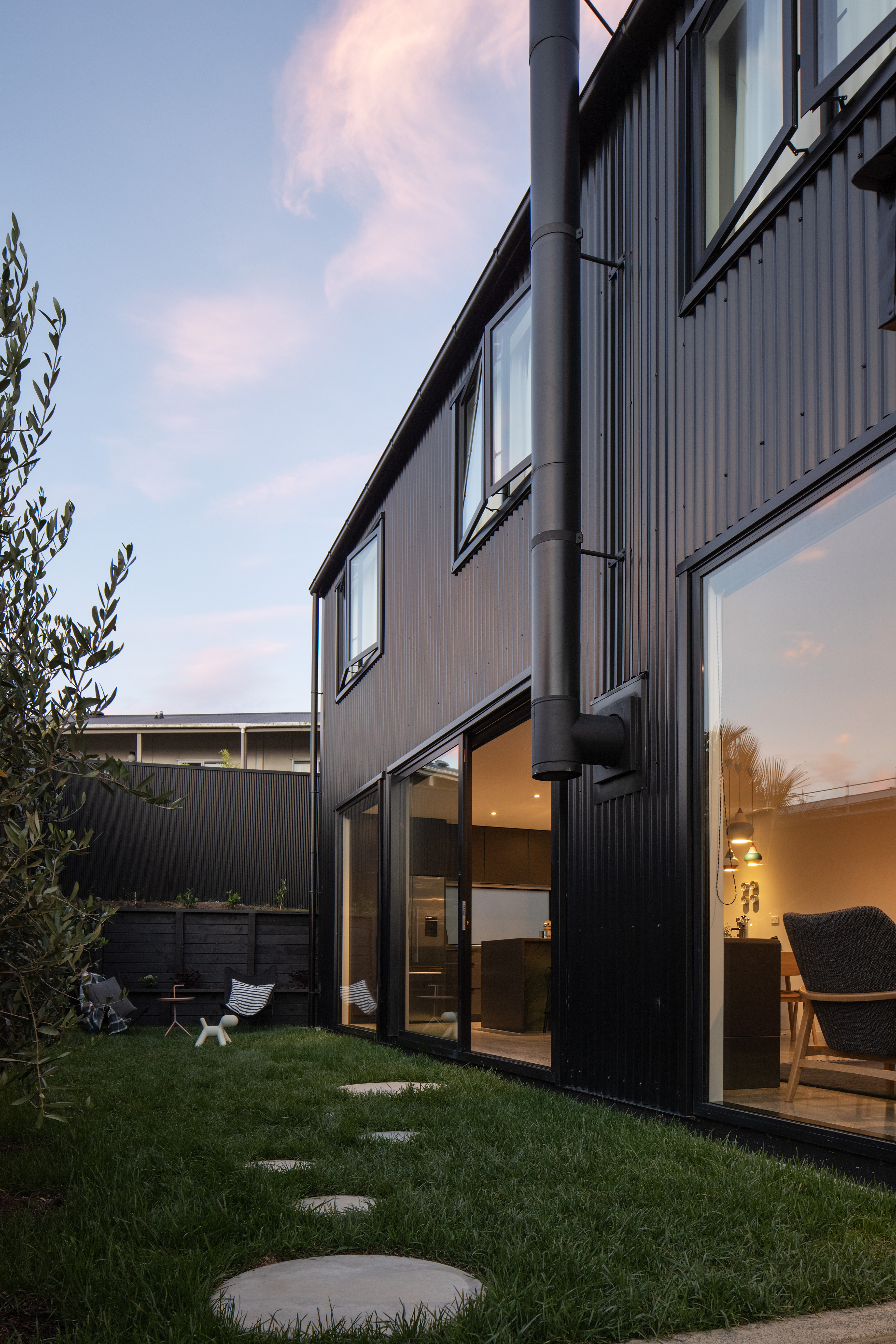 A small rear site up a slope with shared access, an unusual outlook, a busy and ugly road below and a very tight budget: you take what you can get if you want to build a home close to town in Auckland. And then you do something utterly delightful with it. Kate Rogan’s home for her own family is a simple two-storey box, made glamorous by its cladding of black vertical sheet metal corrugate, and full of surprises within. Even on the limited site, exterior courtyards and play areas enlarge the space and provide flexible options for outdoor life. The stairway and hall upstairs are generously proportioned, making the house feel bigger than it really is. The bathrooms are marvels of space efficiency. There’s an extra room whose use will evolve as the children grow, while the service area to the side is very smartly treated. There’s even room for a scullery with storage. With a pleasing interplay of geometric shapes in the main living/kitchen area and some lovely touches in the fittings and detailing, this is a home that celebrates family life with simple homespun beauty.