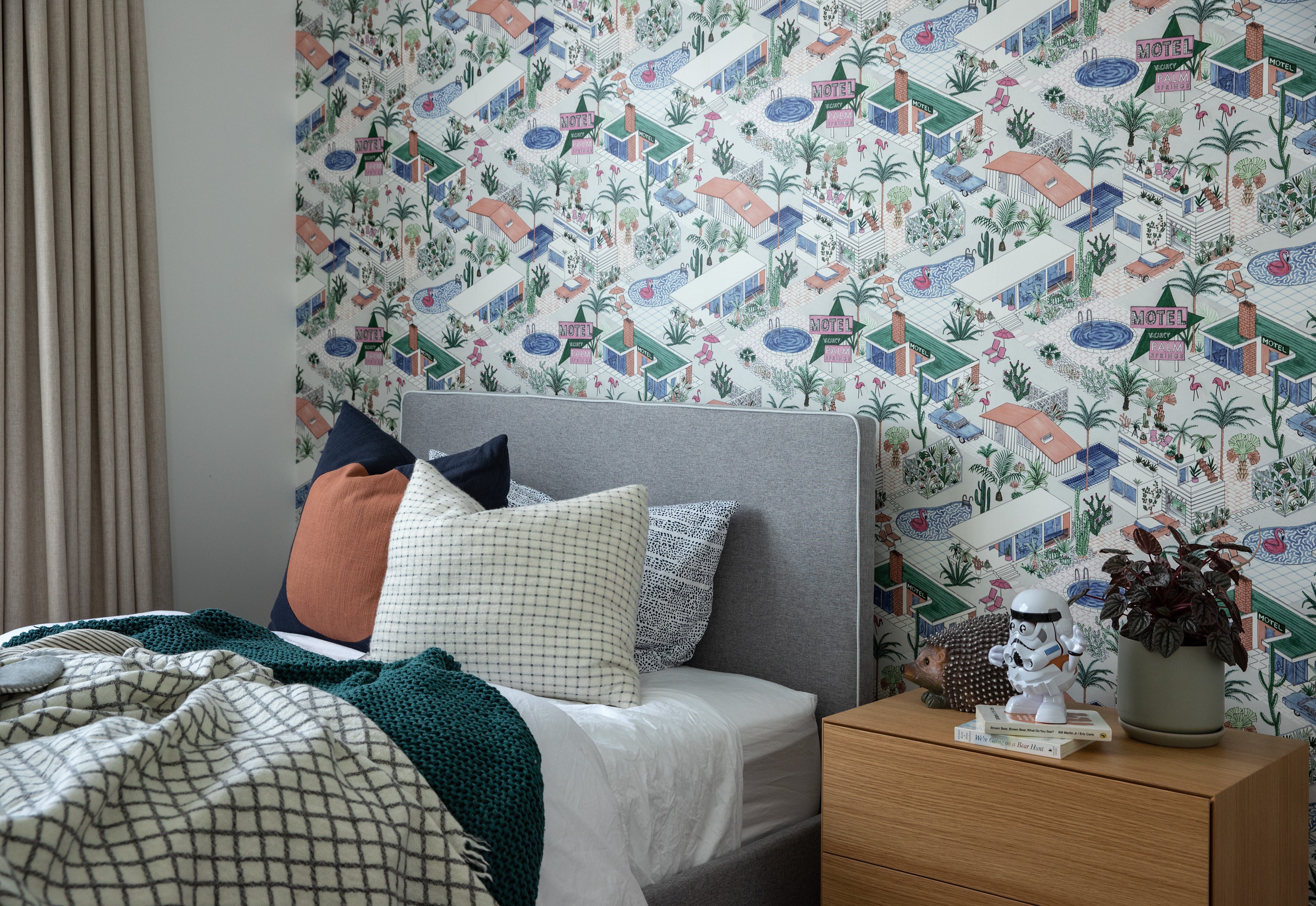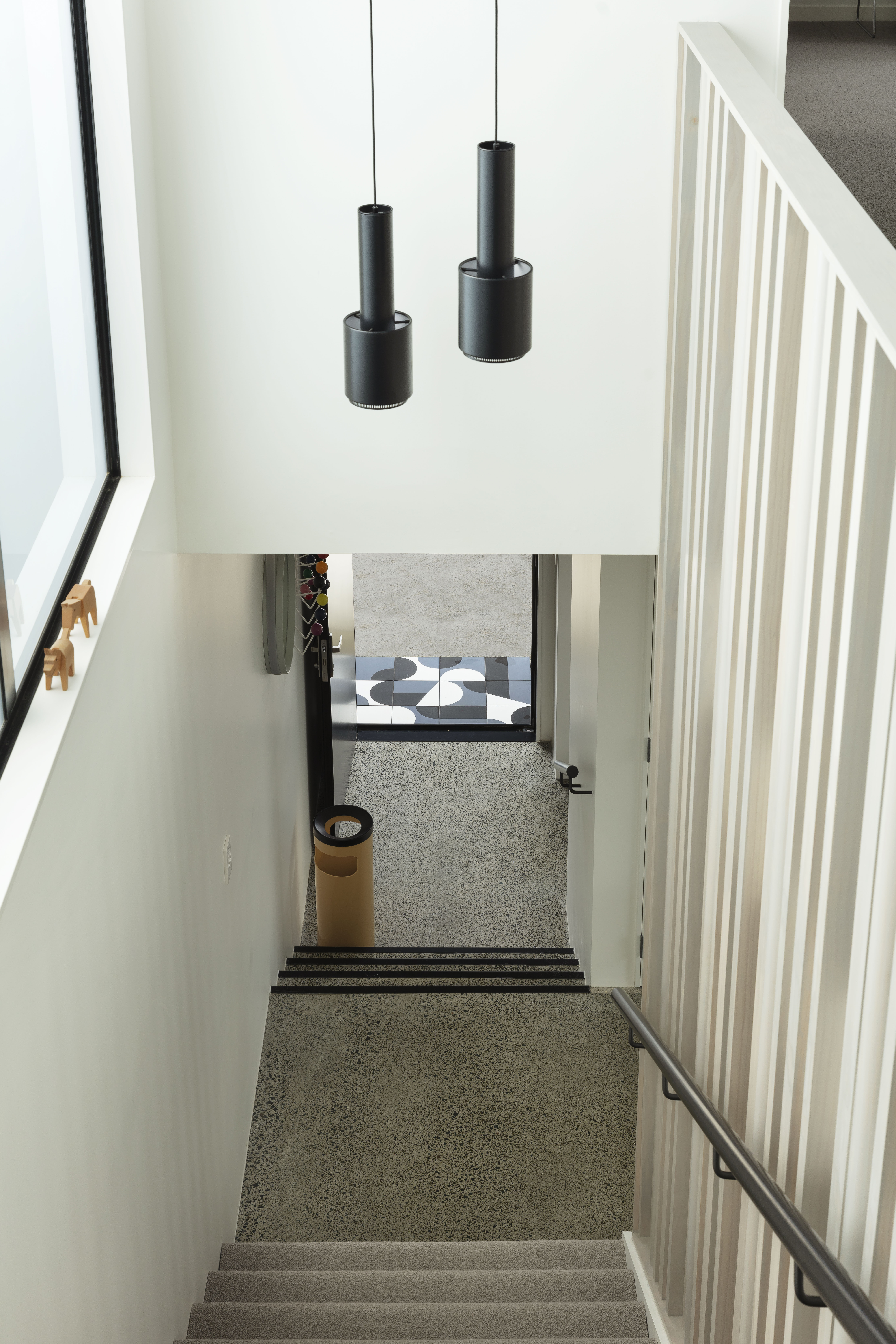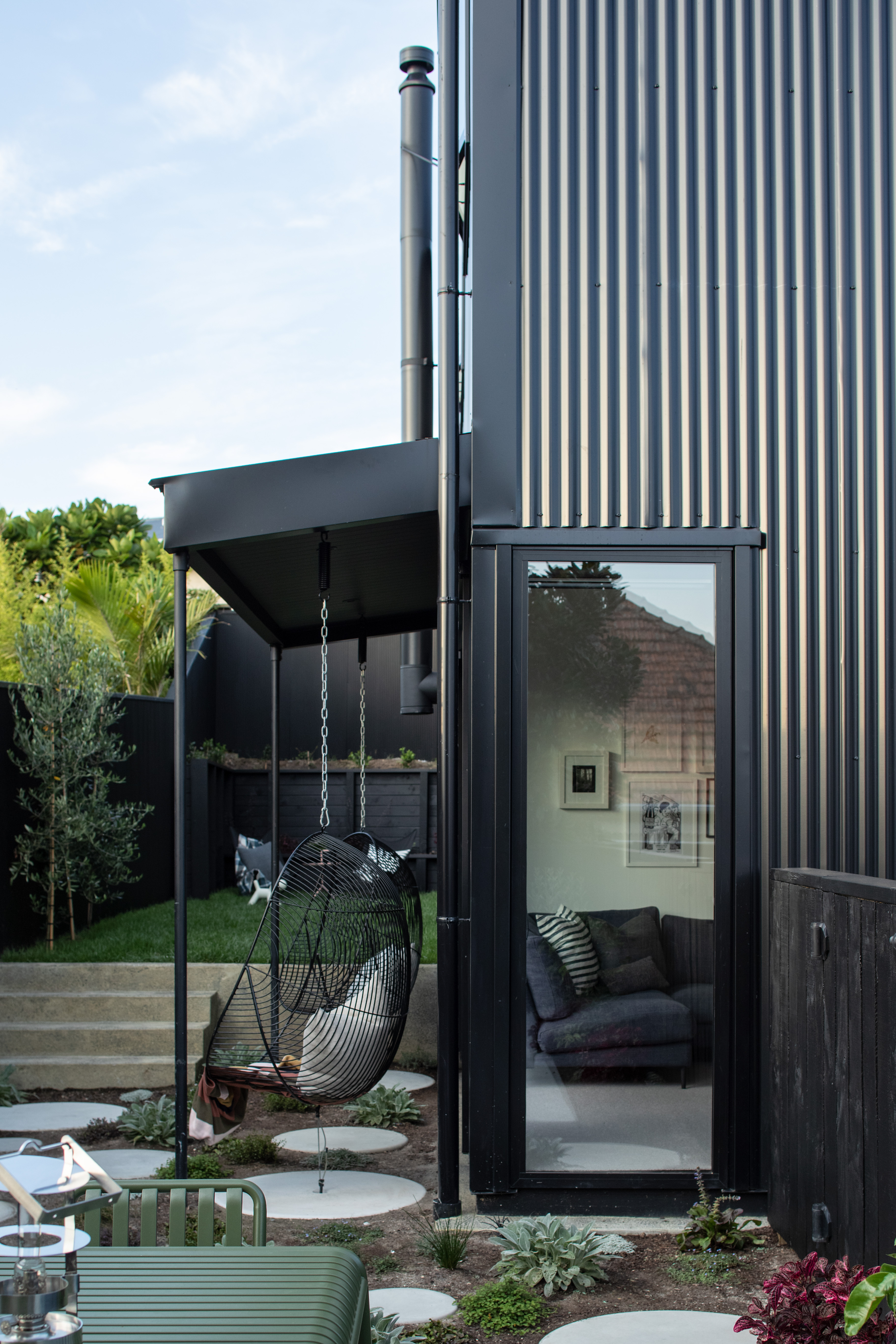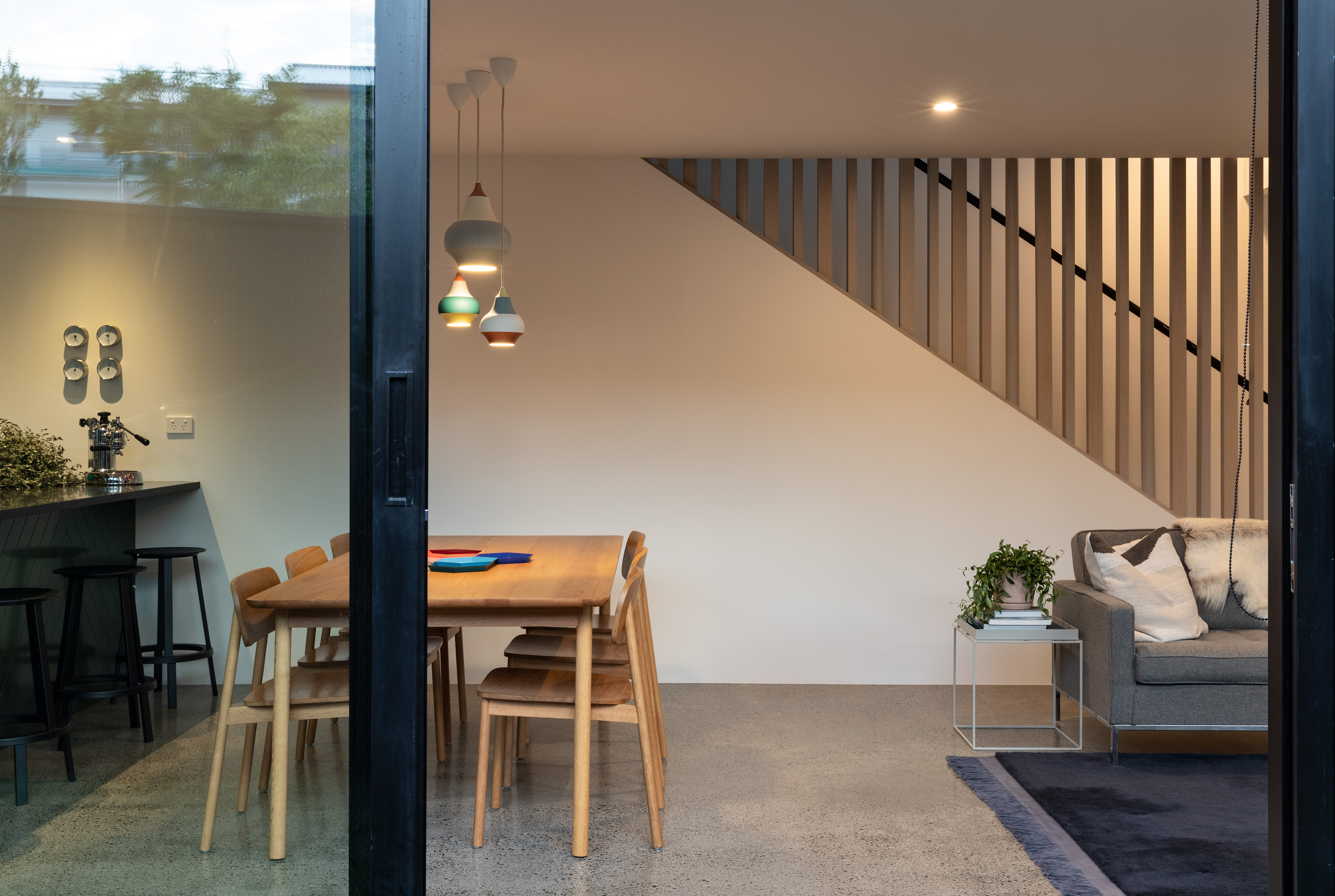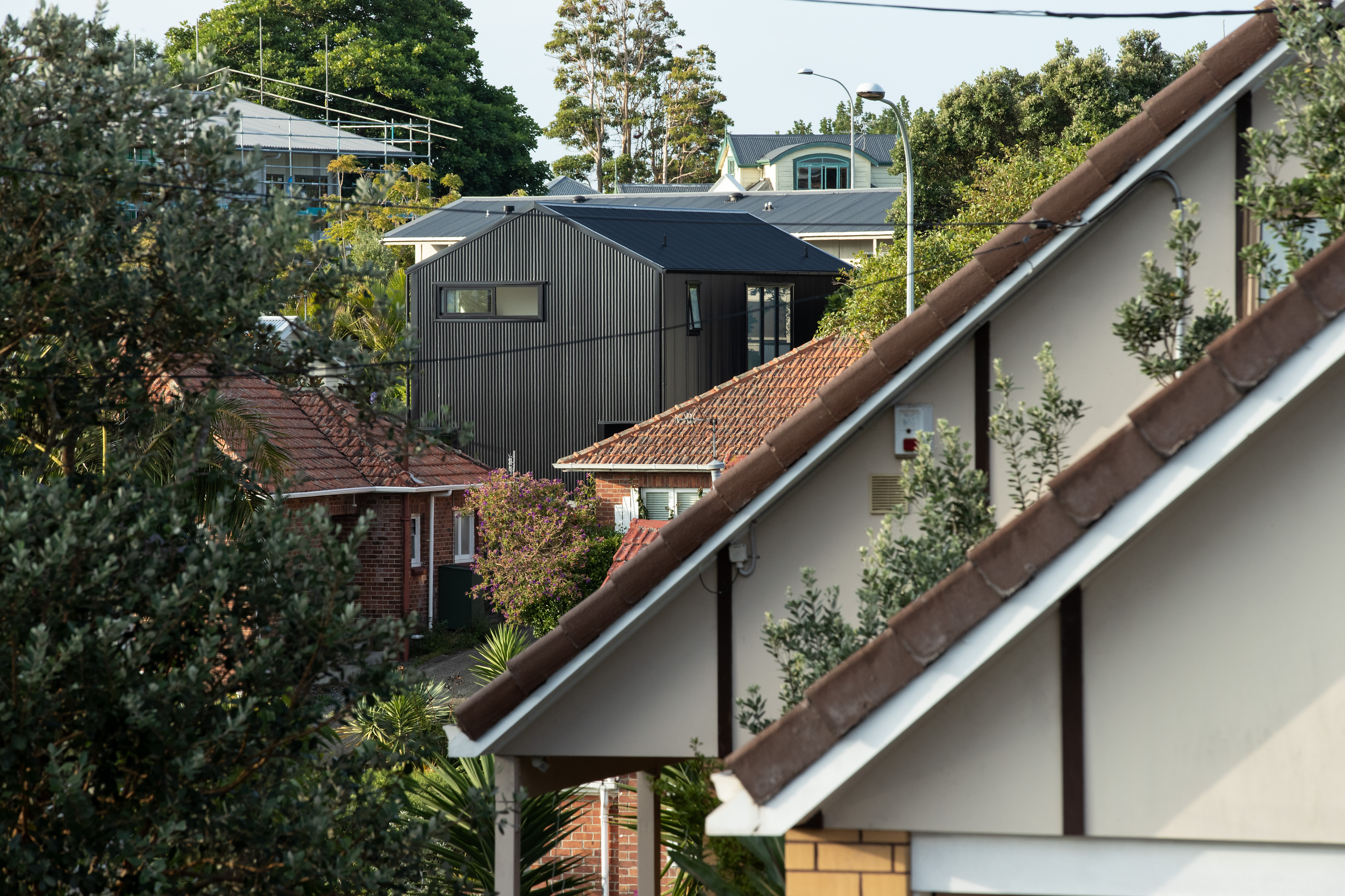 A small rear site up a slope with shared access, an unusual outlook, a busy and ugly road below and a very tight budget: you take what you can get if you want to build a home close to town in Auckland. And then you do something utterly delightful with it. Kate Rogan’s home for her own family is a simple two-storey box, made glamorous by its cladding of black vertical sheet metal corrugate, and full of surprises within. Even on the limited site, exterior courtyards and play areas enlarge the space and provide flexible options for outdoor life. The stairway and hall upstairs are generously proportioned, making the house feel bigger than it really is. The bathrooms are marvels of space efficiency. There’s an extra room whose use will evolve as the children grow, while the service area to the side is very smartly treated. There’s even room for a scullery with storage. With a pleasing interplay of geometric shapes in the main living/kitchen area and some lovely touches in the fittings and detailing, this is a home that celebrates family life with simple homespun beauty.
