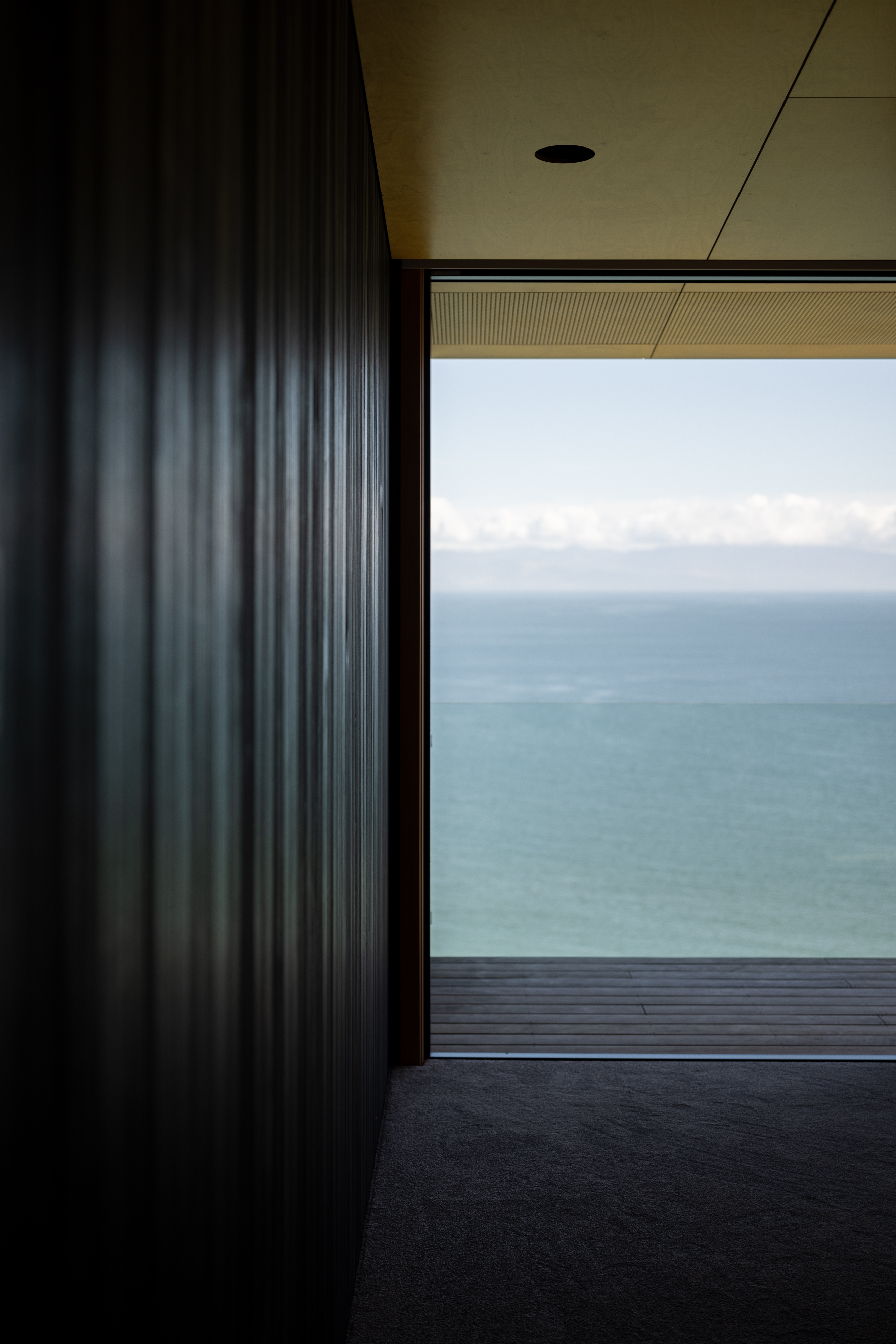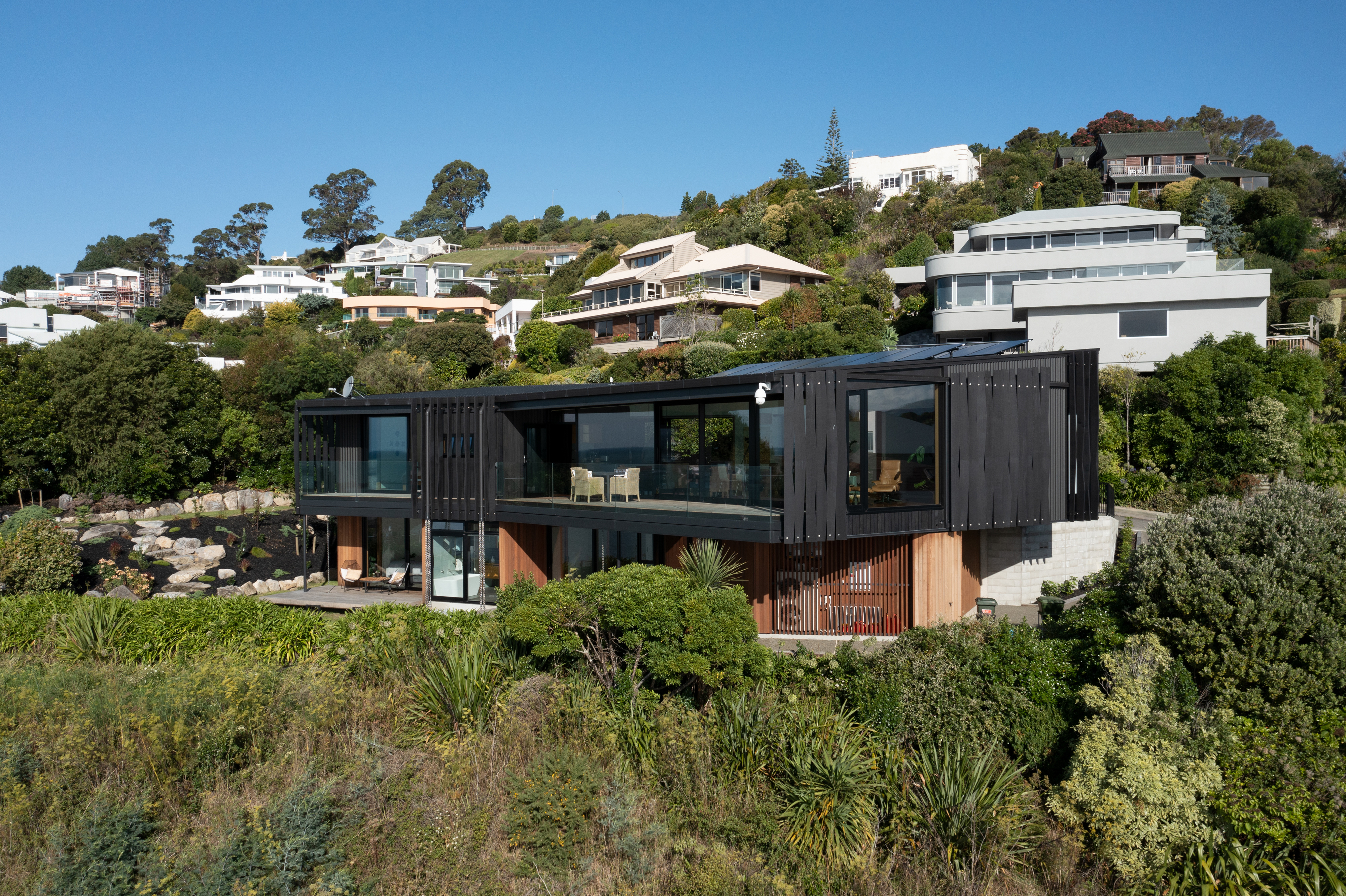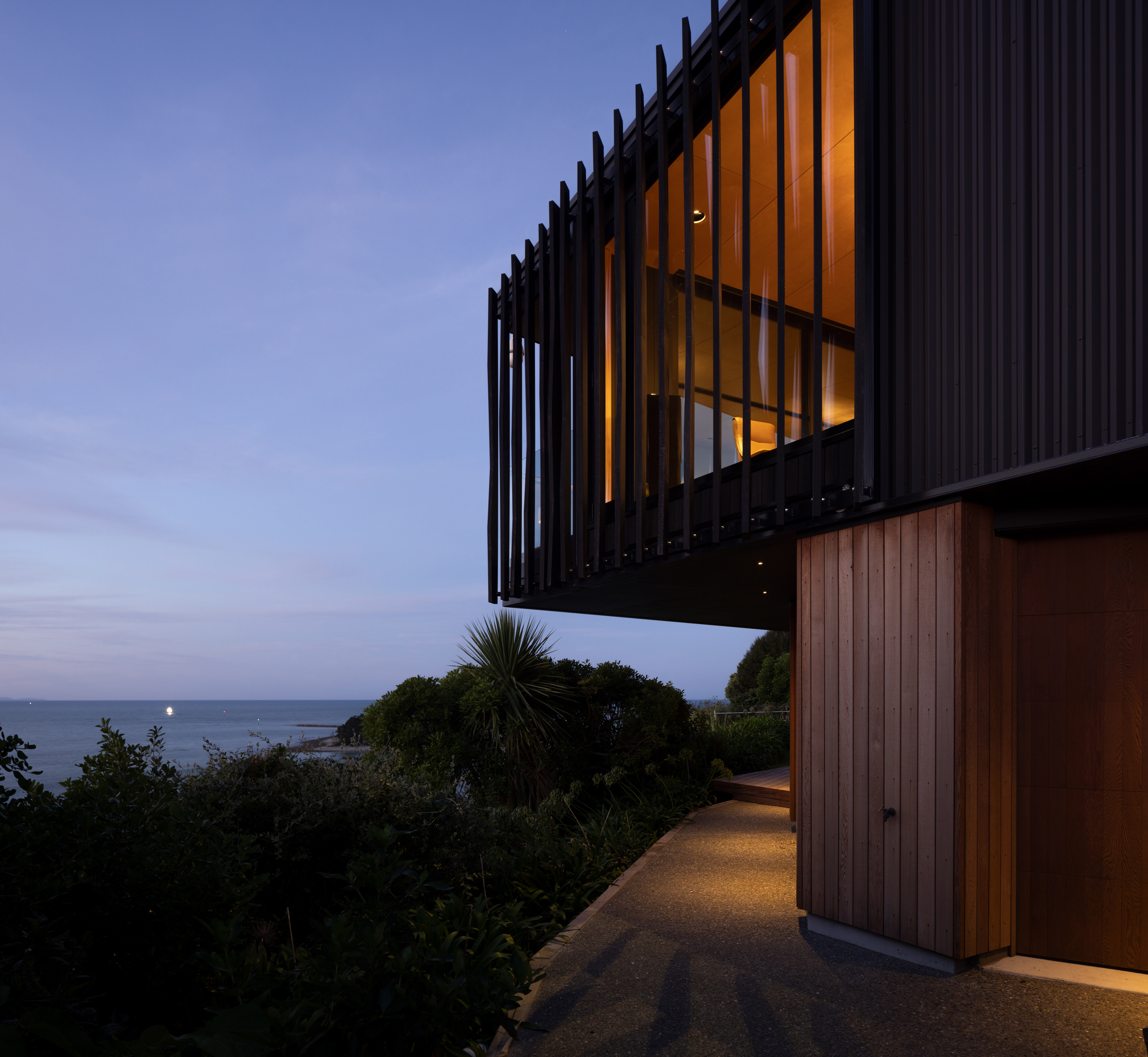 Set on a dramatic cliff top site in Nelson, the house takes in uninterrupted views across Tasman Bay/Te Tai-o-Aorere. On entering, the living space opens and seems to project out over the sea and rocks below. A bend in axis varies the view focus, with the living space and deck arrowing toward Tahunanui Beach. The combination of aesthetic and technical performance is very well balanced. Sun and sea glare are cleverly conditioned by external sliding screens and overhangs, while the rear deck and garden offer a sheltered contrast to prevailing winds and open sea views. Great care and pride has been taken by the contractor in delivering a house of outstanding craftsmanship.