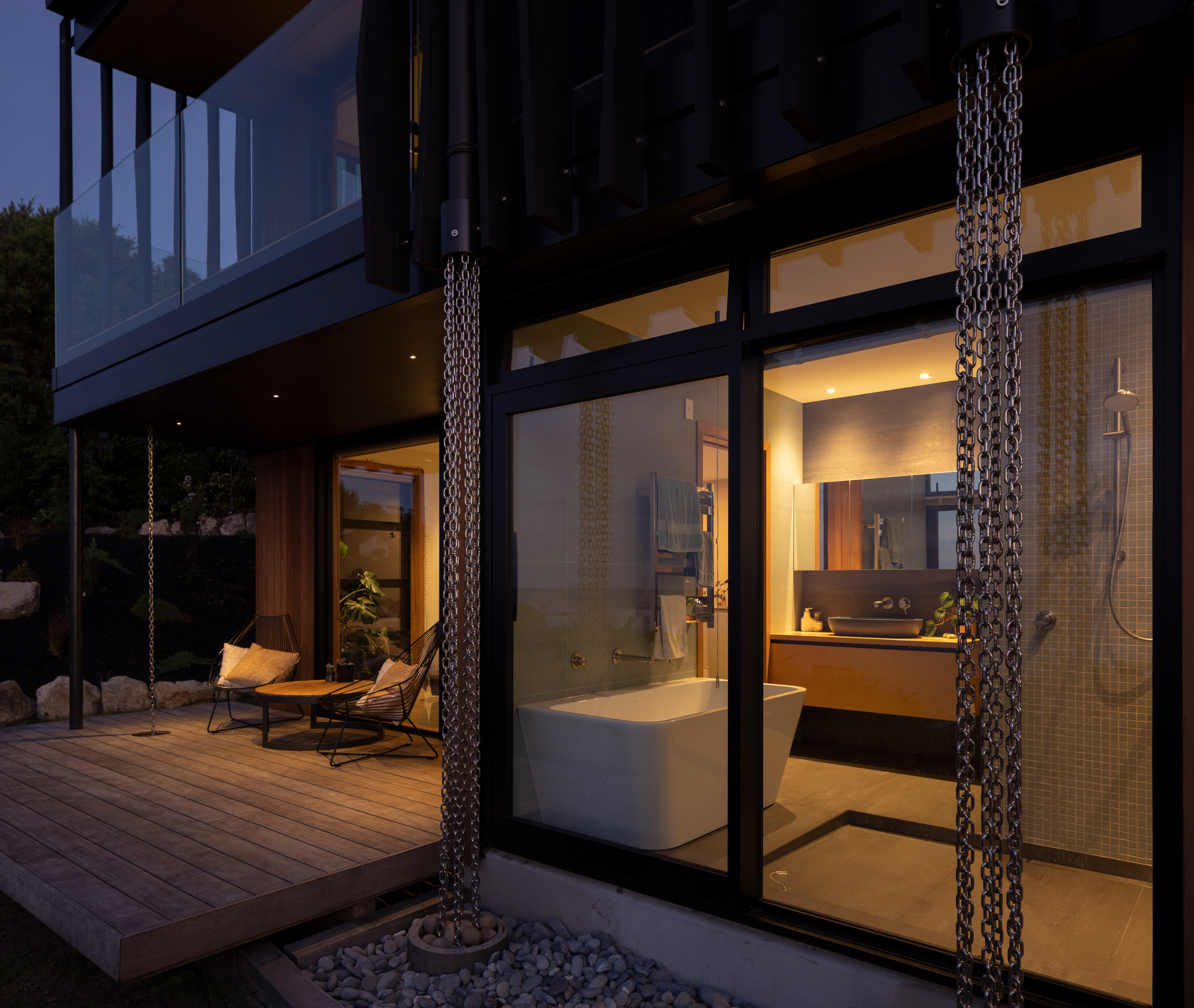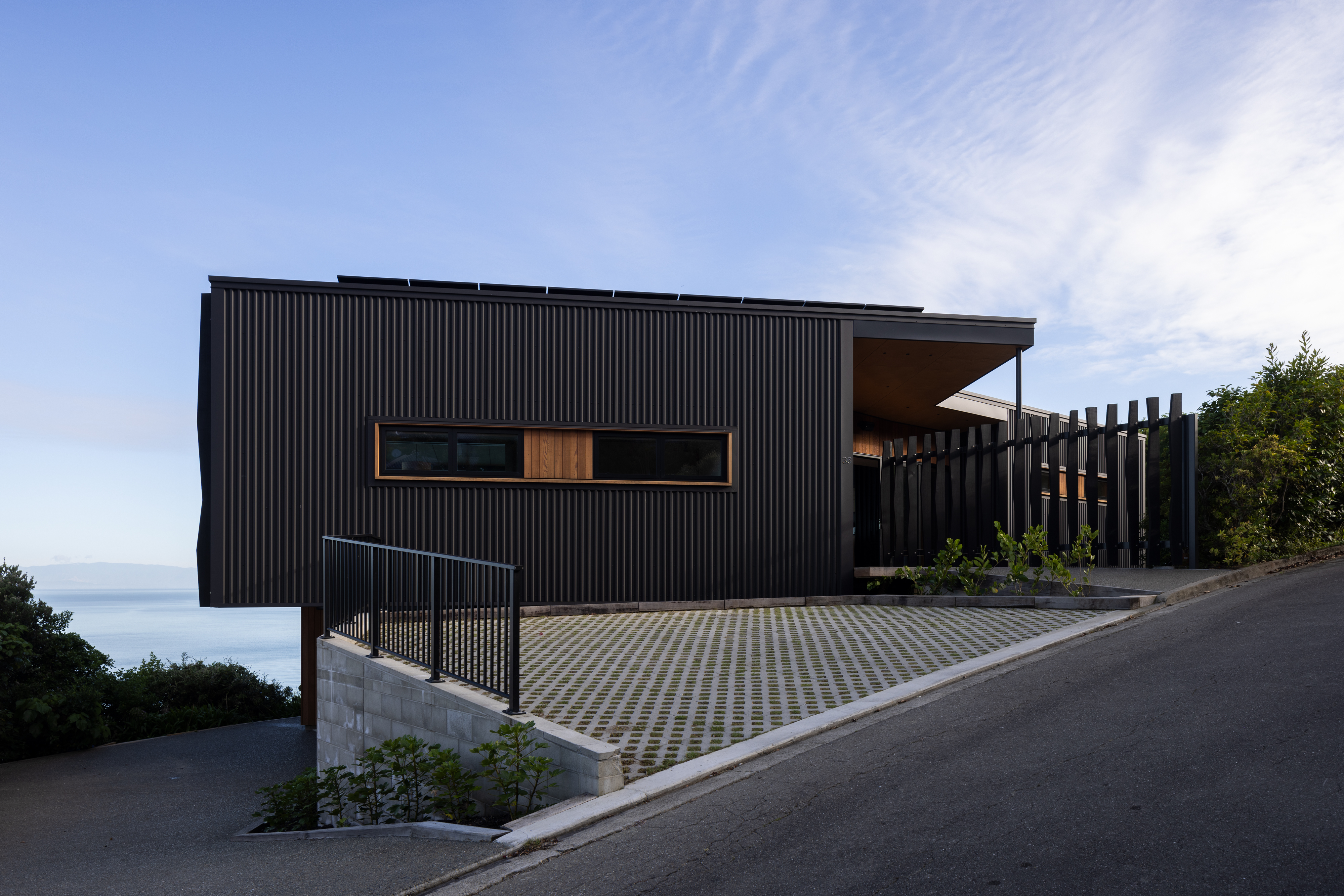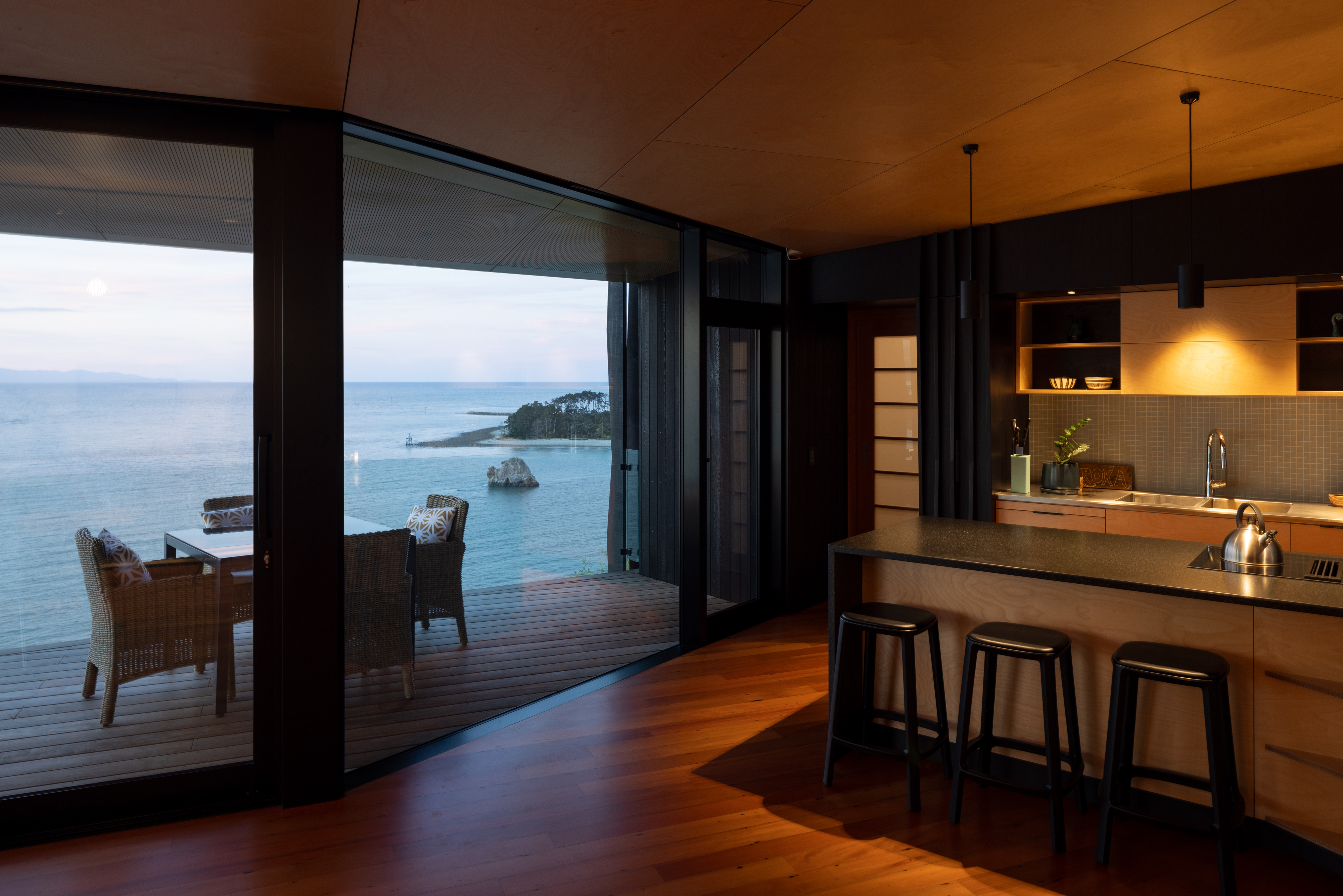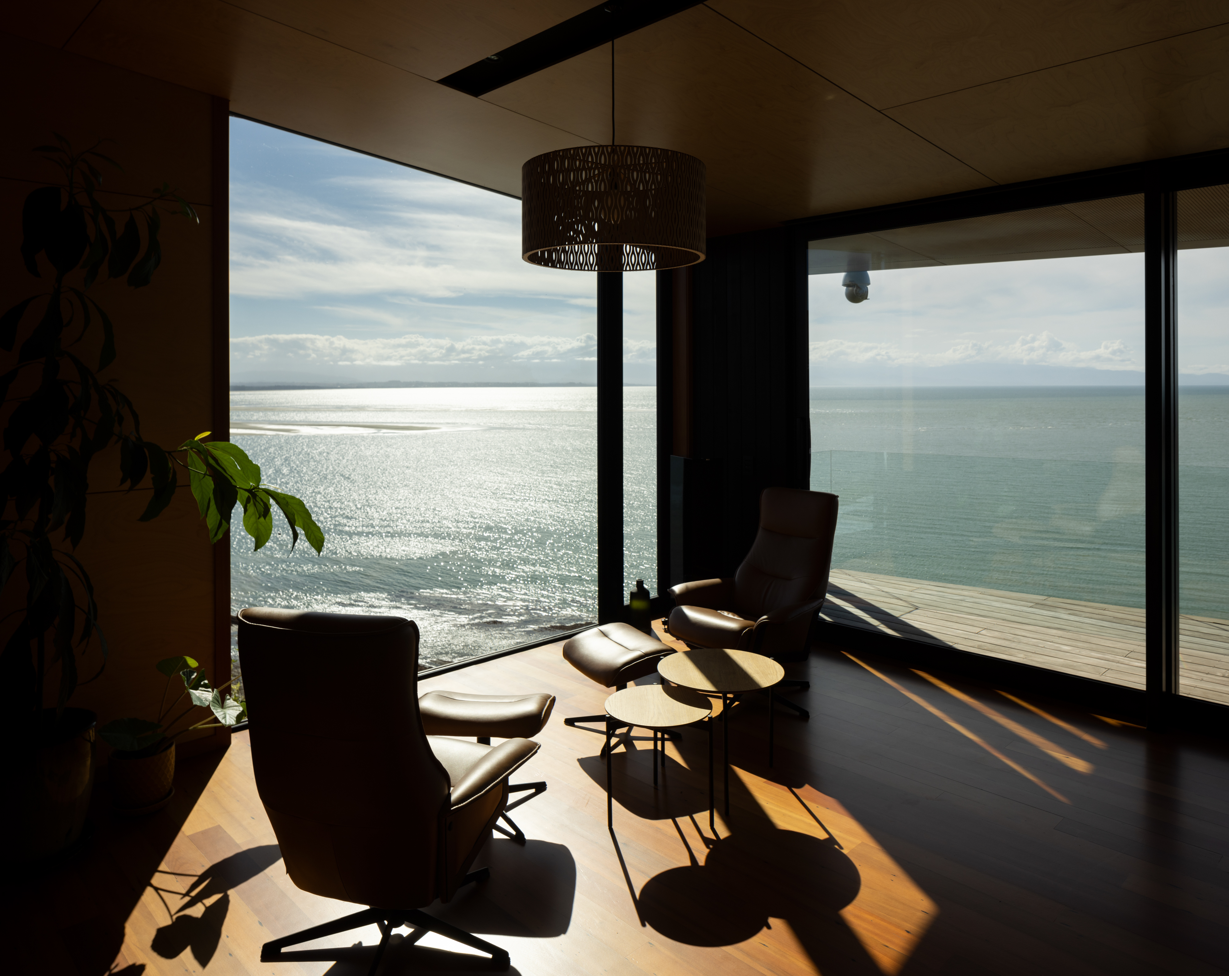 Set on a dramatic cliff top site in Nelson, the house takes in uninterrupted views across Tasman Bay/Te Tai-o-Aorere. On entering, the living space opens and seems to project out over the sea and rocks below. A bend in axis varies the view focus, with the living space and deck arrowing toward Tahunanui Beach. The combination of aesthetic and technical performance is very well balanced. Sun and sea glare are cleverly conditioned by external sliding screens and overhangs, while the rear deck and garden offer a sheltered contrast to prevailing winds and open sea views. Great care and pride has been taken by the contractor in delivering a house of outstanding craftsmanship.
