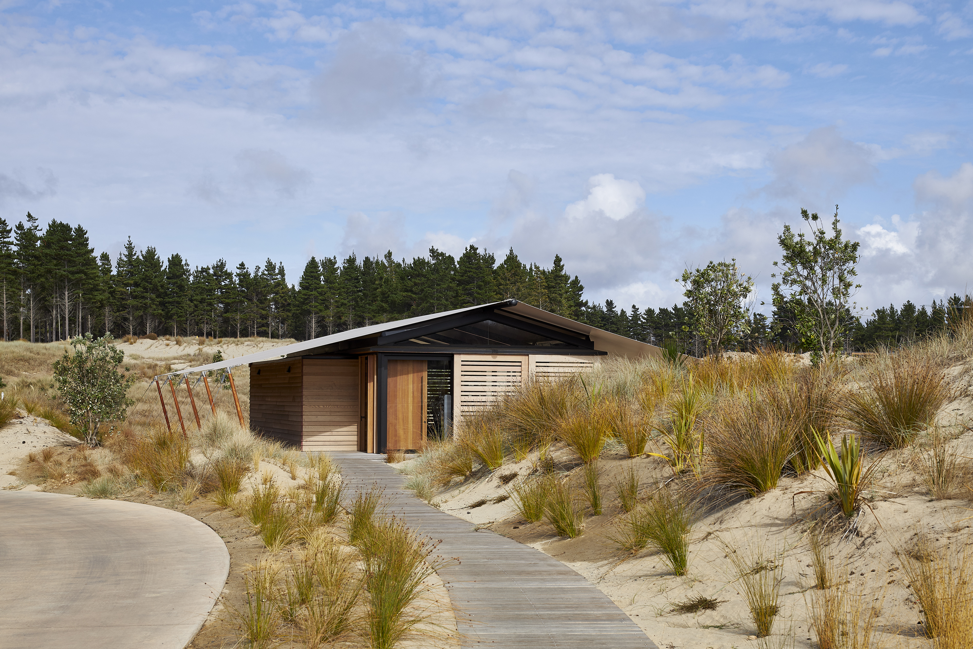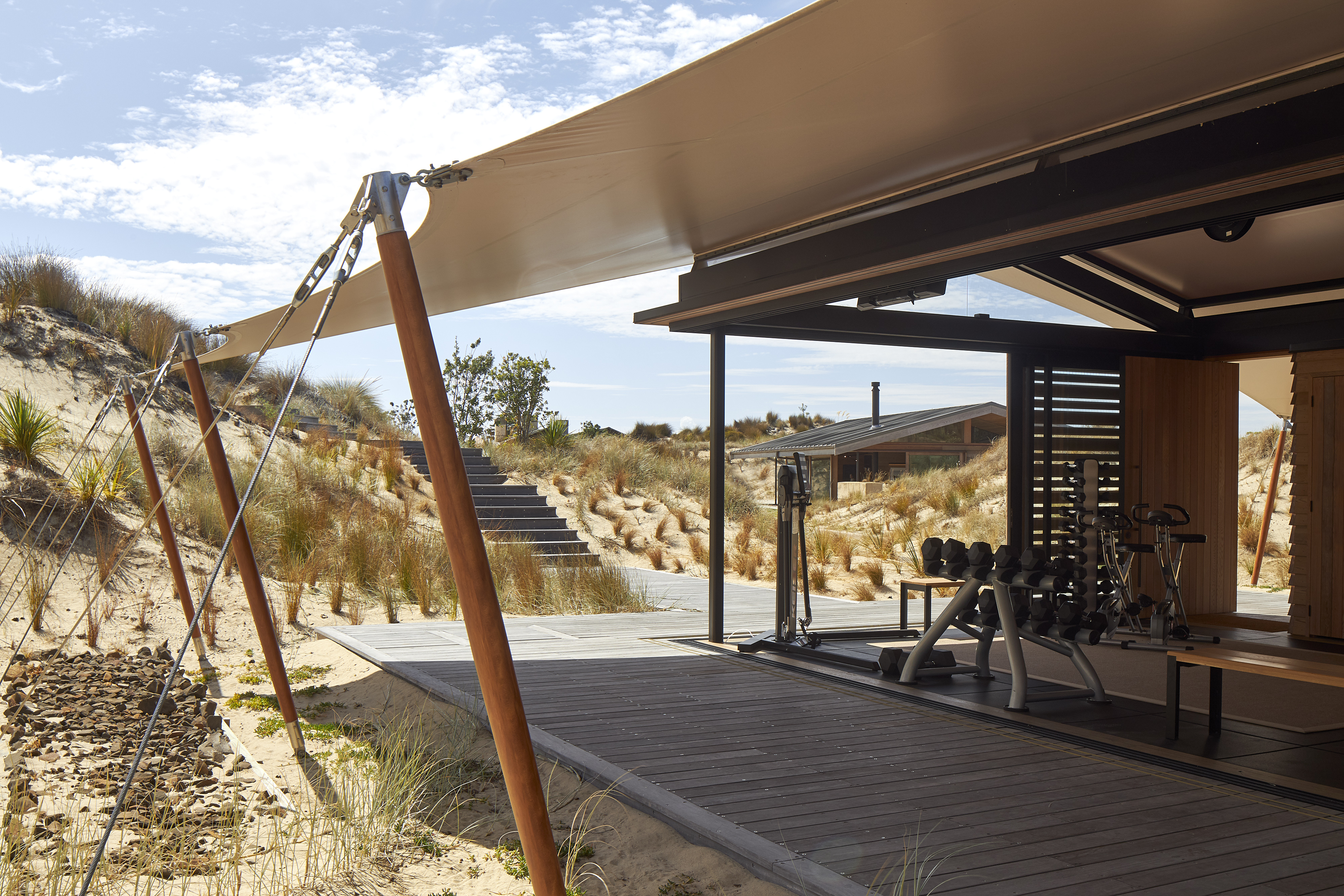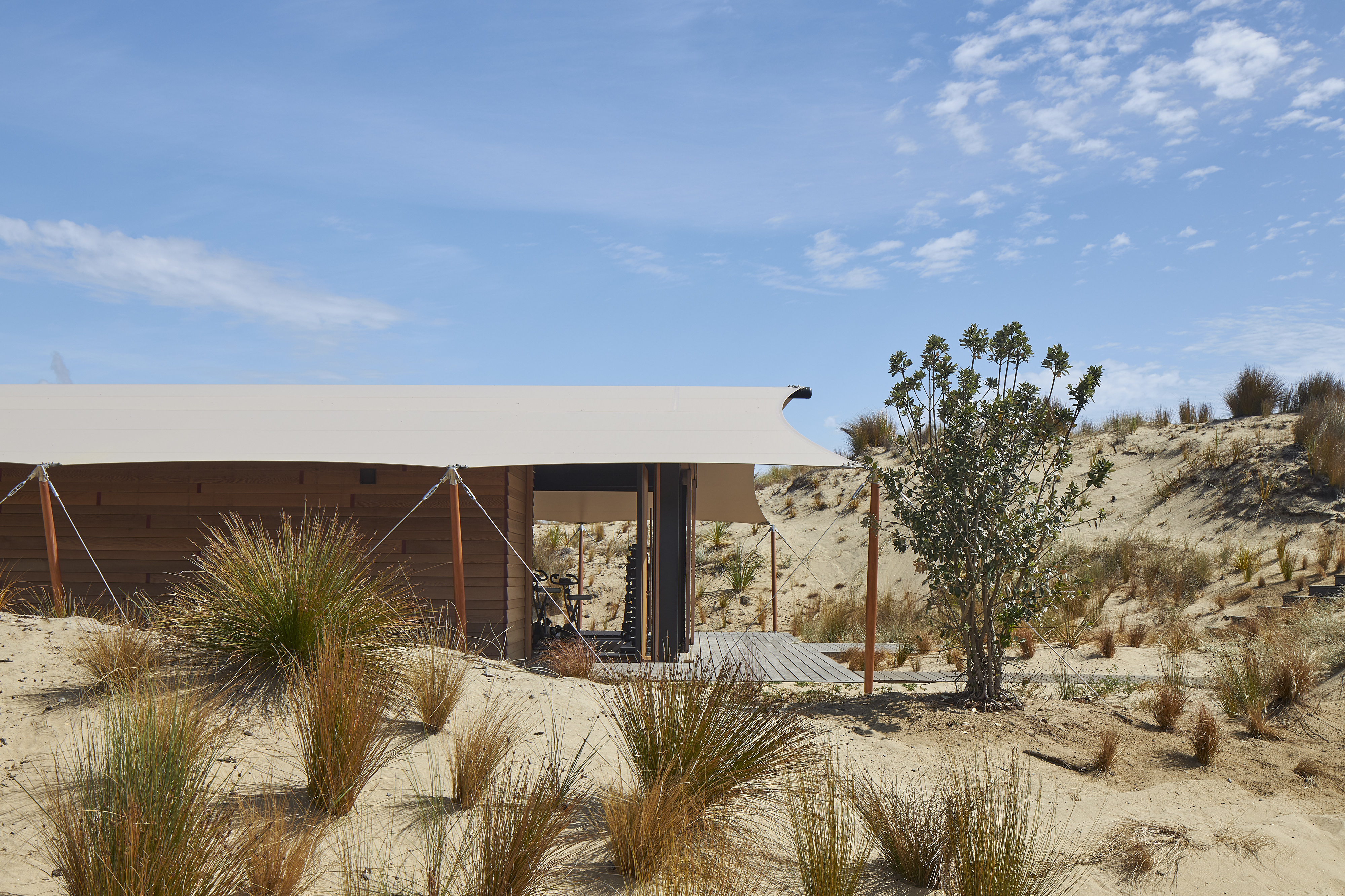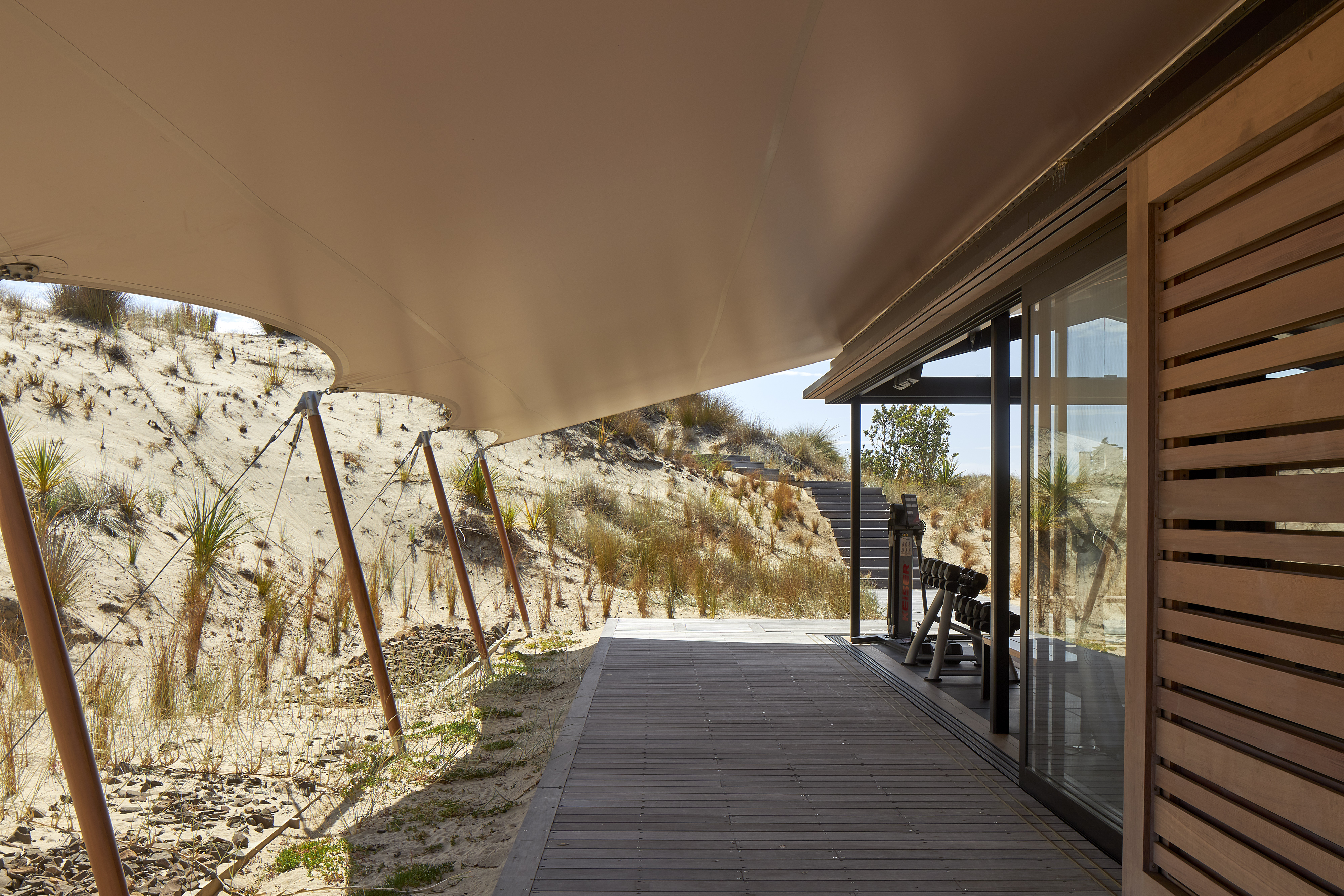 The brief called for a modestly sized Fitness and Wellness Centre tucked into the sand dunes of the Tara Iti Golf Course. Sensitively responding to this landscape, the fitness pavilion assumes the form of a tent, one whose simplicity delightfully nestles into the undulating profile of the dunes. With an innovative, sheltering fabric roof stretched out beyond the glazed weather enclosure, and propped up with jauntily angled kauri posts, the pavilion cleverly merges with its surrounds. The simplicity of the gesture and intent here belies the compliance challenges this small project overcomes. Whimsical and uncompromising, this building inspires no less than it fits its purpose.