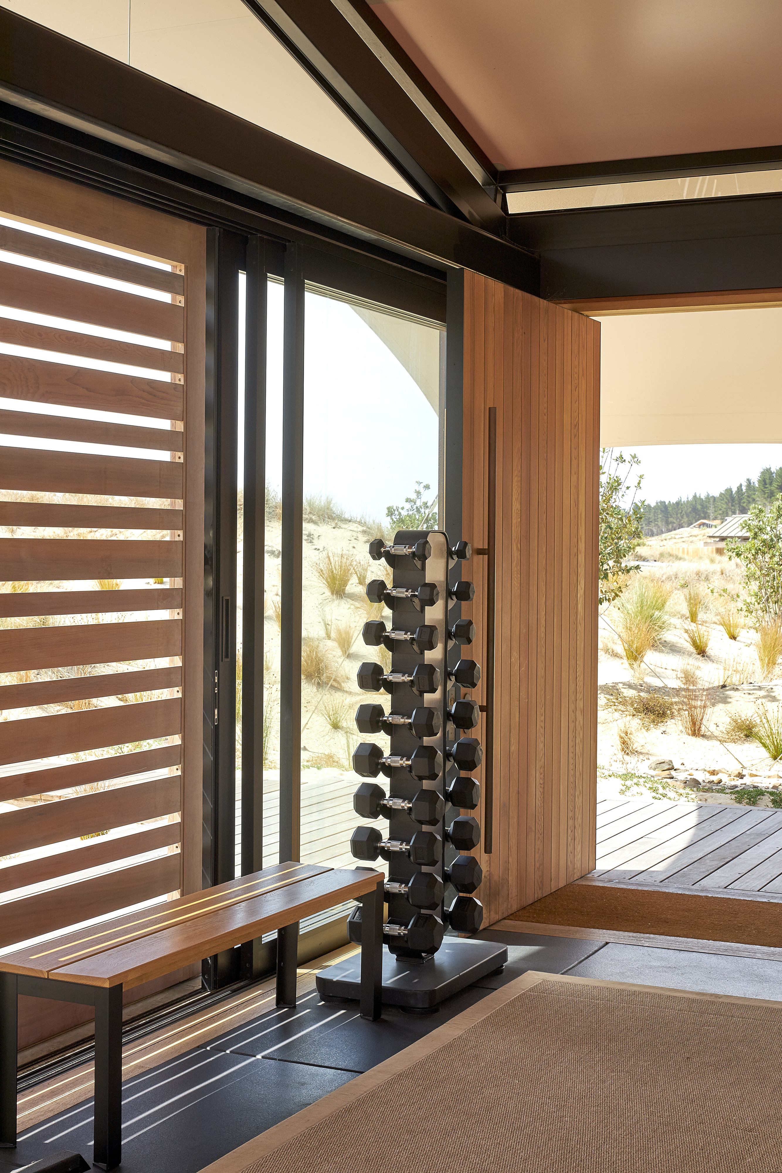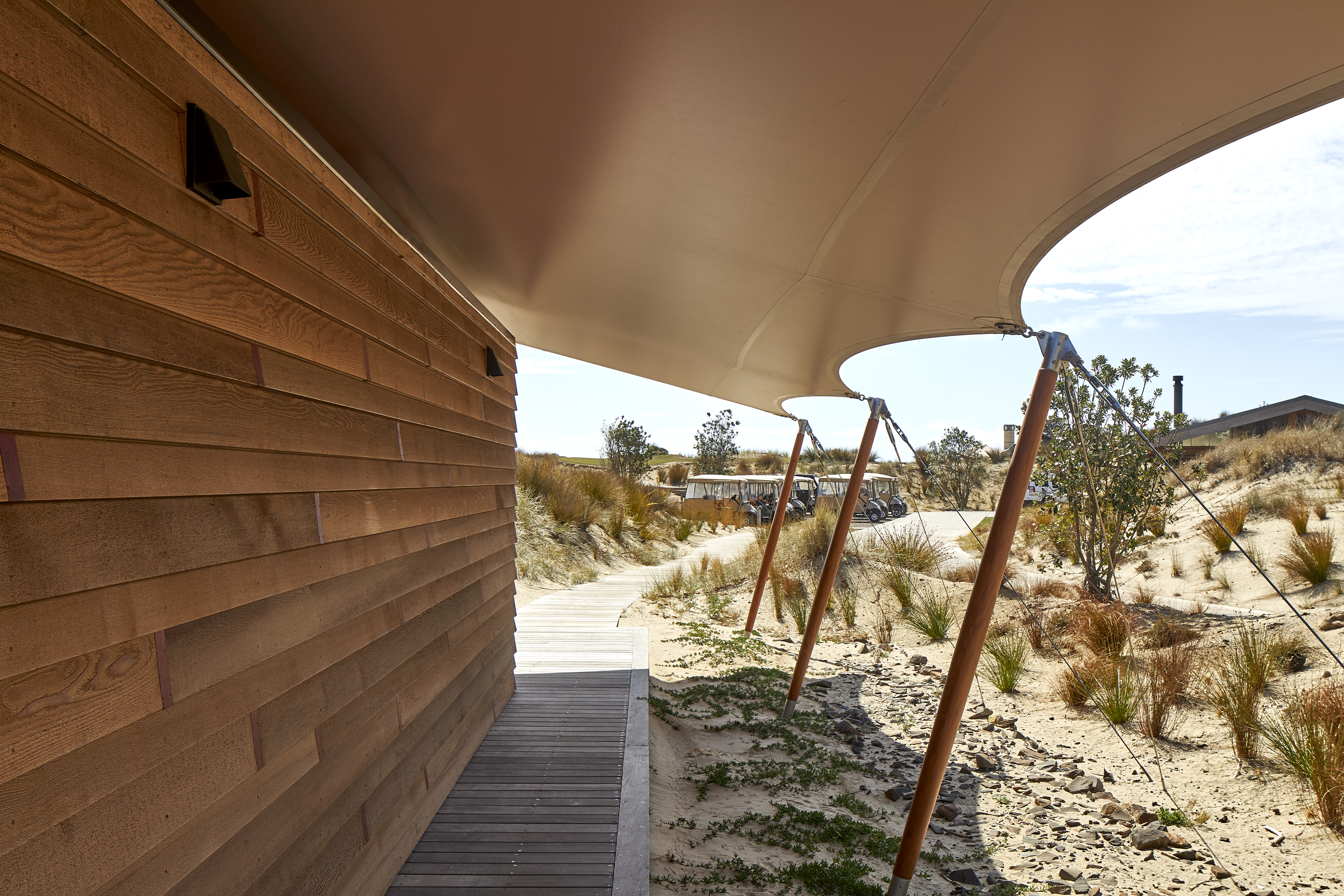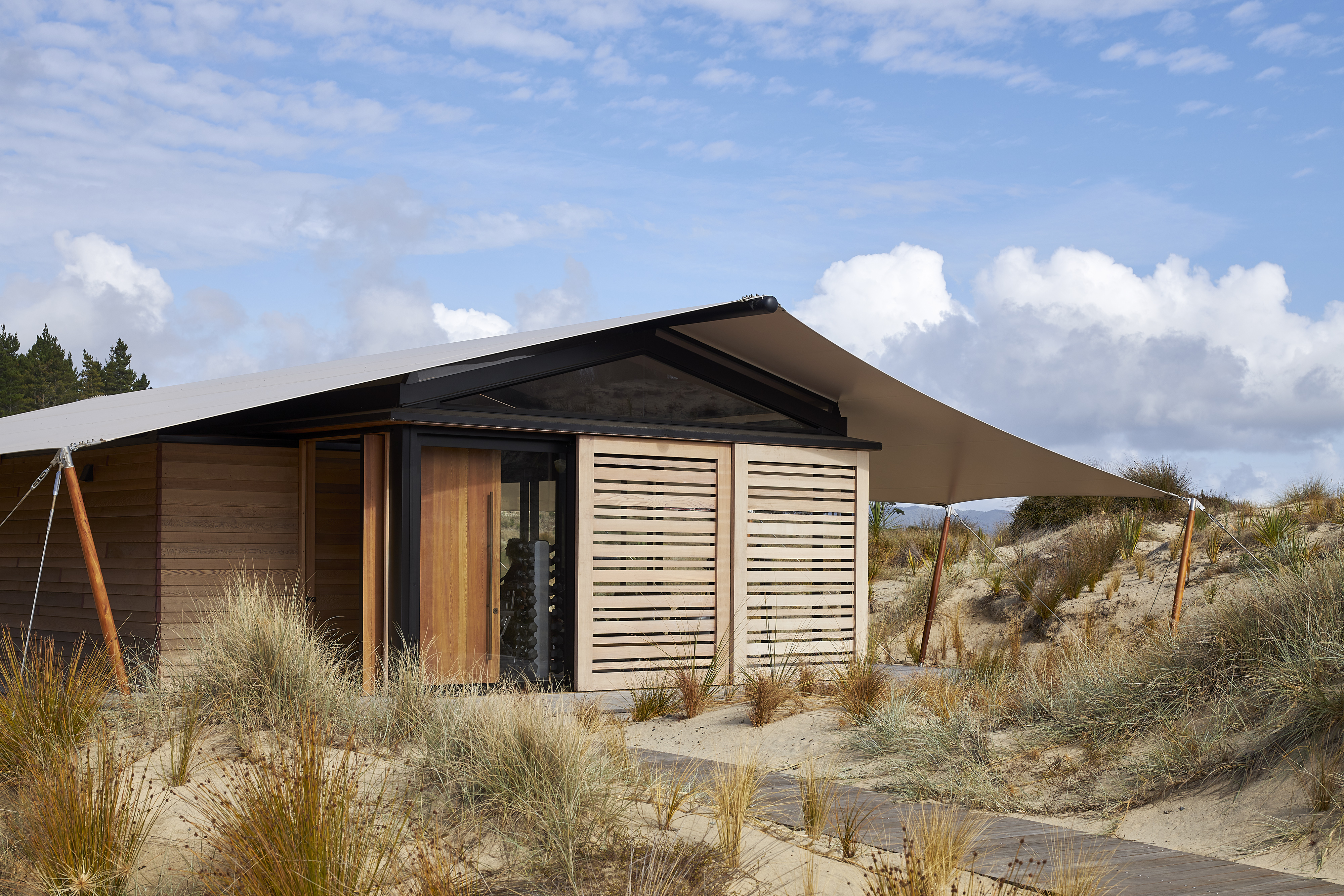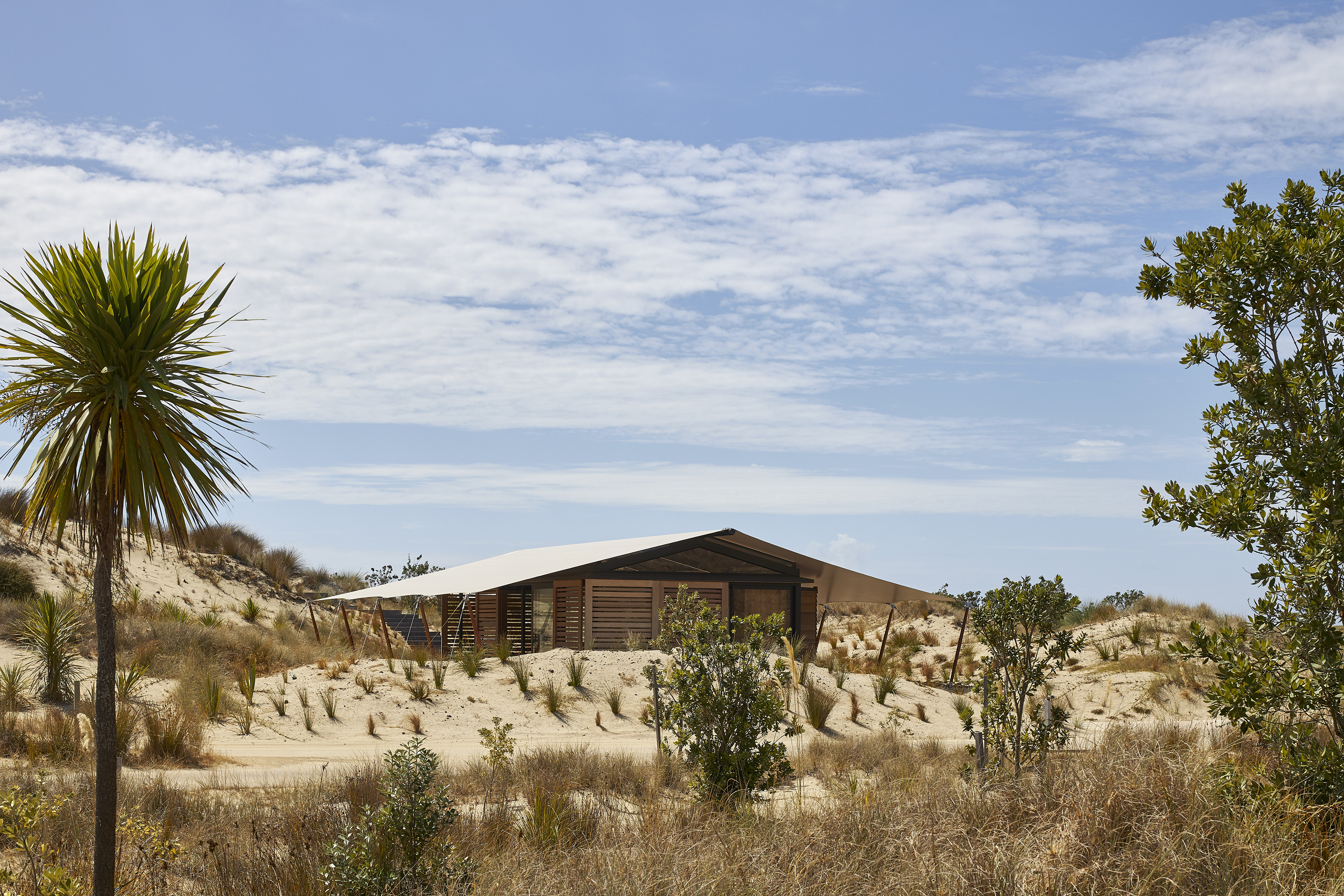 The brief called for a modestly sized Fitness and Wellness Centre tucked into the sand dunes of the Tara Iti Golf Course. Sensitively responding to this landscape, the fitness pavilion assumes the form of a tent, one whose simplicity delightfully nestles into the undulating profile of the dunes. With an innovative, sheltering fabric roof stretched out beyond the glazed weather enclosure, and propped up with jauntily angled kauri posts, the pavilion cleverly merges with its surrounds. The simplicity of the gesture and intent here belies the compliance challenges this small project overcomes. Whimsical and uncompromising, this building inspires no less than it fits its purpose.