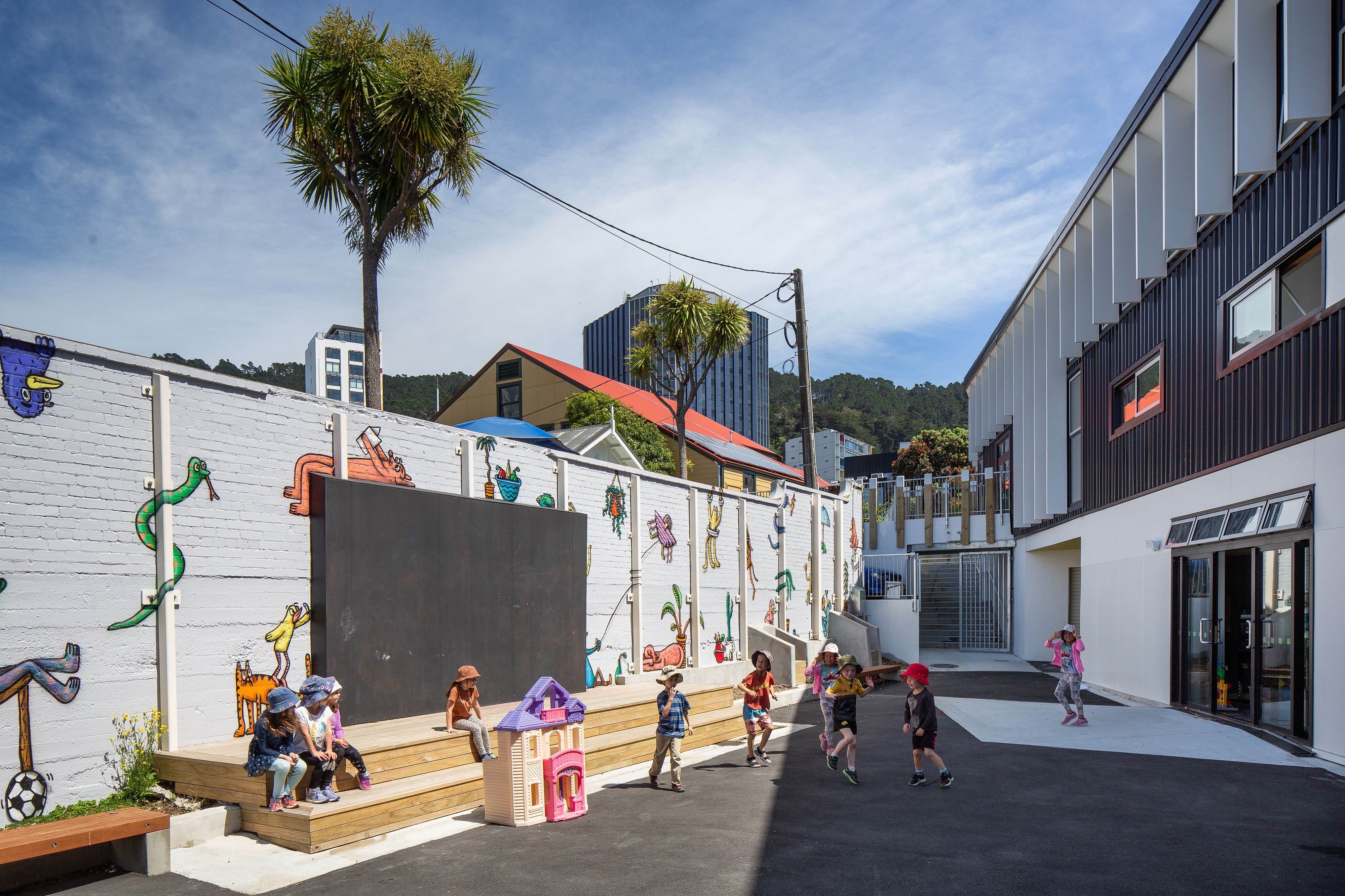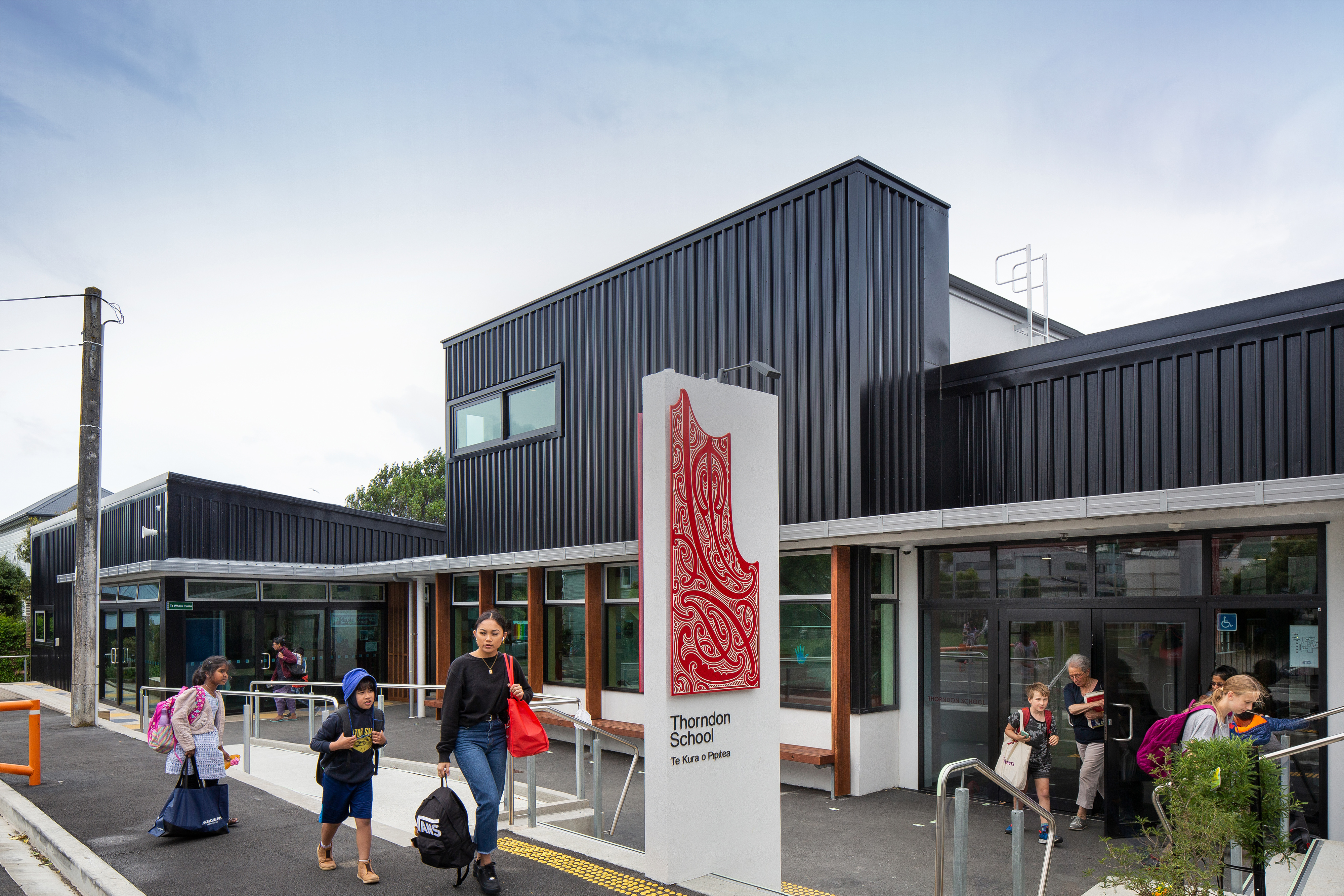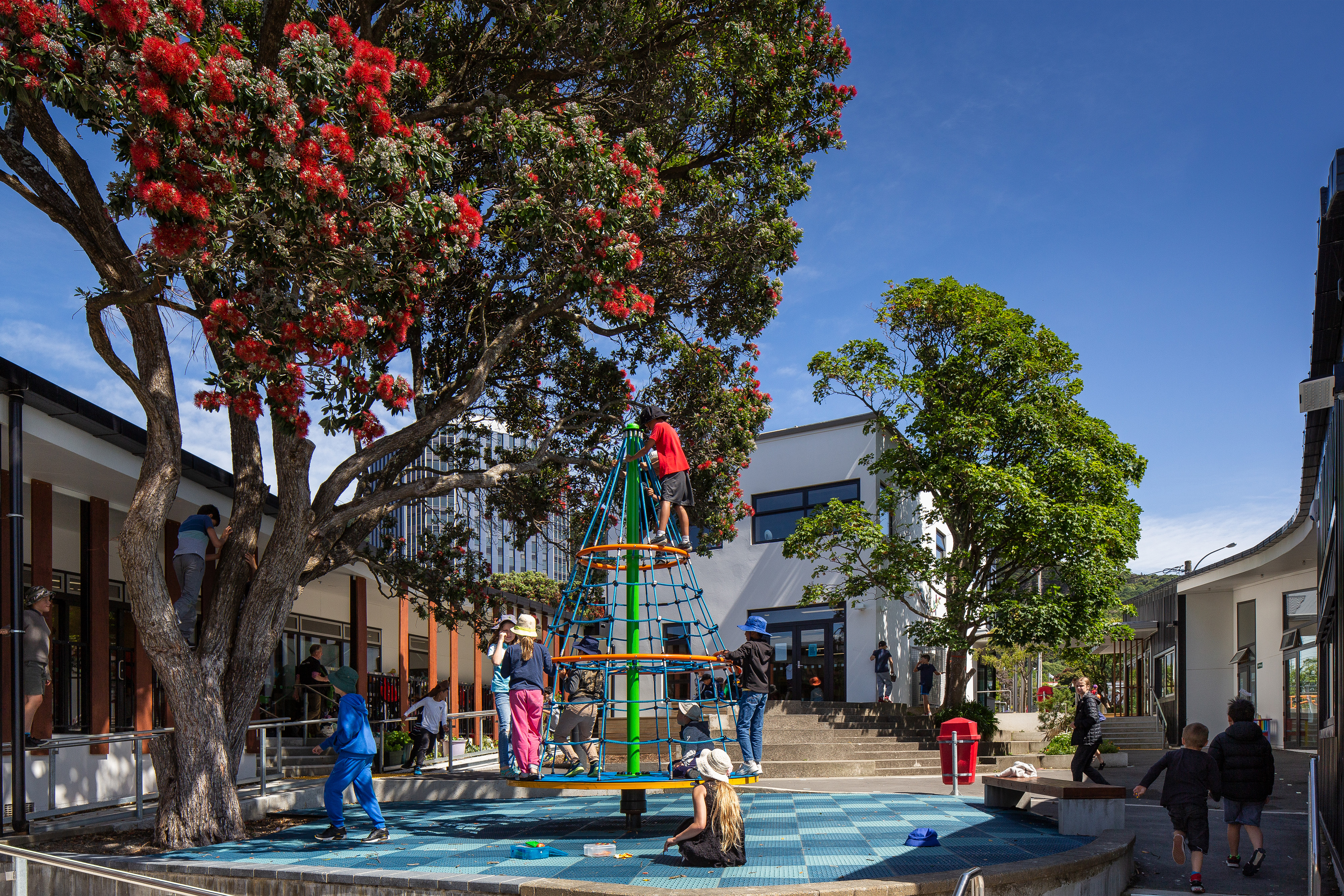 Thorndon School skillfully gleans every bit of space from an irregular and tight urban site. Stepping down from the main entry, the courtyard gathers the buildings, students, and teachers into a connected learning village. Flexible and interactive forms of modern learning environments spill into the outdoor spaces. The architecture helps create and express a sense of community. The successful engagement with mana whenua and the prioritisation of children’s experiences is evident in the sophisticated exterior and playful interior.