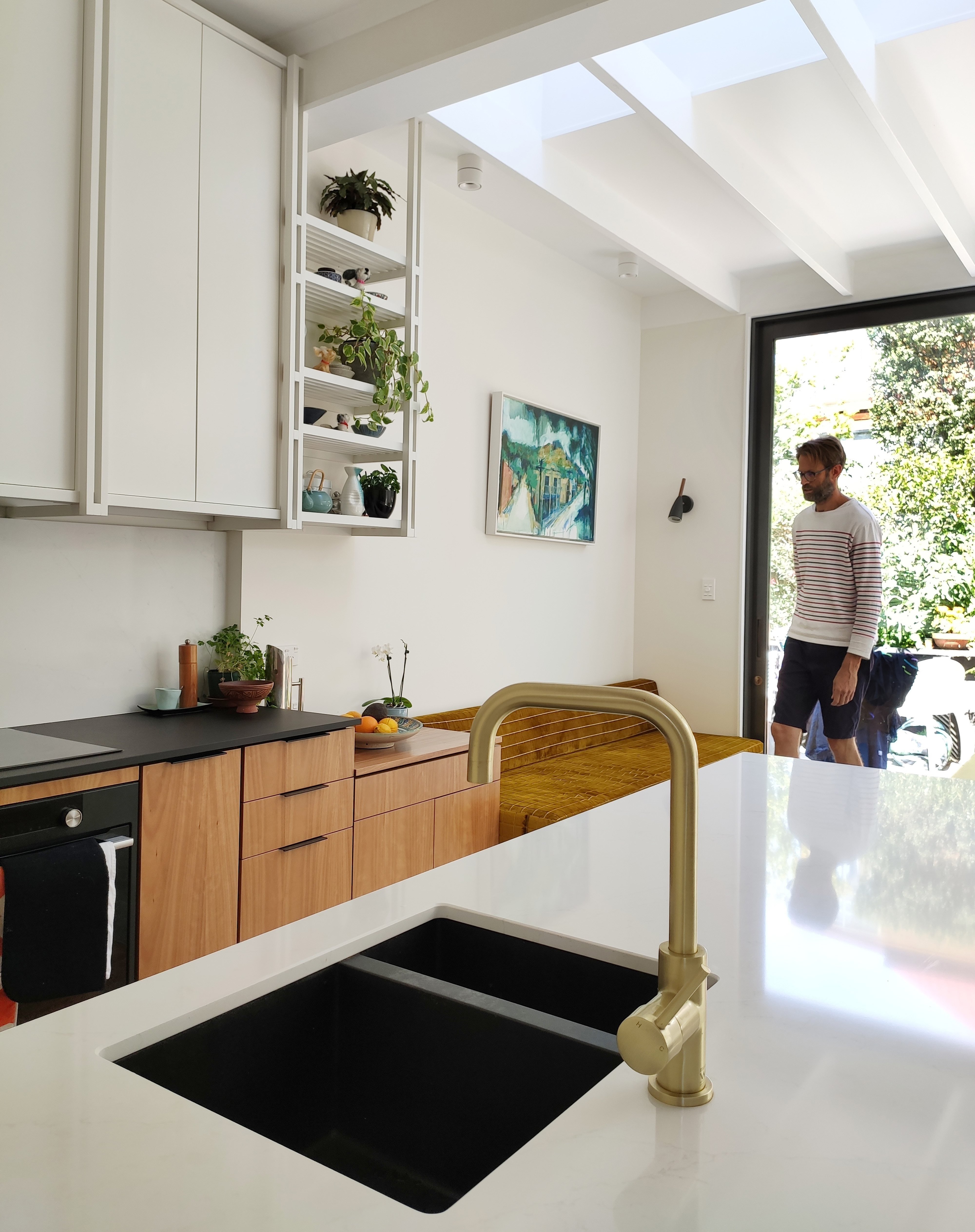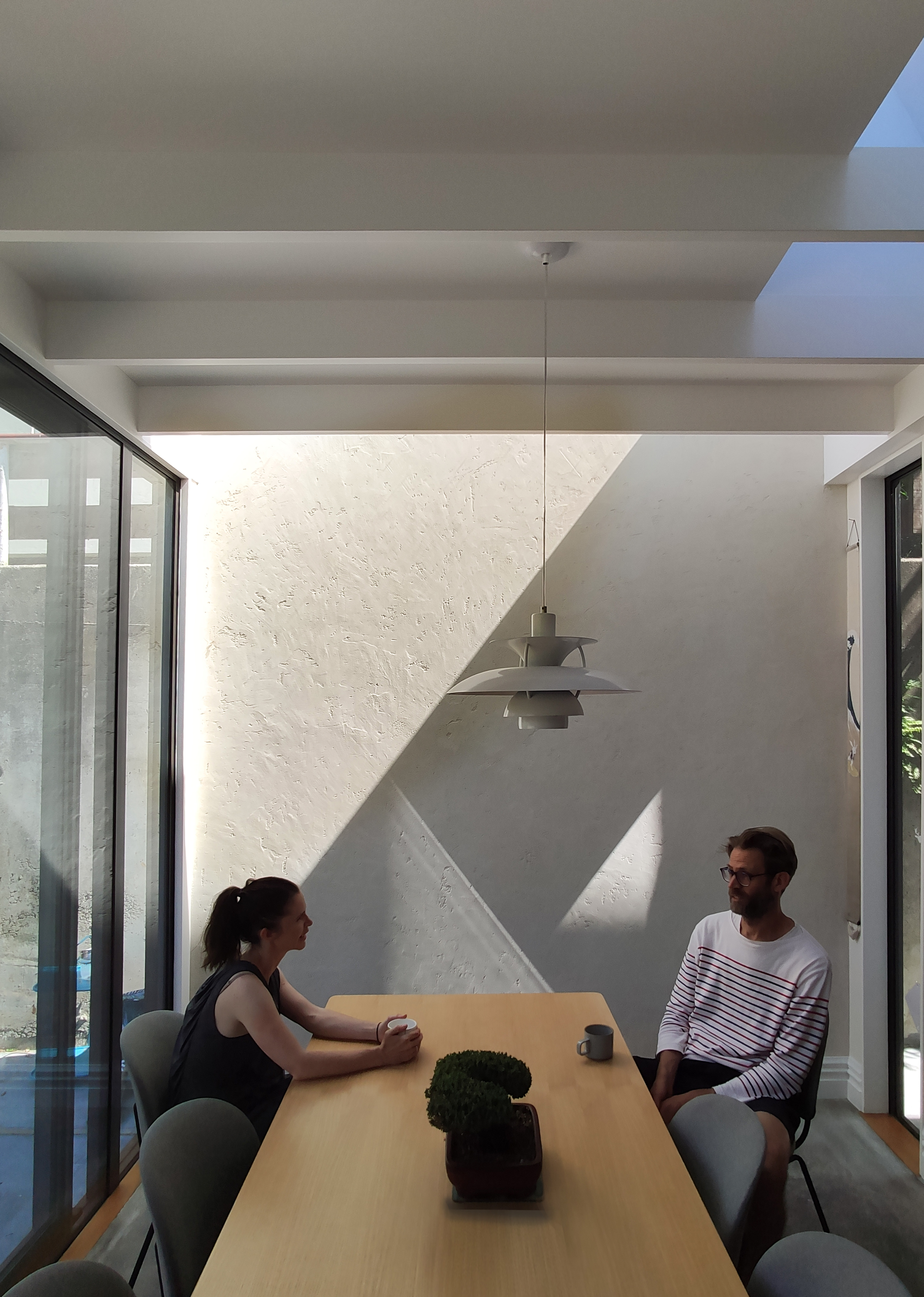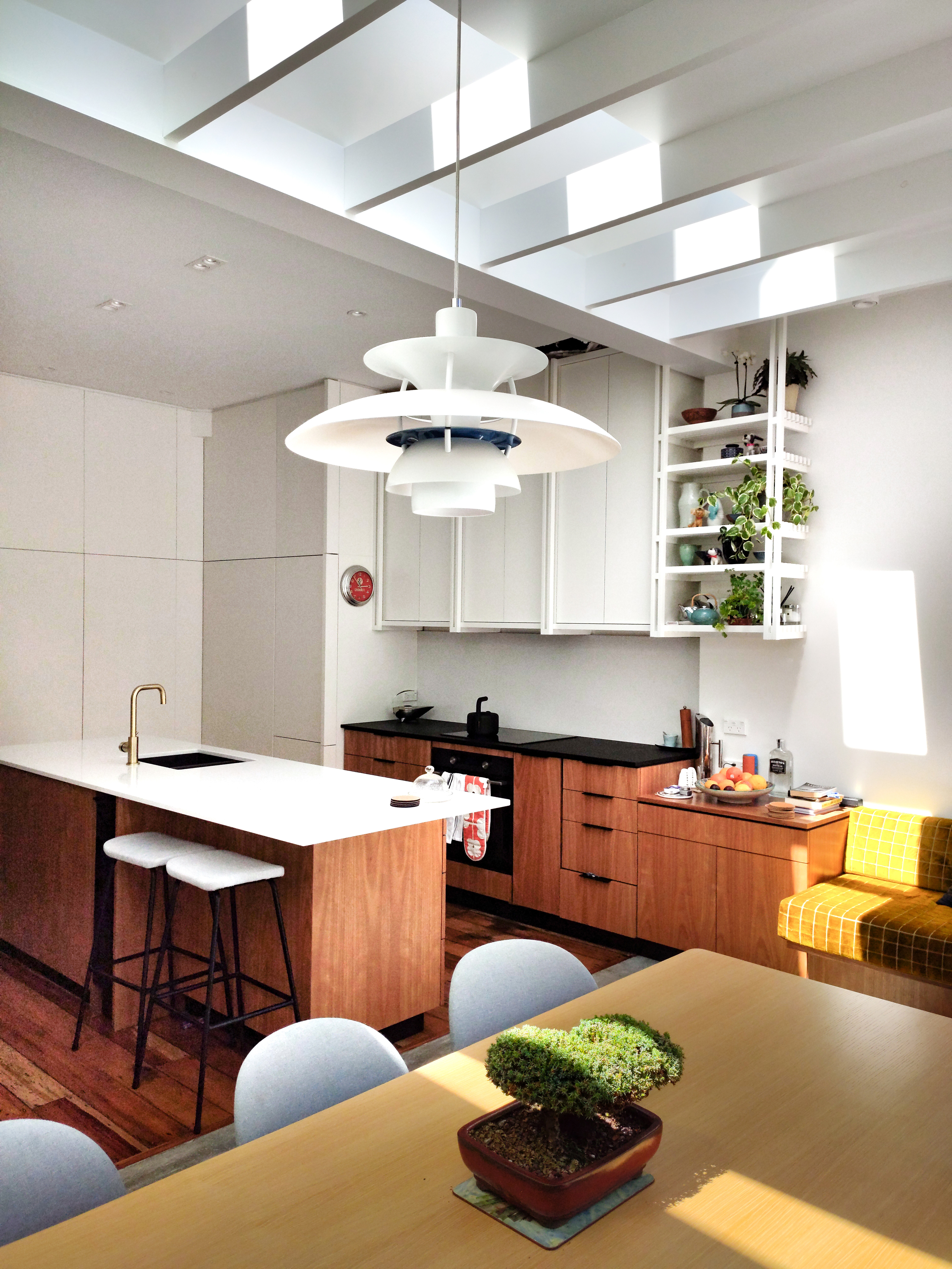This carefully crafted small extension to an 1870s heritage villa transforms the existing house well beyond its small footprint. Far from the traditional lean-to add-on, the extension takes advantage of every opportunity to admit light, facilitate cooking as a sociable pastime, and provide comfort and a connection to the rear garden. Skylights and slot windows are skillfully inserted to allow to the play of light on an artfully textured extension wall.