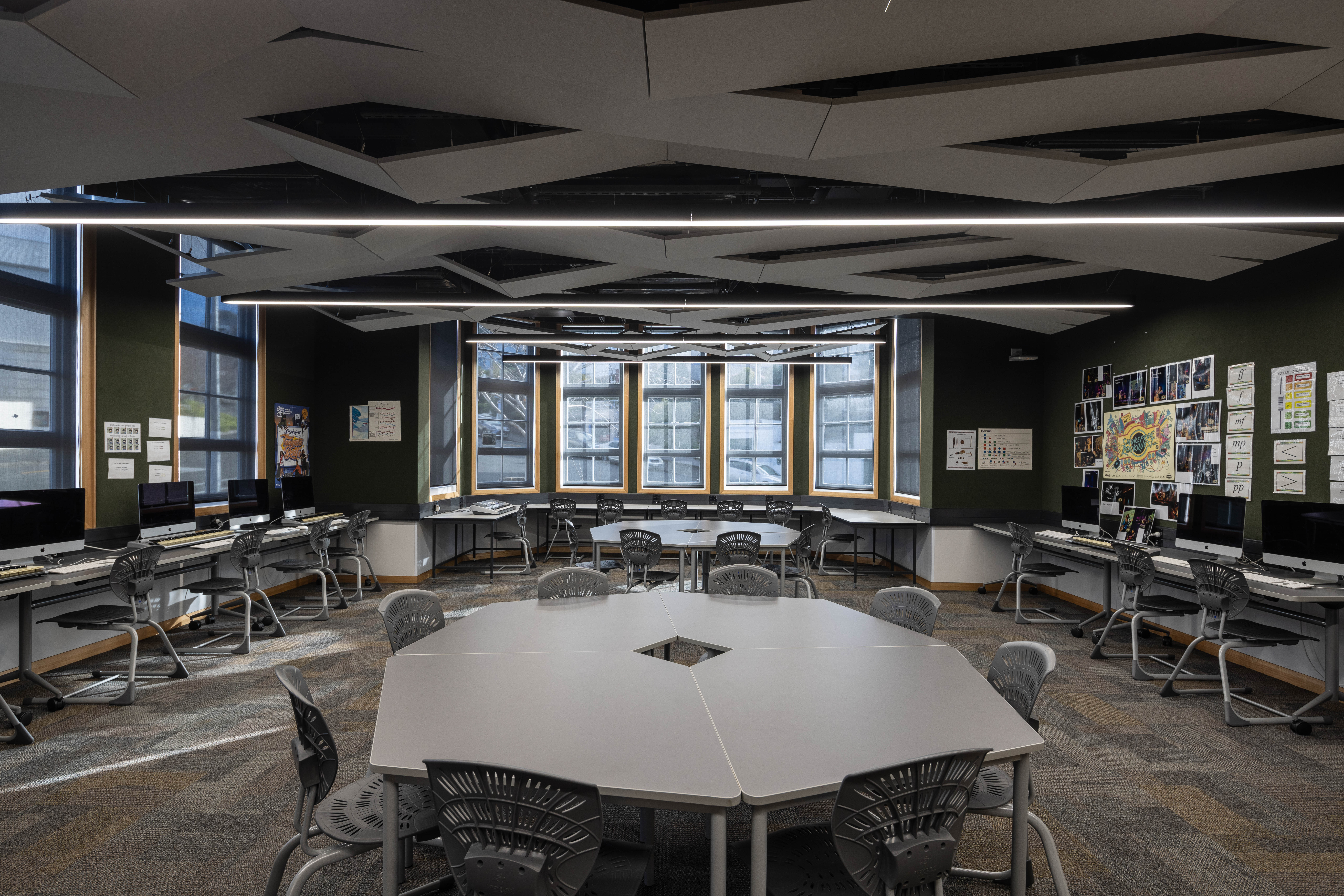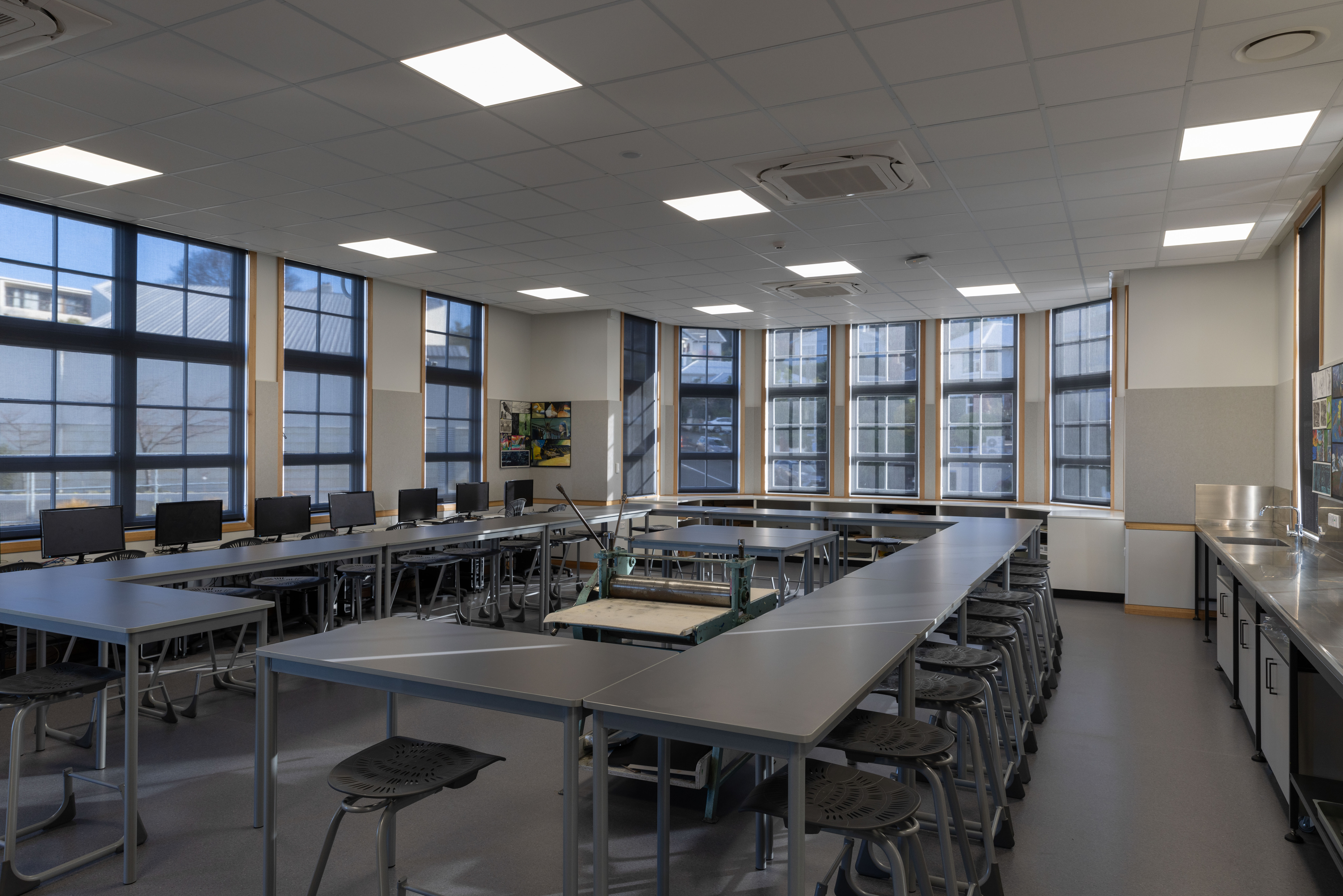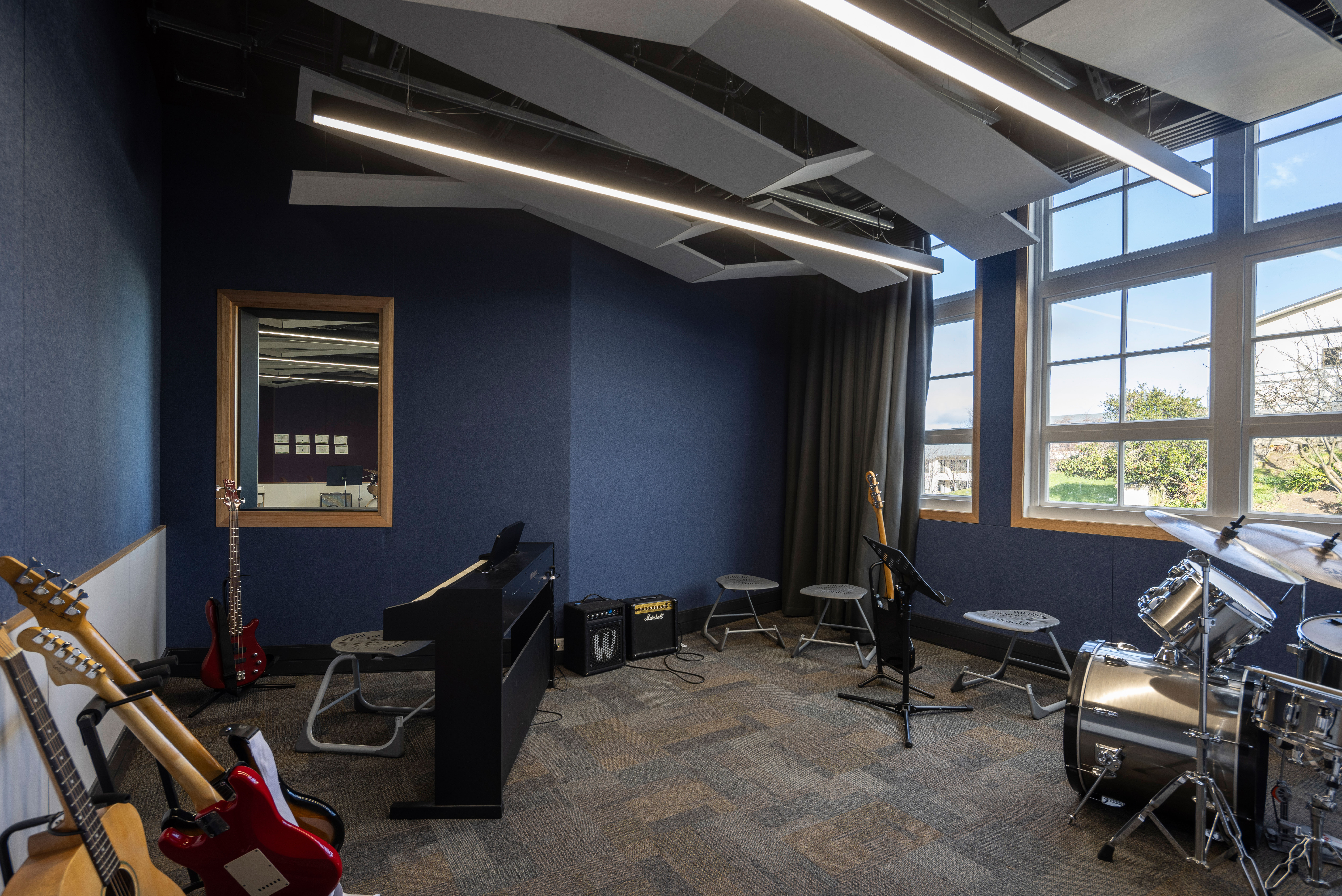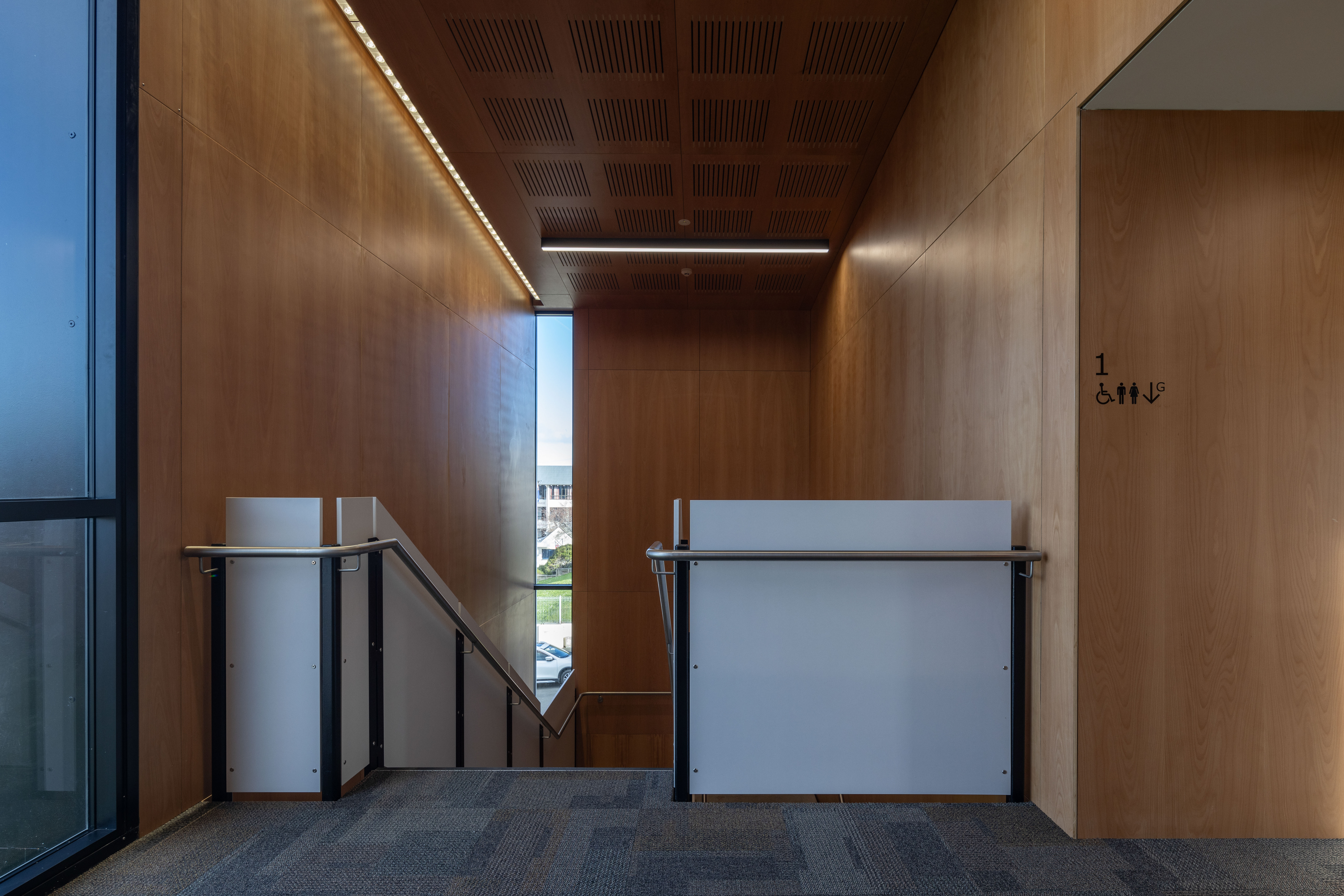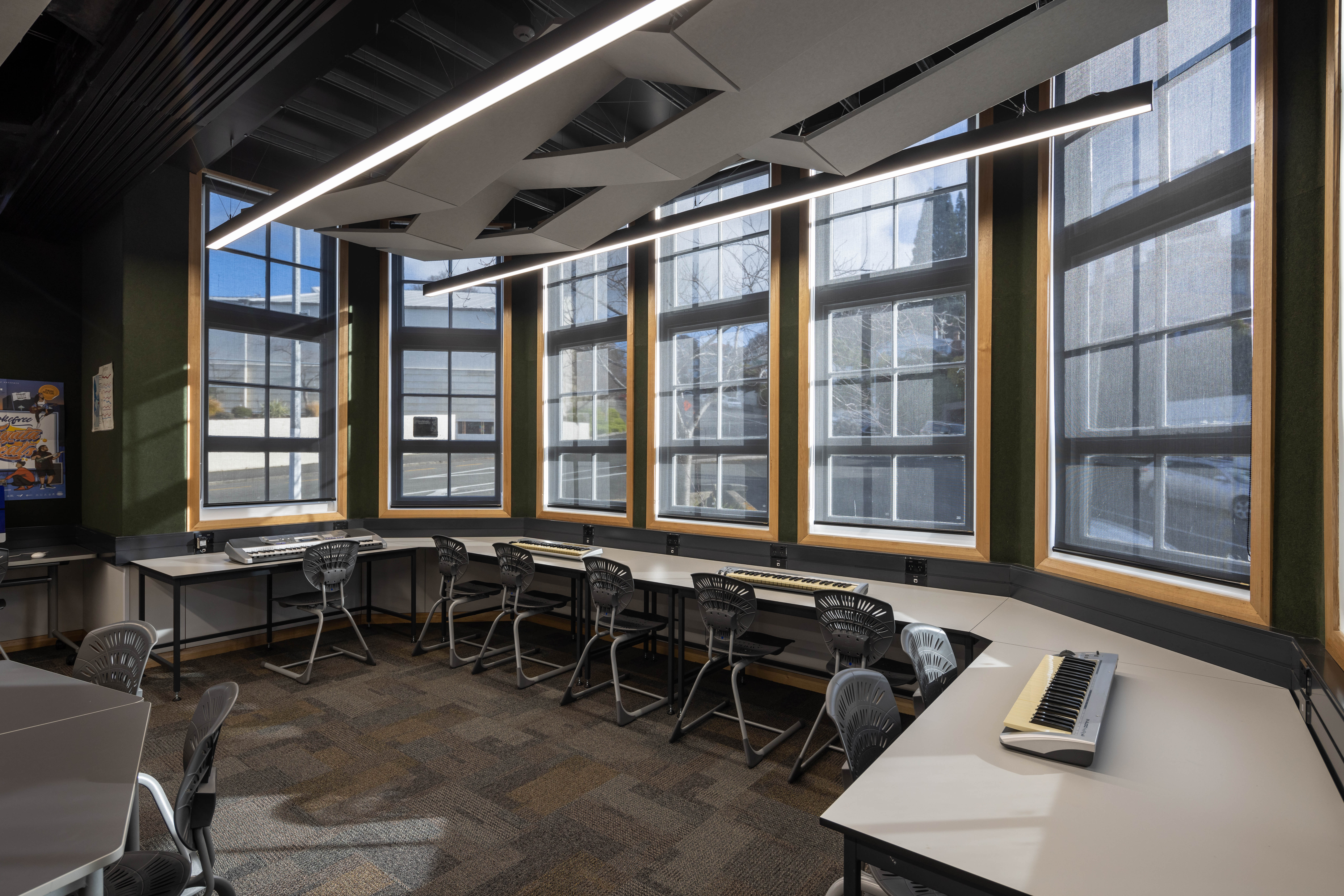 This adaptive reuse of a historic building with a rich cultural history in arts education has generated an inspiring music and art facility for the Catholic Diocese and Trinity College. Careful upgrades of the historic building include seismic strengthening, improved compliance, and reinstatement of missing timber window joinery. Challenging requirements for acoustic control within the 1930s timber structure were navigated with both sensitivity and expression to achieve necessary isolation between learning spaces, which also include a recording studio in the basement. The new lift and stairs lined in a warm timber is reminiscent of a crafted instrument. The project has created modern learning spaces that foster student creativity within a cultural and historically significant context.