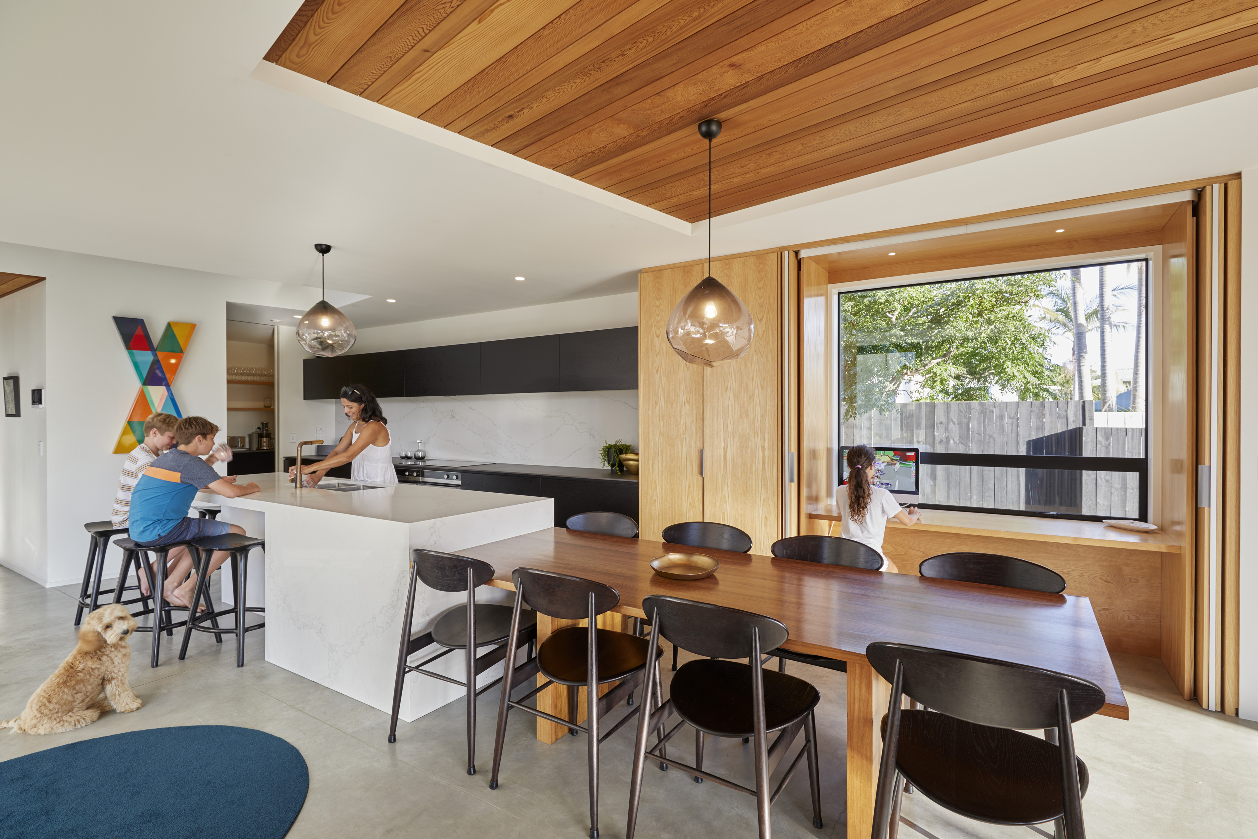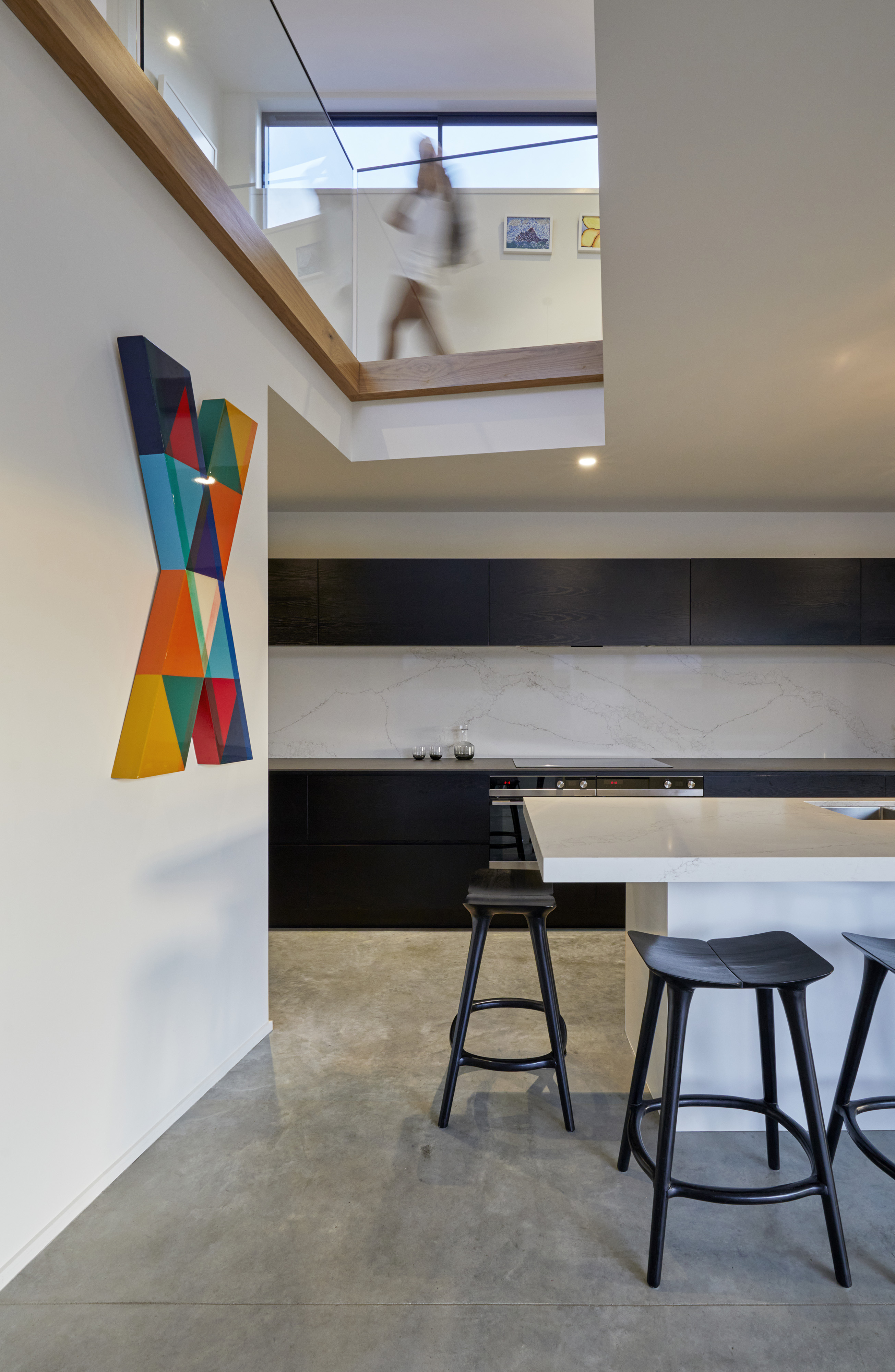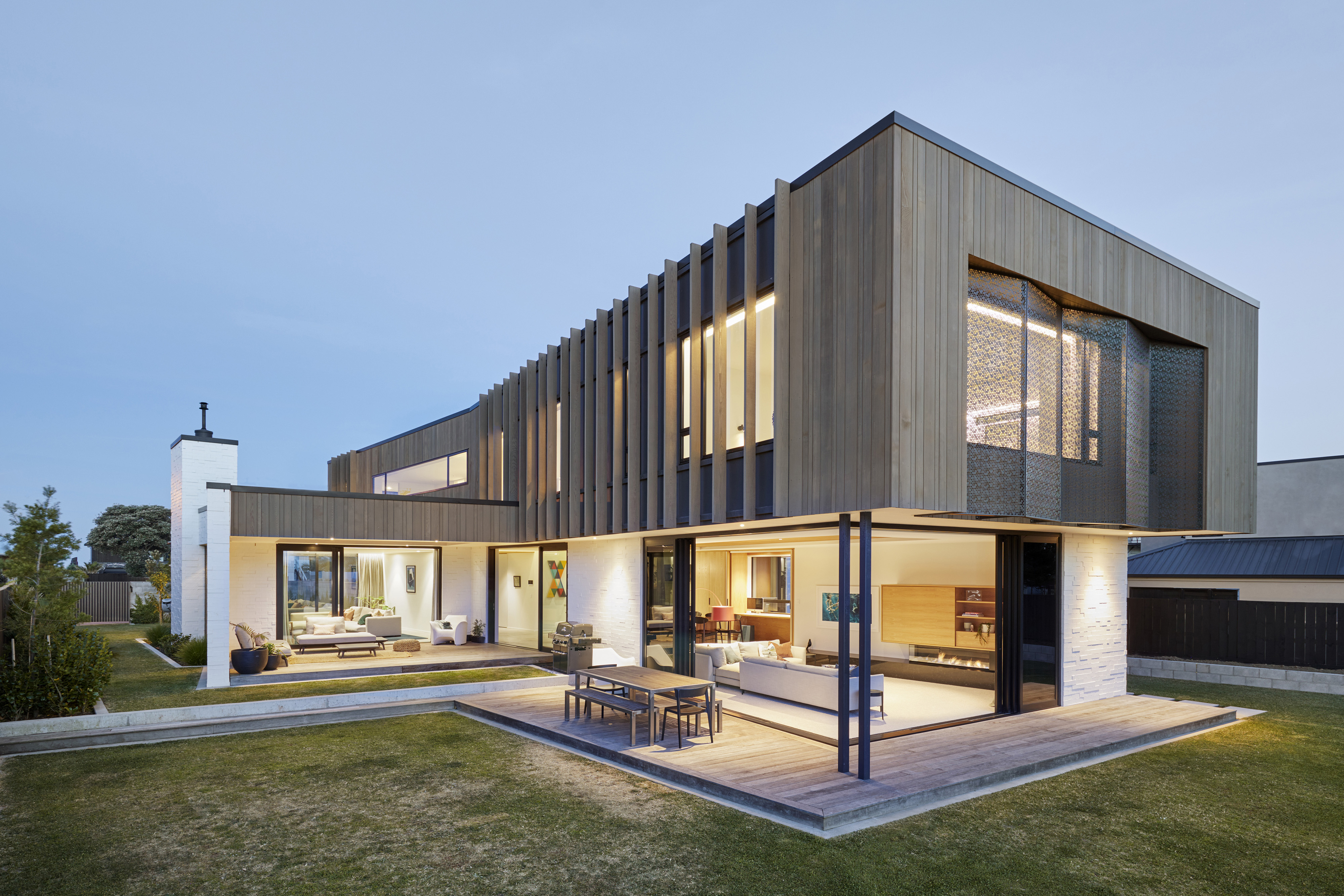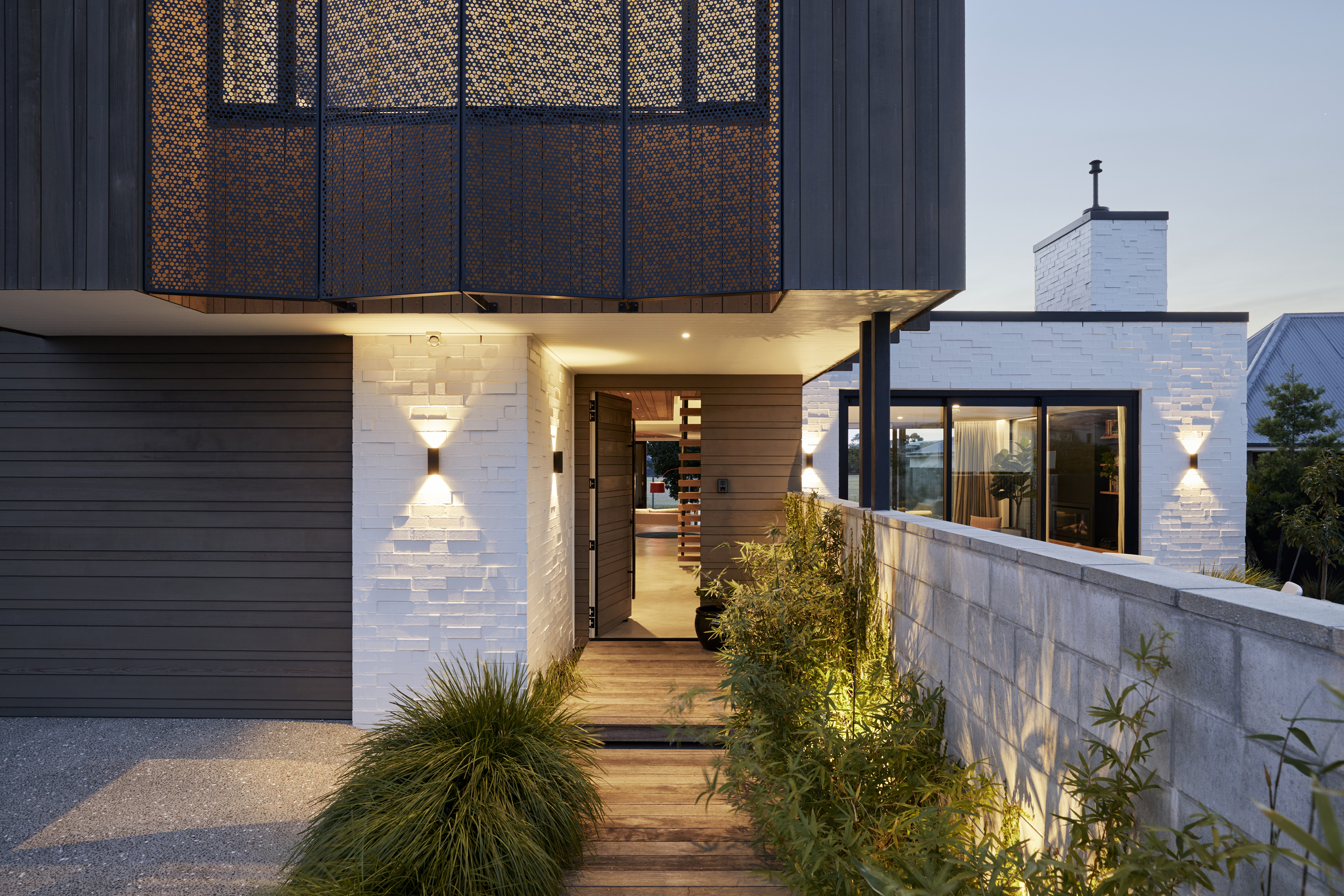 This townhouse explores the idea of the home as fluid space. The design creates a journey from the busy public realm of the street through relaxed family spaces to the unexpected breadth of a park outlook. The longitudinal splay planning is a dynamic response to this linear experience; it allows variance and flow within a narrow envelope and creates opportunities for the living space to open to various north-facing garden and courtyard areas. The building form is strongly articulated with contrasting horizontal modelling of cedar box floating over a brick base. A privacy veil of metal screening is fitted into the upper openings, and repeated vertical battens accentuate the movement of the splay. The design is a spatial solution that benefits from the site’s limitations, and has a delightful family living space at its heart.