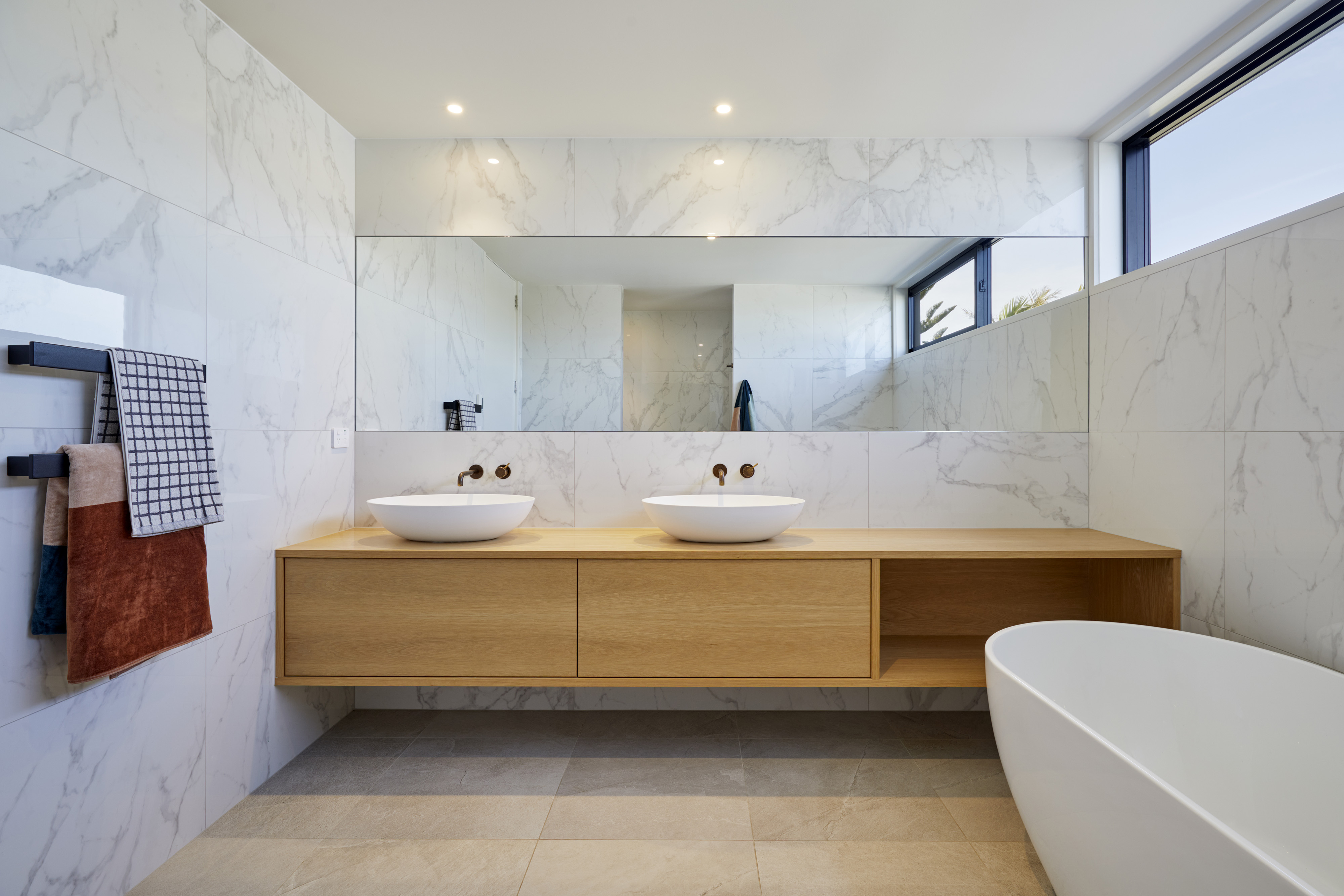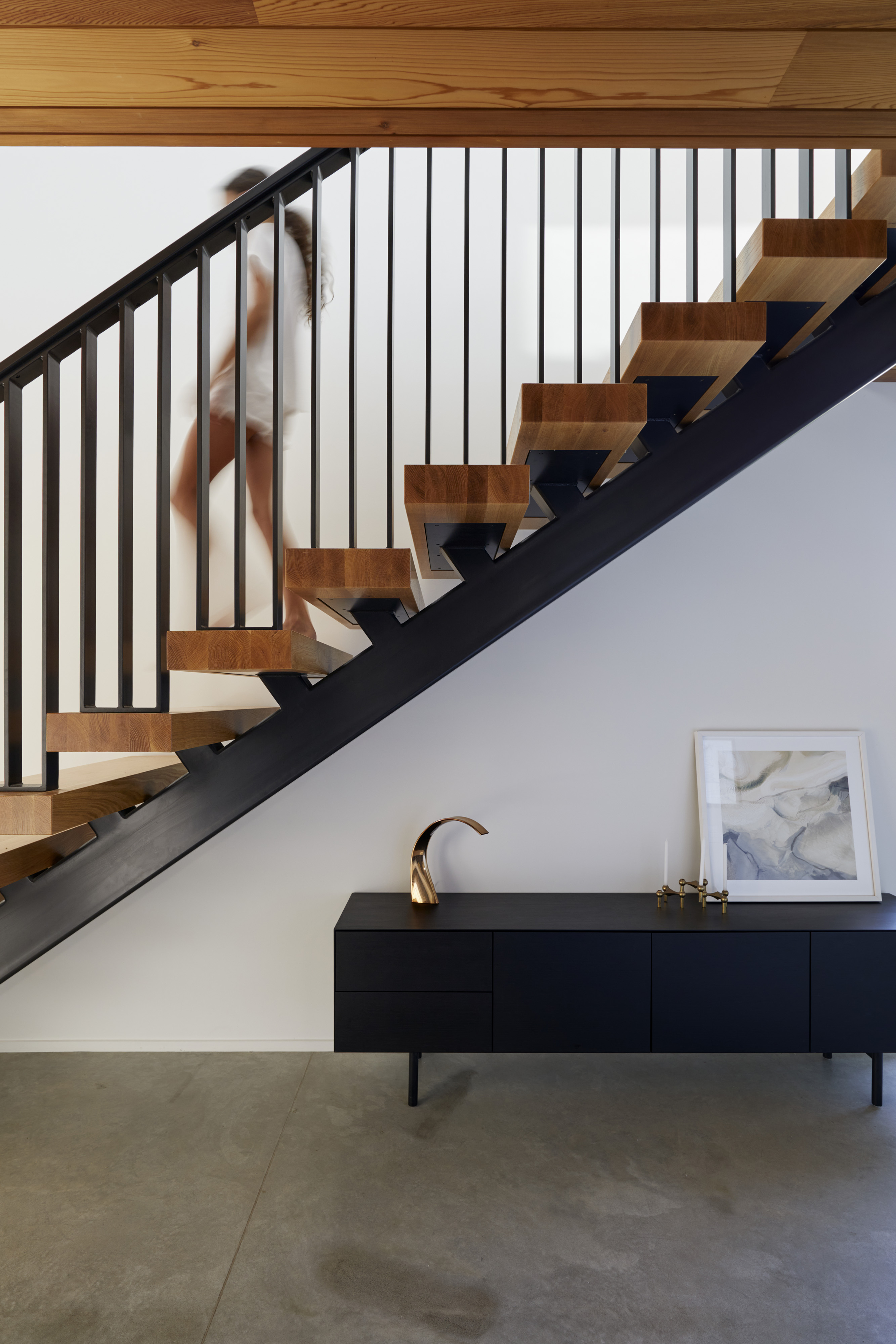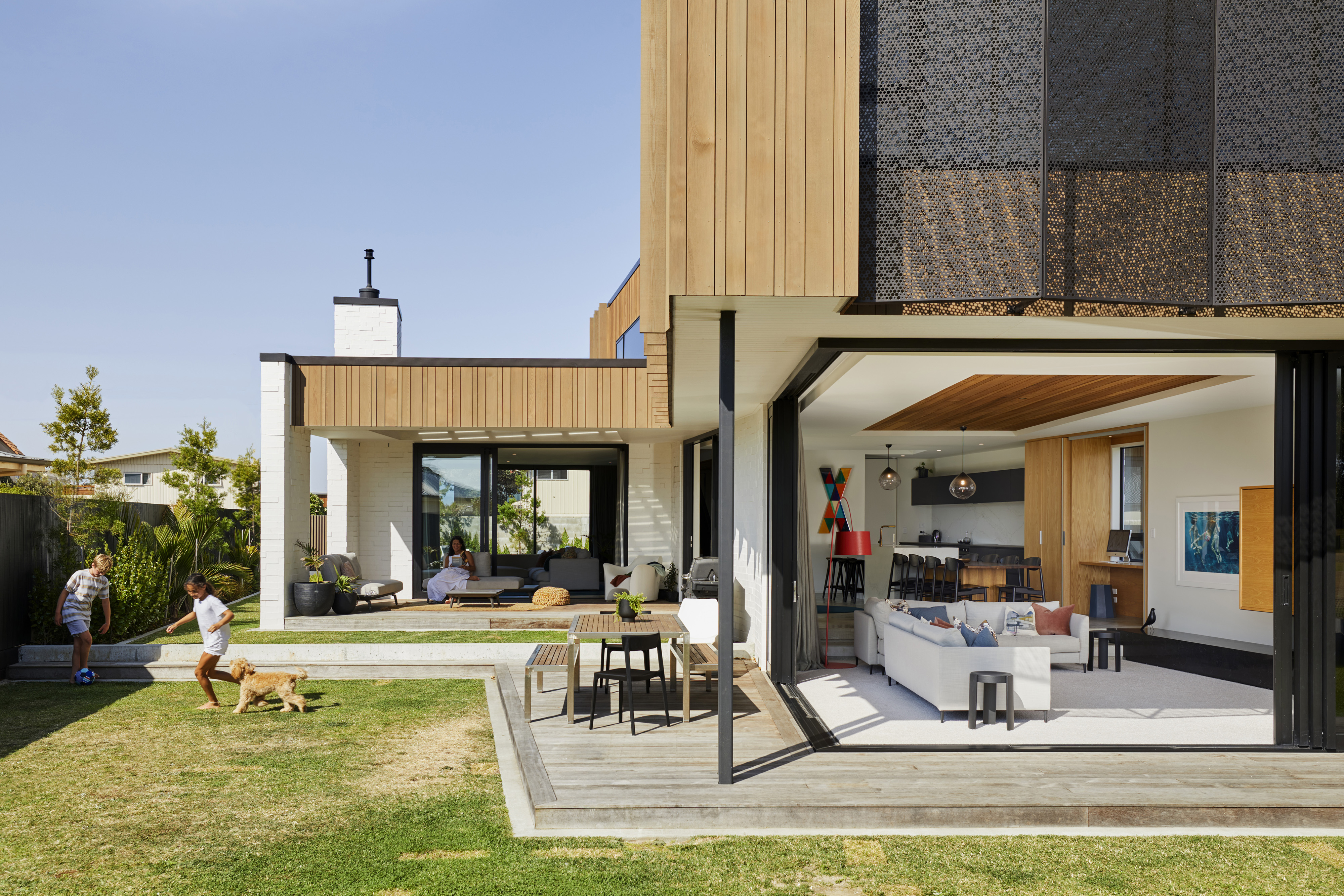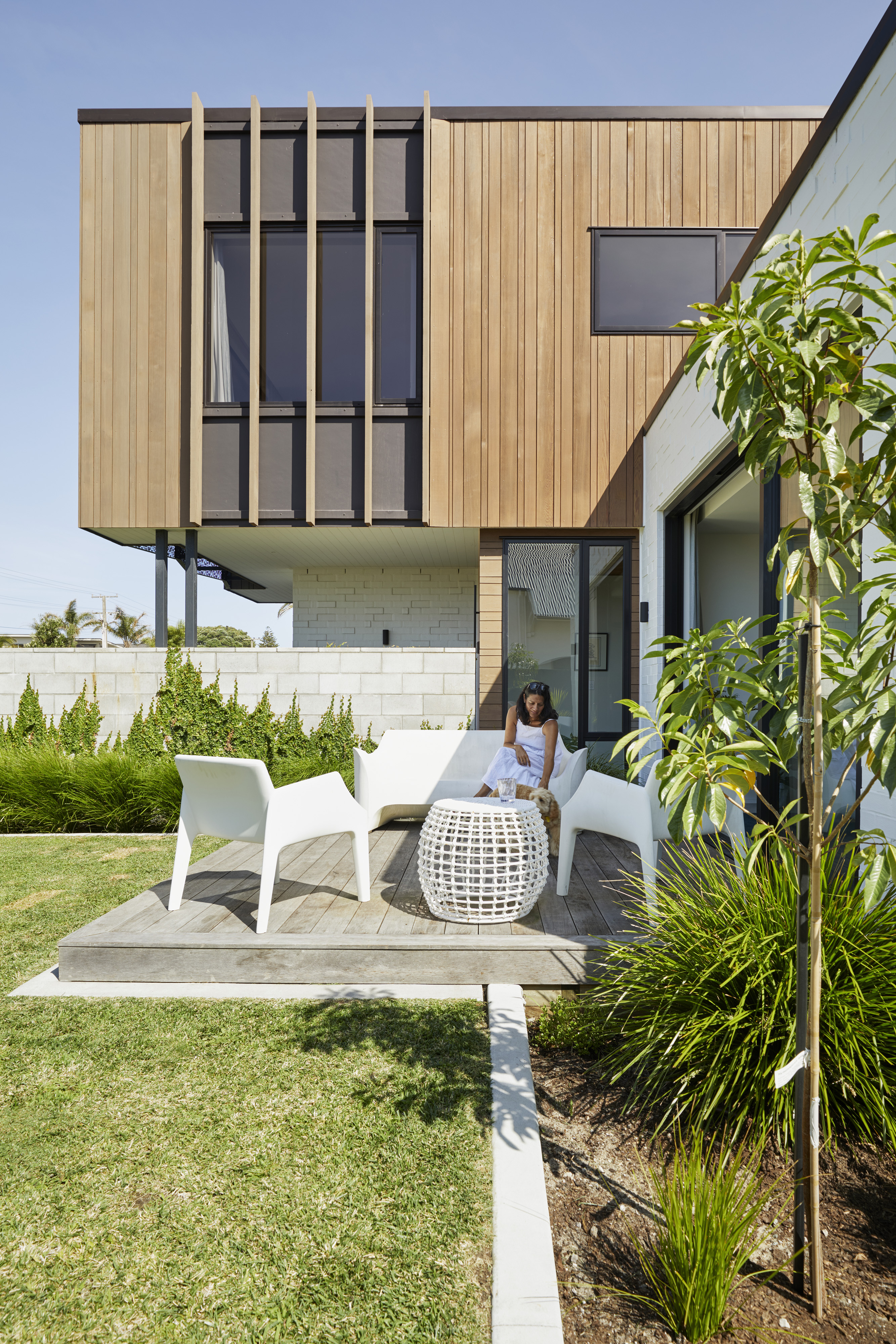 This townhouse explores the idea of the home as fluid space. The design creates a journey from the busy public realm of the street through relaxed family spaces to the unexpected breadth of a park outlook. The longitudinal splay planning is a dynamic response to this linear experience; it allows variance and flow within a narrow envelope and creates opportunities for the living space to open to various north-facing garden and courtyard areas. The building form is strongly articulated with contrasting horizontal modelling of cedar box floating over a brick base. A privacy veil of metal screening is fitted into the upper openings, and repeated vertical battens accentuate the movement of the splay. The design is a spatial solution that benefits from the site’s limitations, and has a delightful family living space at its heart.