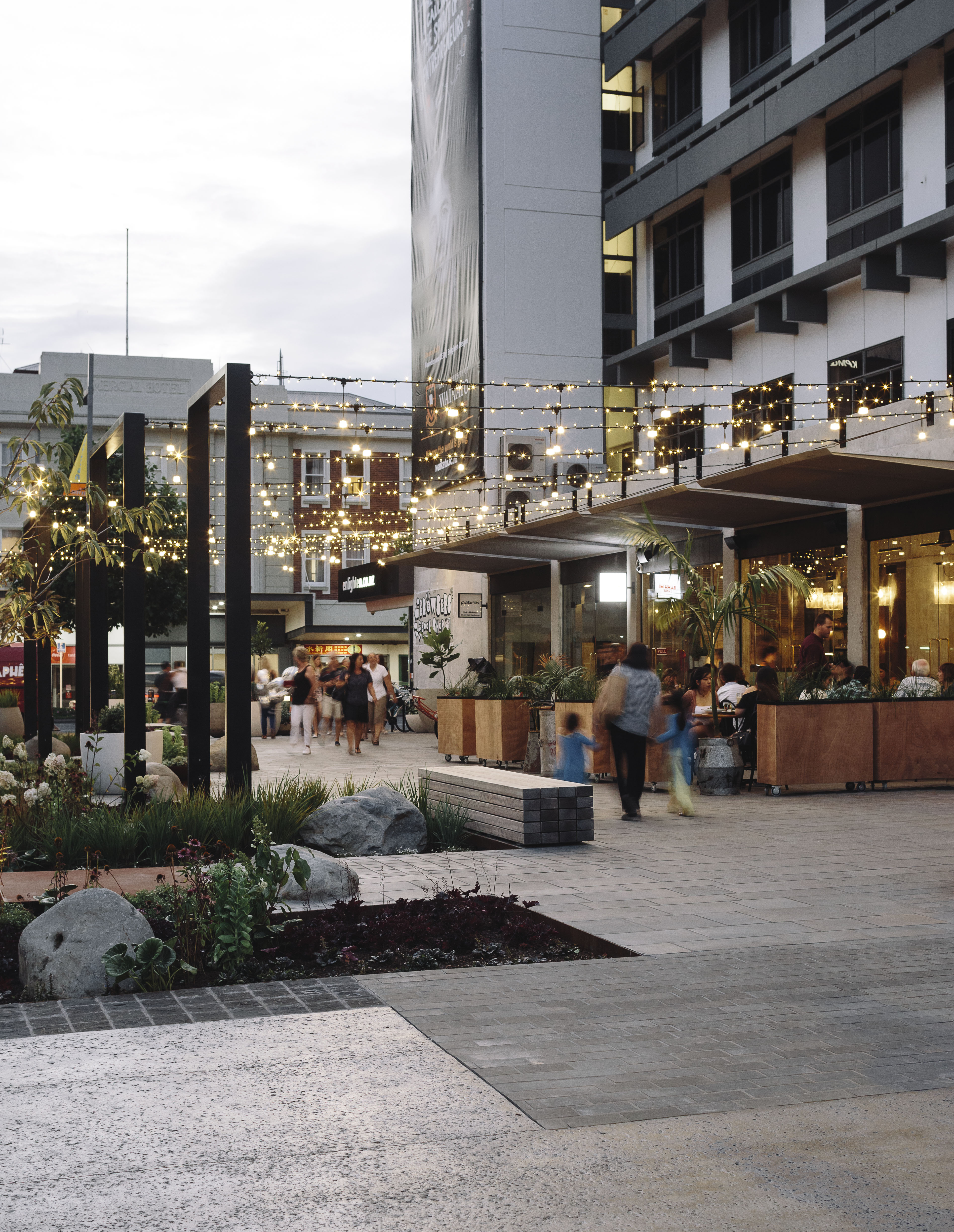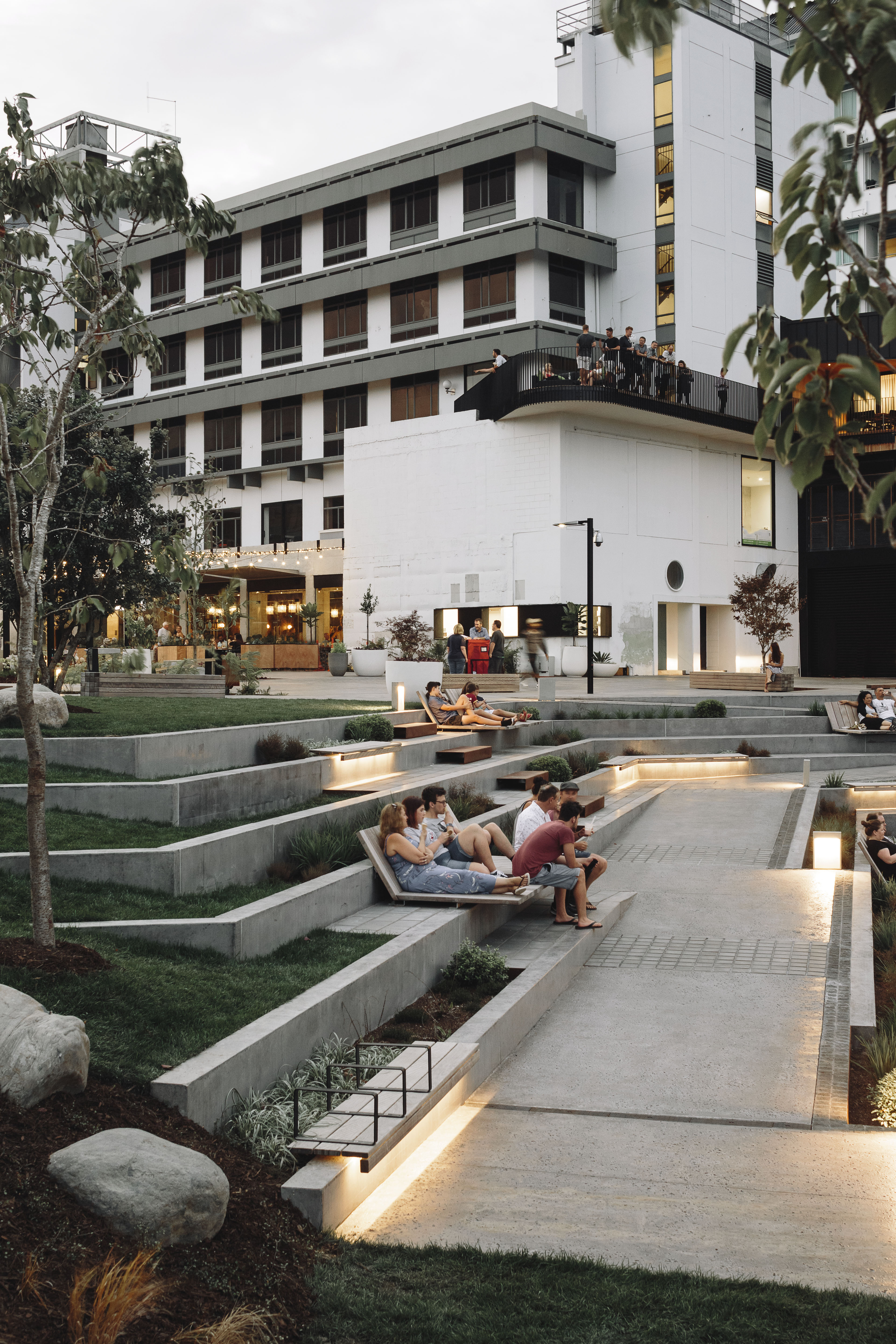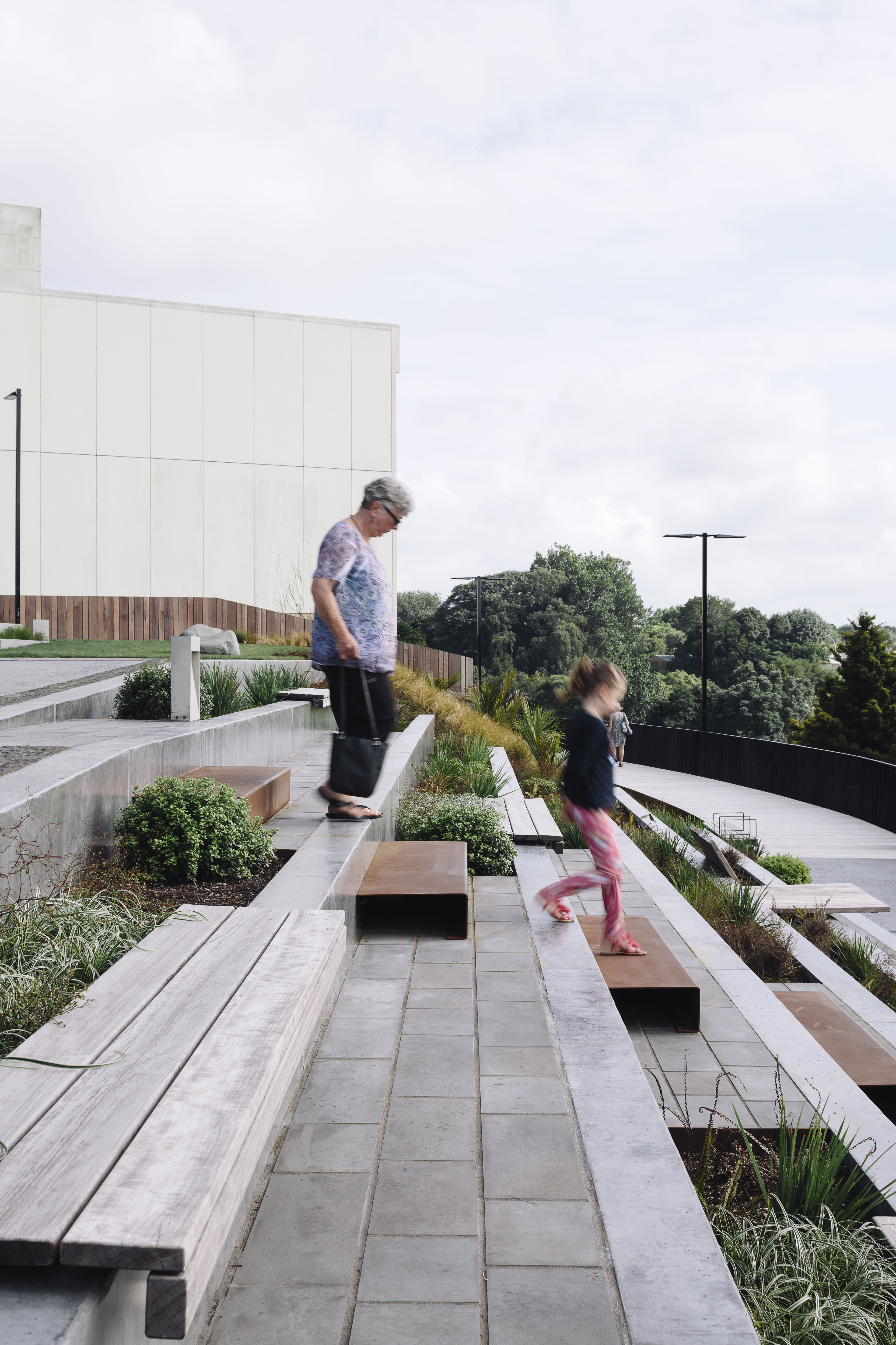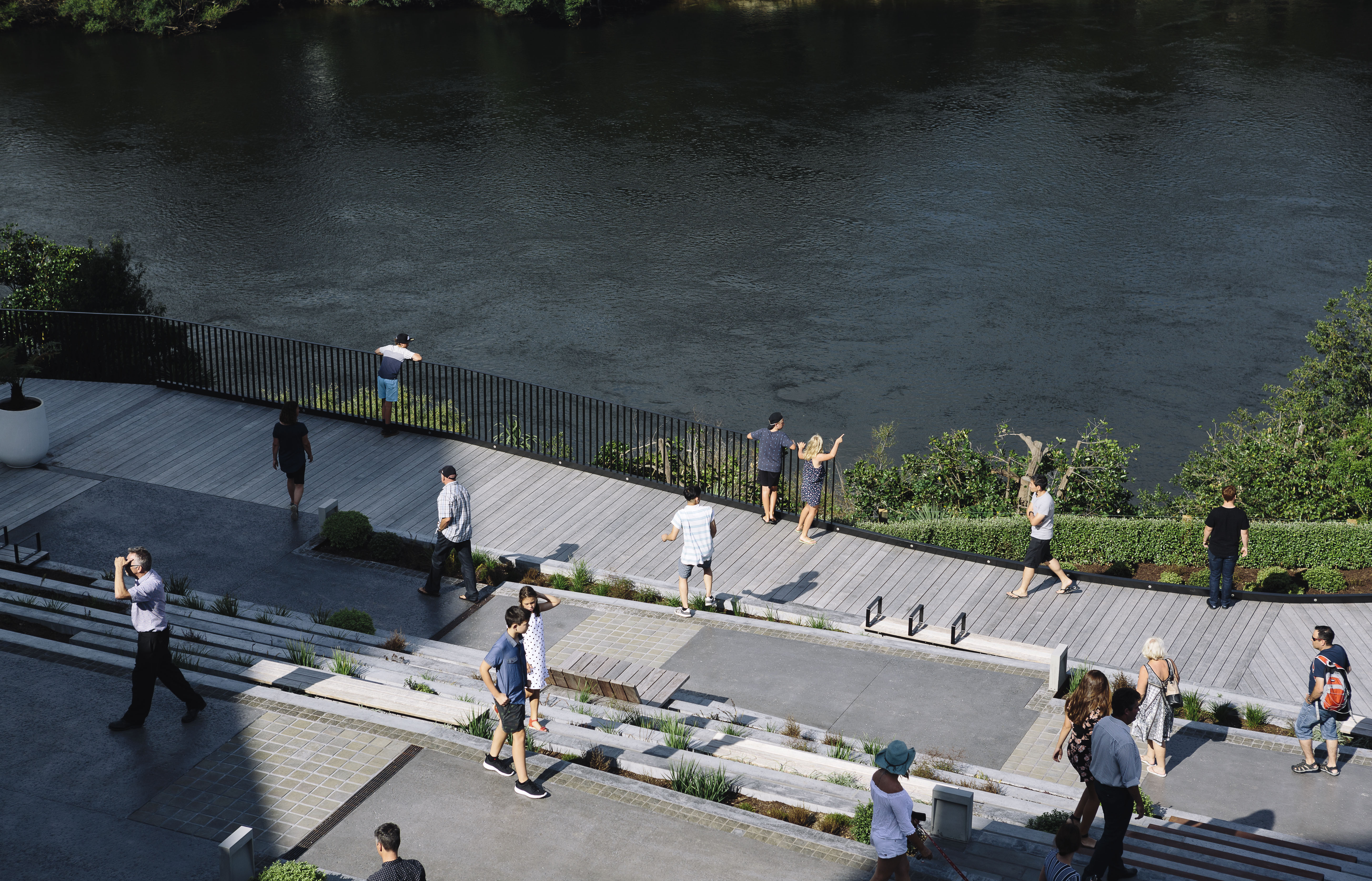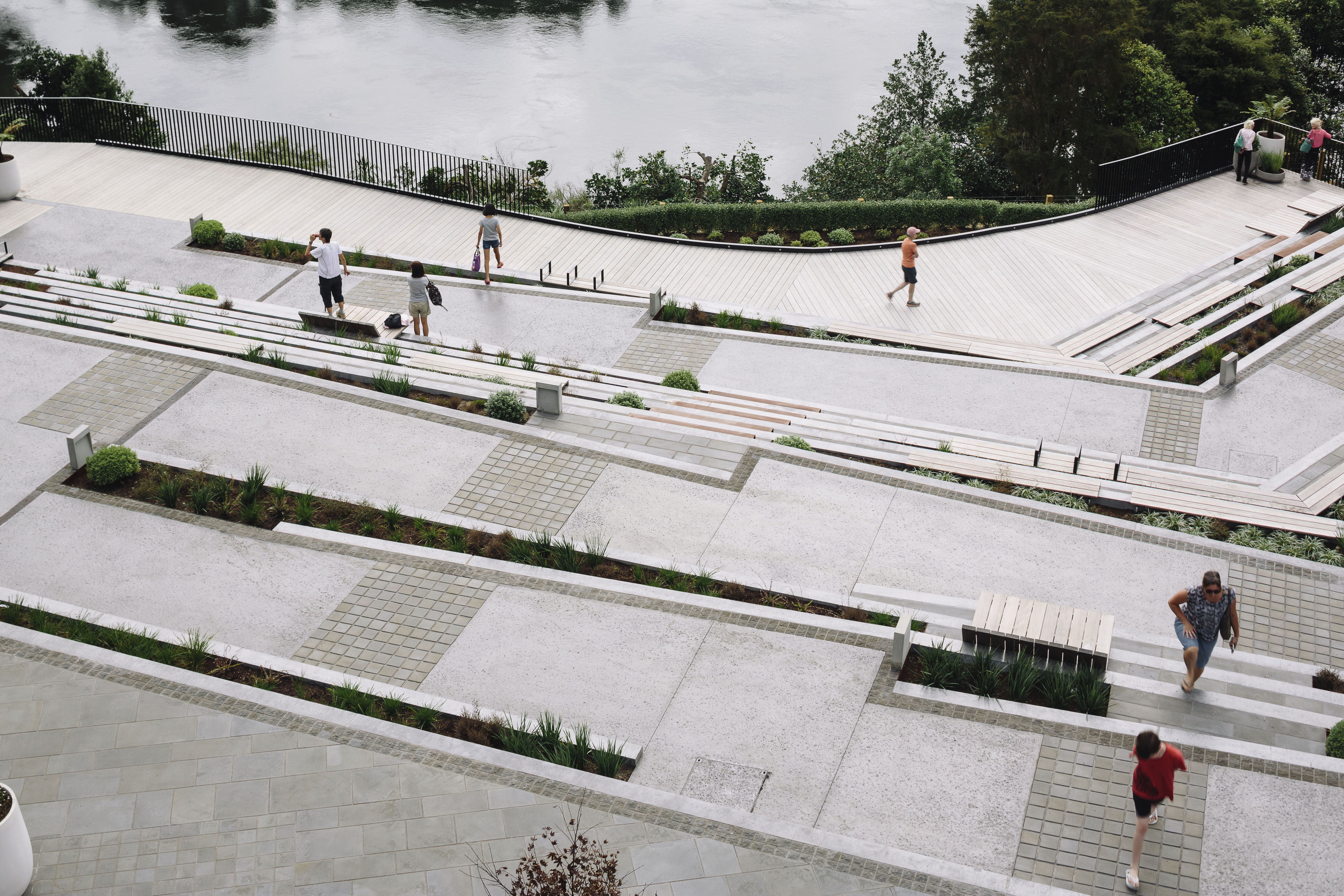 This riverine park is a compelling new connection between Hamilton’s city centre and its great, although often ignored, feature: the Waikato River. The amphitheatre park mixes meticulously detailed urban elements – a refined material palette and complementary planting – with stepped gardens, terraces and wide boardwalks that are universally accessible so that all may enjoy the setting. The overall effect is of peace and calm, although there is no doubt the environment could easily scale up from lunching workers to larger crowds enjoying a riverside event.