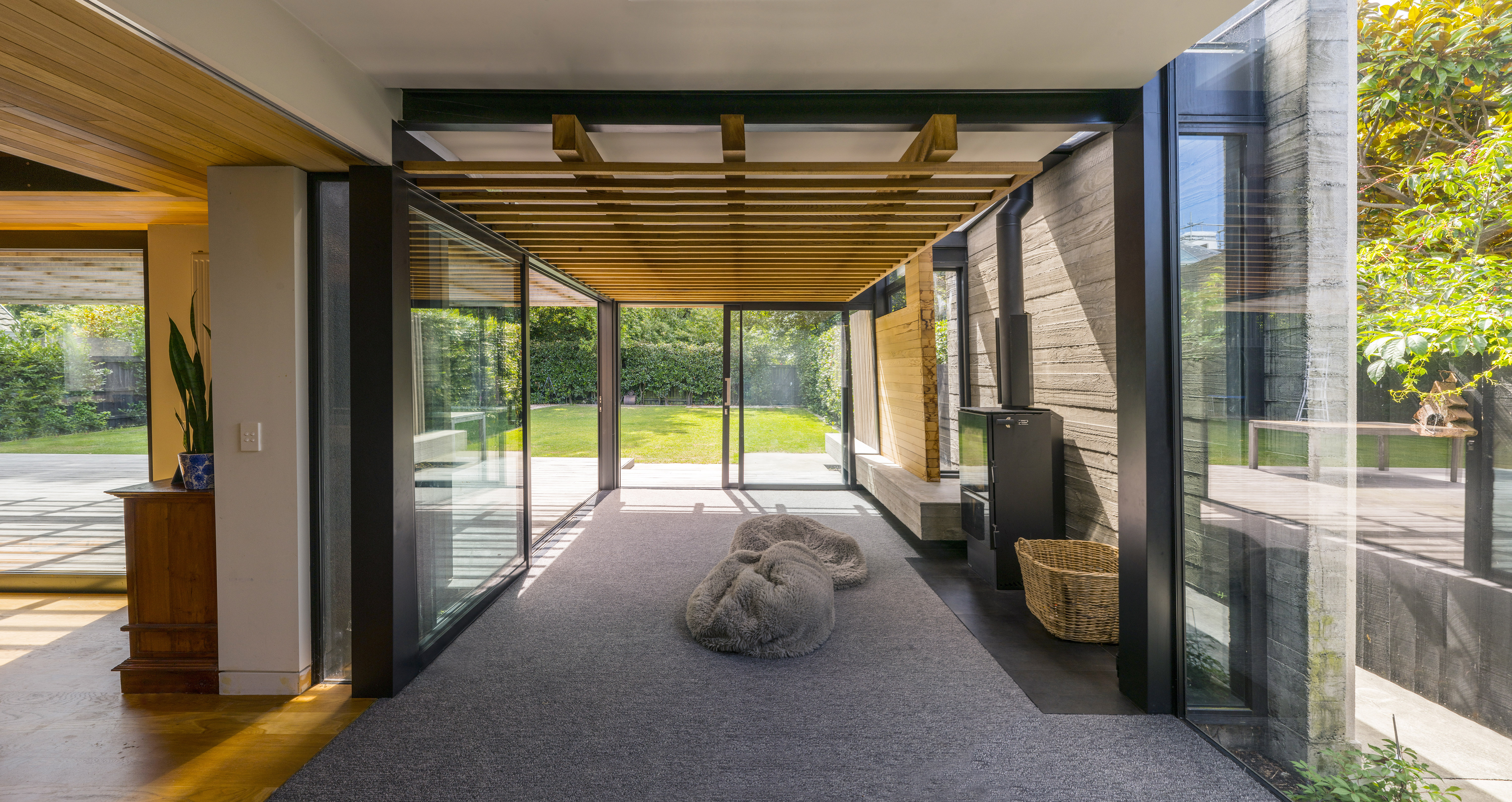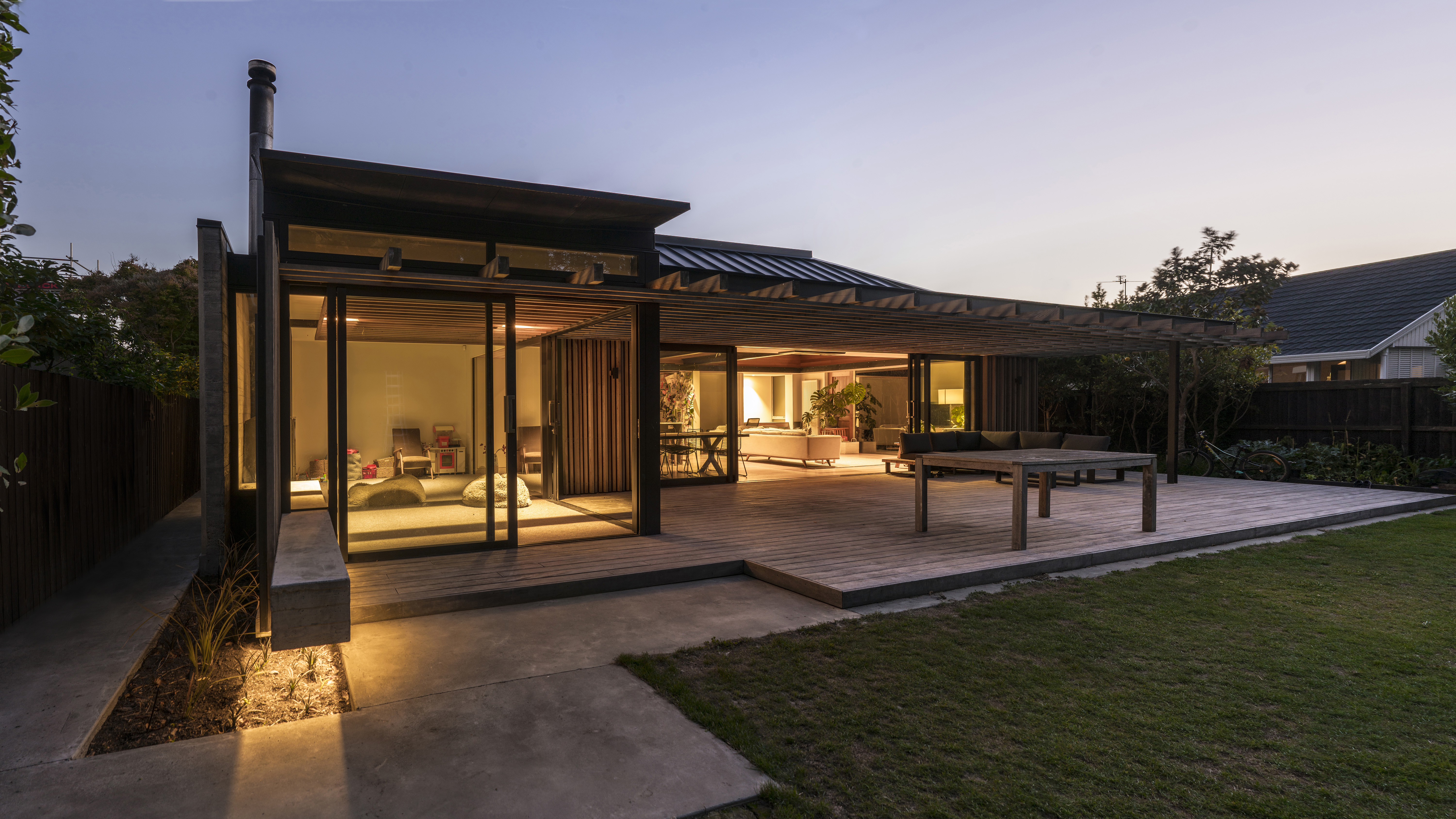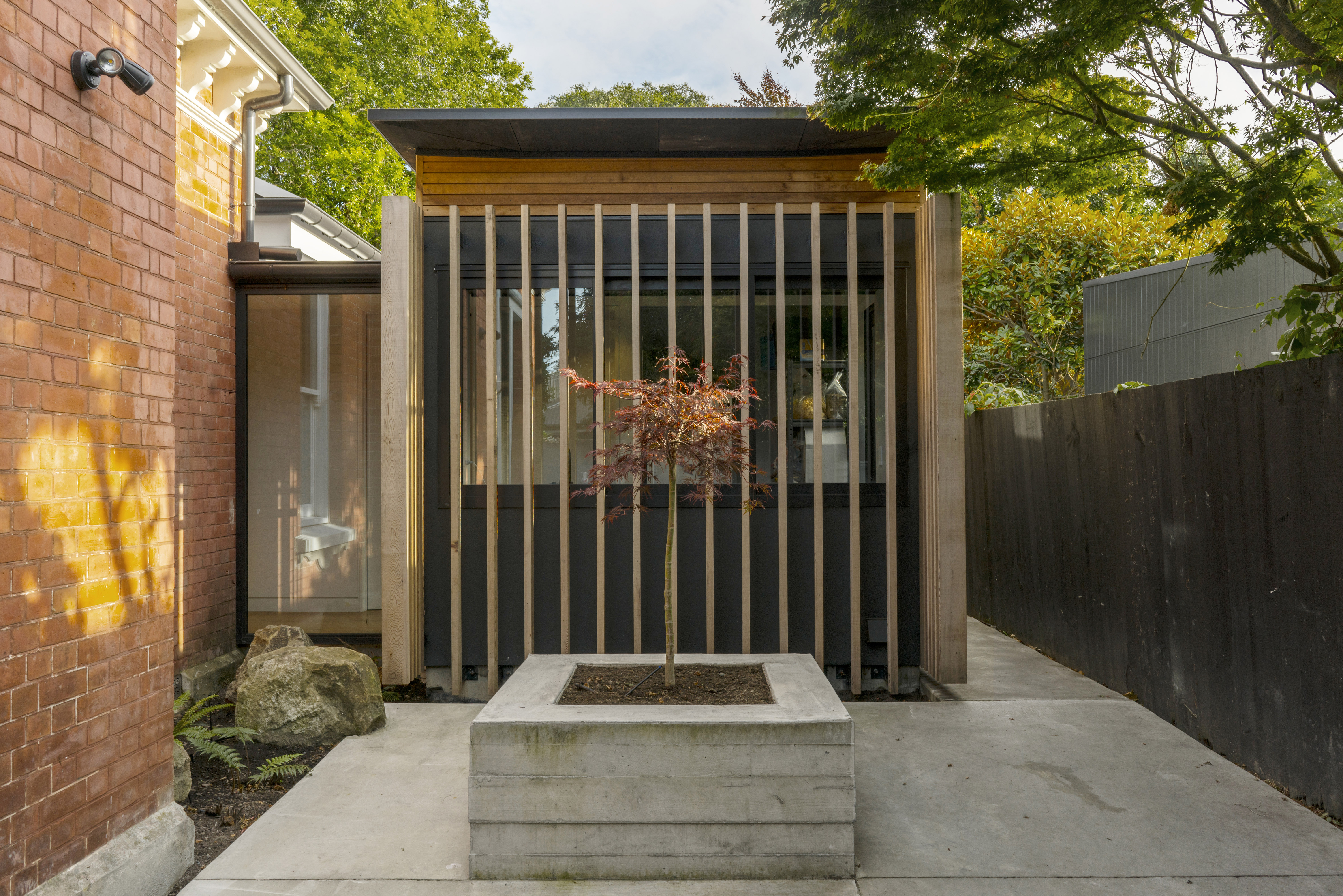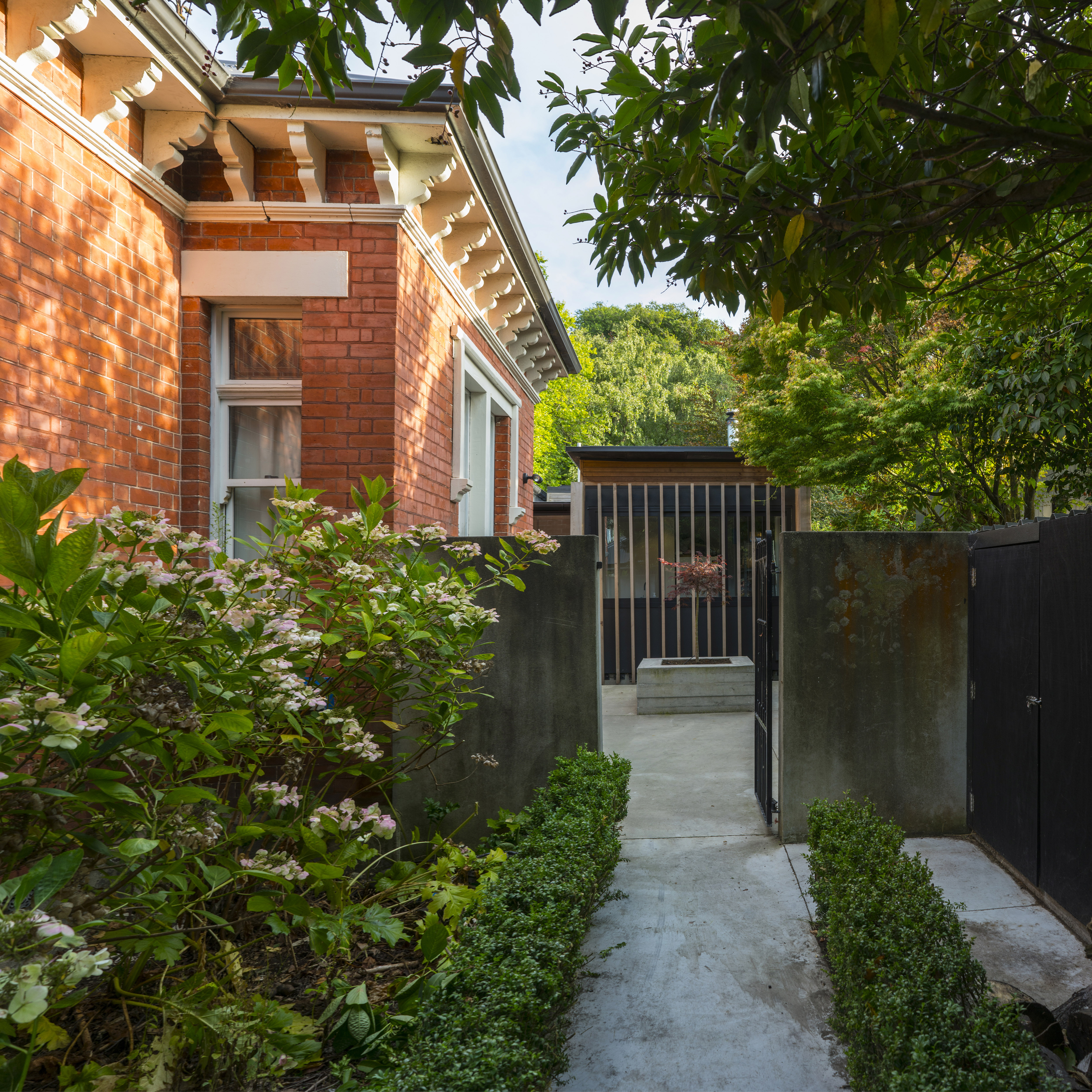 This addition to an 1899 brick heritage villa set within a leafy Christchurch suburb is achieved with skill and sensitivity. A garden room and floating pergola mediate the transition from house to garden, contrasting with the age and solidity of the villa but achieving harmony through rich materiality, texture, craft and play of light and shadow. The living spaces are intimately scaled with inventive details and carefully frame views of the garden. This elegant home provides an inspired example for contemporary additions to heritage houses.
