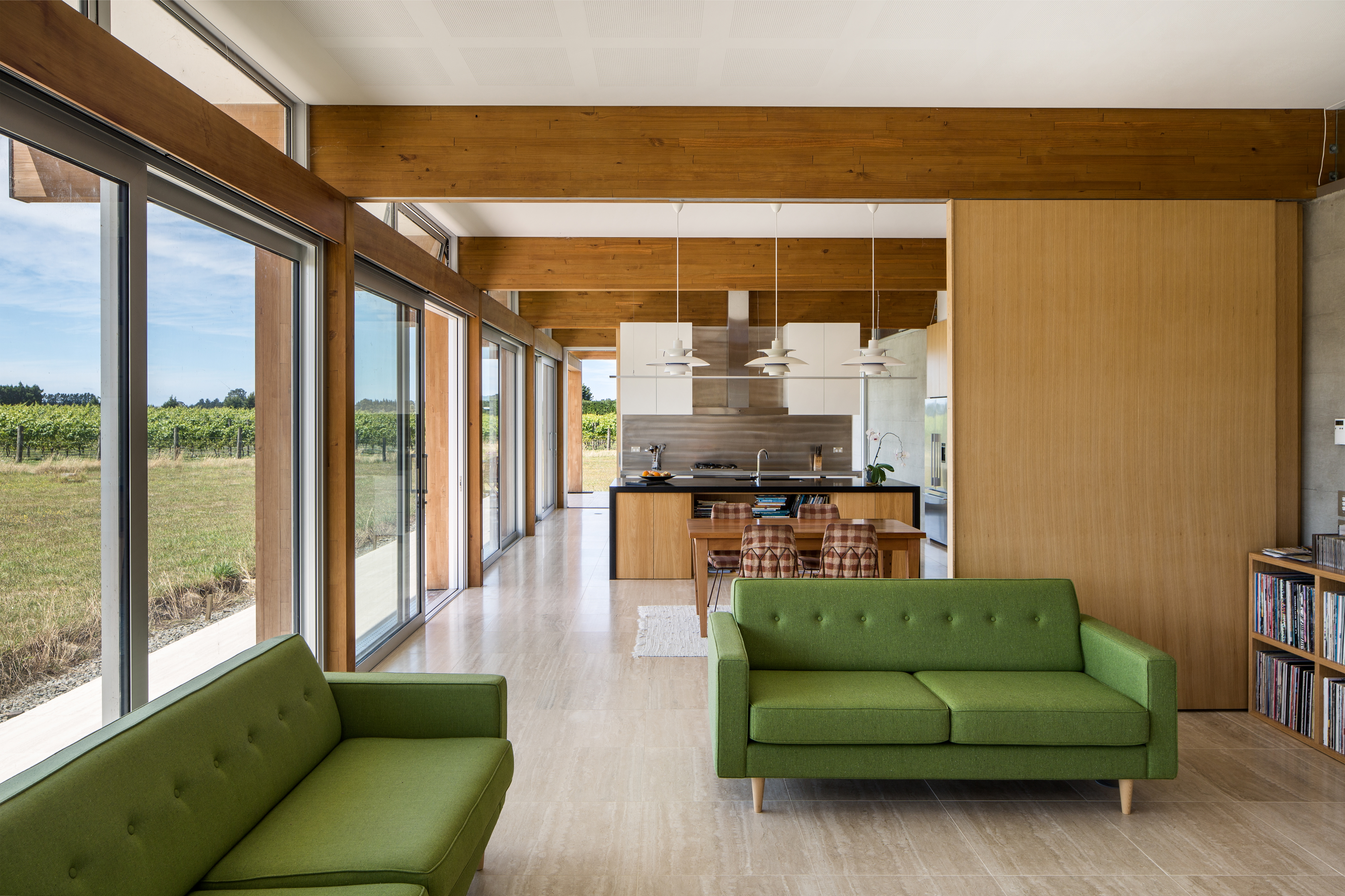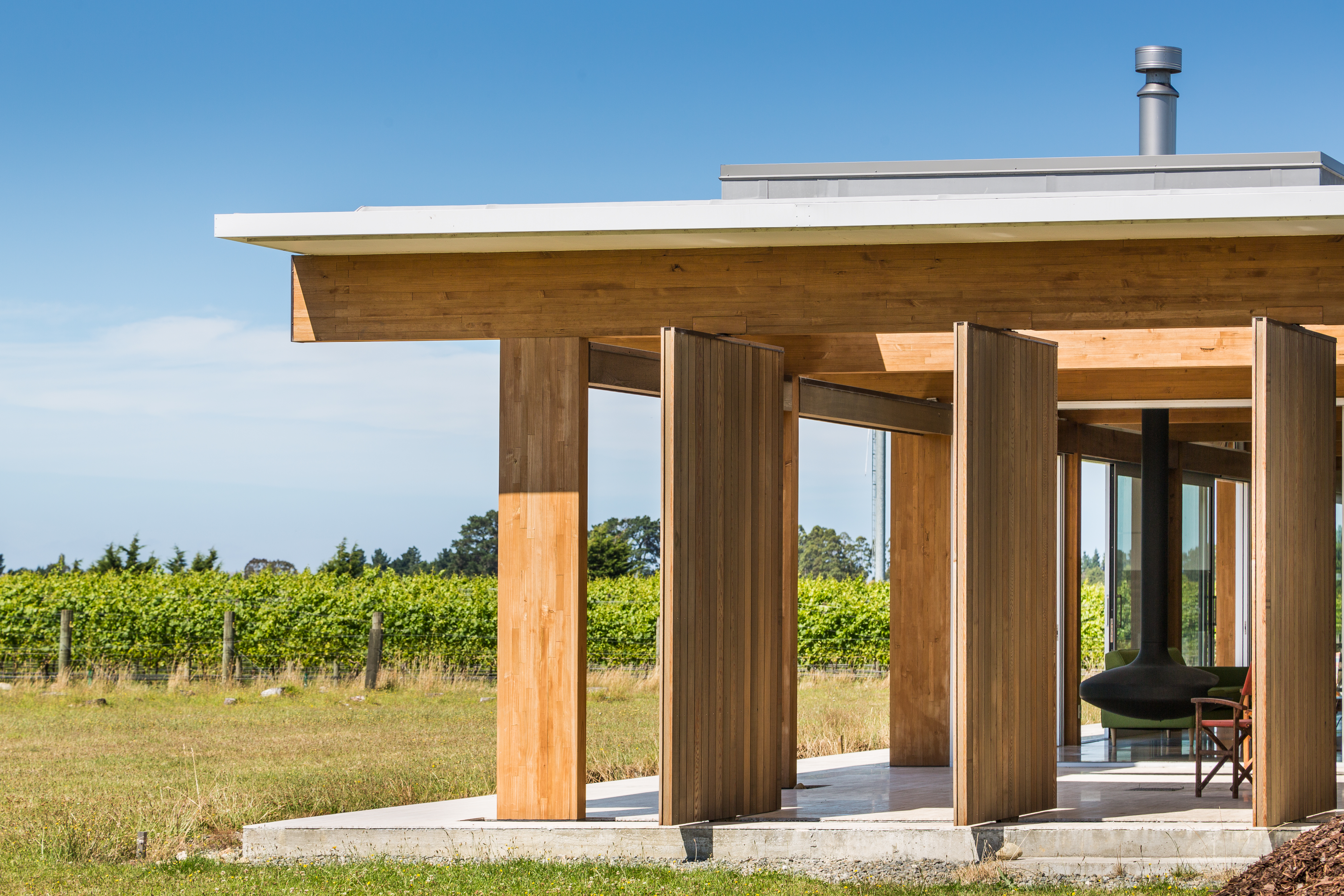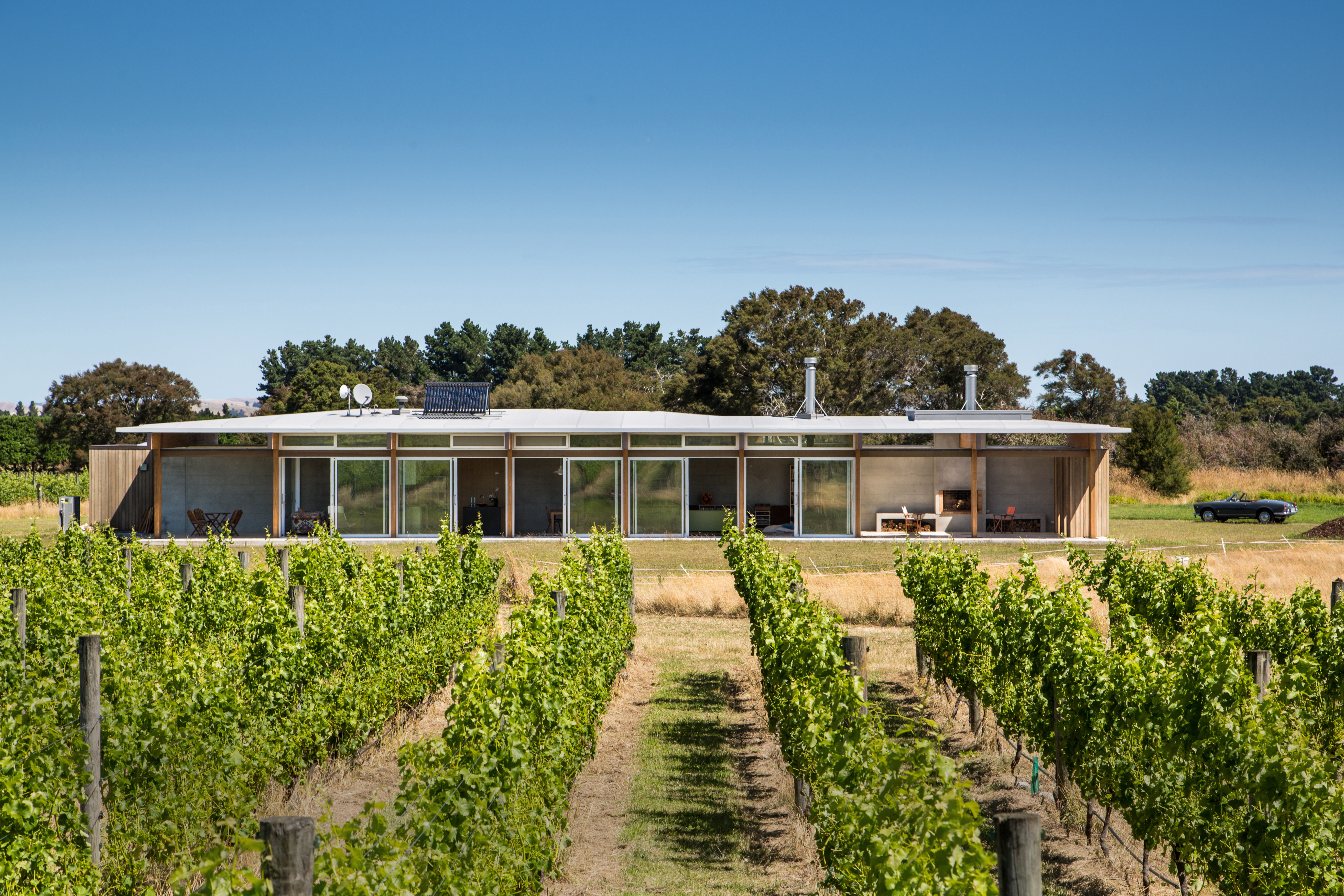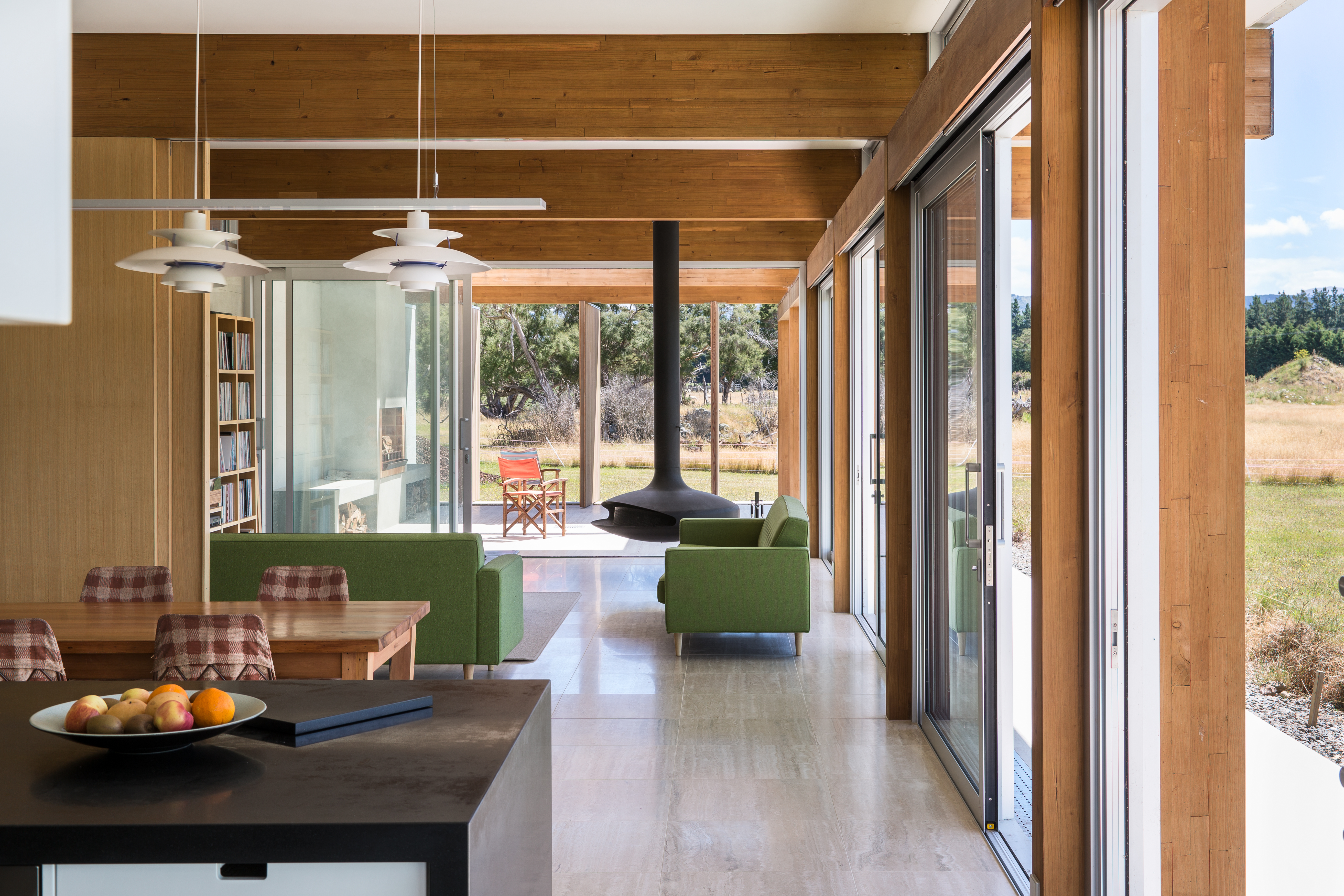 Resting in its rural environment this low slung pavilion-like house responds to the client’s wishes for a modernist expression with minimalist detailing and expansive views to its site and beyond. The primary structure is grounded off in-situ exposed concrete walls that define the main spine. The layering of these walls with areas of cedar cladding and carefully crafted joinery insertions creates a composition that belies its simplicity. Although fully glazed between the posts, the eave overhangs combined with the passive and active solar technologies ensure that this highly thought-through home is a joy to live in year round.