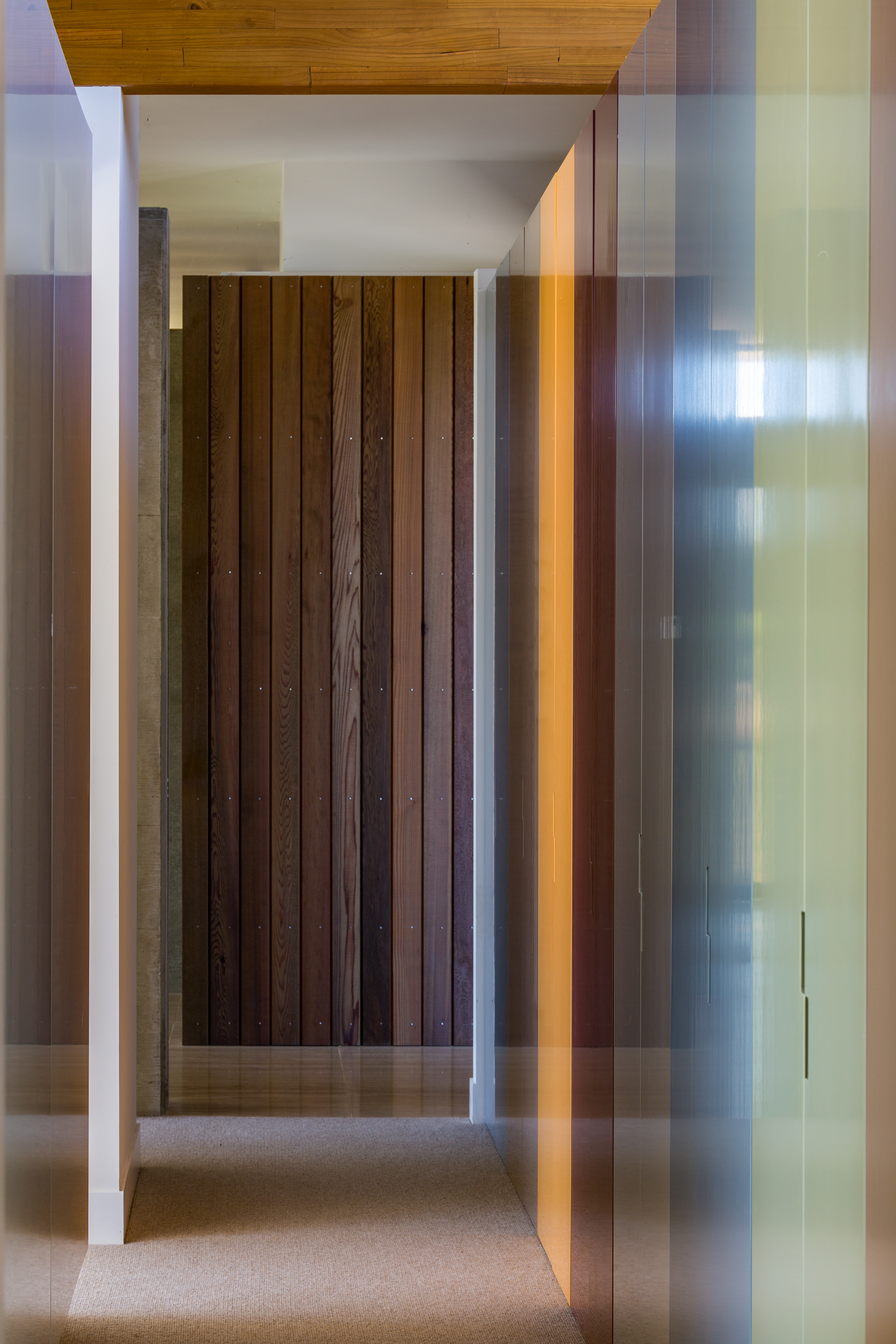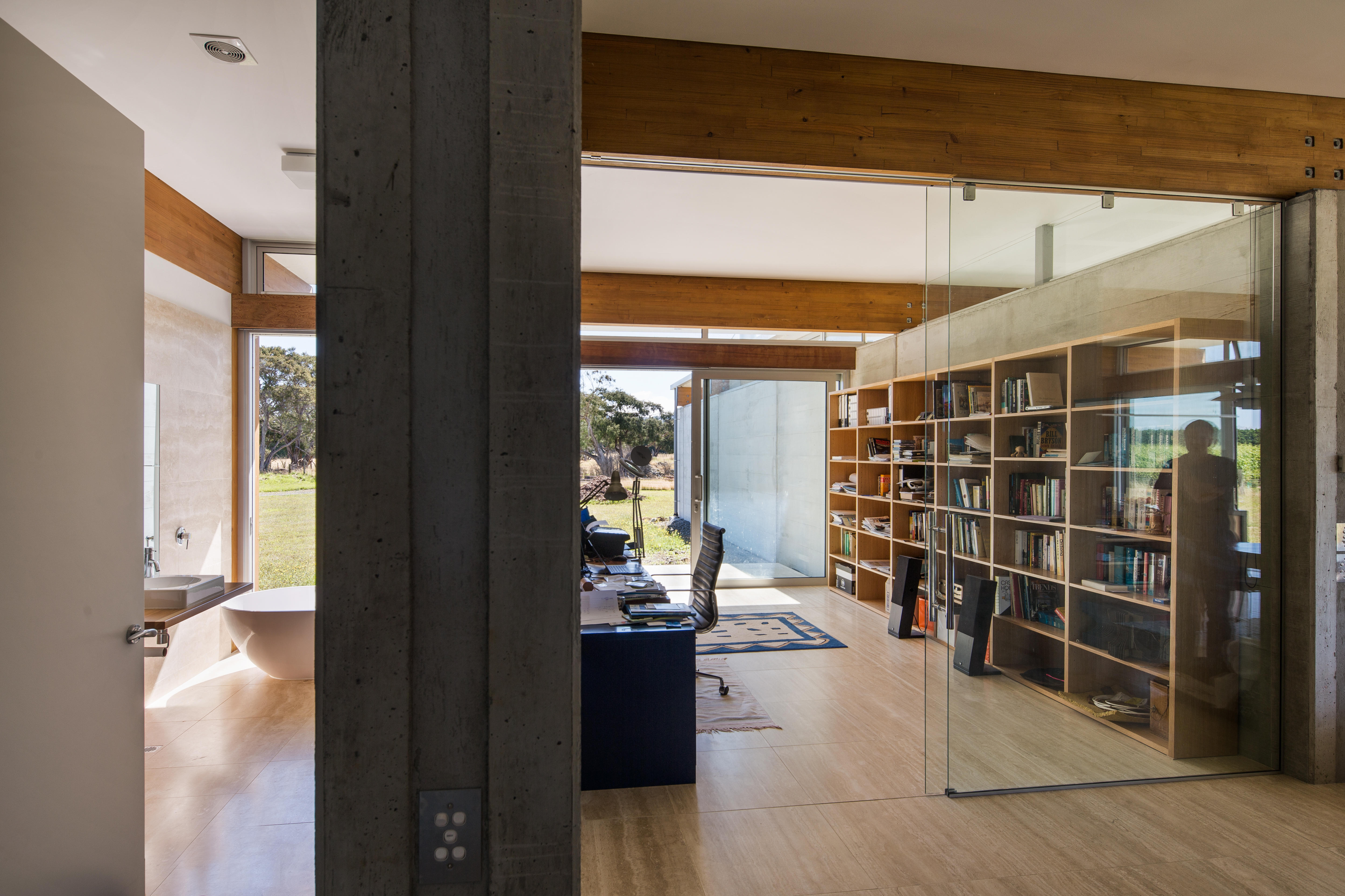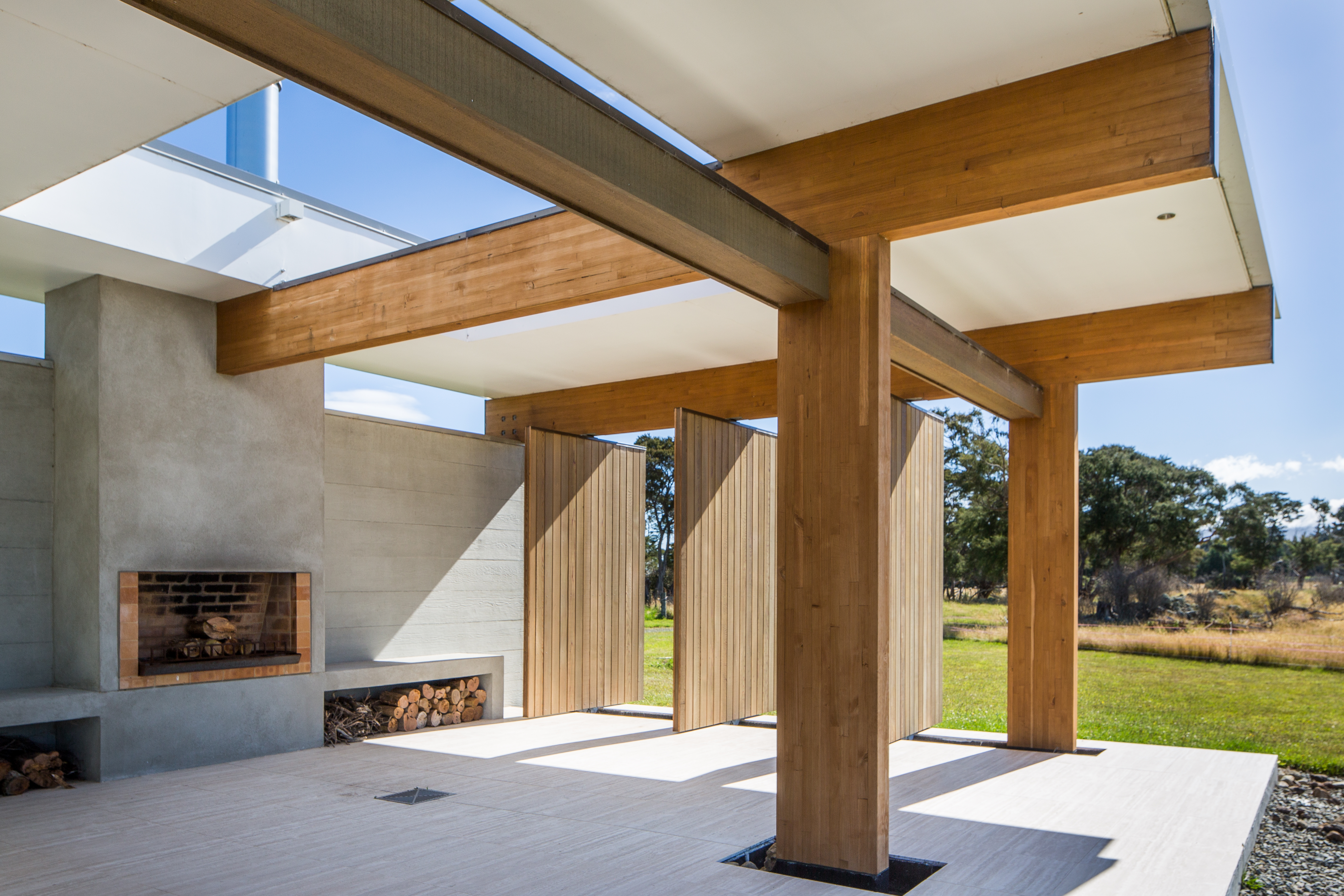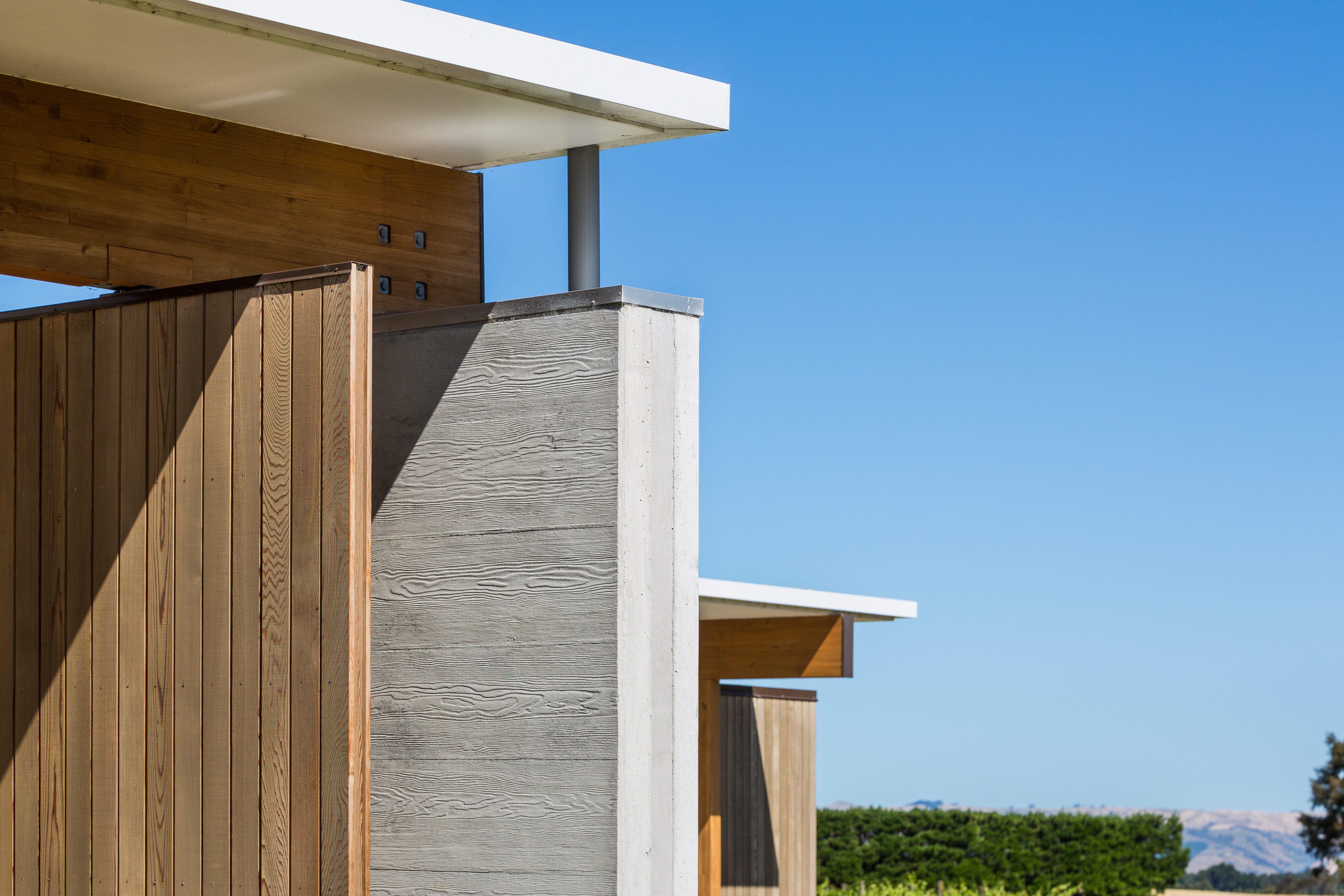 Resting in its rural environment this low slung pavilion-like house responds to the client’s wishes for a modernist expression with minimalist detailing and expansive views to its site and beyond. The primary structure is grounded off in-situ exposed concrete walls that define the main spine. The layering of these walls with areas of cedar cladding and carefully crafted joinery insertions creates a composition that belies its simplicity. Although fully glazed between the posts, the eave overhangs combined with the passive and active solar technologies ensure that this highly thought-through home is a joy to live in year round.