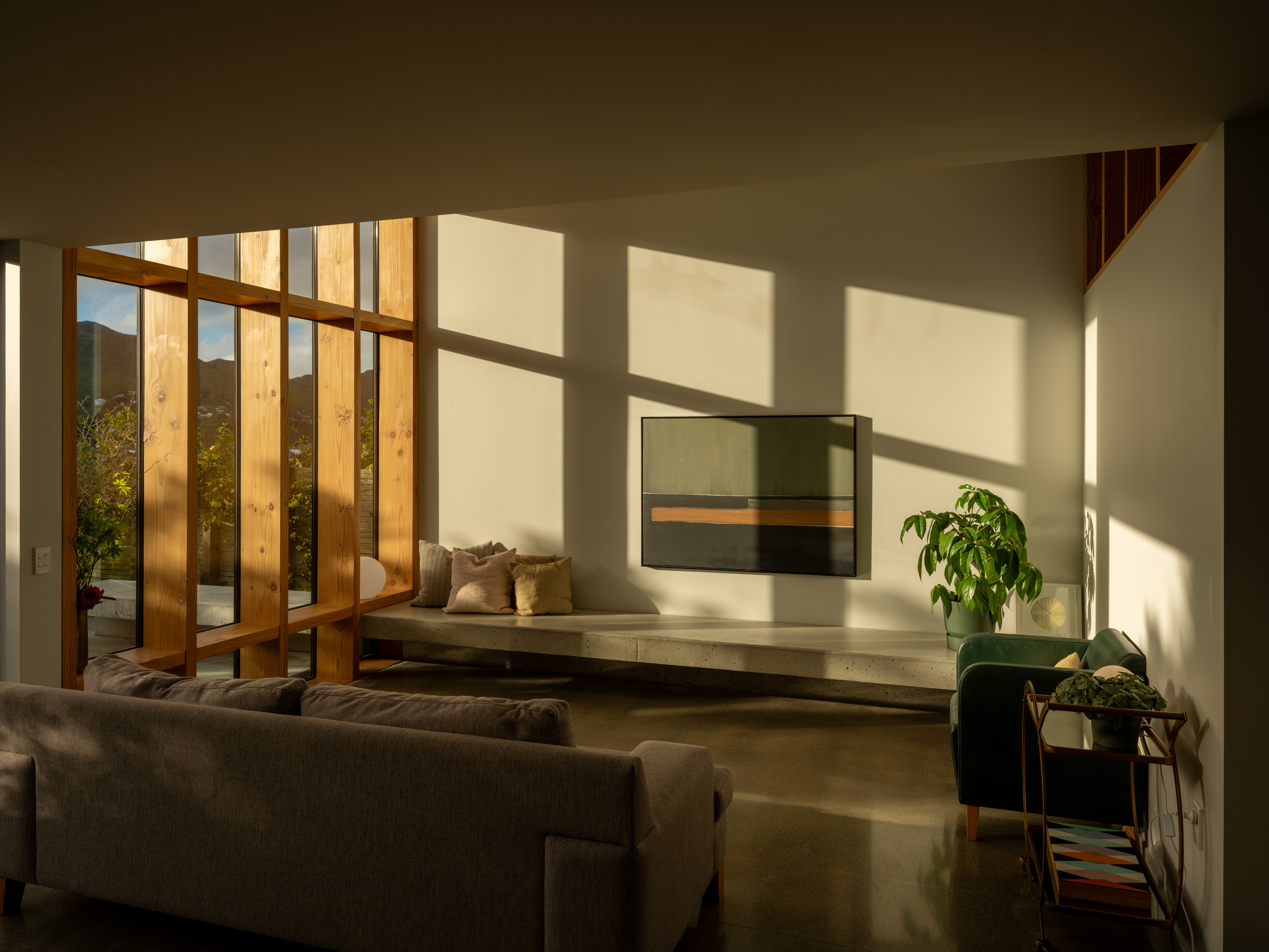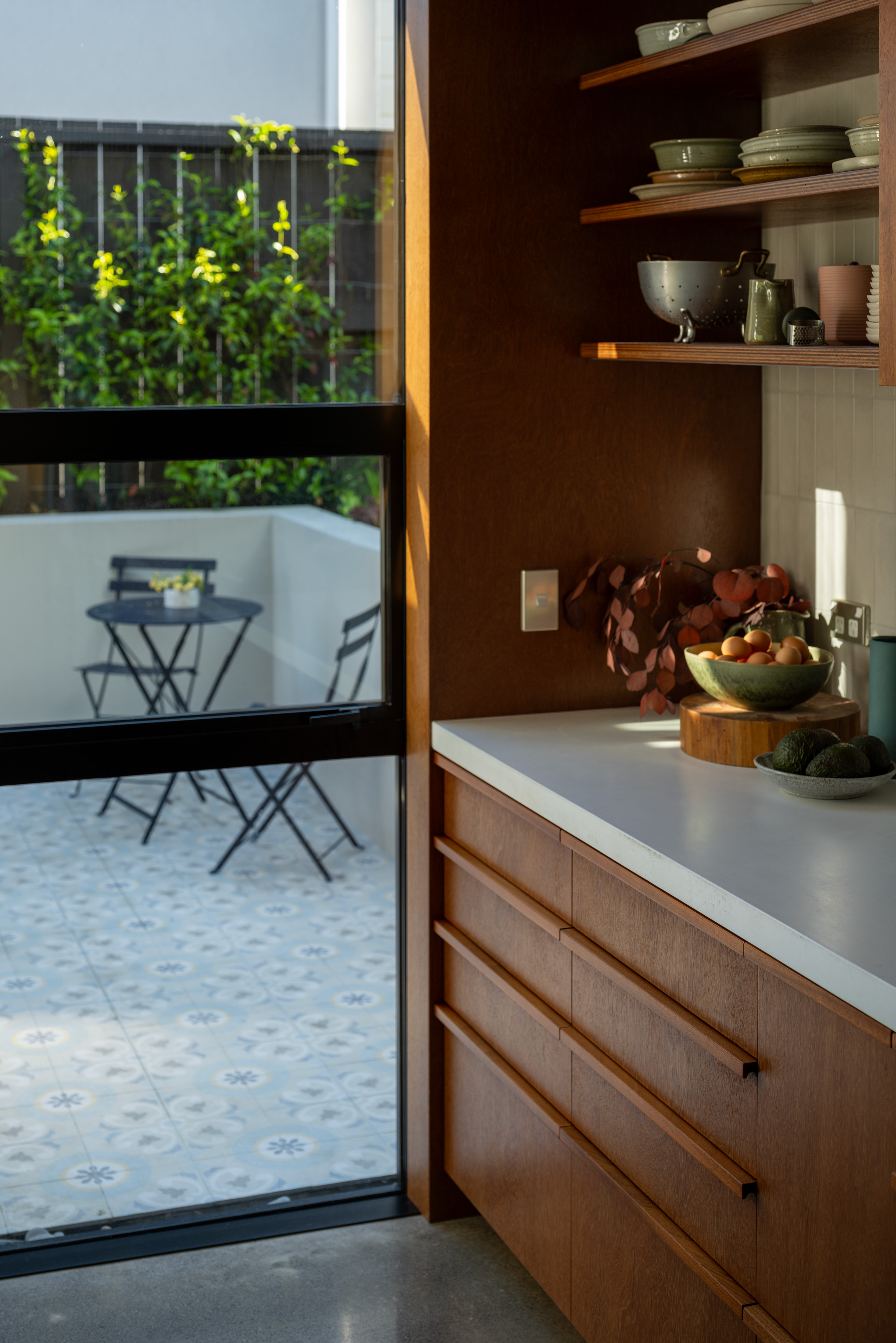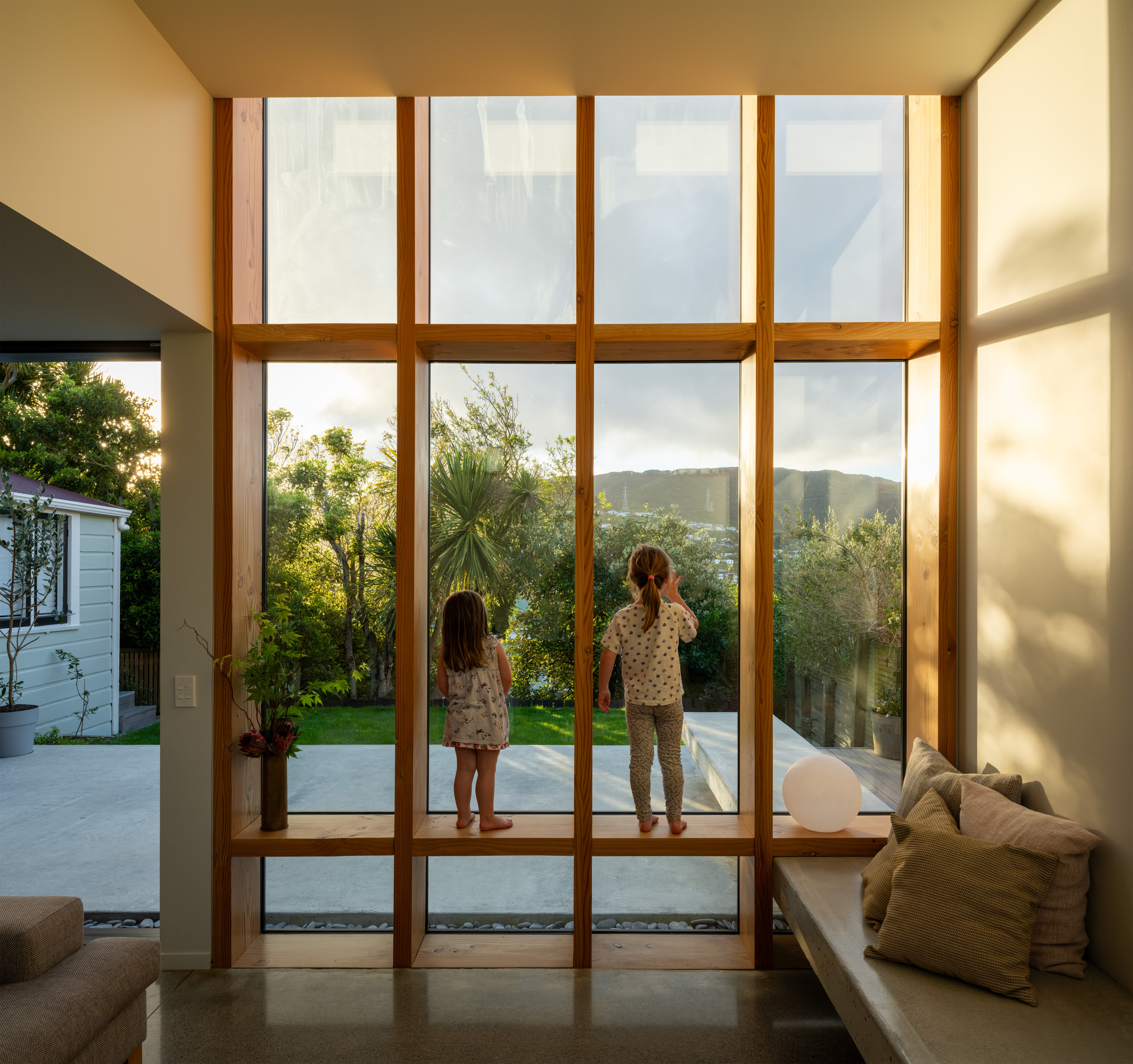 A villa renovation and extension accommodate the needs of a growing family now and into the future. Clever architectural thinking considers the steep site and aspect, creating intriguing, sun-filled volumes with new living, dining, kitchen and utility areas. Progression from the street through the existing villa and down the stairs to the new family areas is a sophisticated strategy of three-dimensional play. New windows frame the bush views beyond and successfully interlock old and new. Delight is brought to everyday living, with a morning courtyard providing an outdoor room, and the over-height glazed Douglas fir window frame providing depth, richness and a playful place to perch.