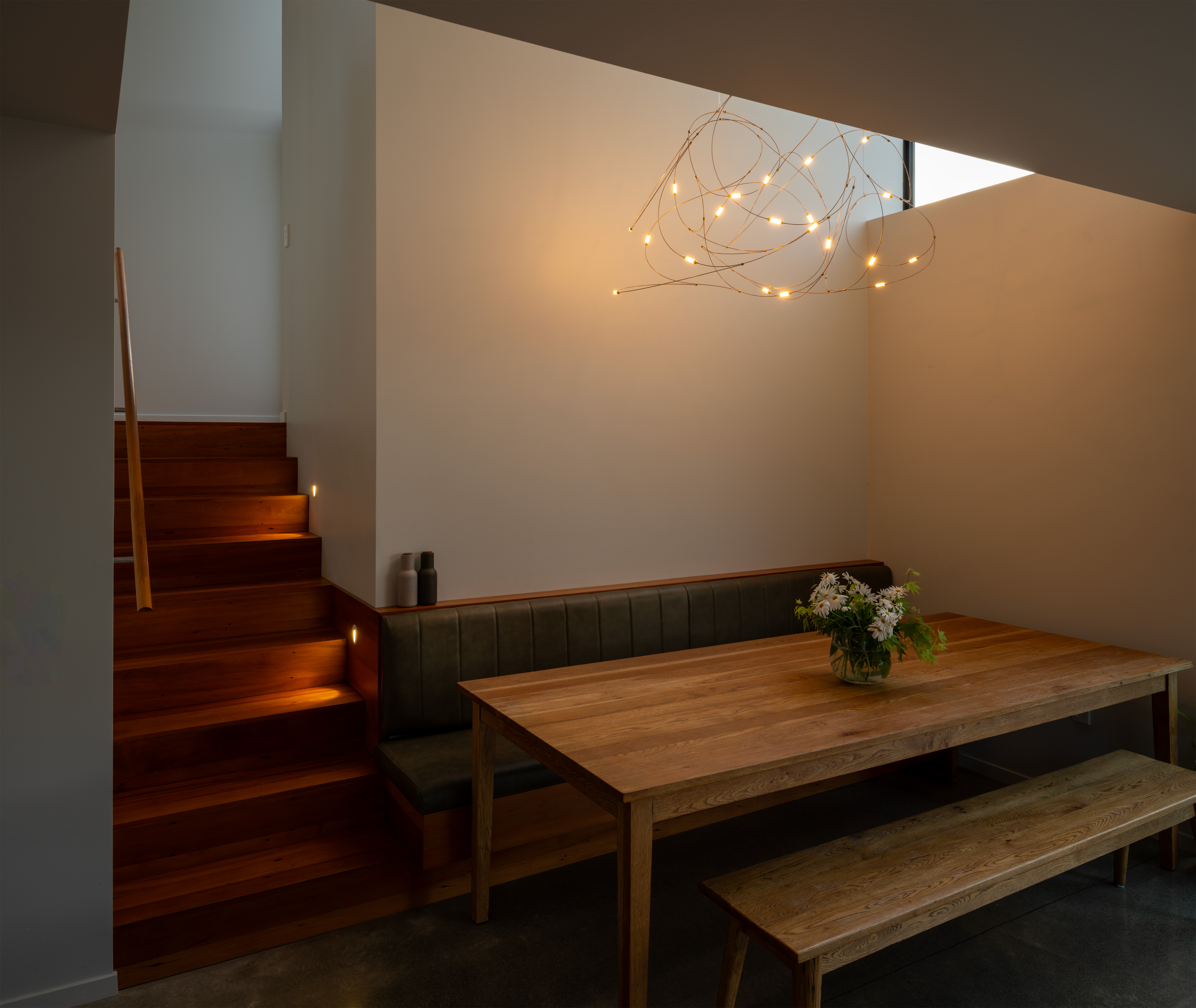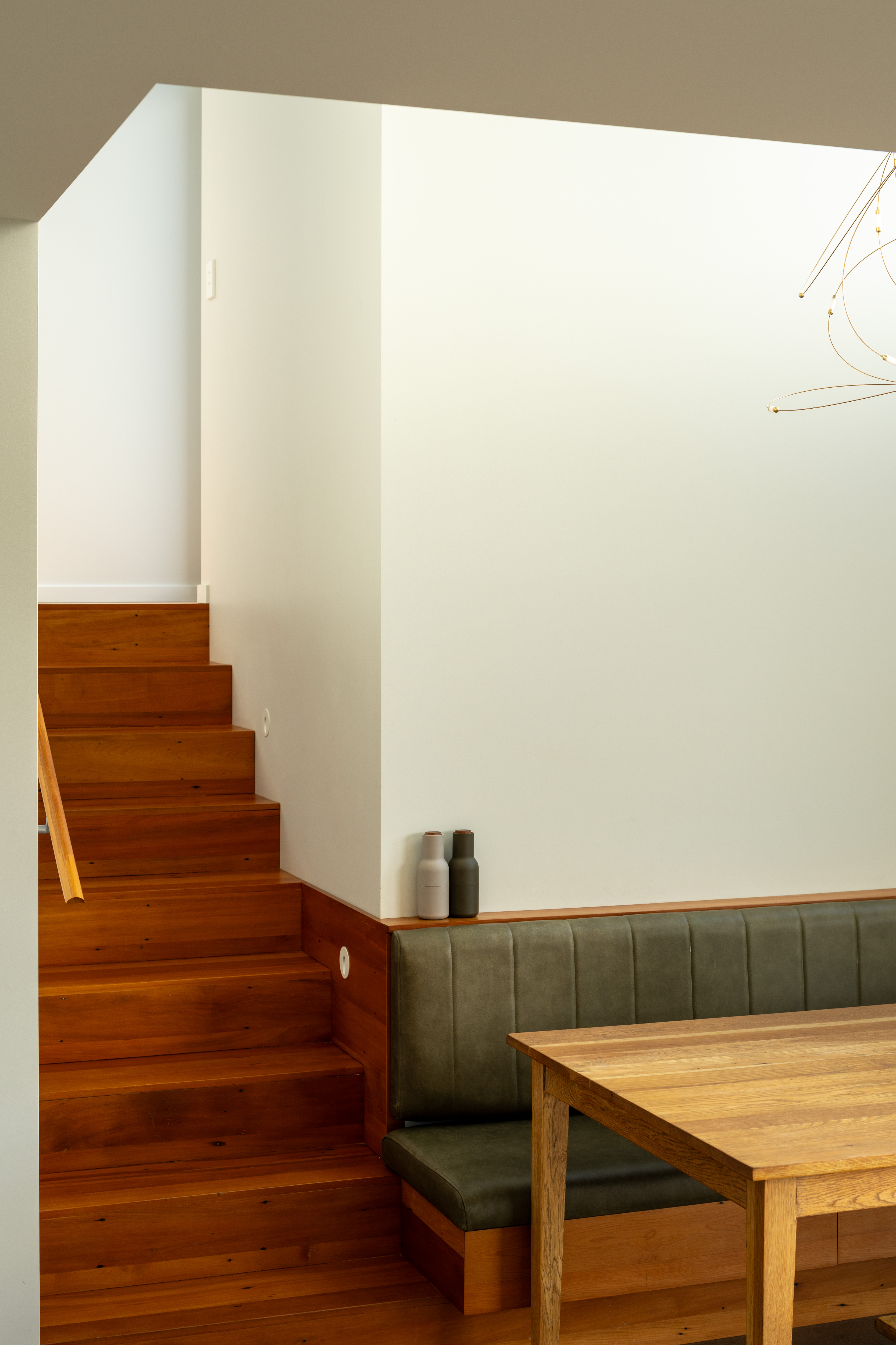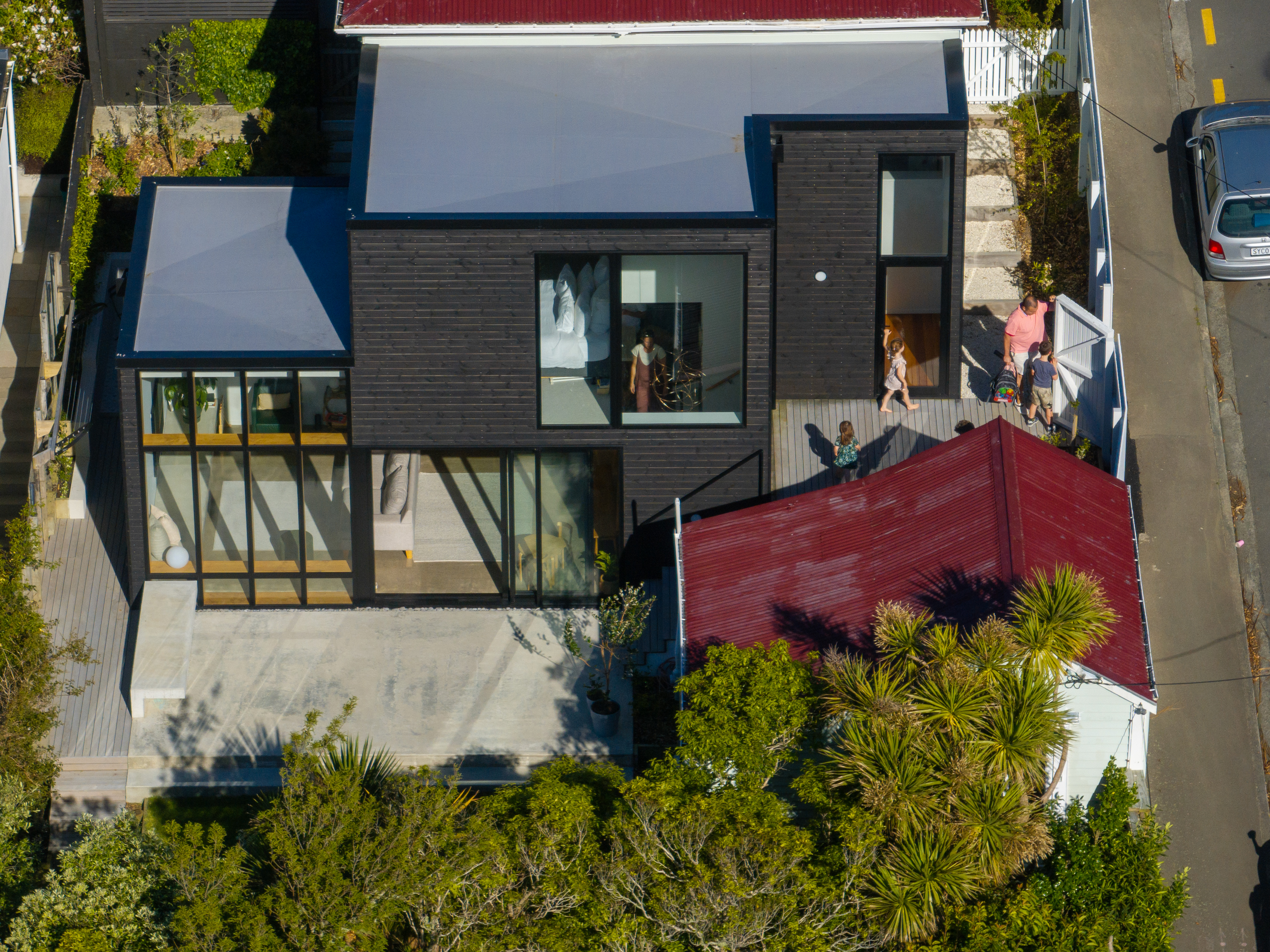 A villa renovation and extension accommodate the needs of a growing family now and into the future. Clever architectural thinking considers the steep site and aspect, creating intriguing, sun-filled volumes with new living, dining, kitchen and utility areas. Progression from the street through the existing villa and down the stairs to the new family areas is a sophisticated strategy of three-dimensional play. New windows frame the bush views beyond and successfully interlock old and new. Delight is brought to everyday living, with a morning courtyard providing an outdoor room, and the over-height glazed Douglas fir window frame providing depth, richness and a playful place to perch.