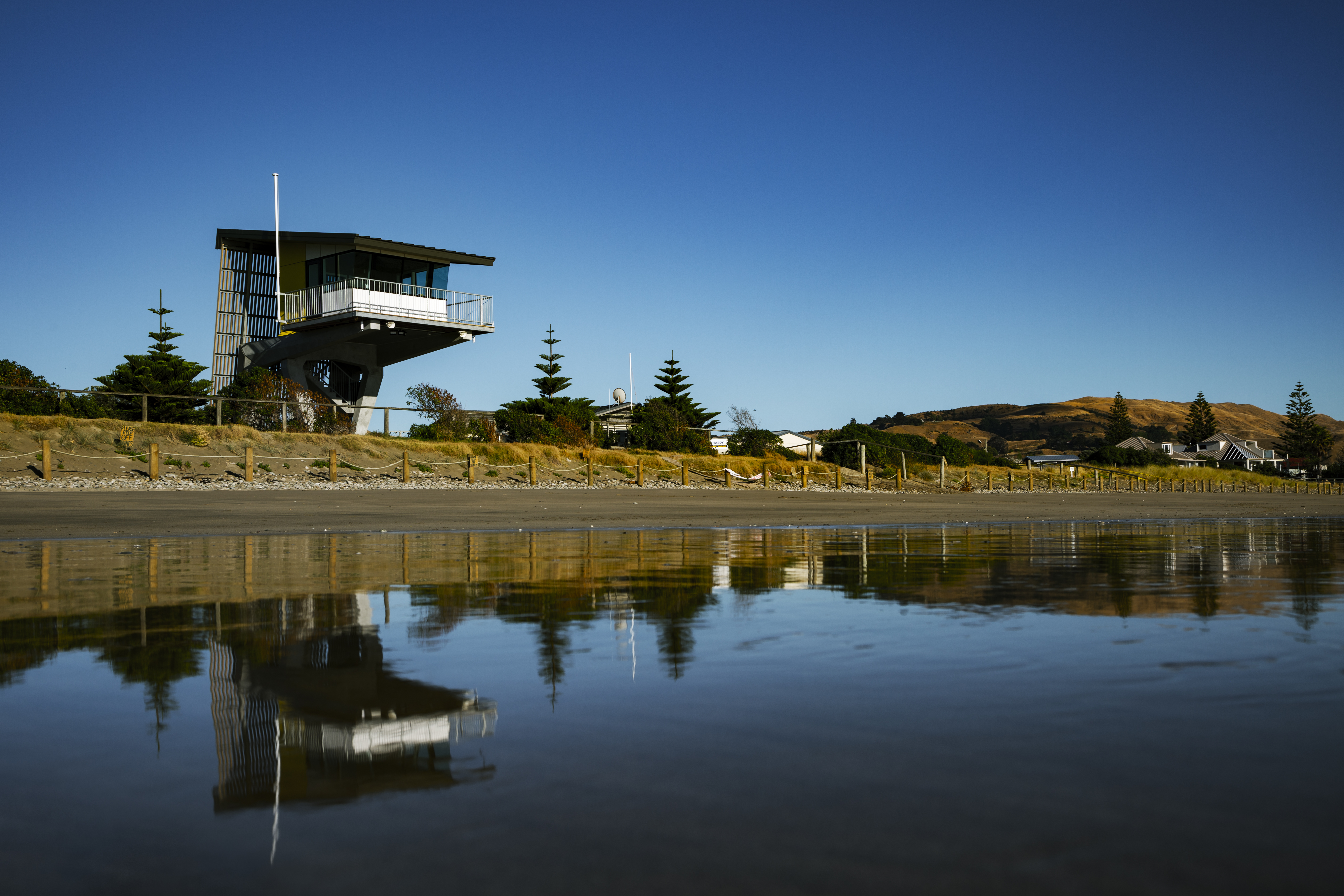 Form, function and fun combine in this dynamic cantilevered building perched on the edge of the Waimarama dunes. The visual strength and positioning of the structure oozes confidence and control with all sightlines open for the surf-life saving club members, while allowance is made for public walkways that may pass under the building in the future. The colours and materials blend the national surf life saving colours with hardwearing, low-maintenance materials that will enable this important vantage post to remain in place for years to come.