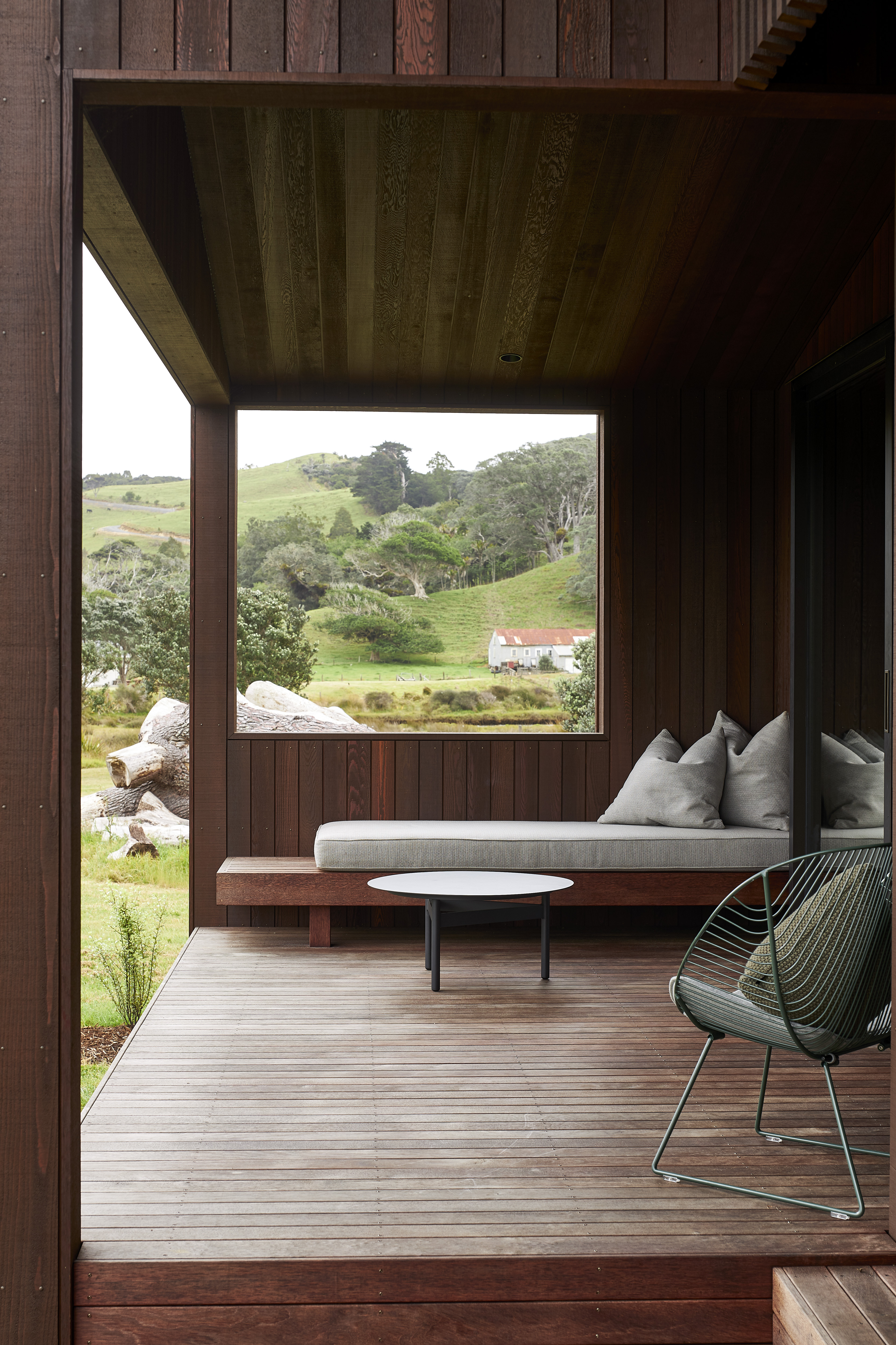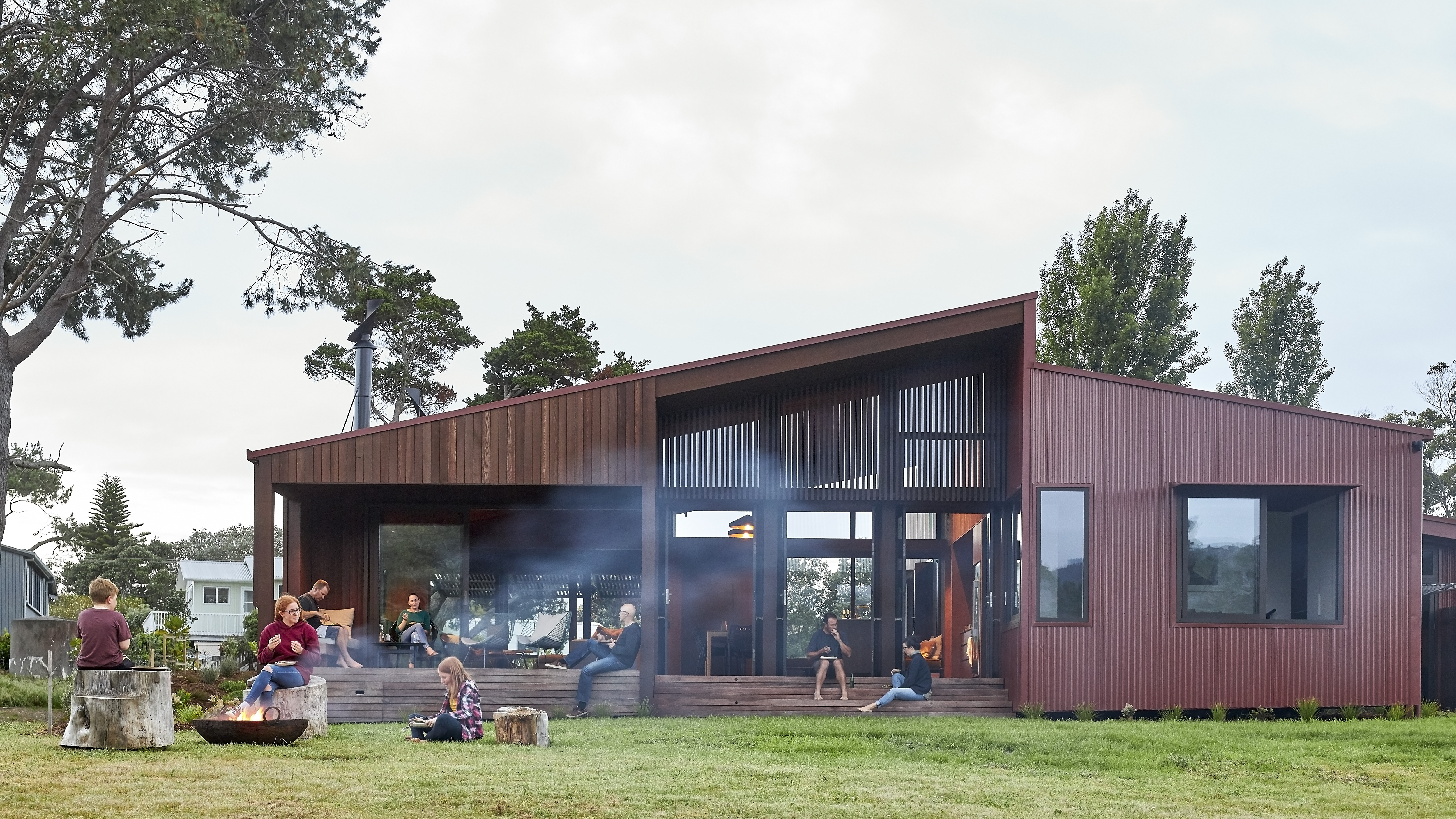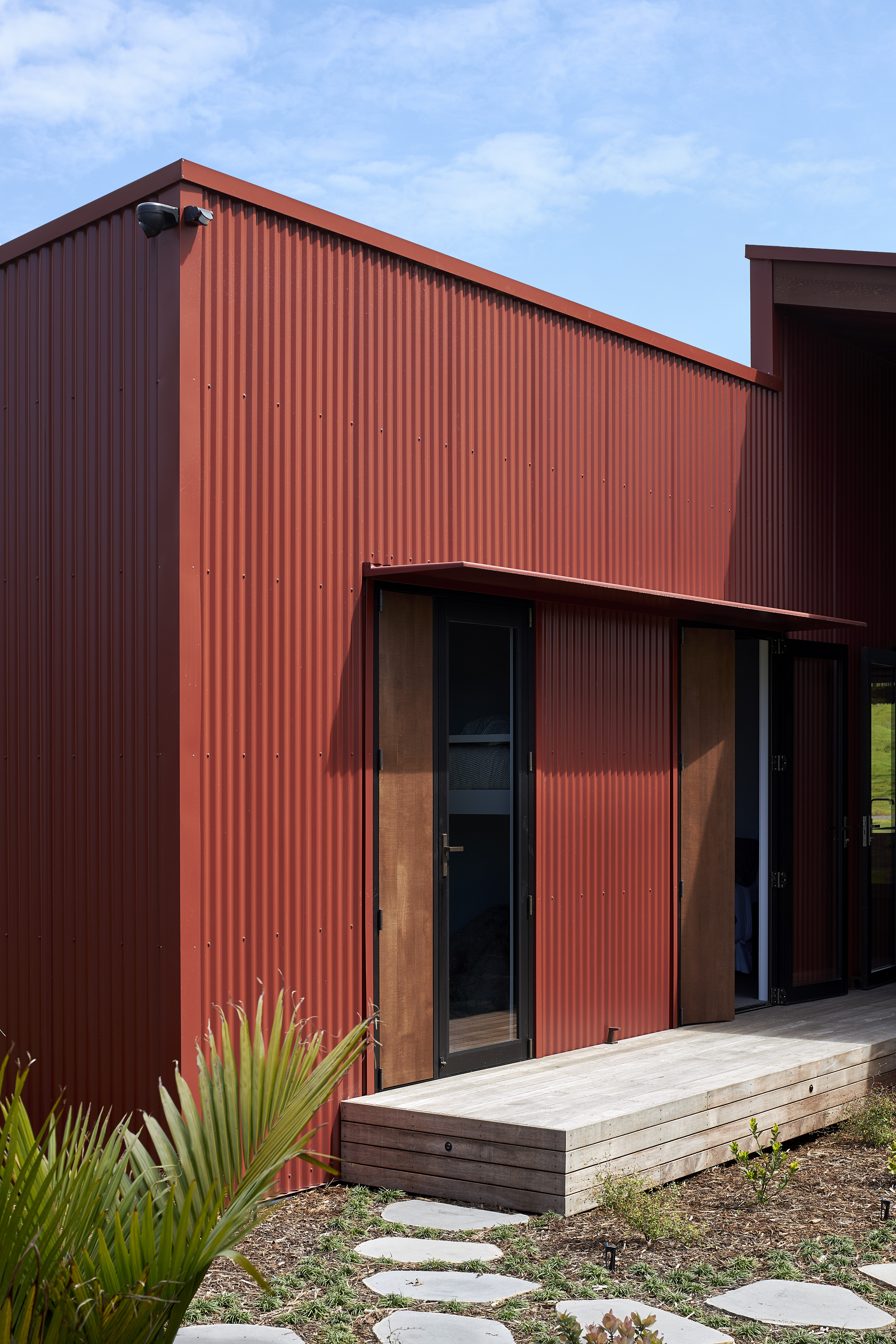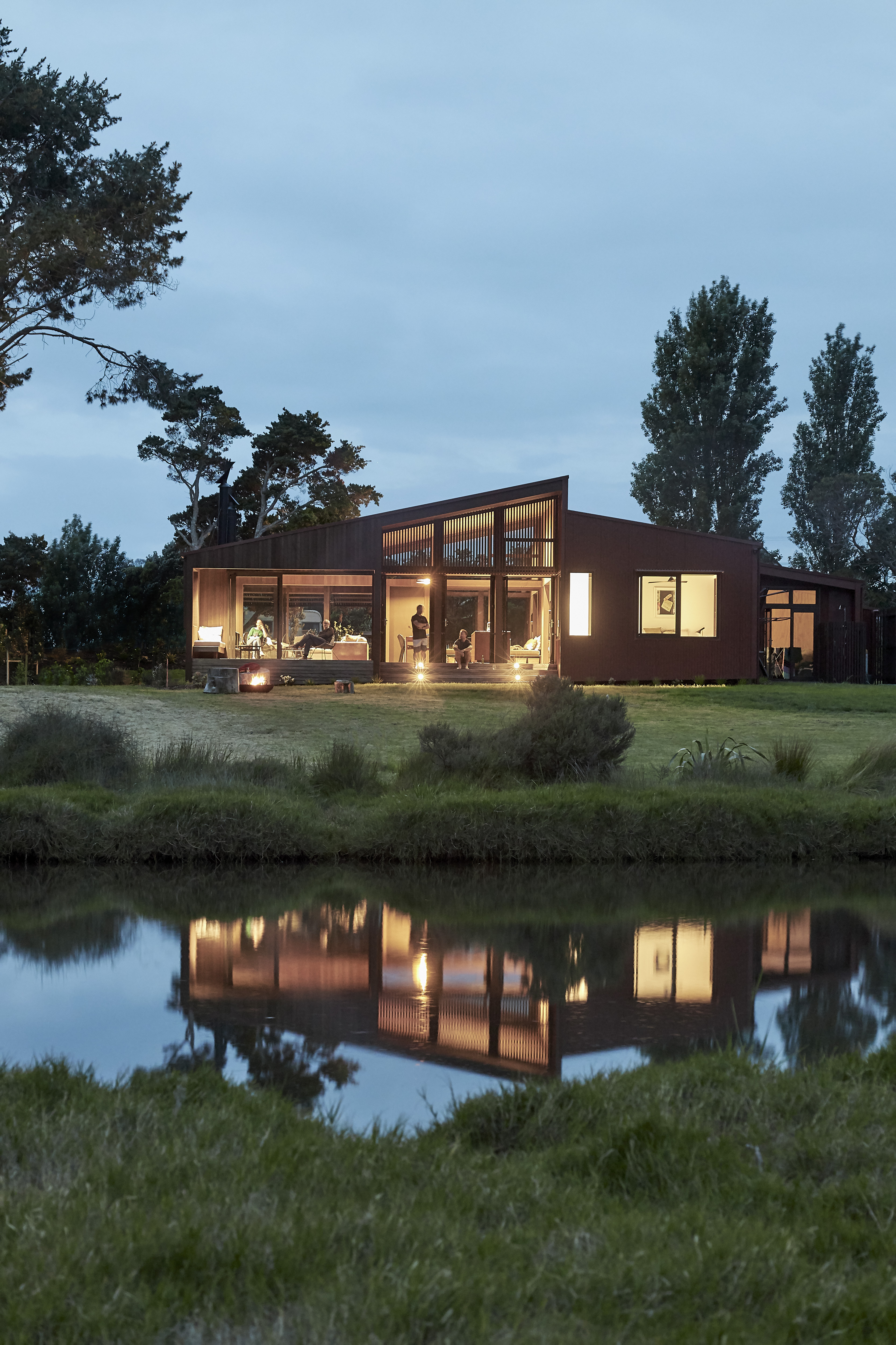 This home speaks to the vernacular of its surroundings, with scoria-red corrugated iron and walnut-stained cedar cladding recalling the classic Kiwi farm shed. The house nestles into its location next to the Pungapunga river and responds sympathetically to the landscape beyond. Everything is considered, from exceptional detailing to spaces that are both functional and inviting; from multi-use bedrooms to an open-plan entertaining area. Outdoor rooms with screen actuators mimic the ritualistic aspects of camping while retaining access to the comforts of modern living.