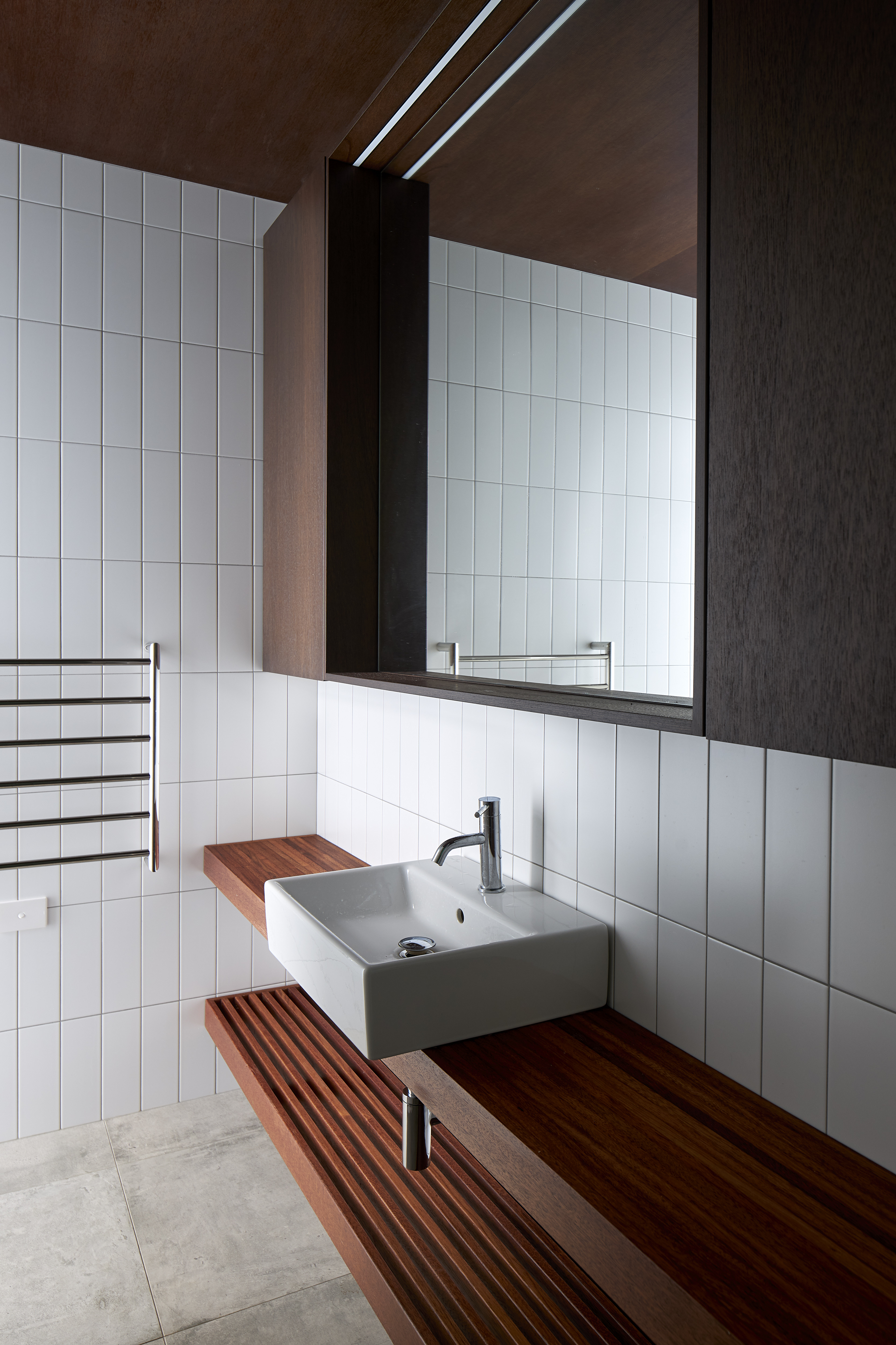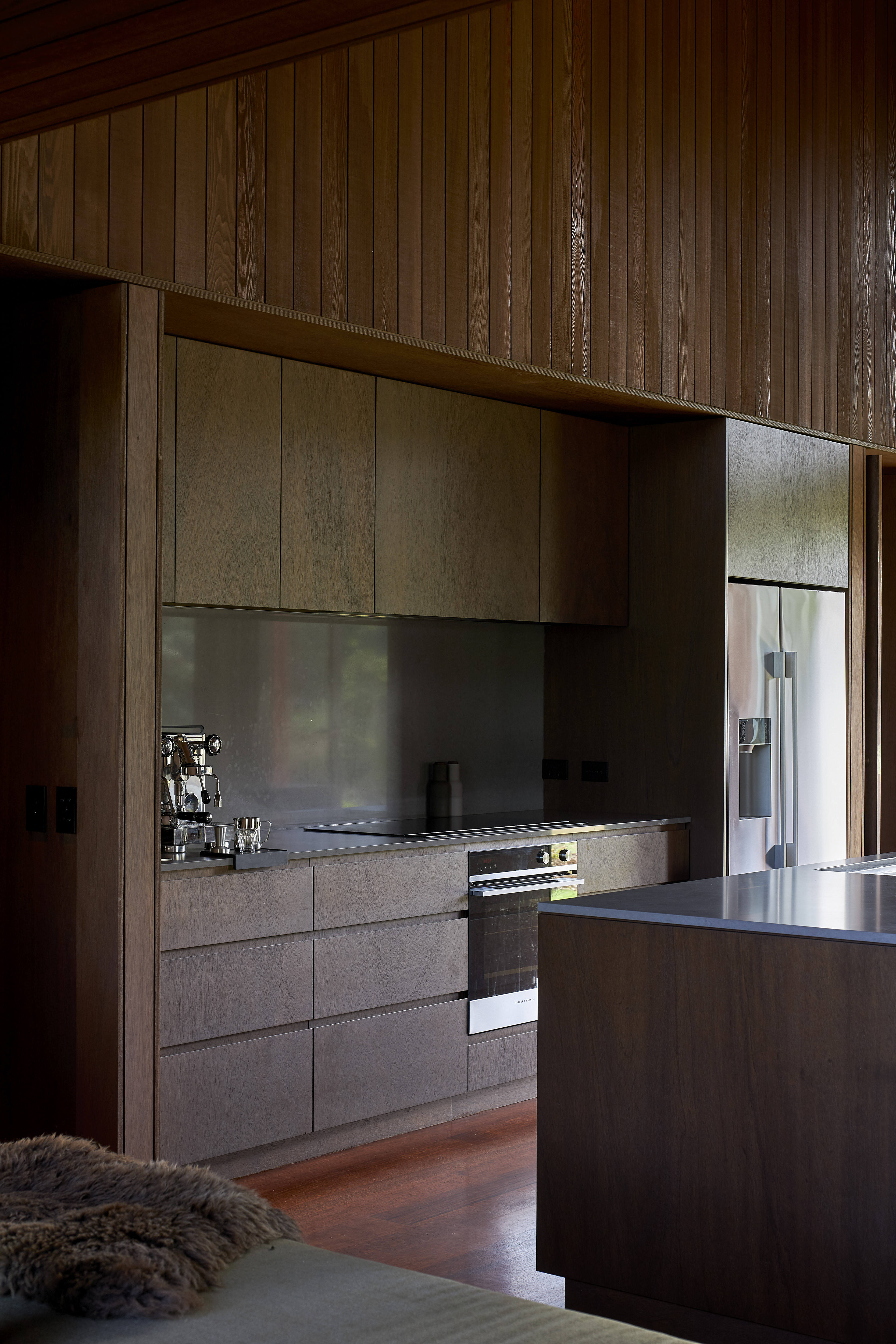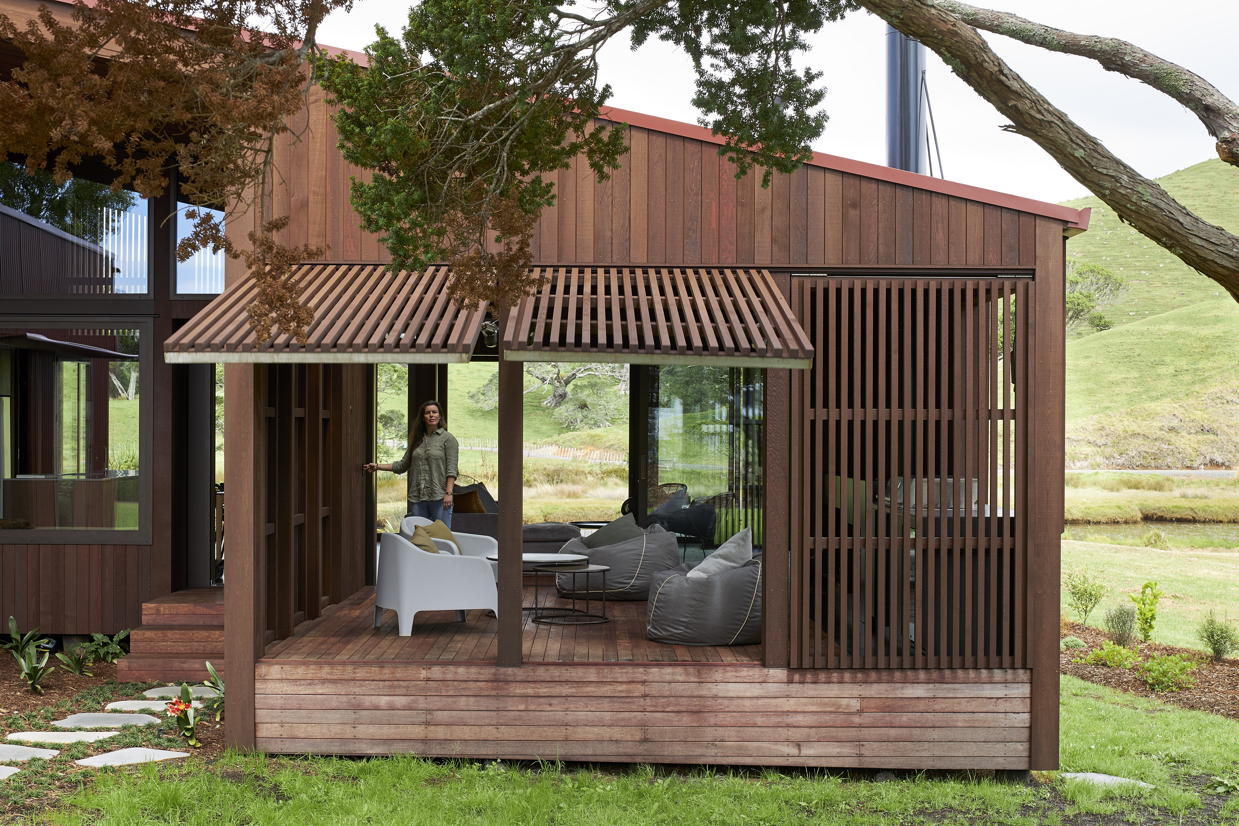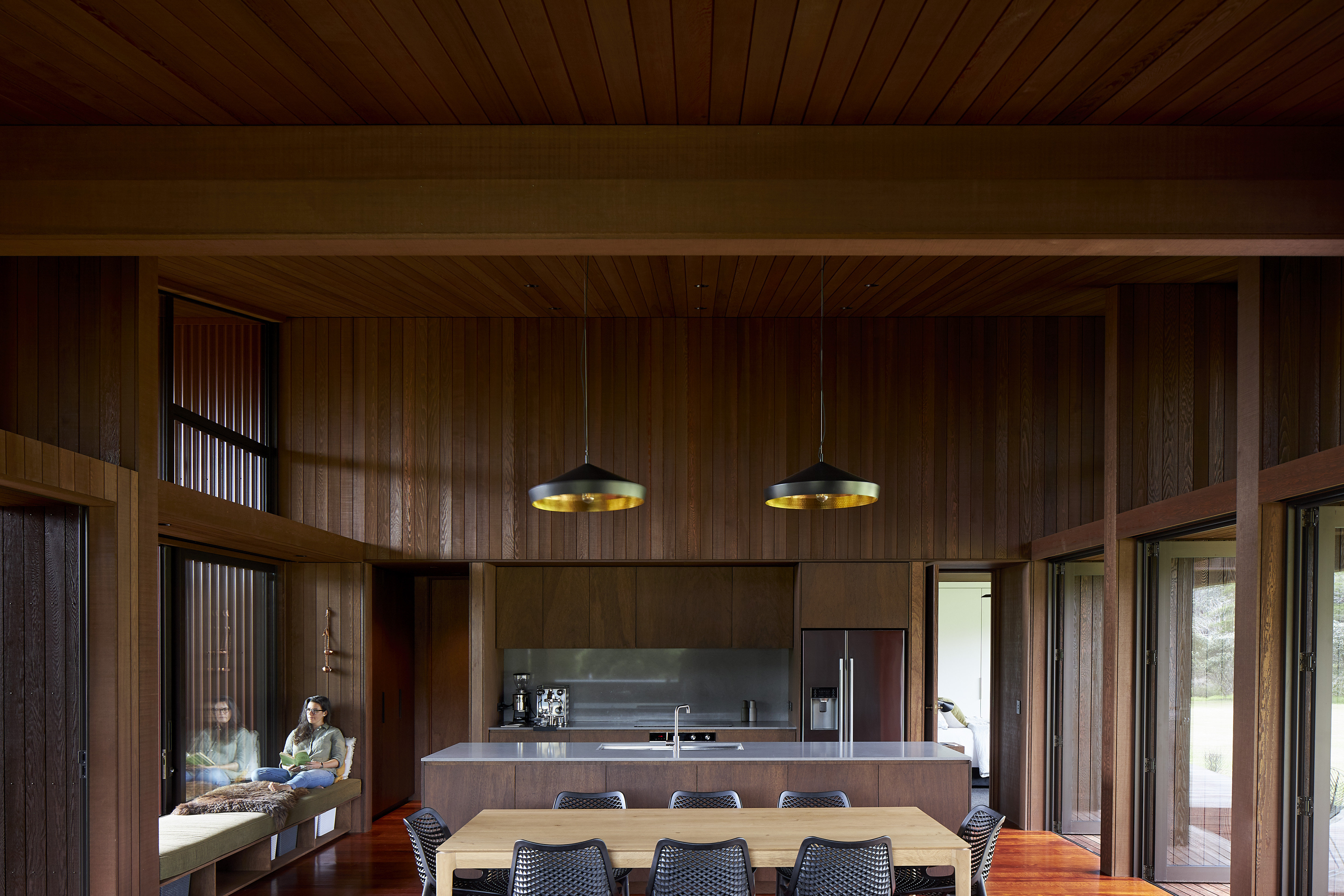 This home speaks to the vernacular of its surroundings, with scoria-red corrugated iron and walnut-stained cedar cladding recalling the classic Kiwi farm shed. The house nestles into its location next to the Pungapunga river and responds sympathetically to the landscape beyond. Everything is considered, from exceptional detailing to spaces that are both functional and inviting; from multi-use bedrooms to an open-plan entertaining area. Outdoor rooms with screen actuators mimic the ritualistic aspects of camping while retaining access to the comforts of modern living.