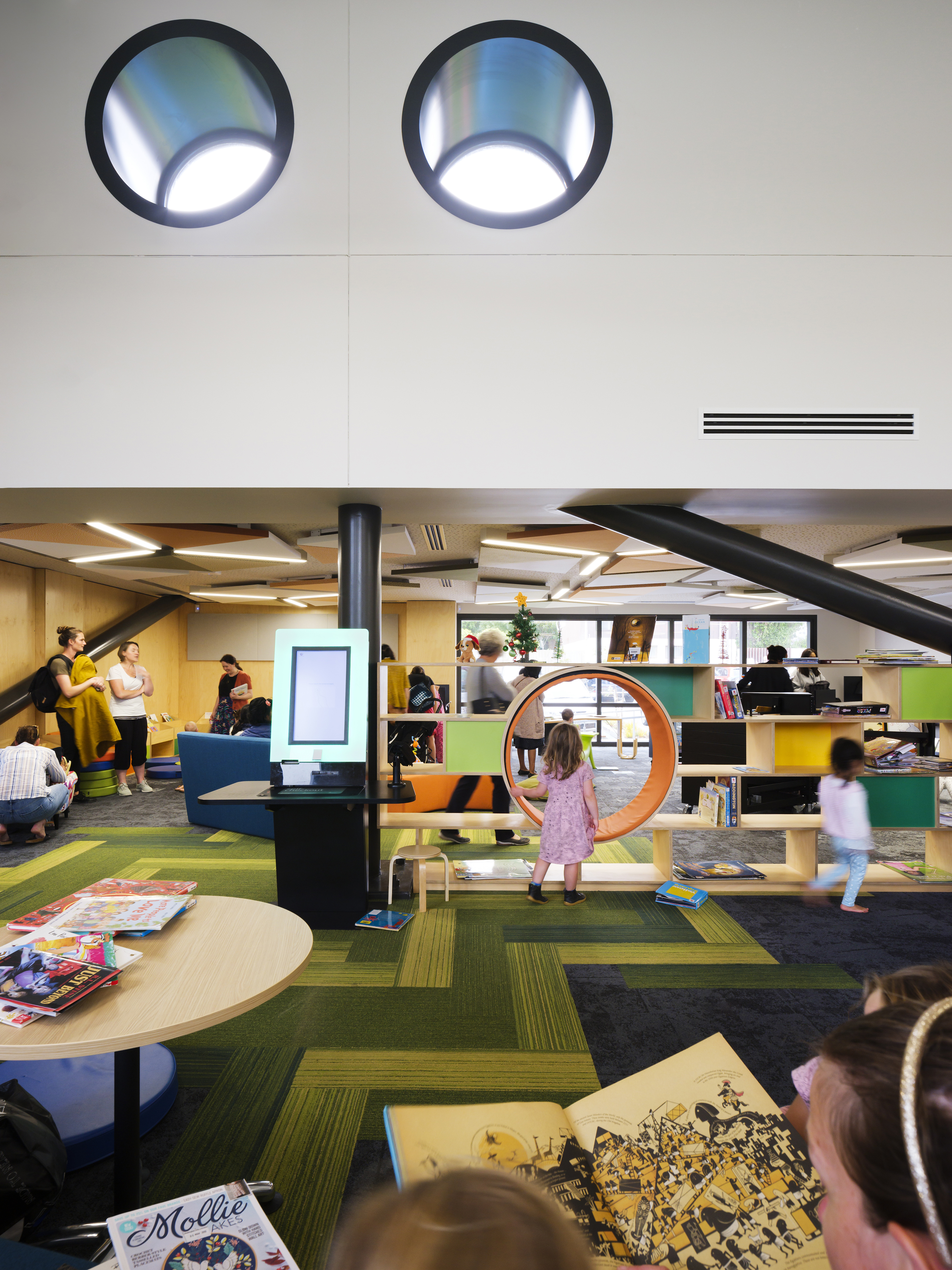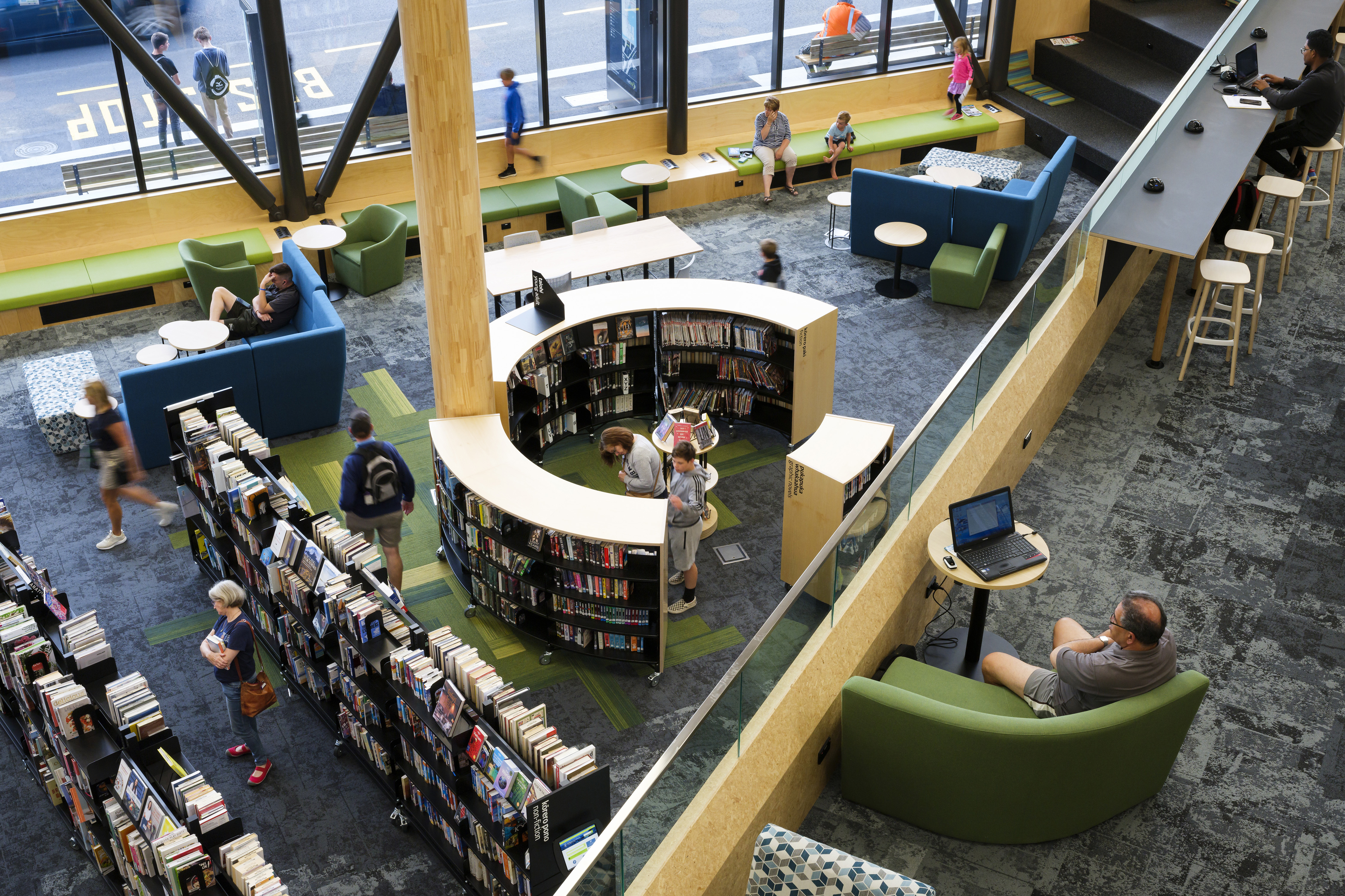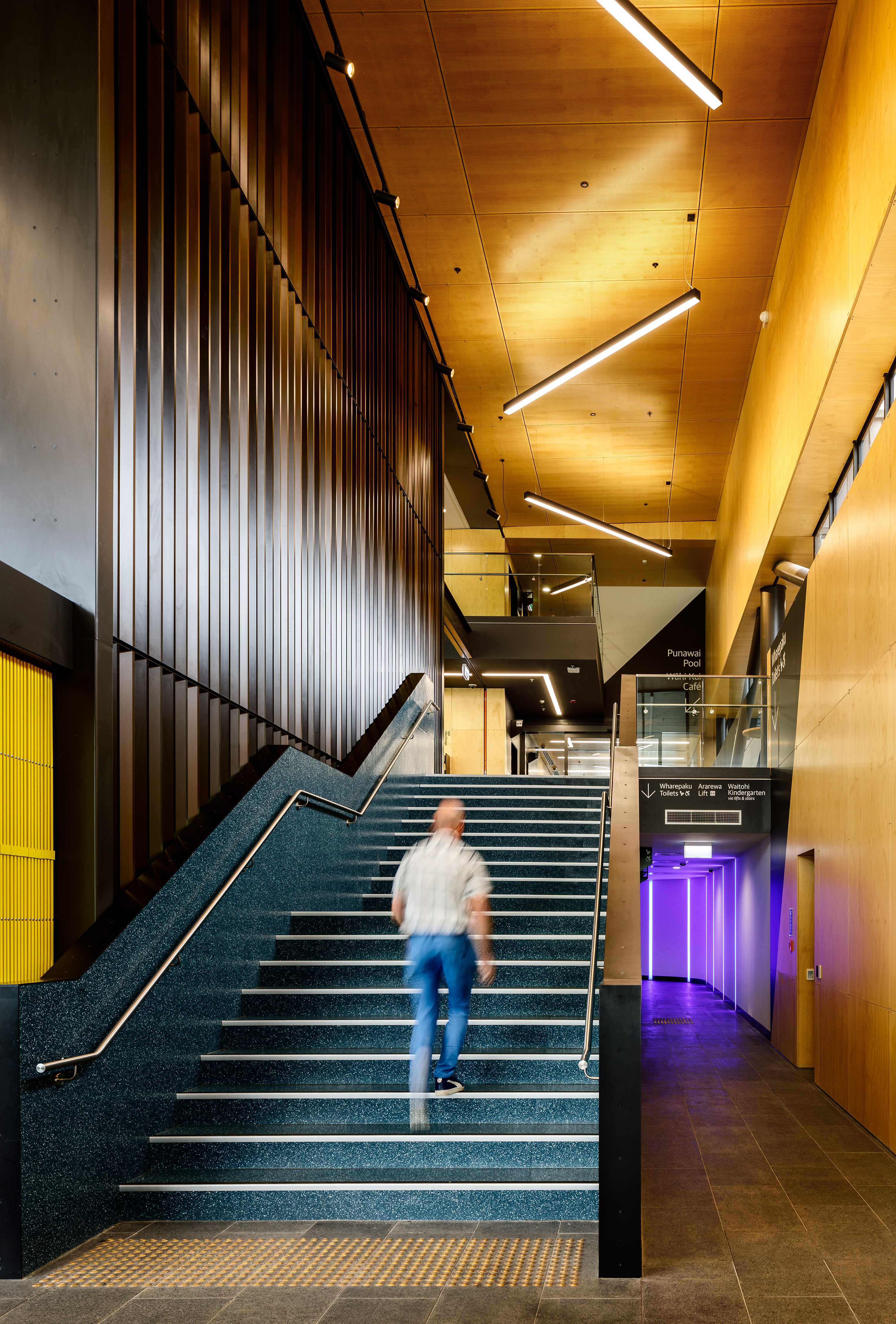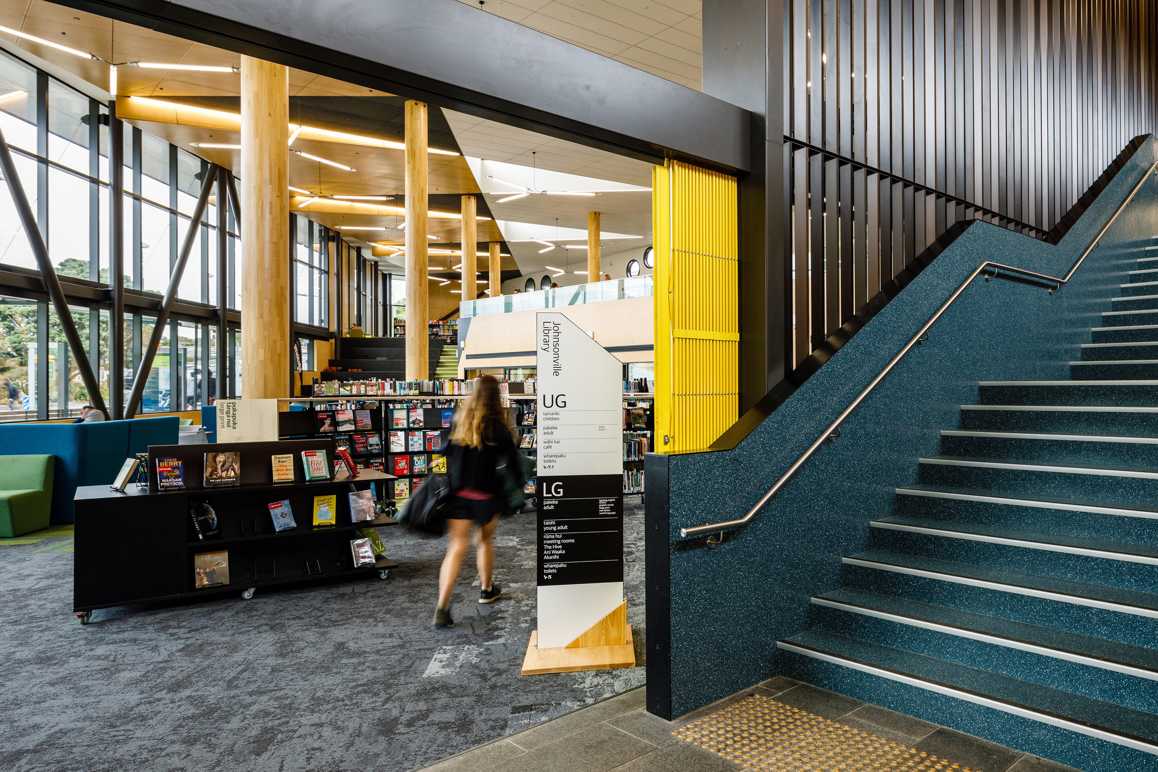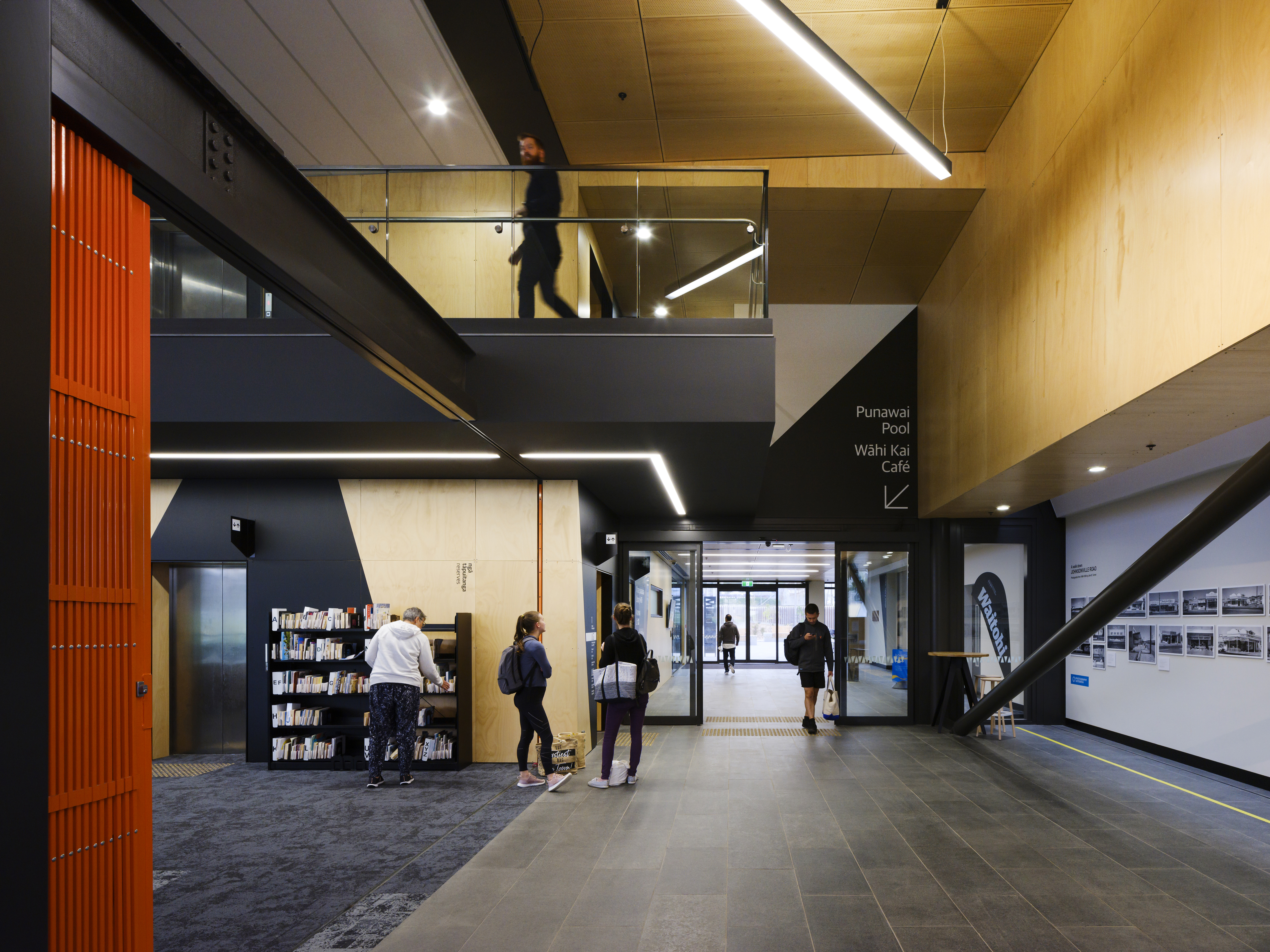 By using the original landscape of Johnsonville as a starting point, a confident tectonic architectural language has been developed at Waitohi. The result is an interior with a clear hierarchy of zones, circulation and vibrant multi-level connections. The architects’ creation of a range of spatial experiences showcases their consistent attention to materials and concern for the human scale; shifts between these spaces are carried out with expertise and clarity. As a result, the library’s many and varied places to sit, meet, read, work and play have become a visible source of lively activity for the adjacent streets. This is an uplifting public interior that forms a rich backdrop for a wide range of community uses.