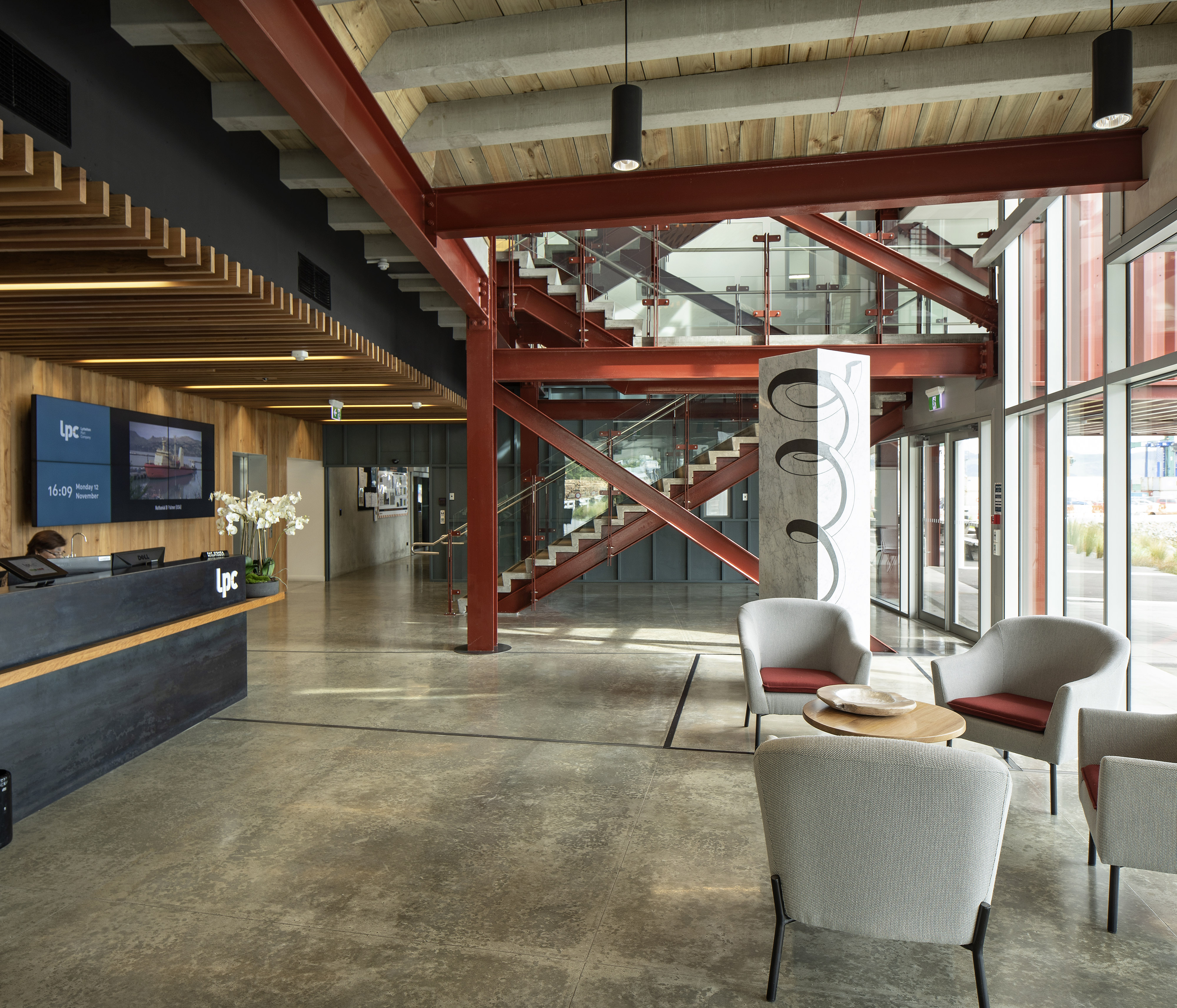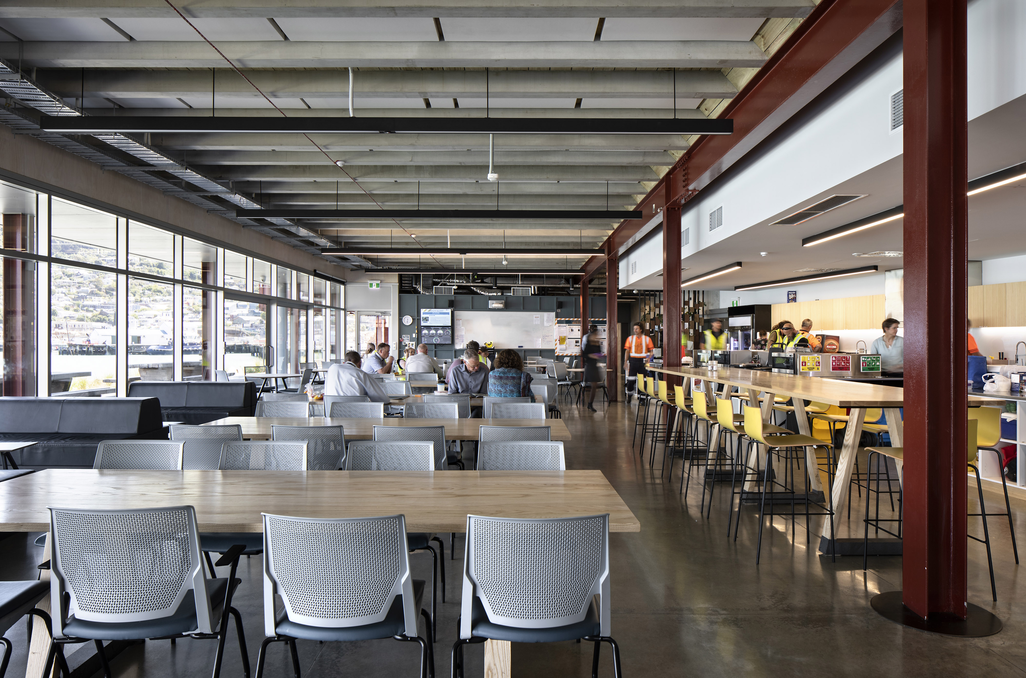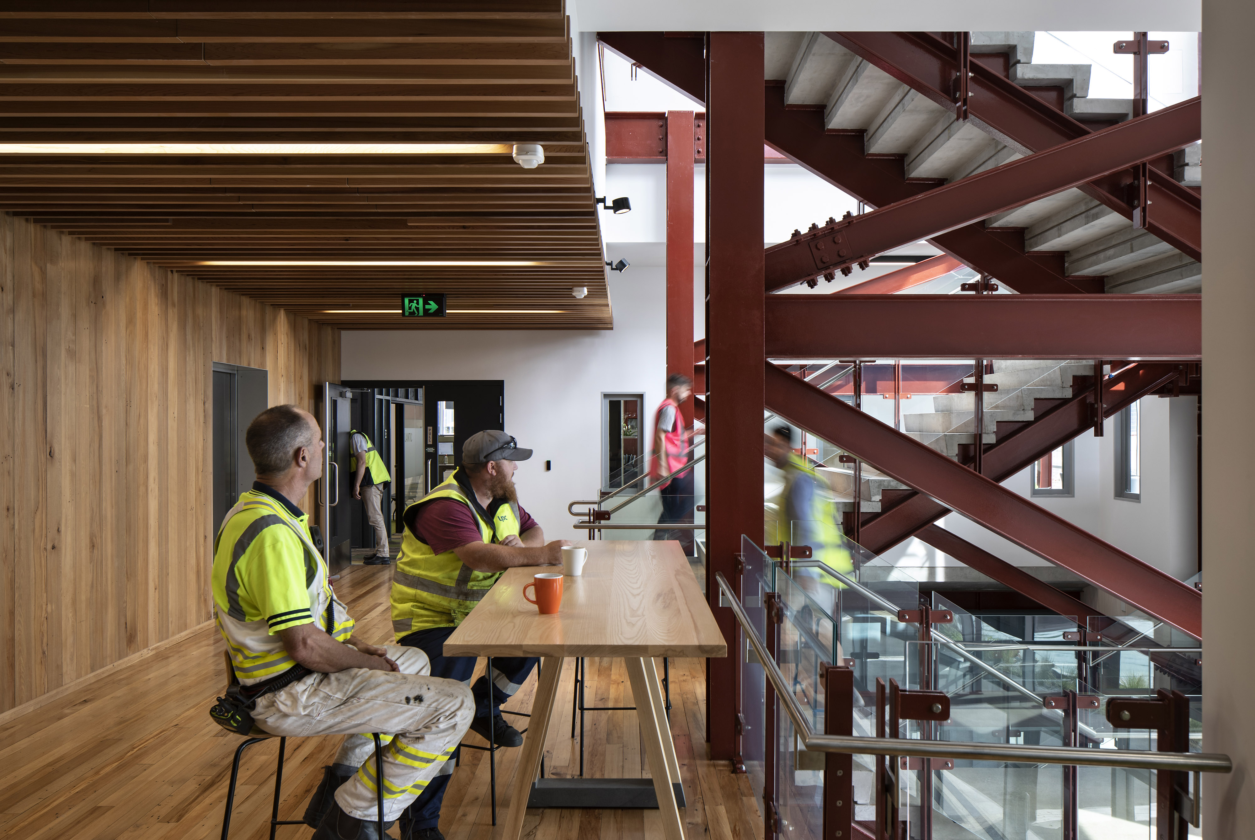 A stripped back interior has been carefully coloured with harbour tones and textures, promoting a playful melding of structure and surface. Stacking and shifting interior functions with greater intensity around the stair emphasises user exchange, while relaxed interior planning along the façades provides space for co-working and contemplation of the surrounding landscape. The selection of warm, inviting and environmentally friendly materials also promotes a ‘greener’ sense of place within the industrial context.