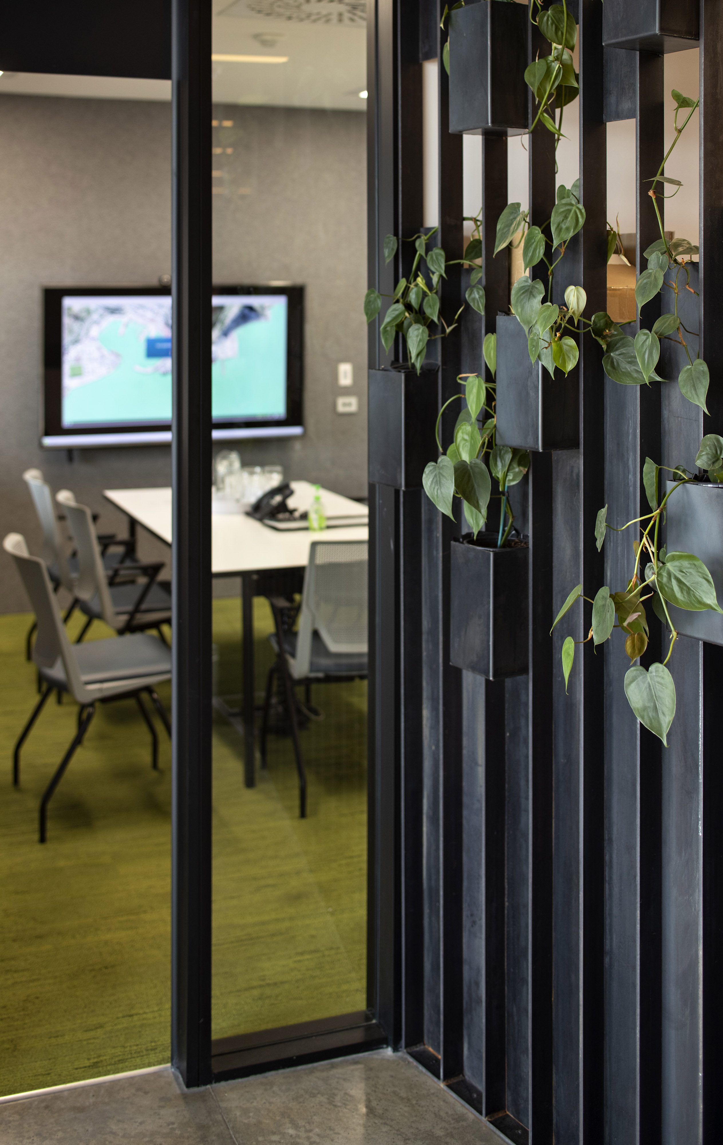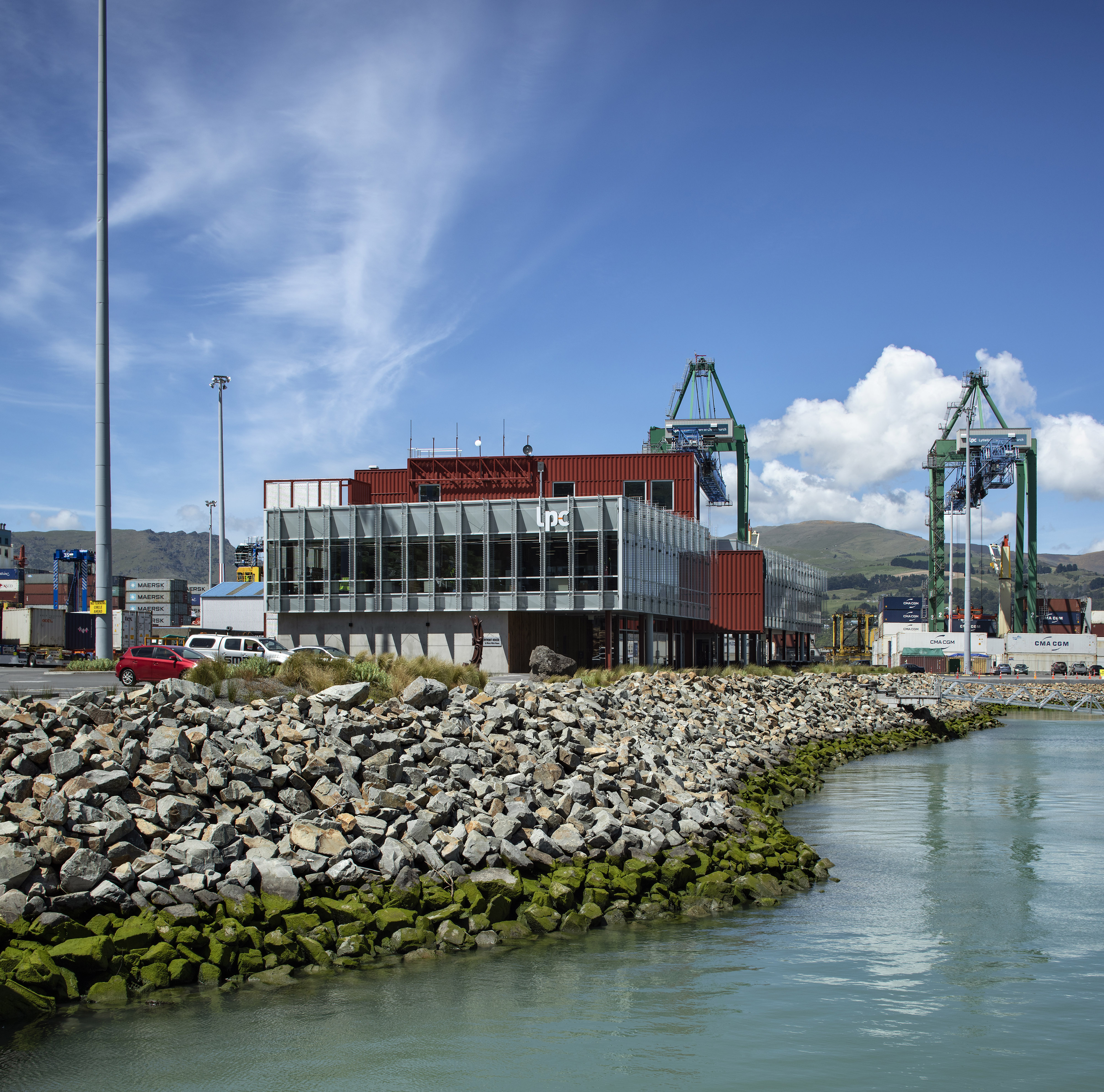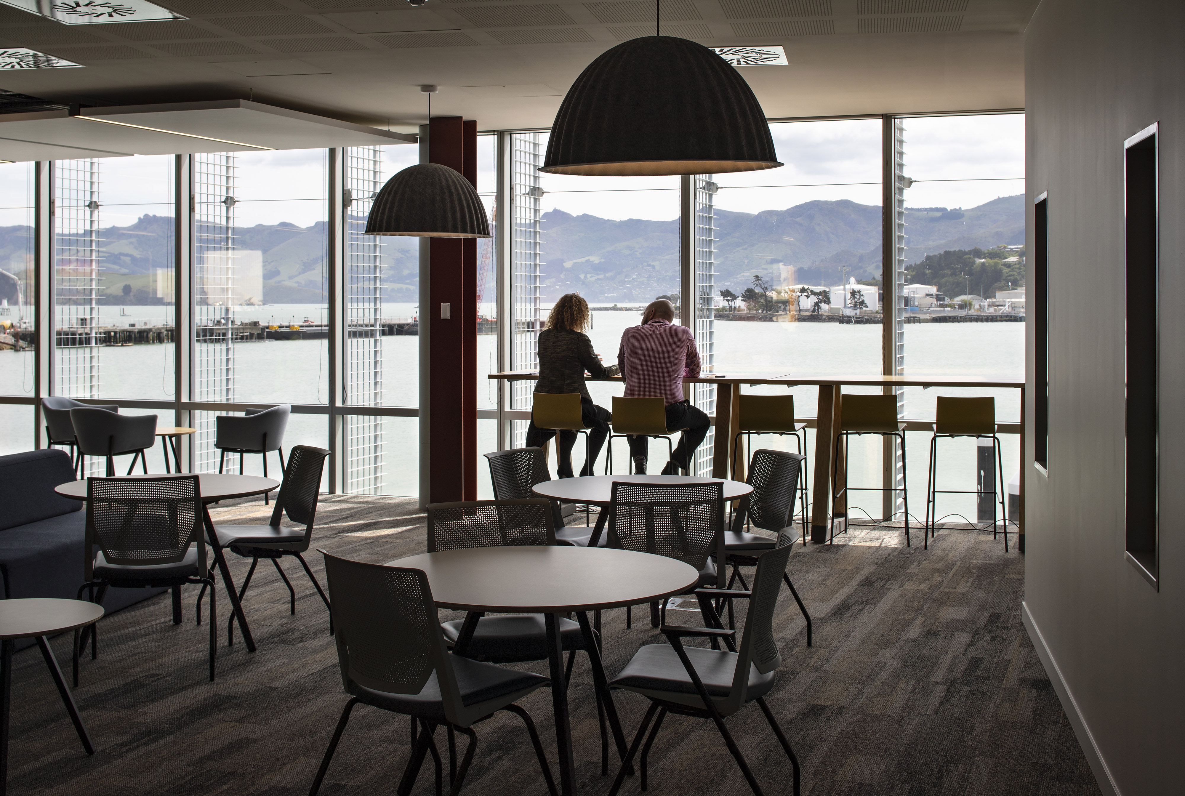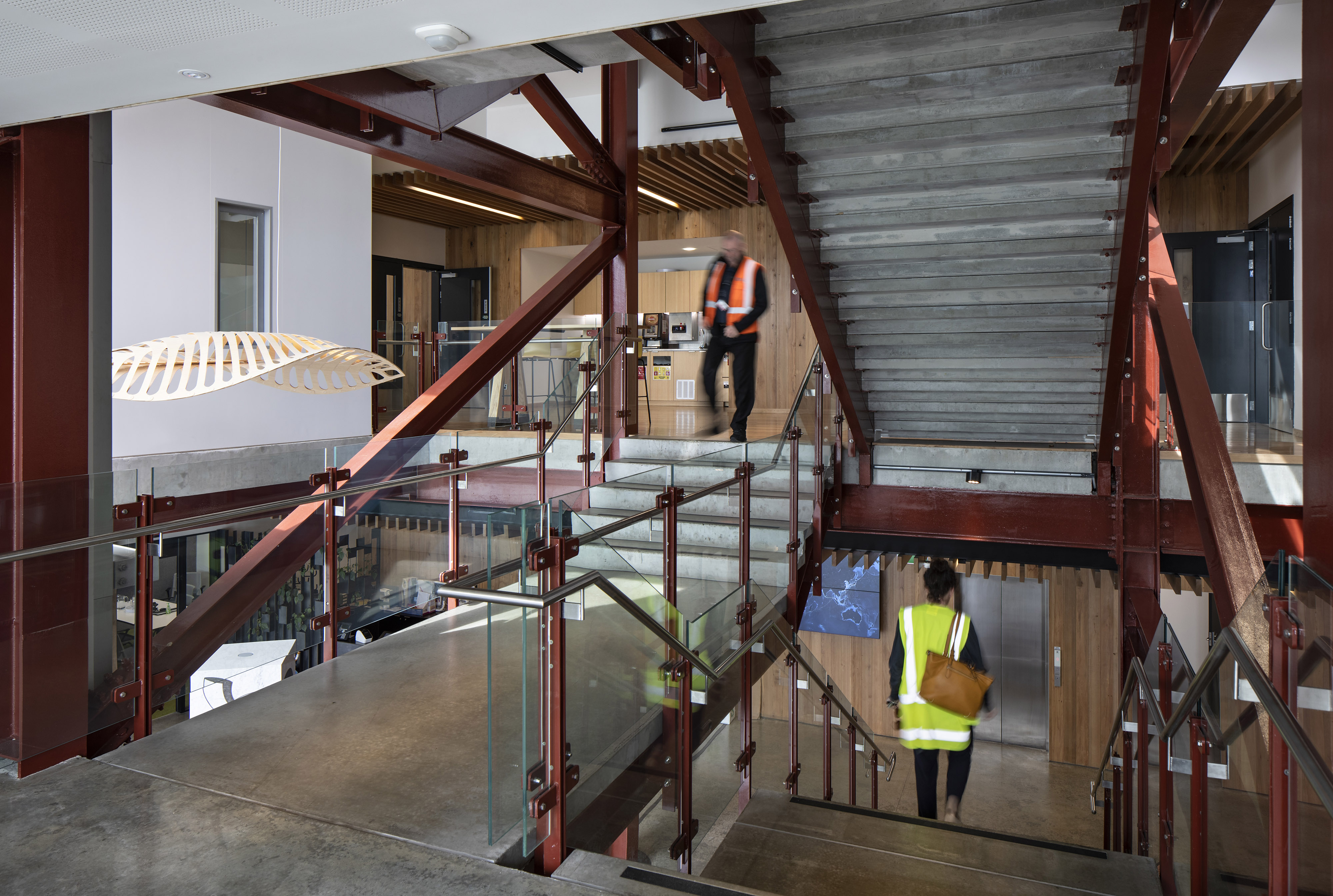 A stripped back interior has been carefully coloured with harbour tones and textures, promoting a playful melding of structure and surface. Stacking and shifting interior functions with greater intensity around the stair emphasises user exchange, while relaxed interior planning along the façades provides space for co-working and contemplation of the surrounding landscape. The selection of warm, inviting and environmentally friendly materials also promotes a ‘greener’ sense of place within the industrial context.